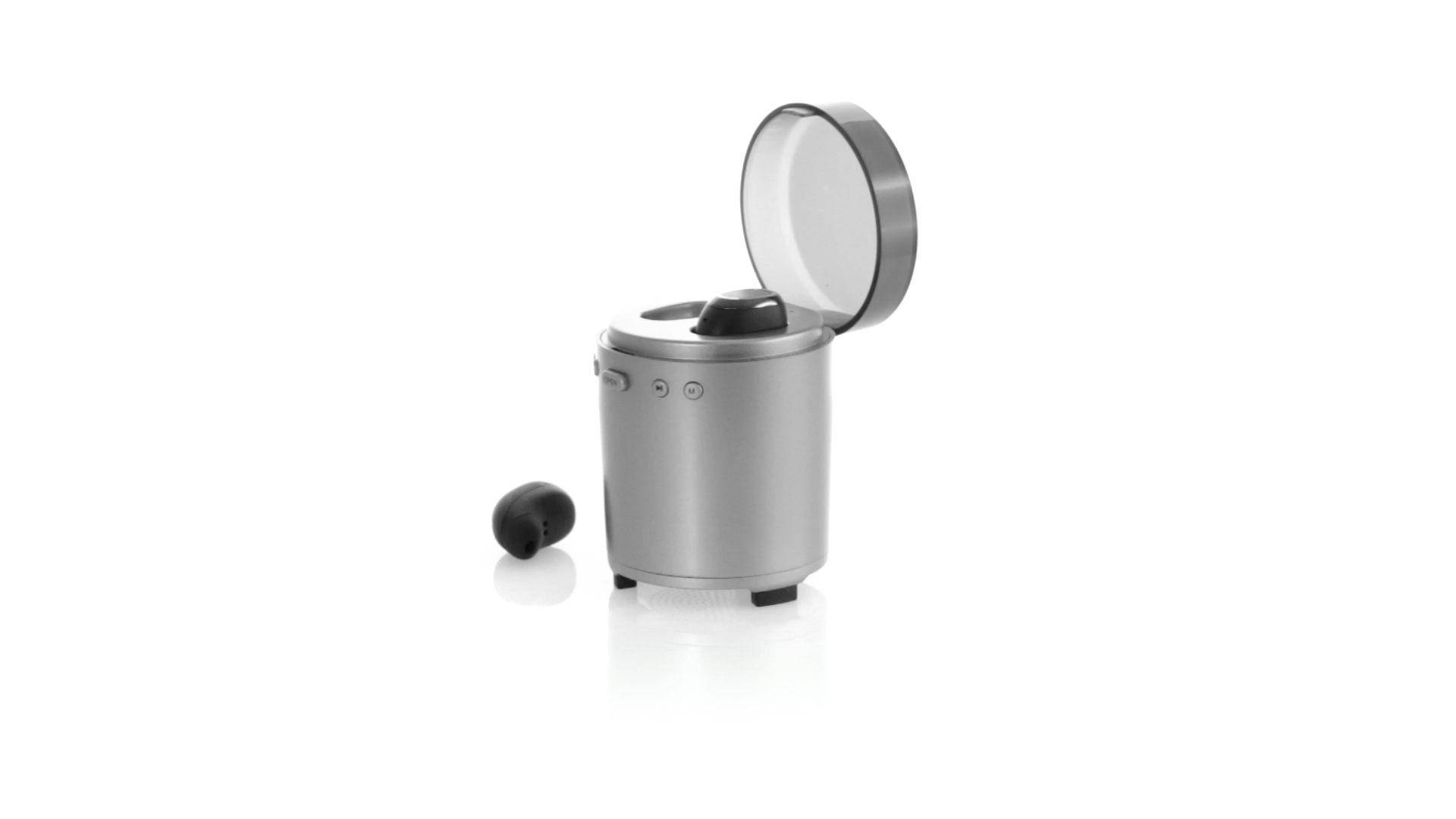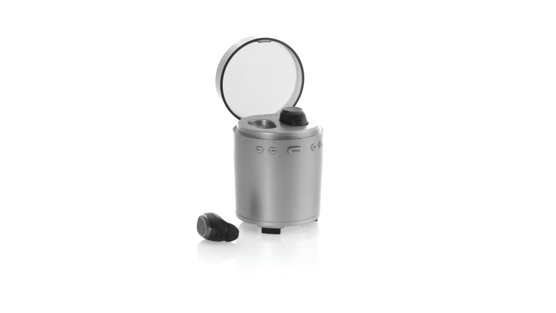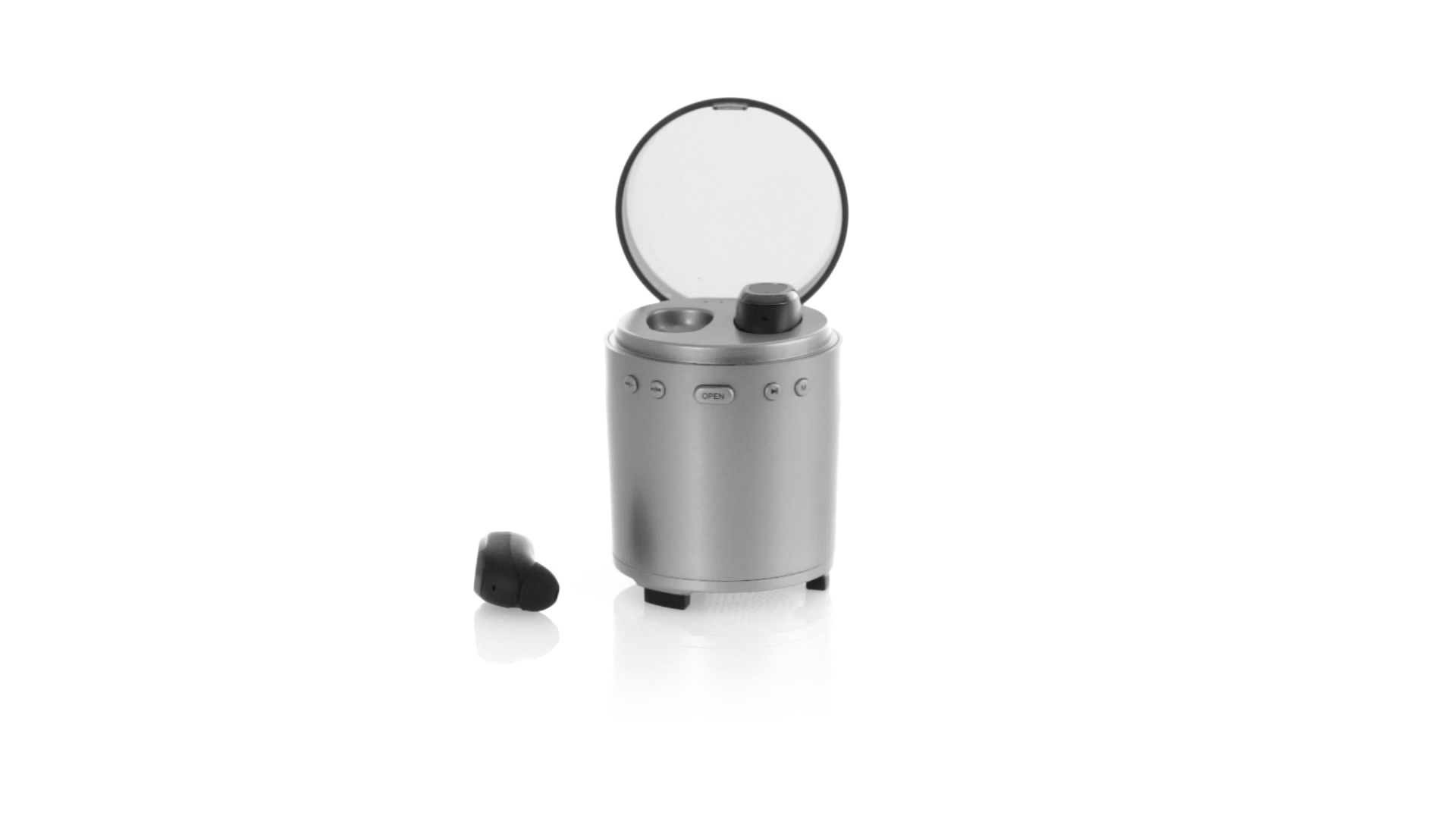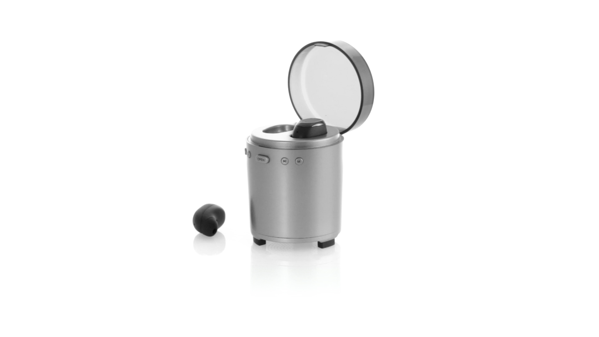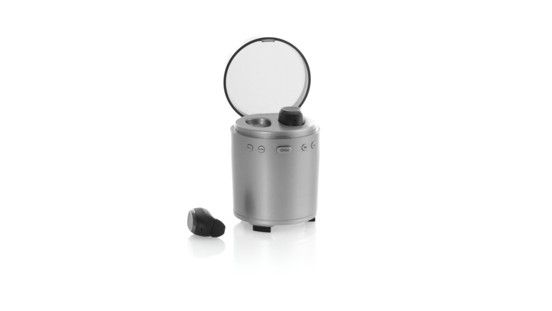 Bluetooth®-Lautsprecher mit integrierten In-Ear-Kopfhörern. Mit schlichtem Design in Schwarz/Silber, rutschfester Unterseite und im Lautsprecher integrierten Bedientasten. Bietet zudem Freisprechfunktion und FM-Radio. Ladestation für Kopfhörer mit Deckel und Ladeanzeige. Aufladbar über USB-Kabel (inklusive). Präsentiert in einer attraktiven Designbox.