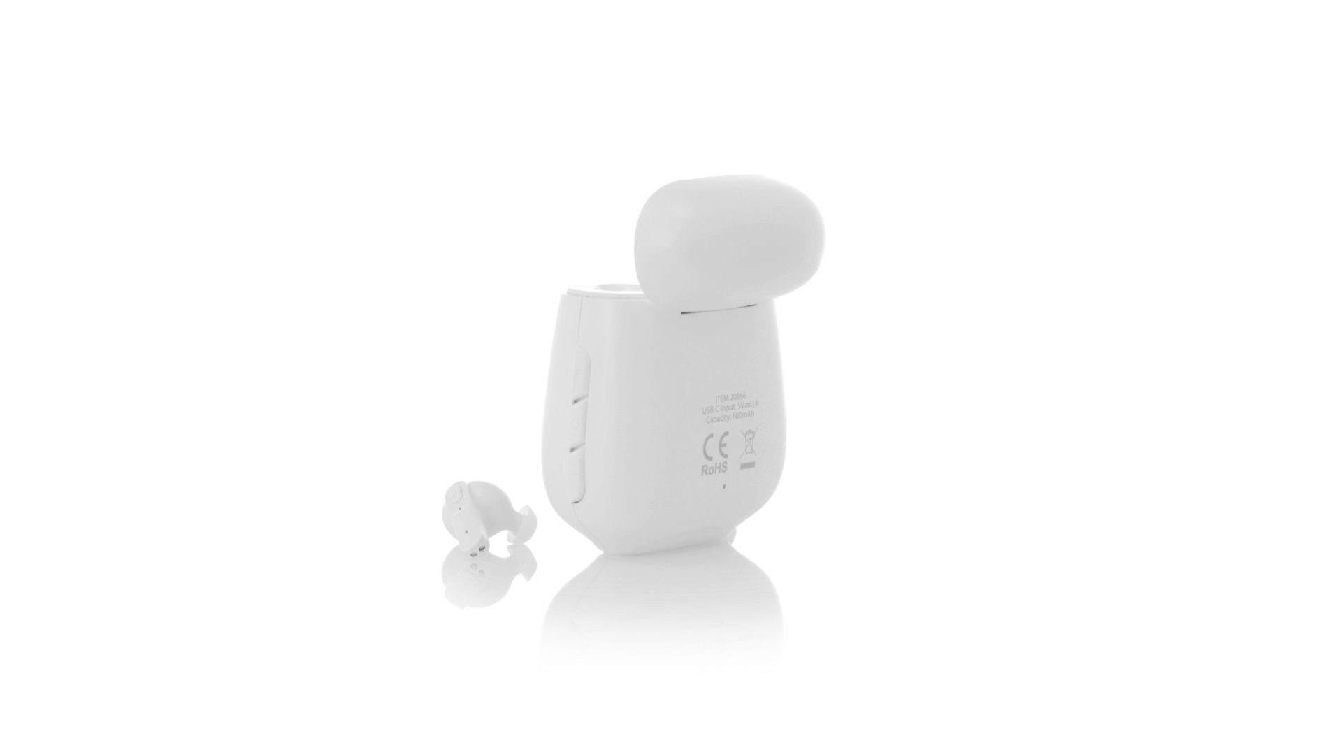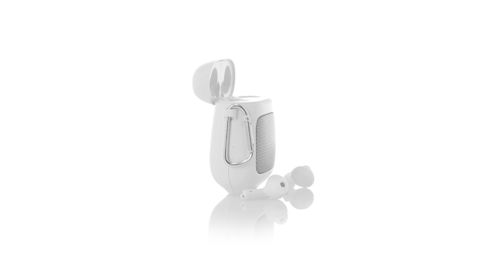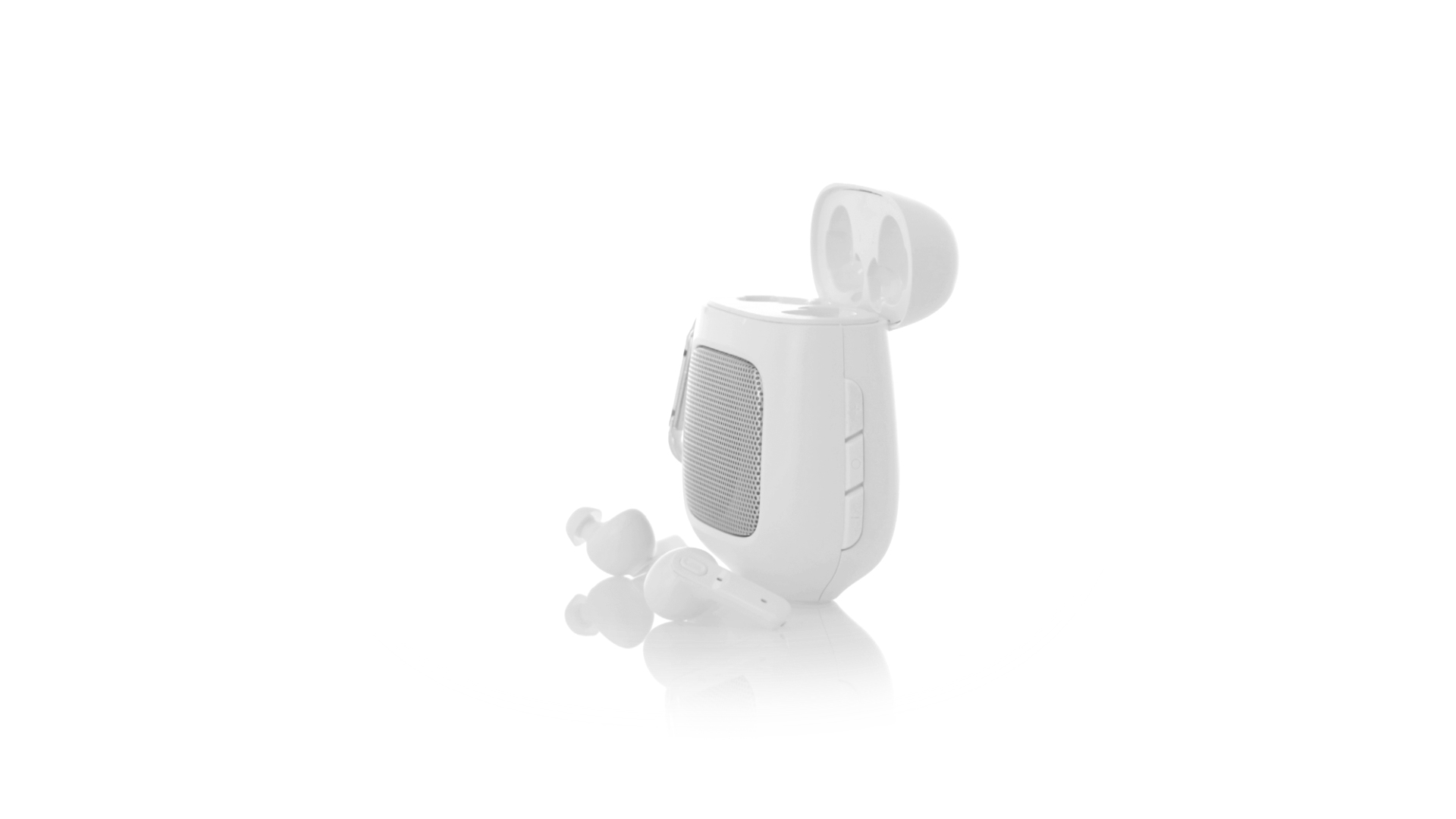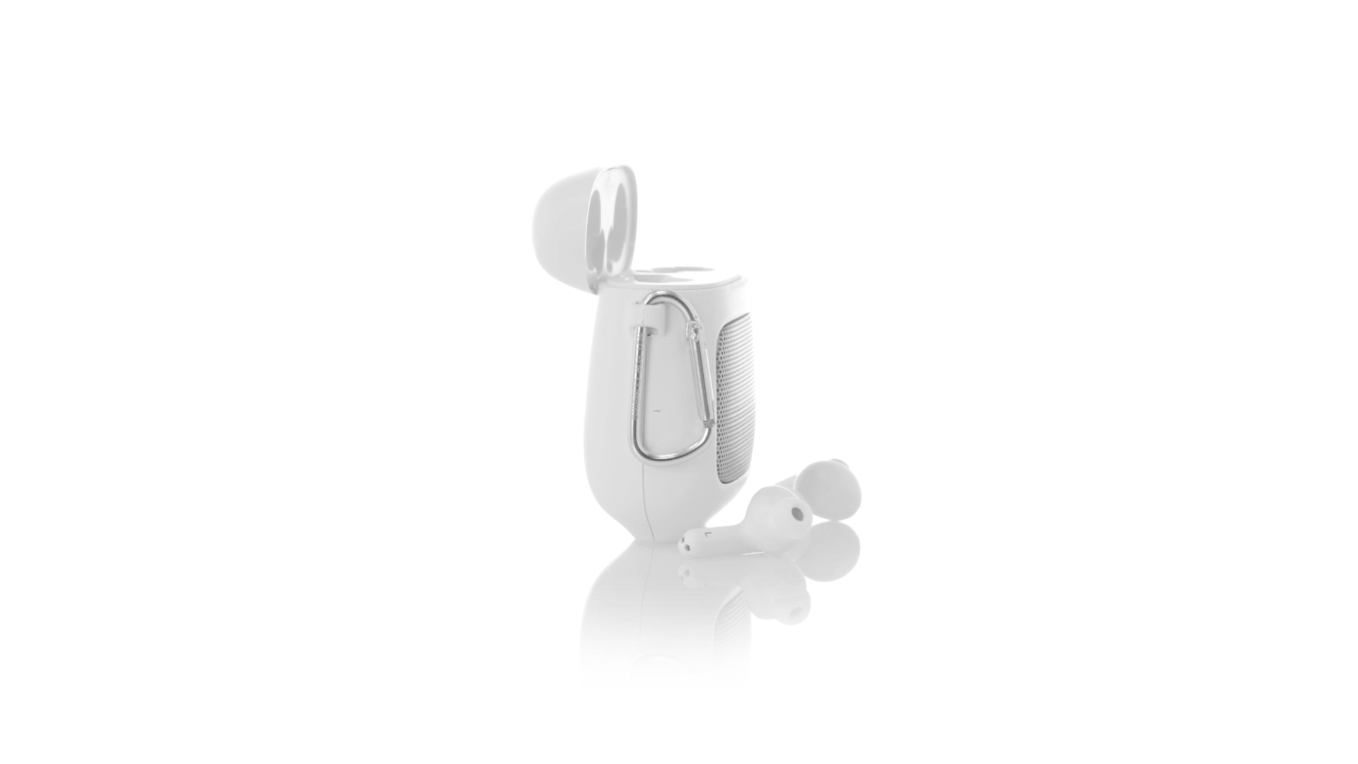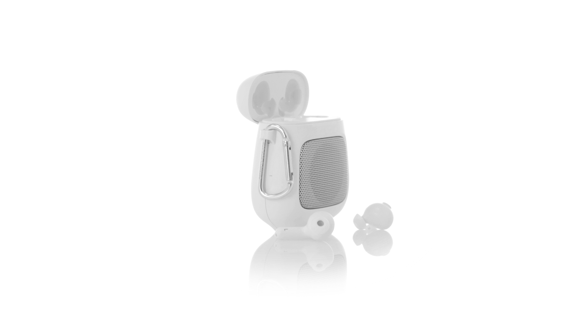 Einzigartiger Lautsprecher-Kopfhörer mit Bluetooth® 5.0-Verbindung, hergestellt aus widerstandsfähigem ABS in Weiss. Das Set enthält einen Bluetooth®-Lautsprecher mit 3 W Leistung, Freisprechfunktion und Karabiner. Ergänzt wird es durch ein Paar Ohrhörer mit integriertem Bedienknopf und je 30 mAh Akku. 600-mAh-Ladestation, mit LED-Ladestatusleuchte. Einzeln verpackt in einer Kraftbox, mit Bedienungsanleitung in Englisch und Spanisch.Hergestellt gemäss den RoHS-Normen und unter Einhaltung der folgenden Sicherheitsanforderungen:Überhitzungsschutzsystem.Überladungsschutzsystem.Blockiersystem zur Vermeidung von Kurzschlüssen.