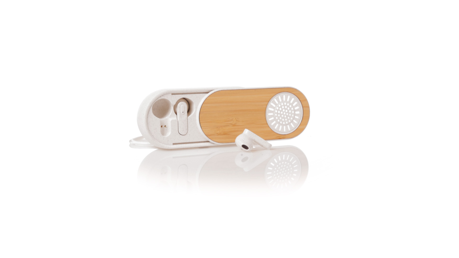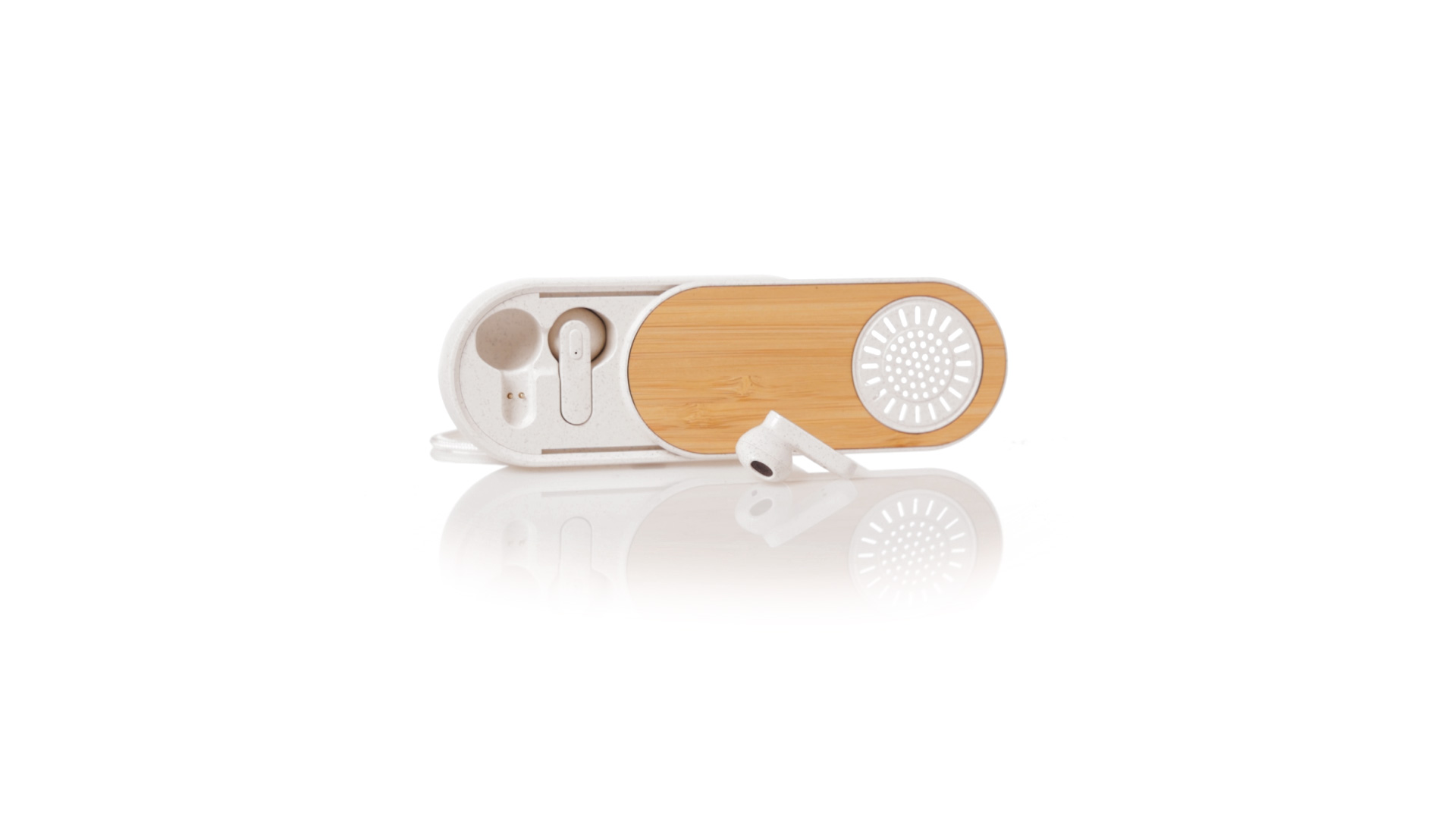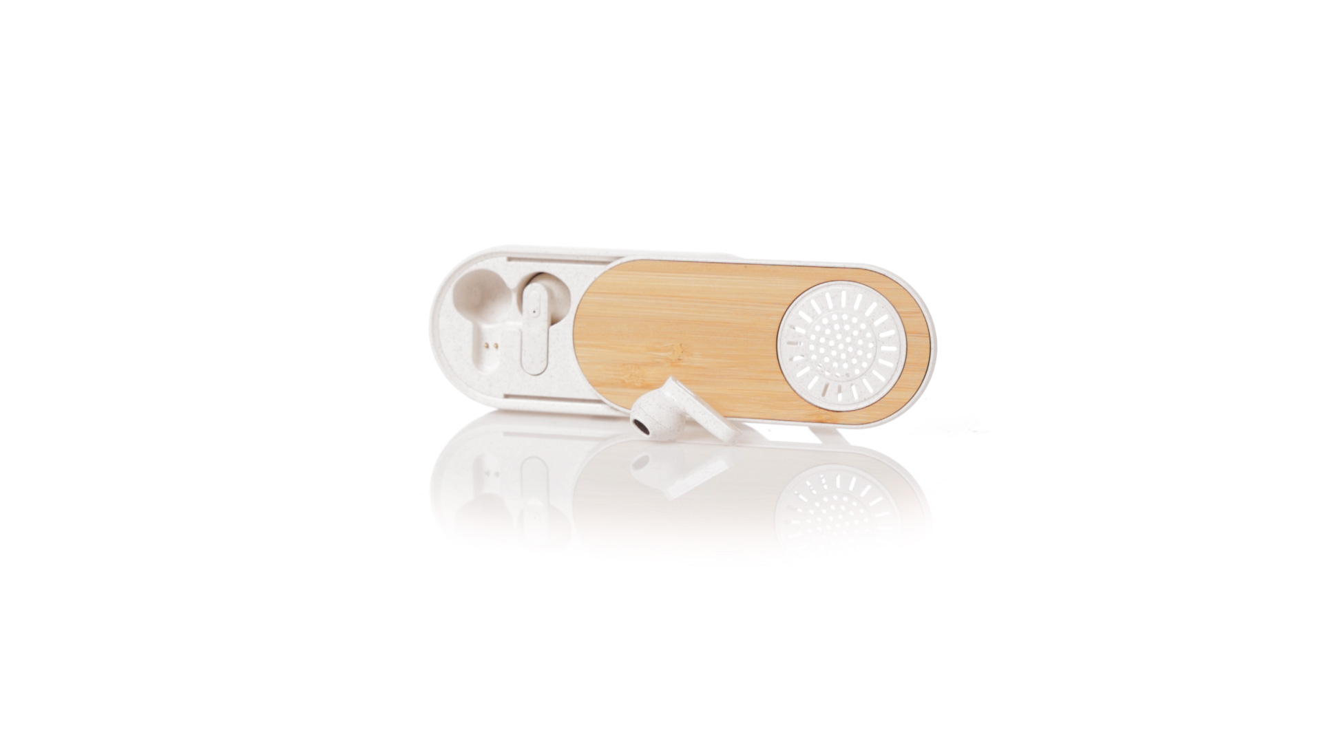 Lautsprecher-Kopfhörer aus Bambus und Weizenrohr. Mit Bluetooth® 5.0. Inhalt:In-Ear-Design-Kopfhörer mit integrierter Bedientaste, passender Ladestation und LED-Ladestatusleuchte. 3 W Bluetooth®-Freisprecheinrichtung und Freisprechfunktion.Wiederaufladbarer 30-mAh-Akku in jeder Hörmuschel und 300-mAh-Basis. Präsentiert in individueller Designbox mit Bedienungsanleitung in Englisch und Spanisch.Hergestellt aus pflanzlichen Elementen, um die Verwendung natürlicher Rohstoffe zu fördern und Schadstoffemissionen zu reduzieren.