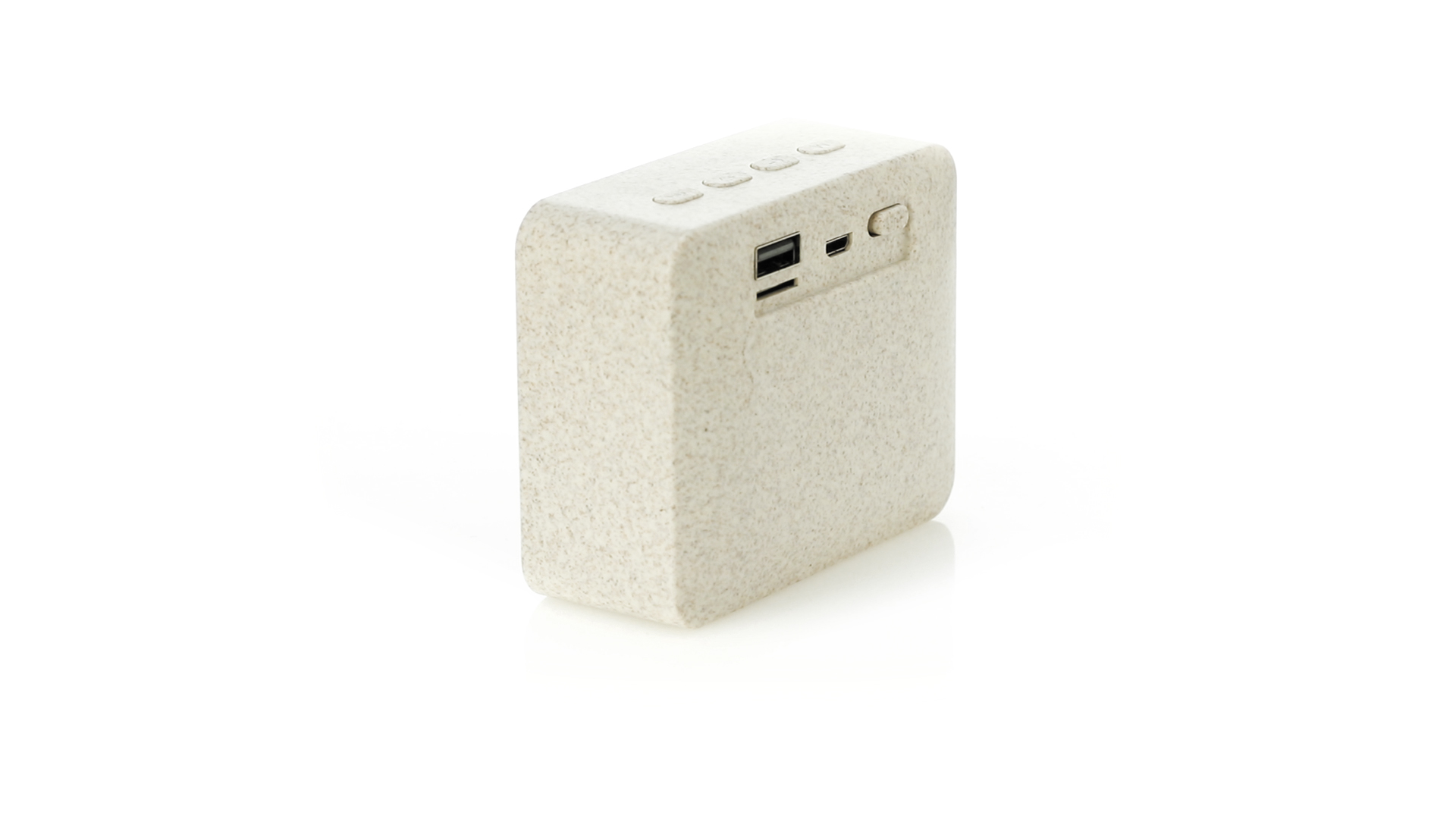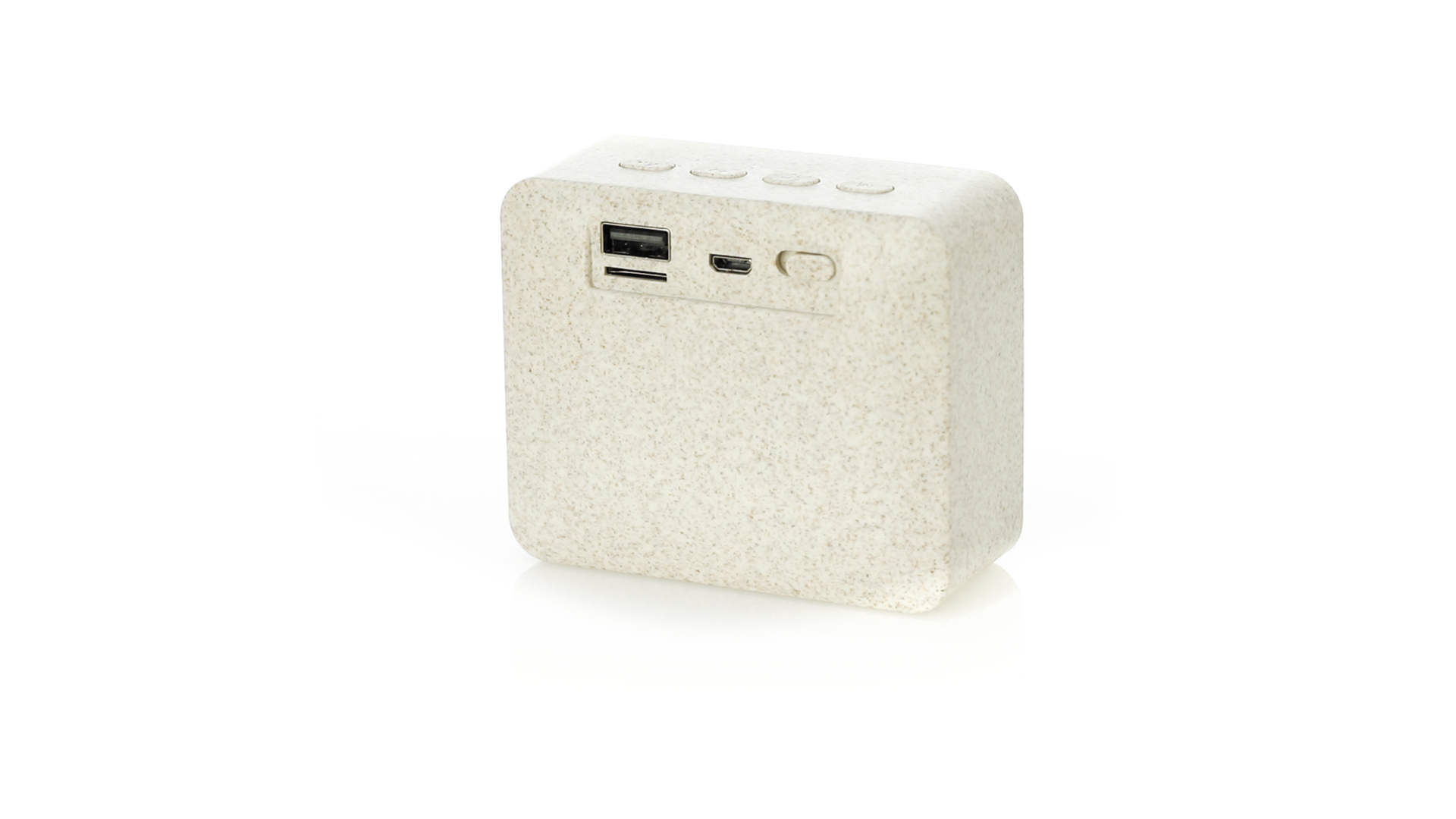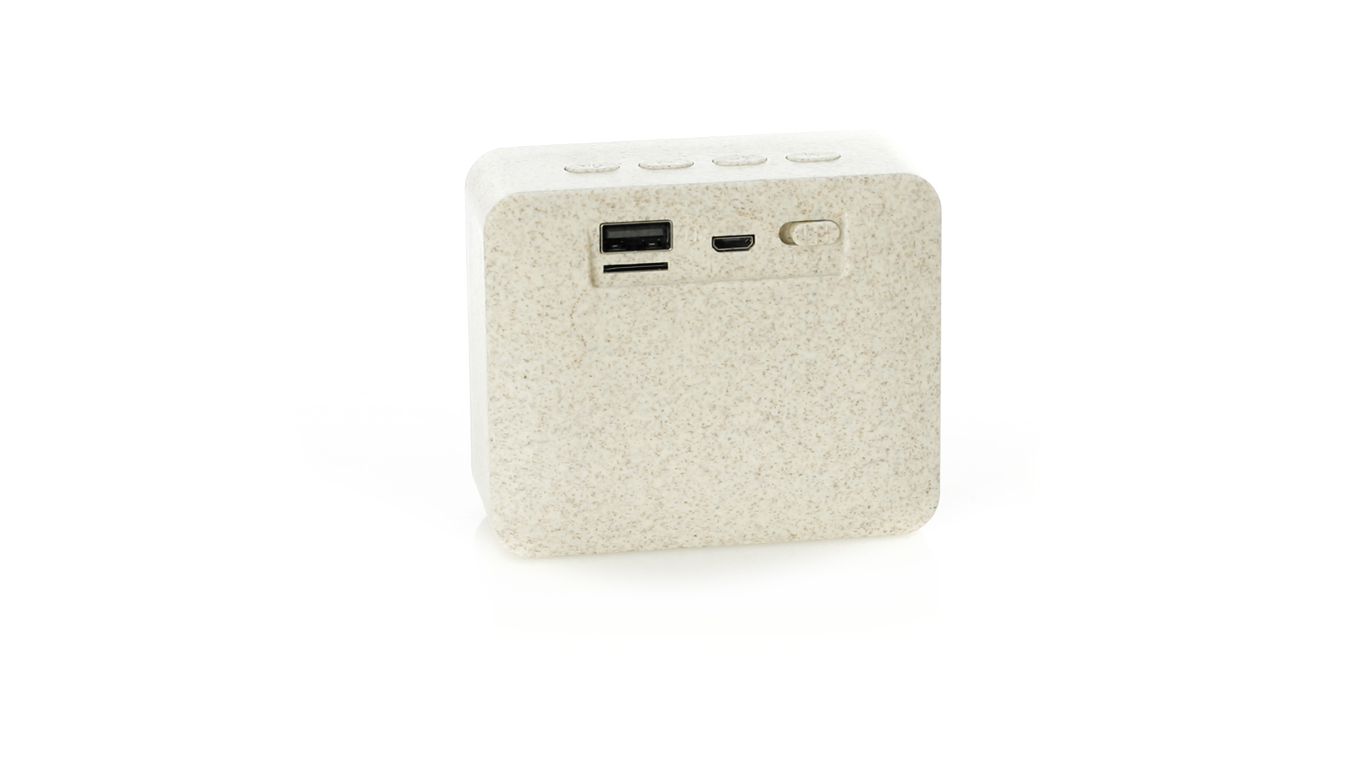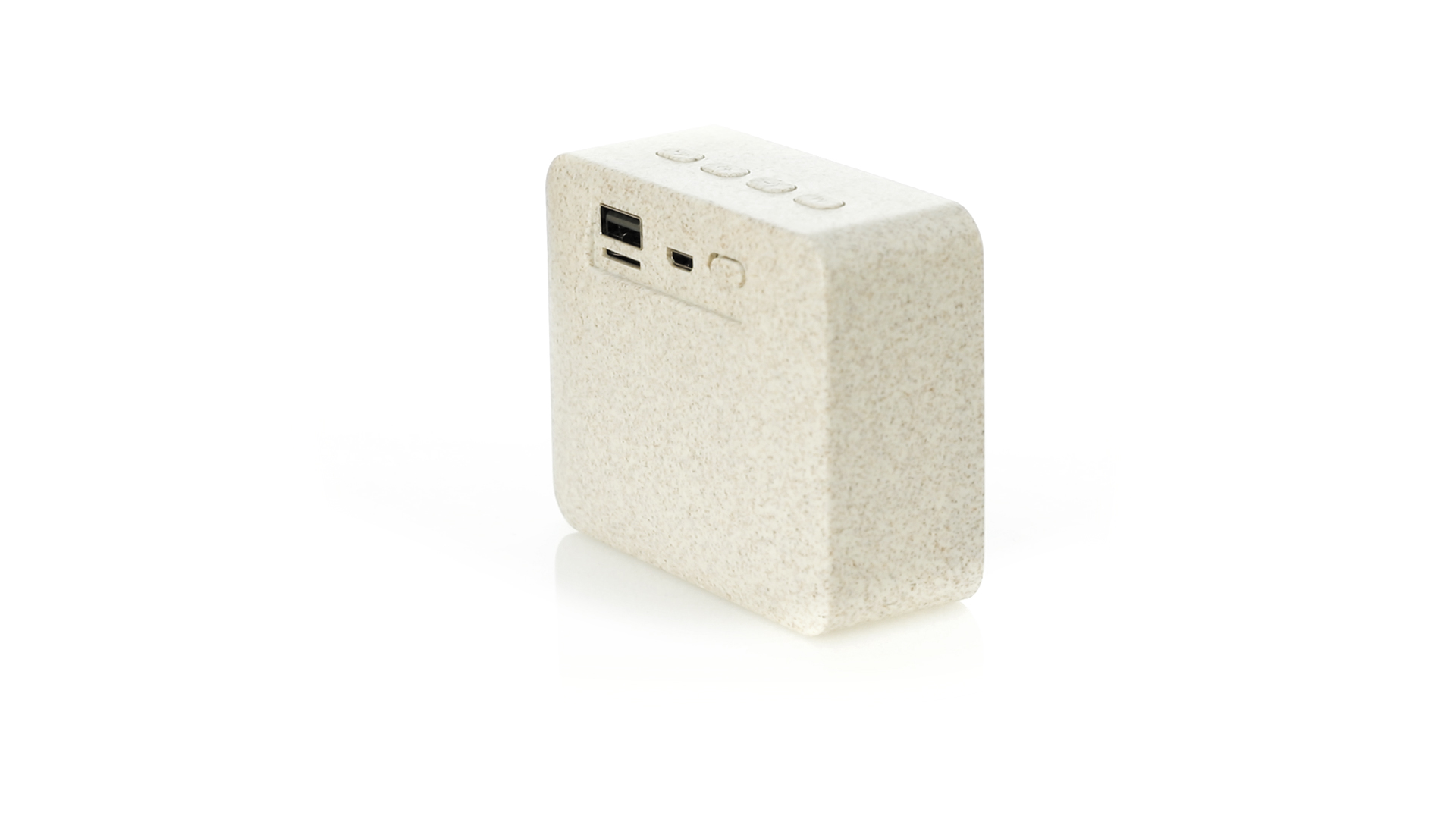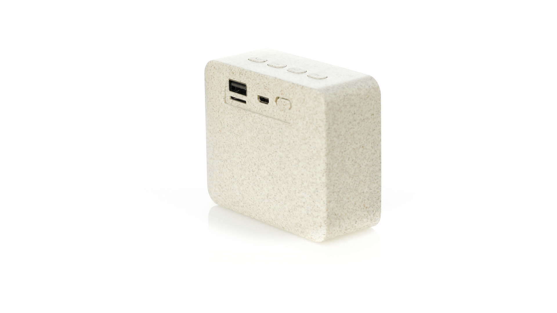 Naturlinie, Bluetooth® 5.0-Dockinglautsprecher. Schale aus Weizenstroh, um die Verwendung natürlicher Rohstoffe zu fördern und Schadstoffemissionen zu reduzieren, mit 3 W Schalleistung, mit USB-Player. Kompatibel mit iOS und Android, mit einem Mikro-USB-Ladekabel und in einer individuellen Öko-Design-Box. Mit rutschfesten Gummis an der Unterseite.