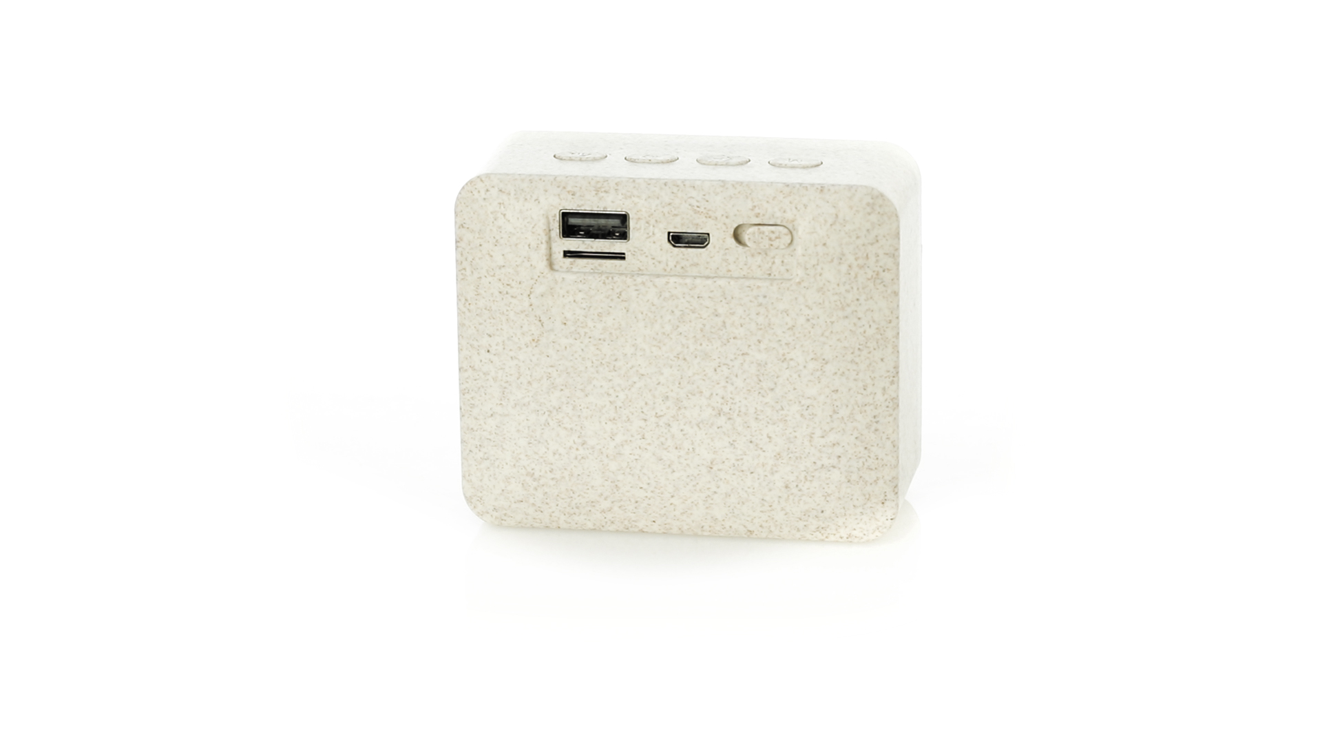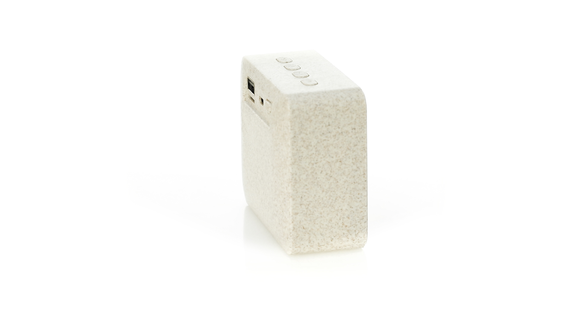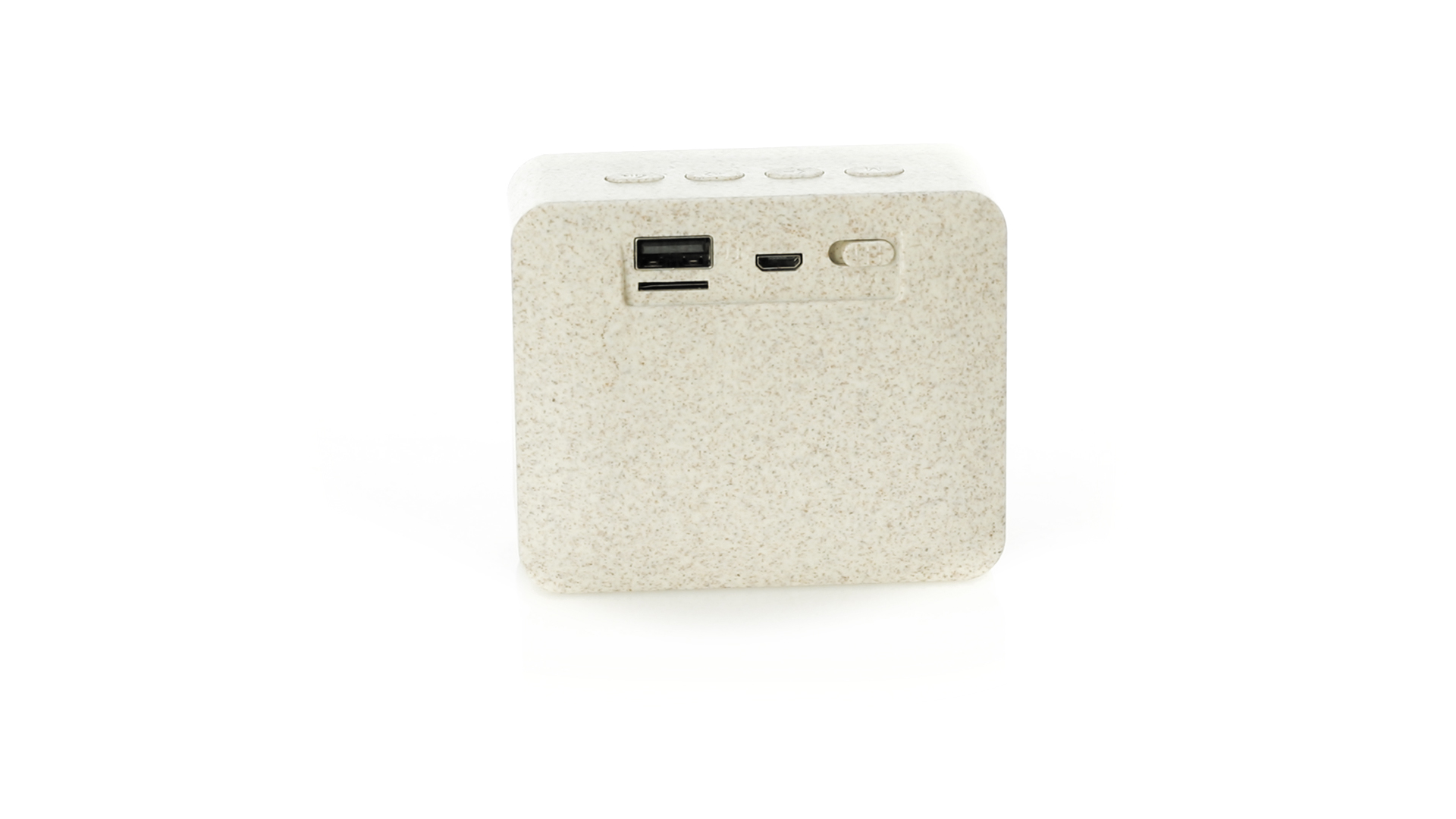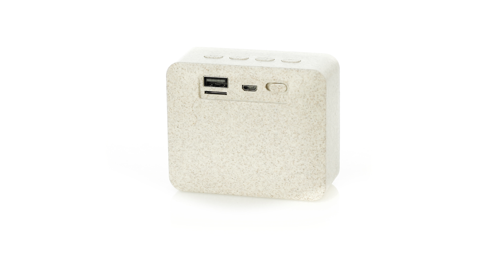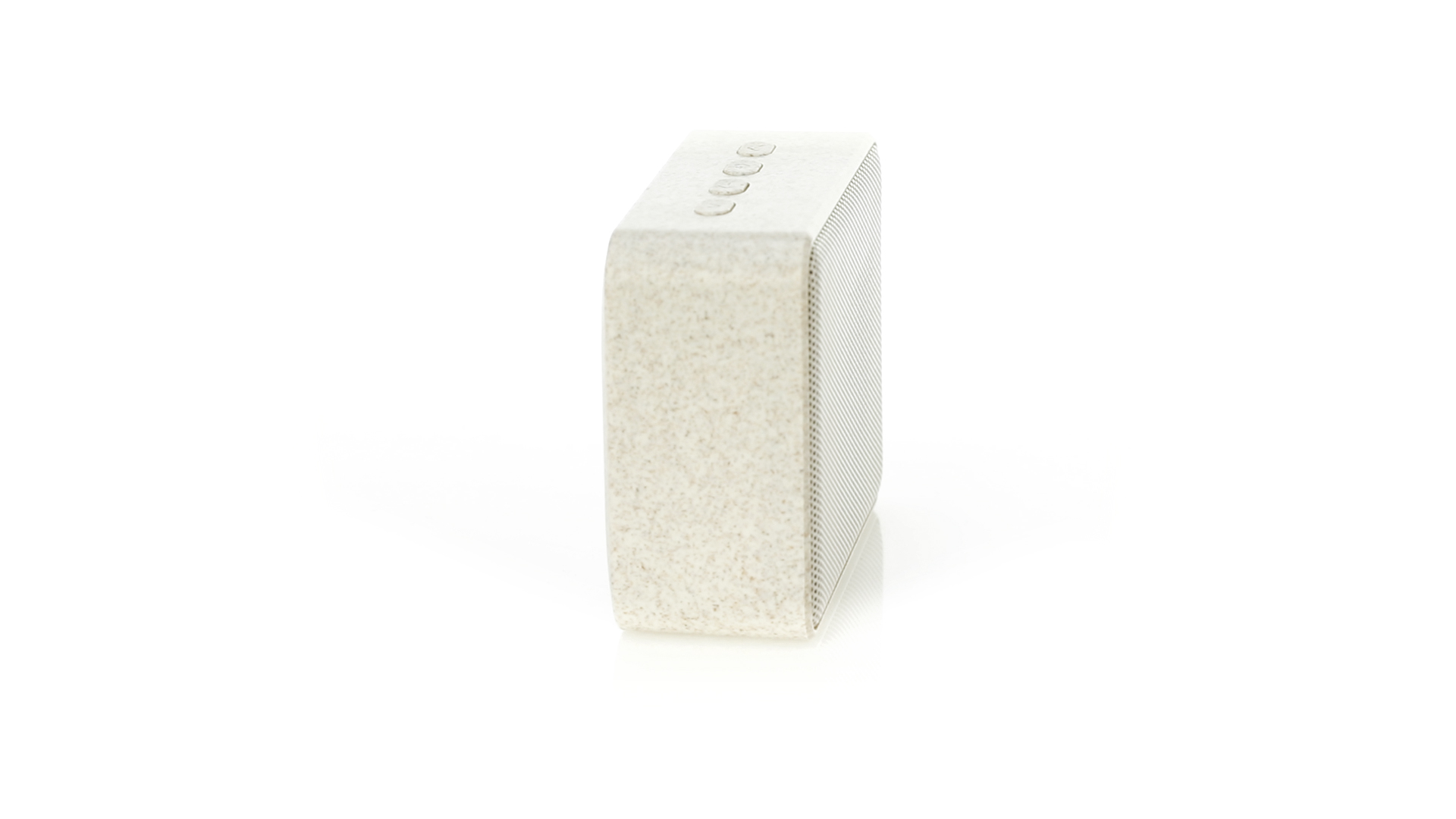 Naturlinie, Bluetooth® 5.0-Dockinglautsprecher. Schale aus Weizenstroh, um die Verwendung natürlicher Rohstoffe zu fördern und Schadstoffemissionen zu reduzieren, mit 3 W Schalleistung, mit USB-Player. Kompatibel mit iOS und Android, mit einem Mikro-USB-Ladekabel und in einer individuellen Öko-Design-Box. Mit rutschfesten Gummis an der Unterseite.