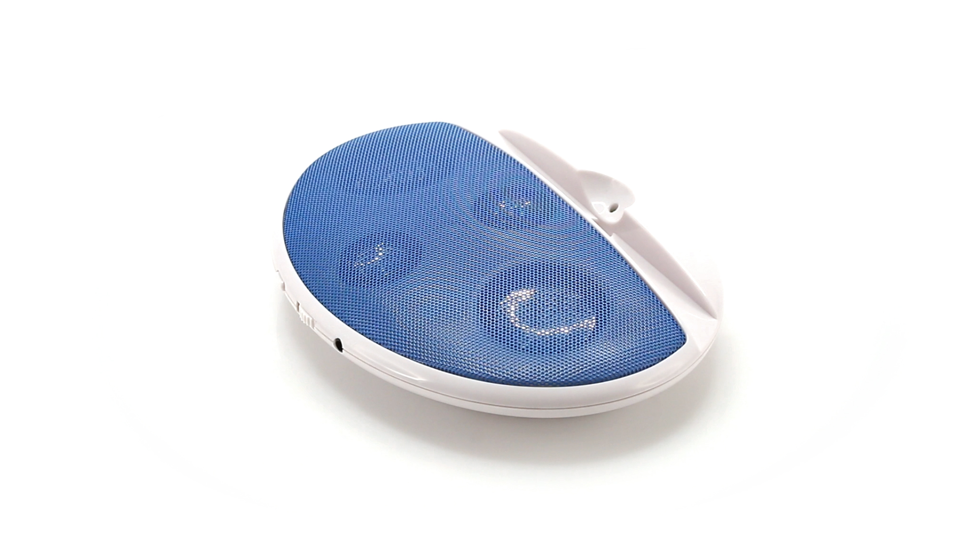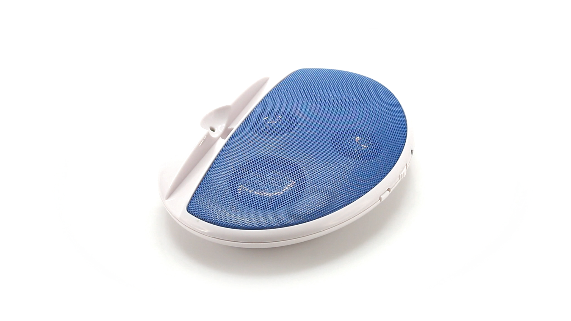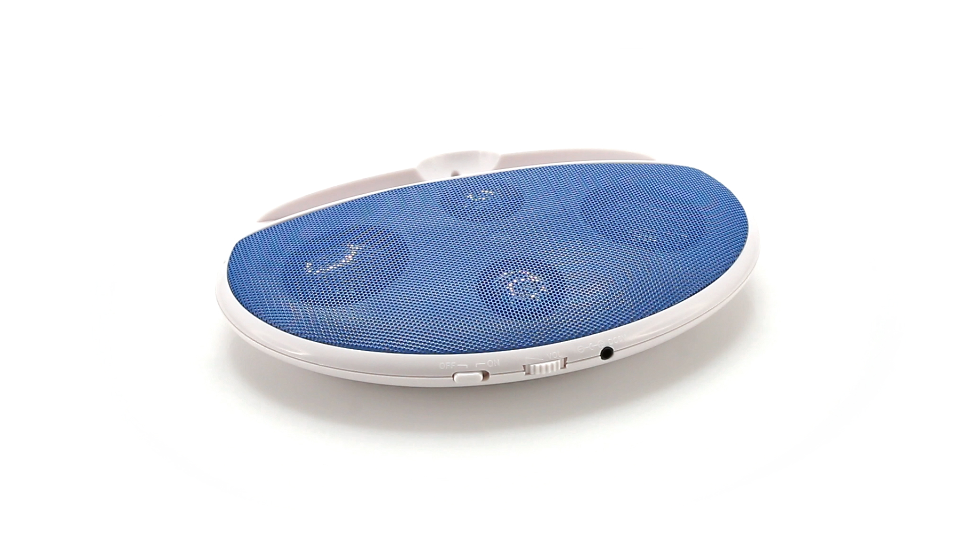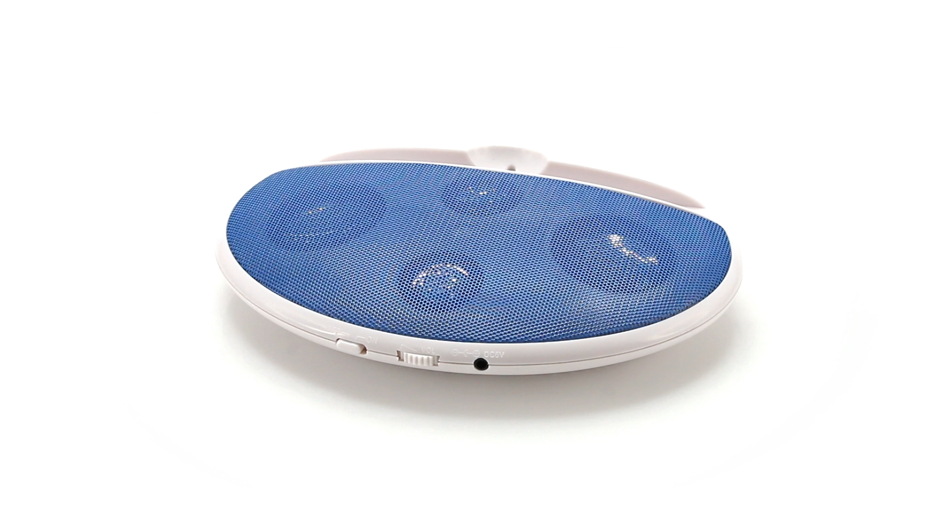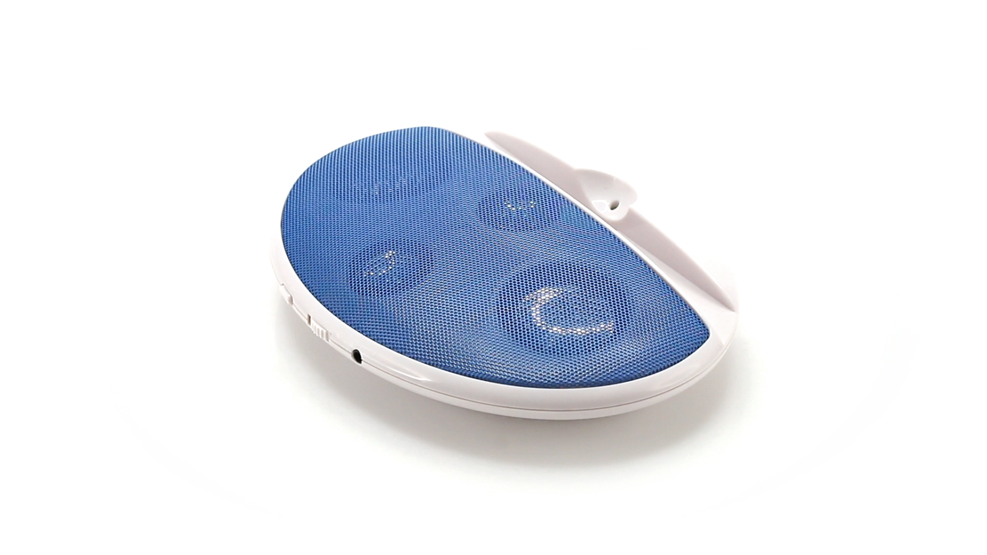 Kompakter Lautsprecher mit zweifarbigem Design. Auch als Ständer für Mobilltelefon nutzbar. Mit 2 W Leistung, Powerbutton, Lautstärkeregelung und 3,5-mm-Buchse. Batteriebetrieben - 4 x AAA nicht inklusive.