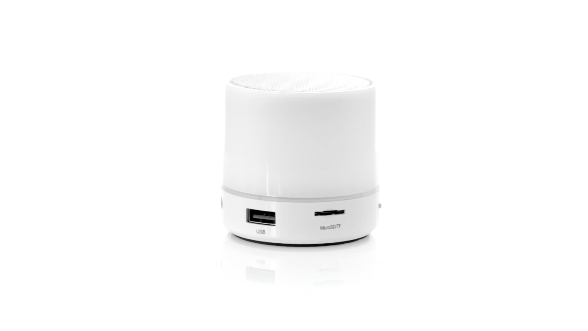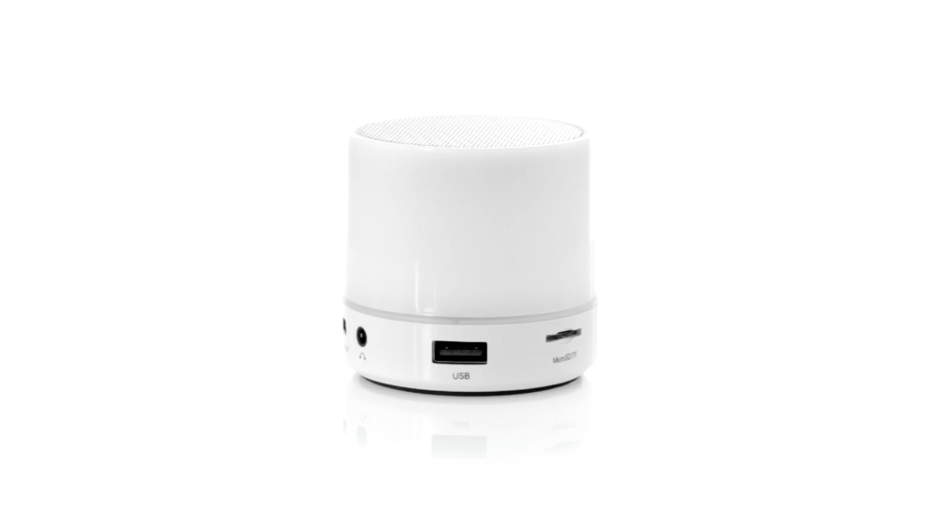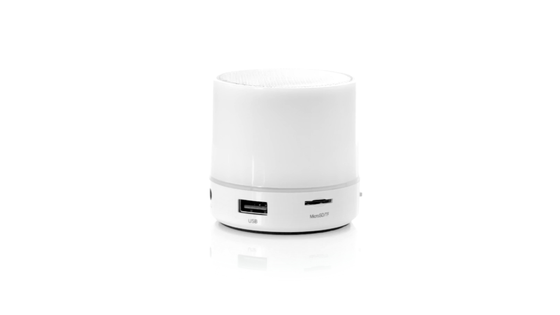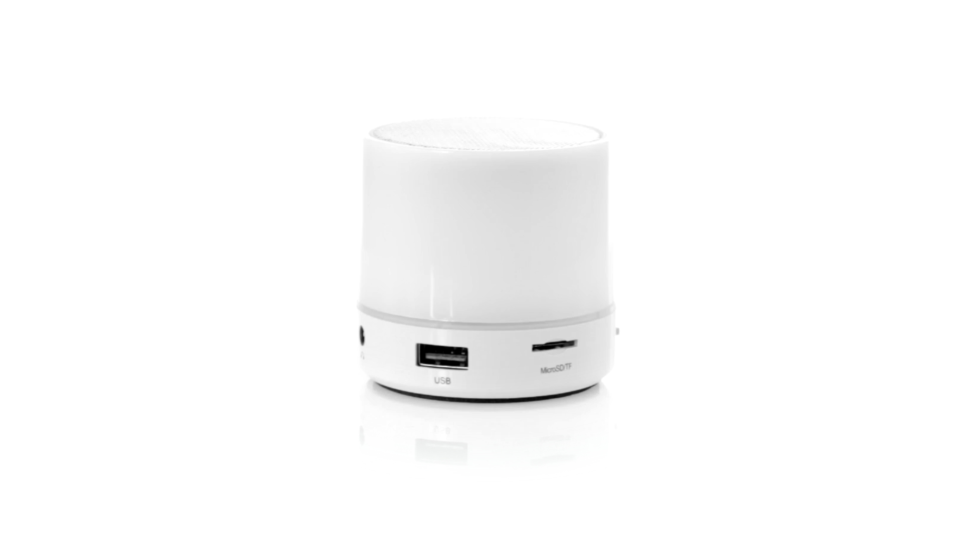 Intelligenter LED-Technologie-Lautsprecher mit Bluetooth-Verbindung®. Mit 3 W Leistung und Freisprechfunktion sowie einem Slot für eine Micro-SD-Karte von bis zu 32 GB Speicherkapazität. Zudem mit 3,5-mm-Buchse für Audioeingang und rutschfester Unterseite. Aufladbar über USB-Ladekabel (inklusive). Präsentiert in einer attraktiven Designbox.