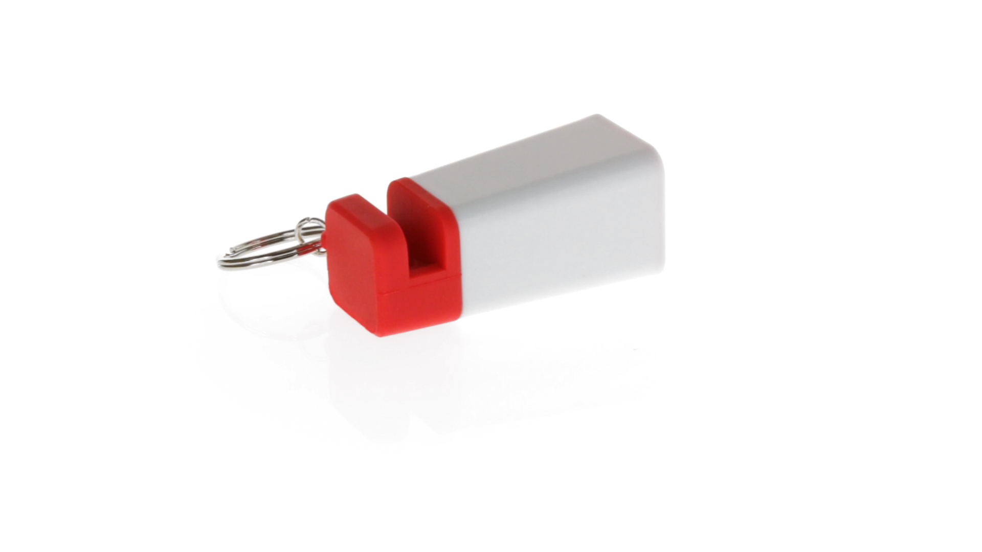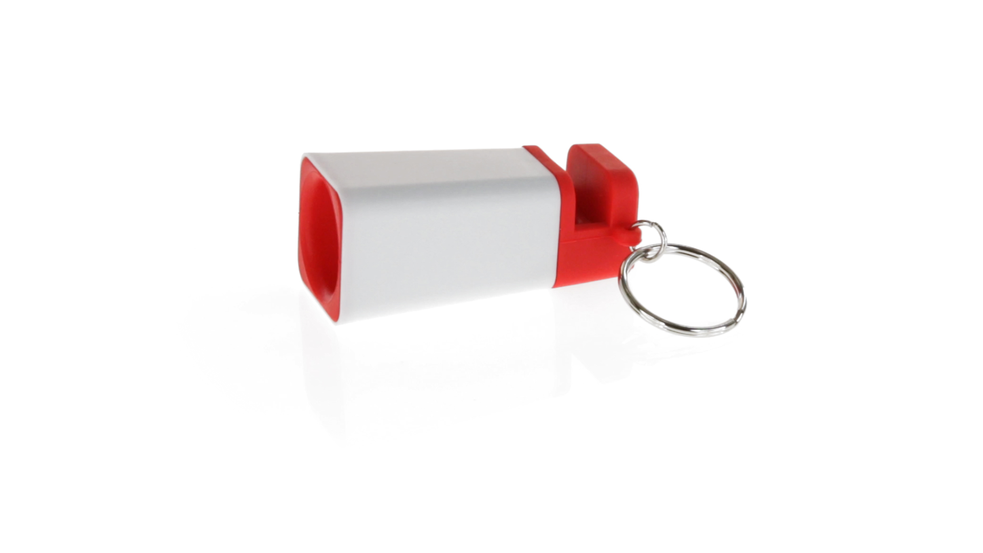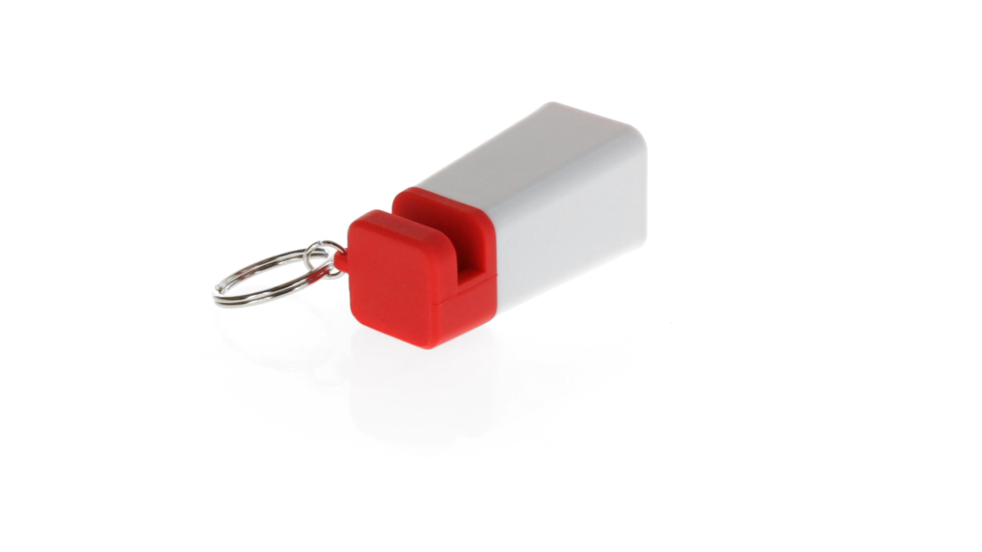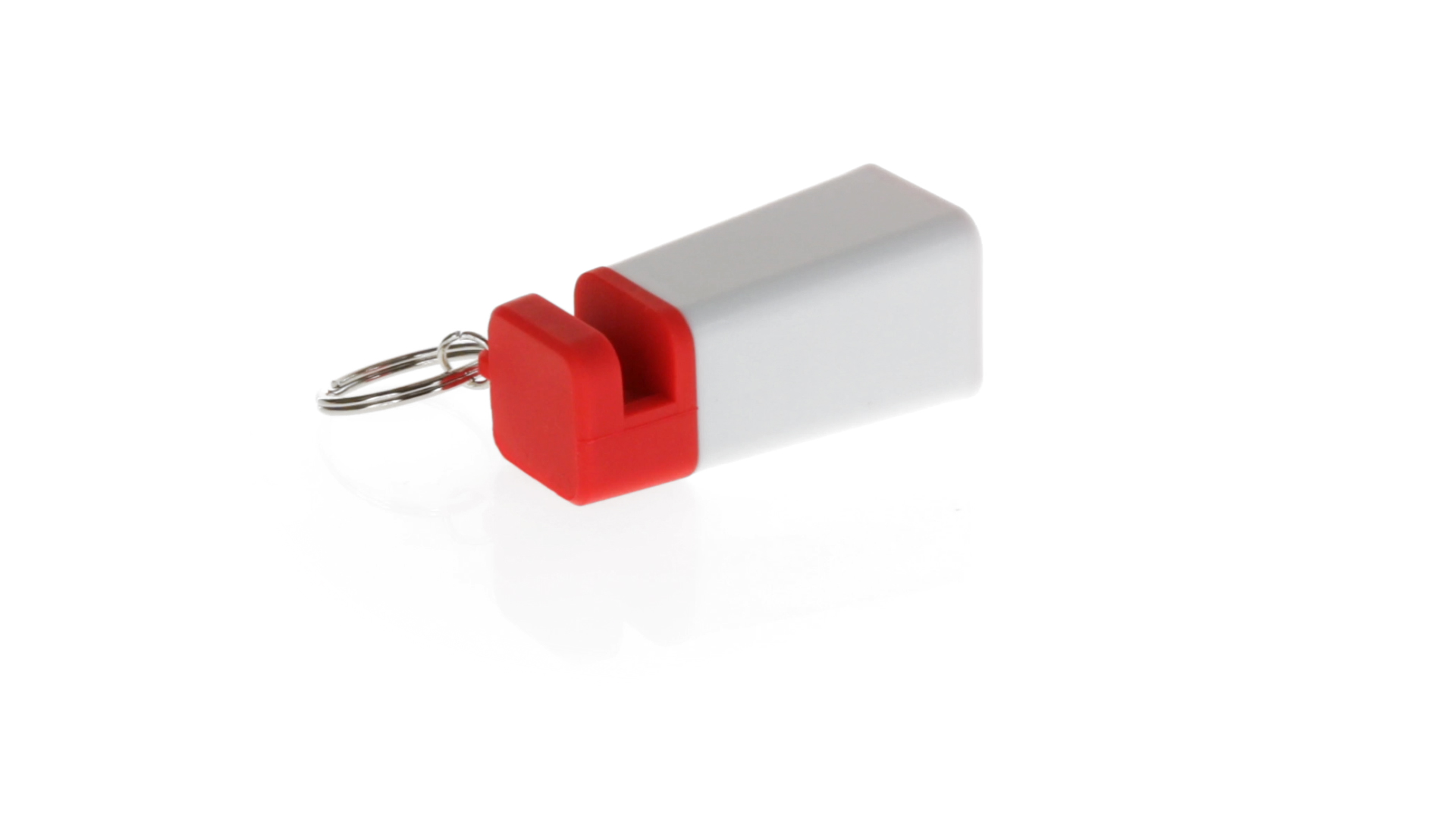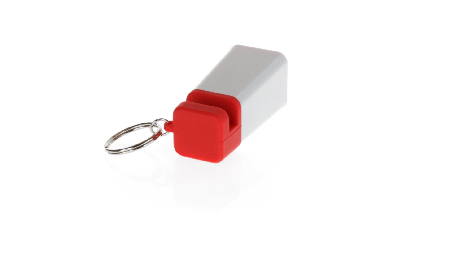 Schlüsselanhänger mit Smartphone-Ständer und manuellem Lautsprecher mit minimalistischem, zweifarbigem Design - speziell entwickelt für den Tampondruck.