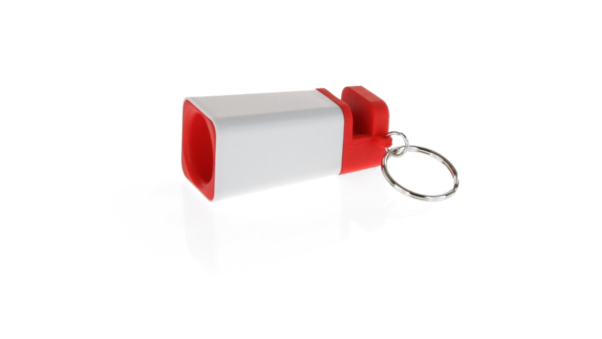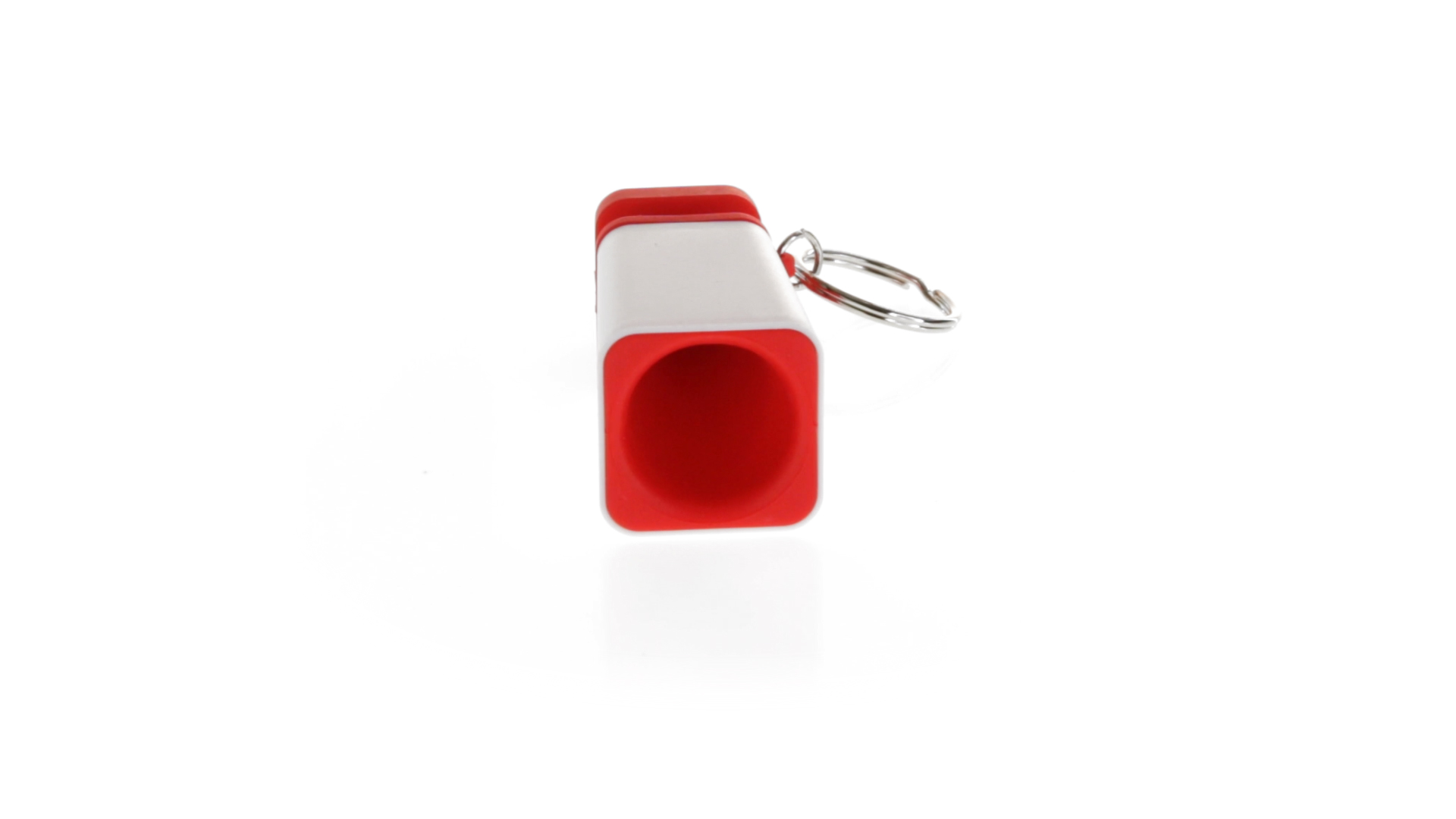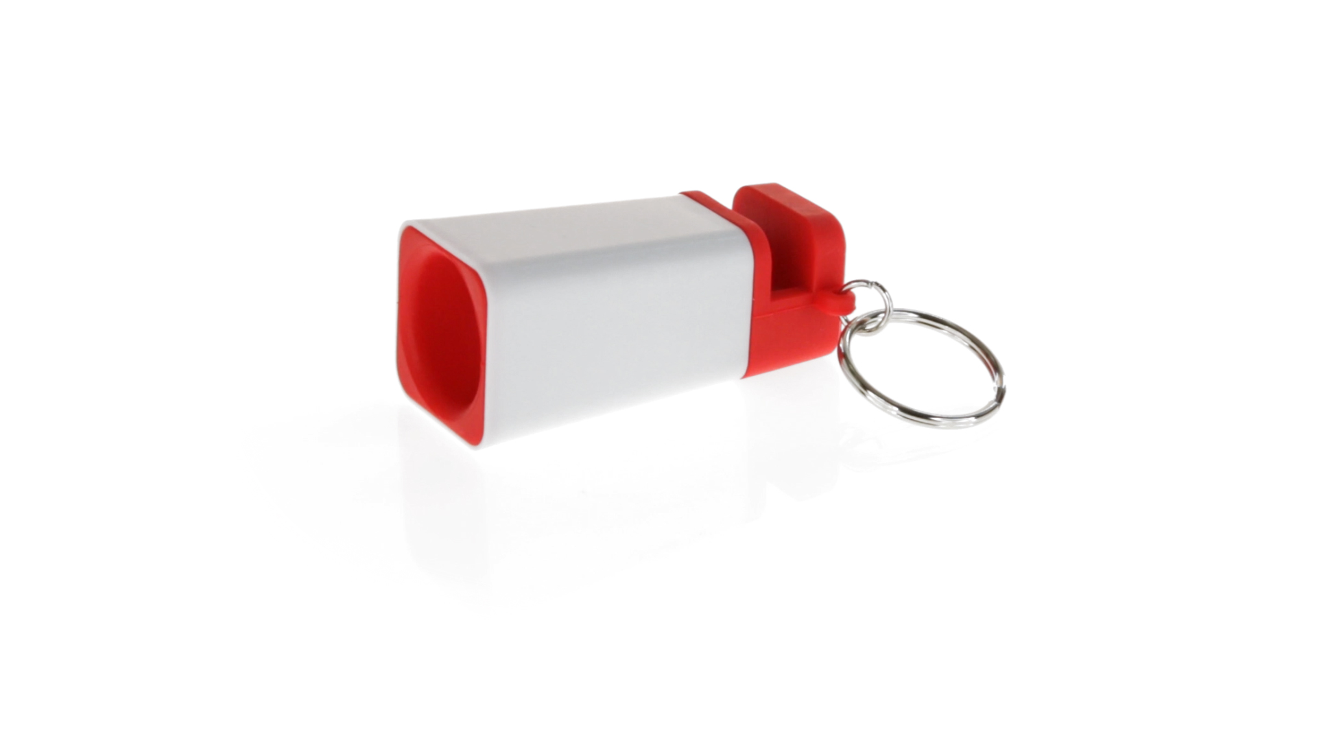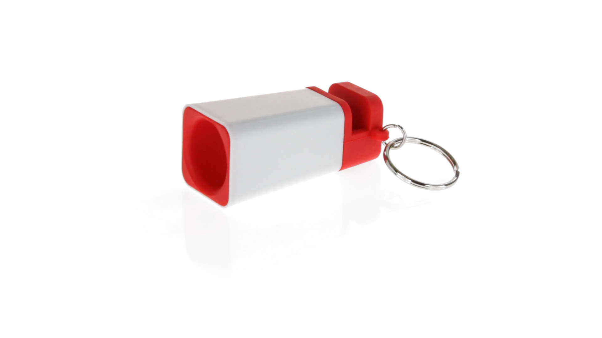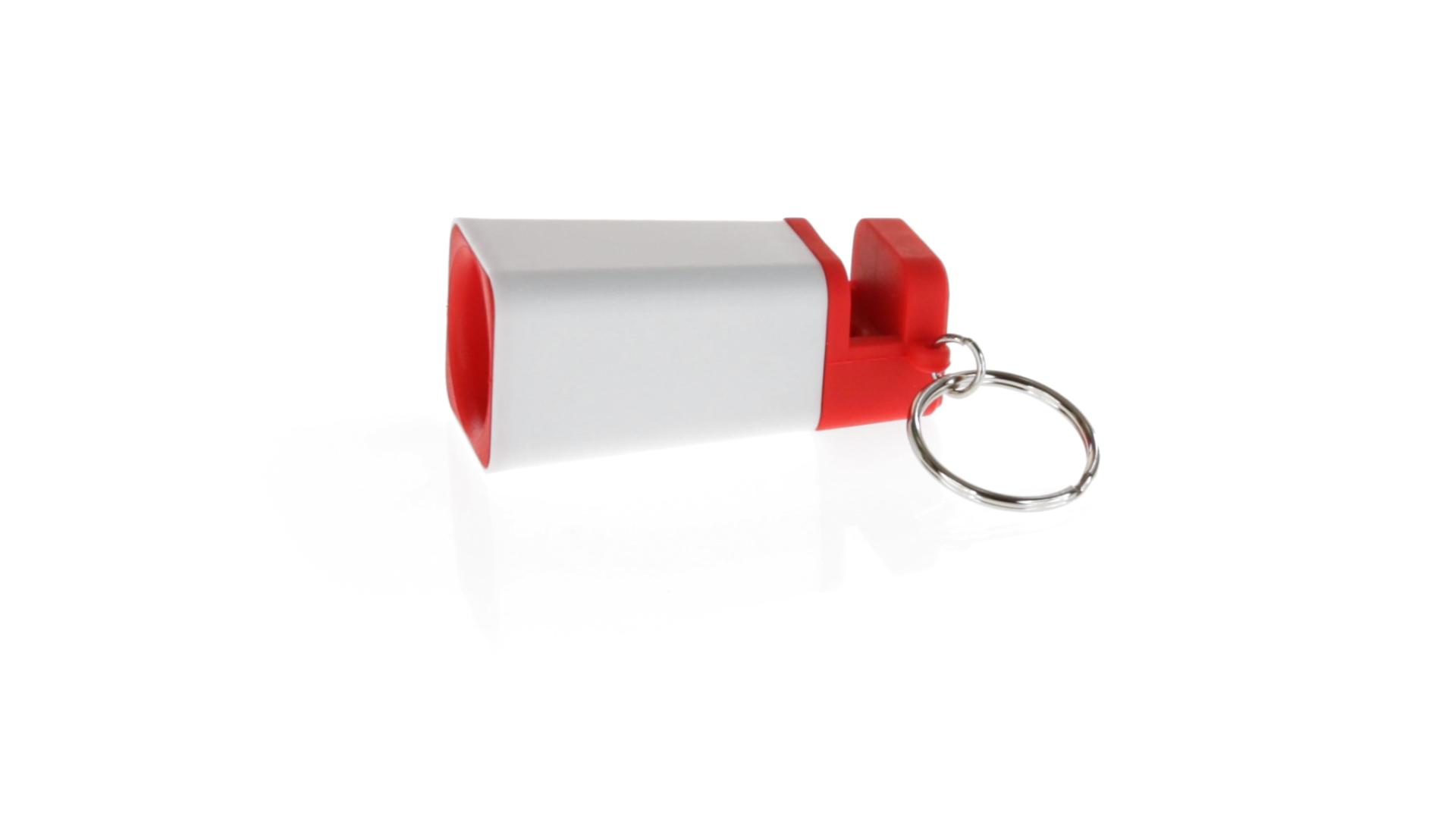 Schlüsselanhänger mit Smartphone-Ständer und manuellem Lautsprecher mit minimalistischem, zweifarbigem Design - speziell entwickelt für den Tampondruck.