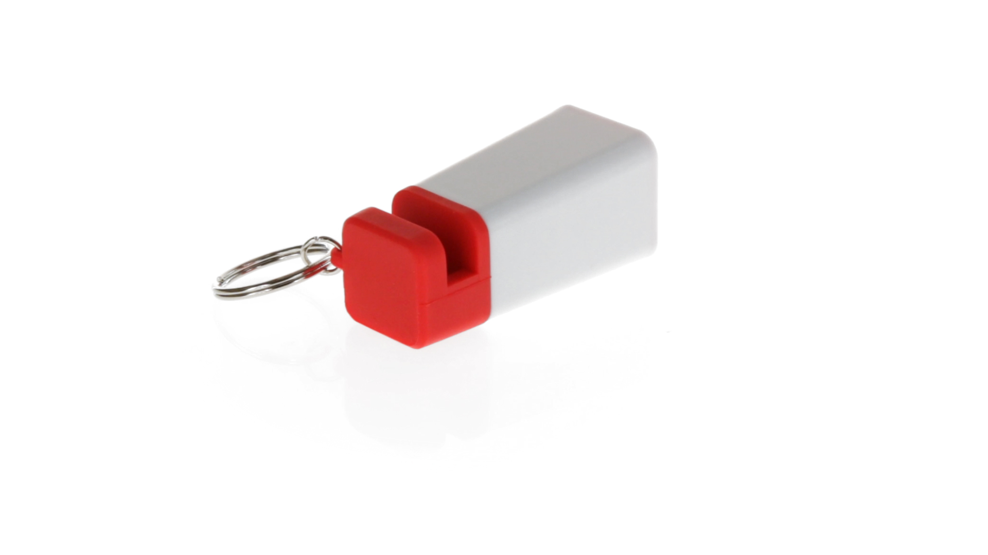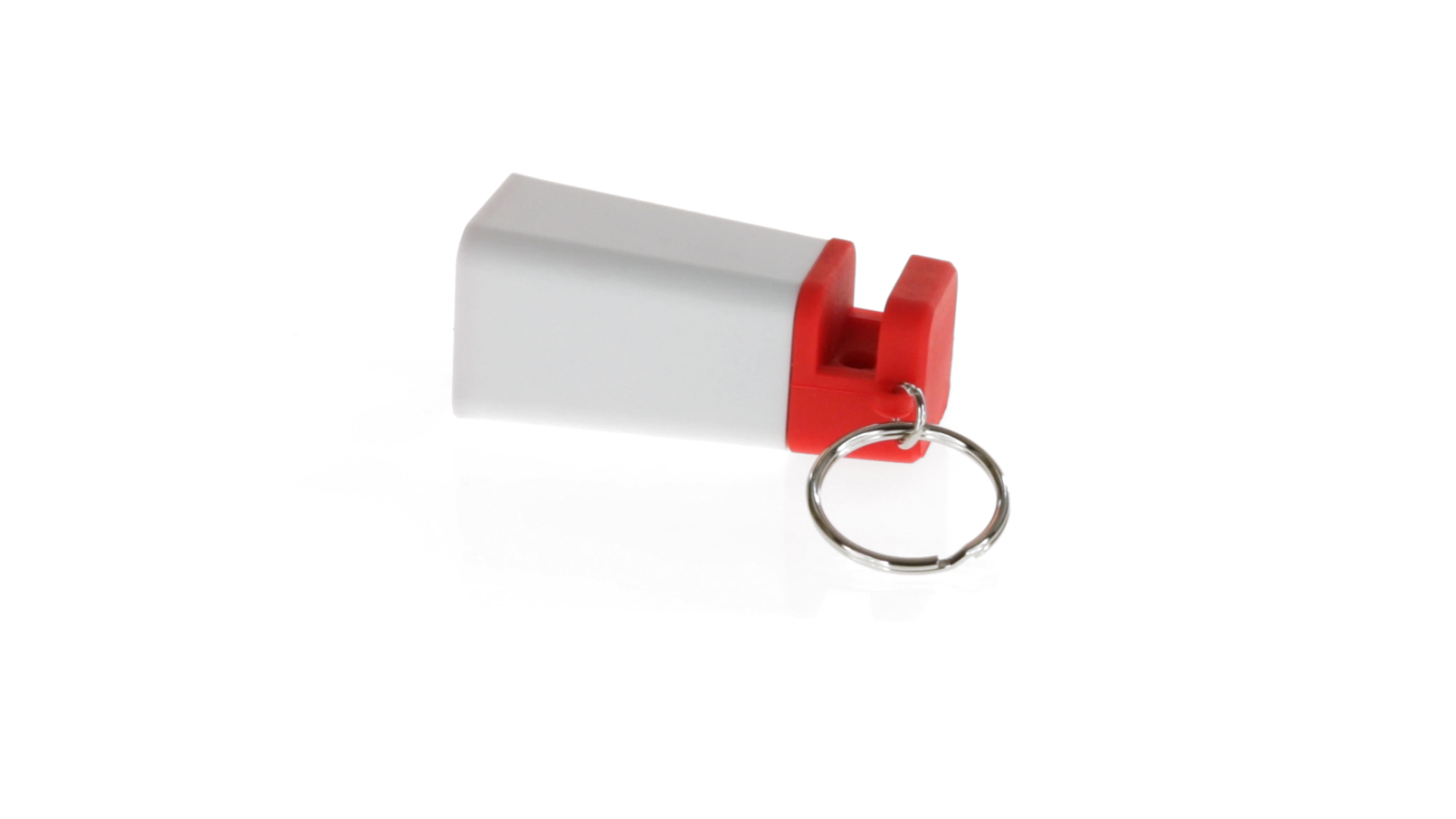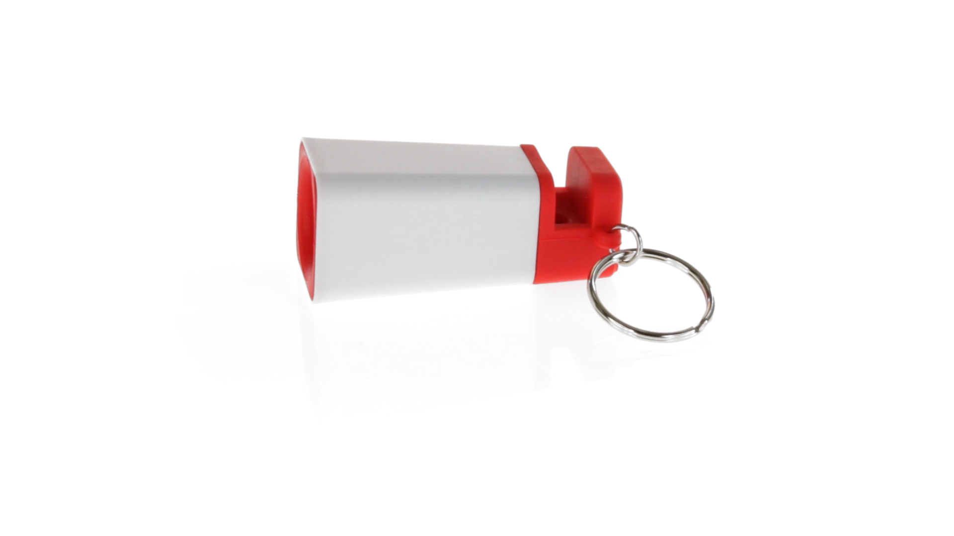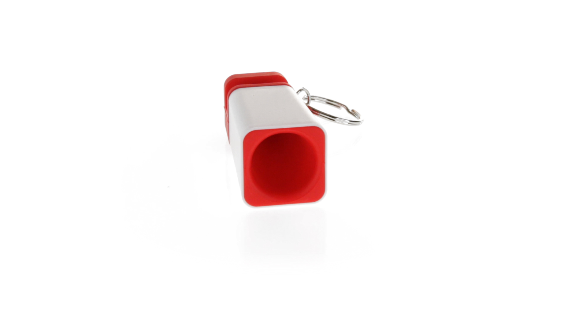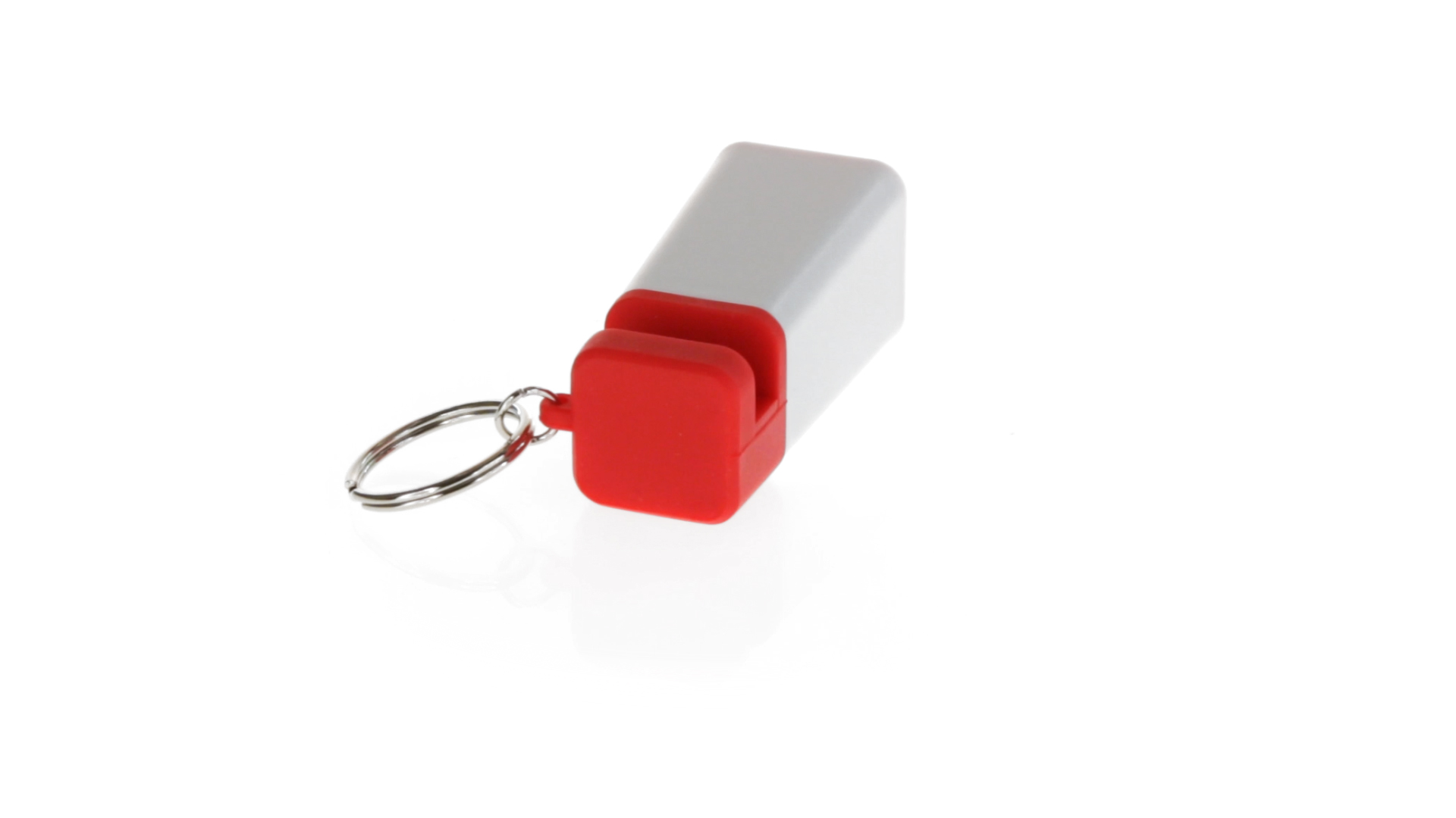 Schlüsselanhänger mit Smartphone-Ständer und manuellem Lautsprecher mit minimalistischem, zweifarbigem Design - speziell entwickelt für den Tampondruck.