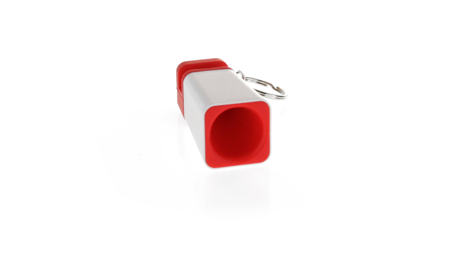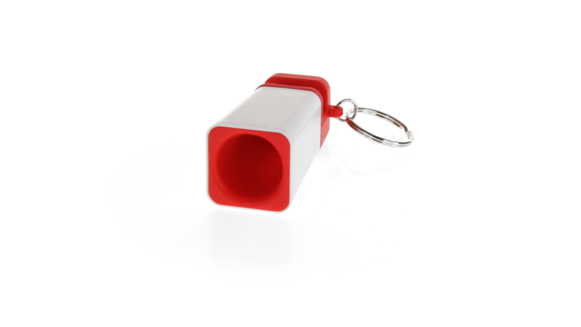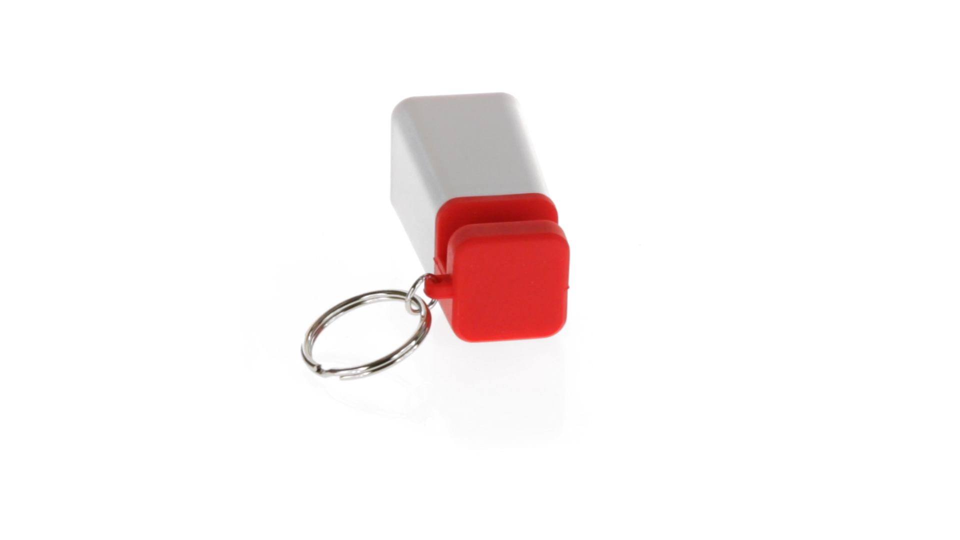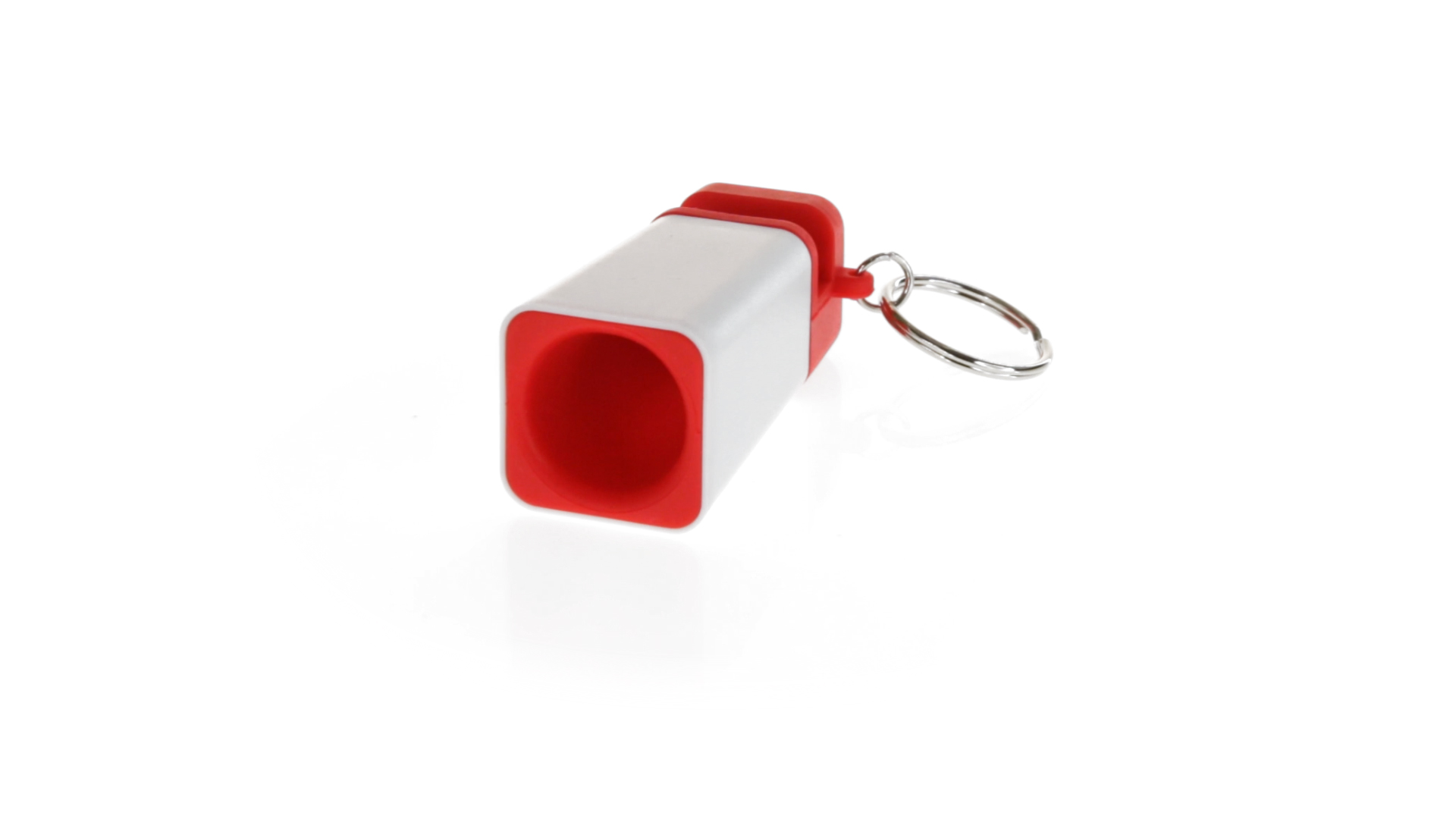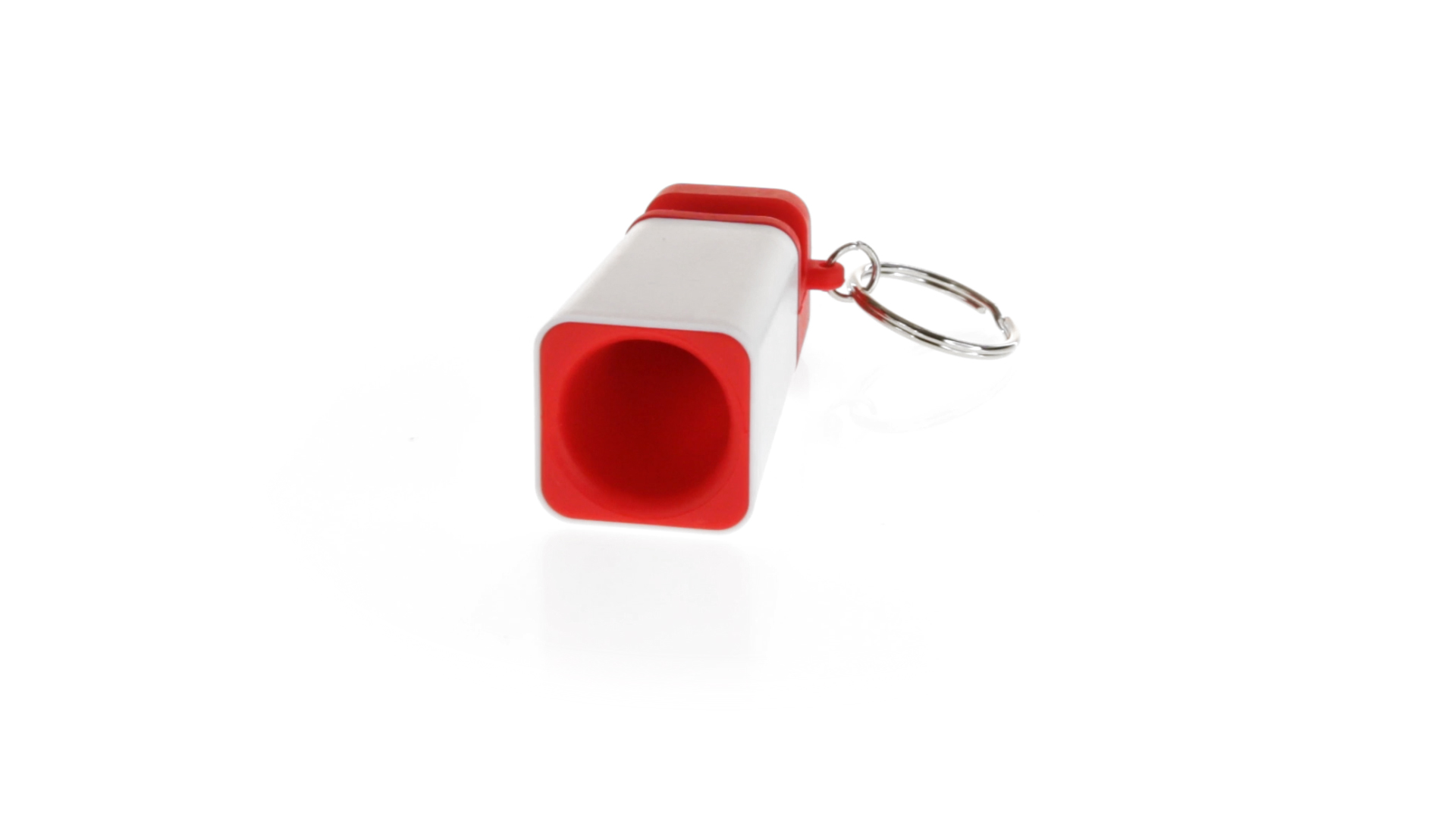 Schlüsselanhänger mit Smartphone-Ständer und manuellem Lautsprecher mit minimalistischem, zweifarbigem Design - speziell entwickelt für den Tampondruck.