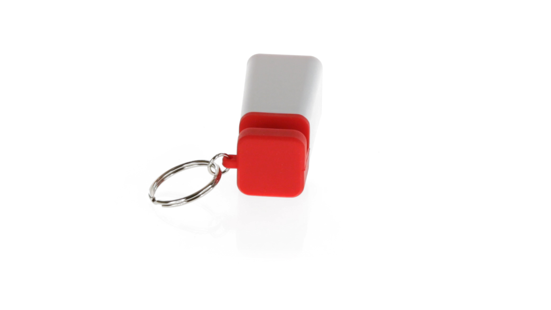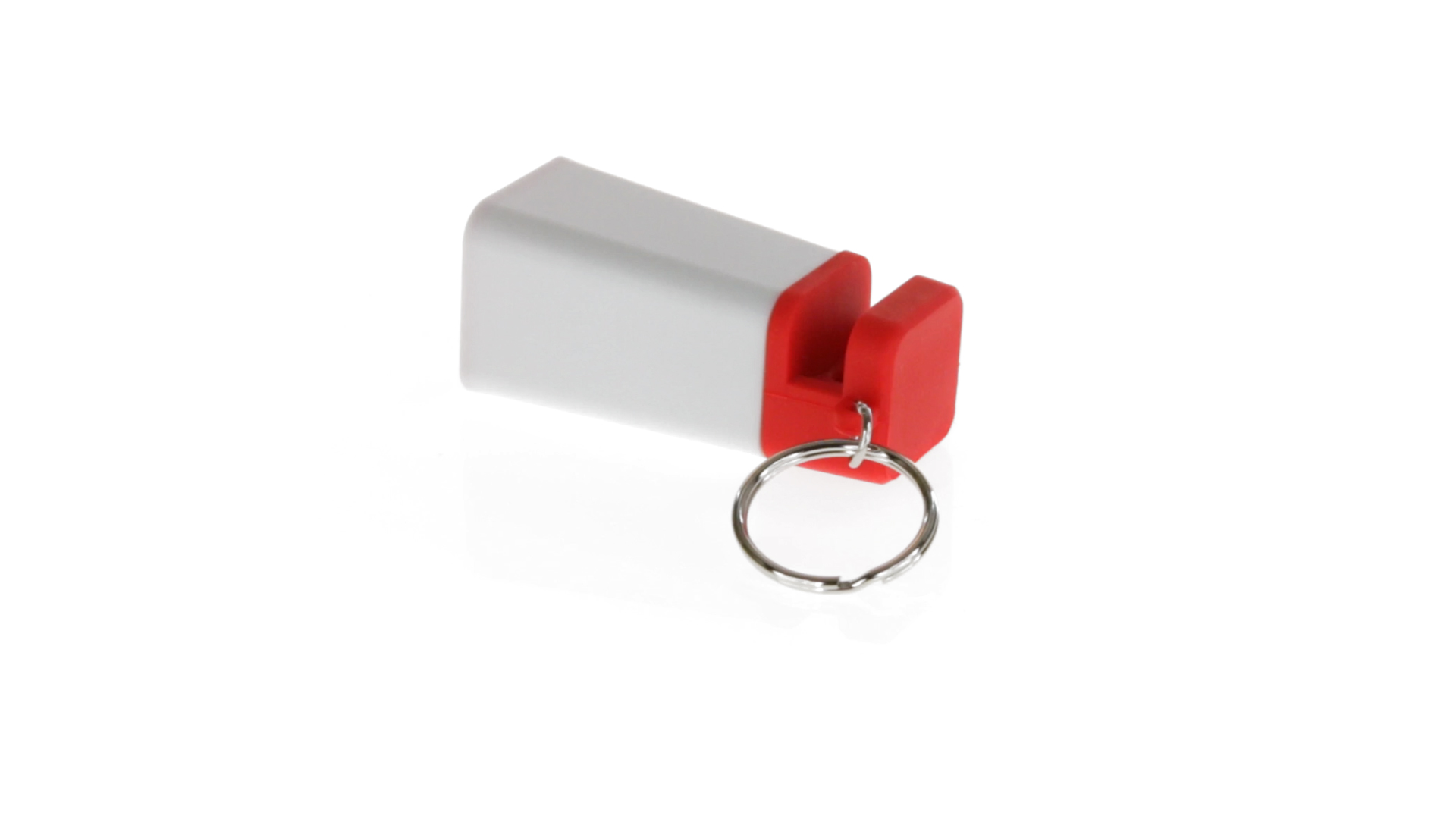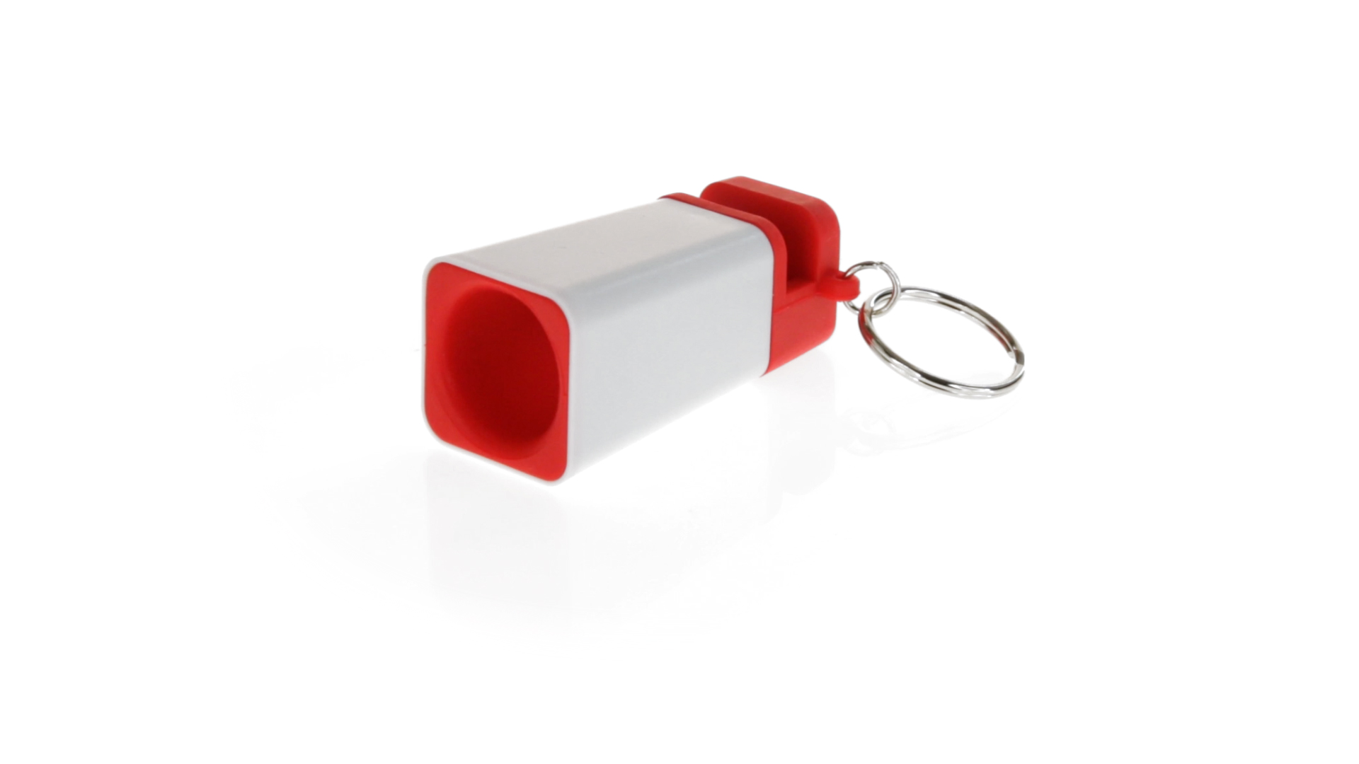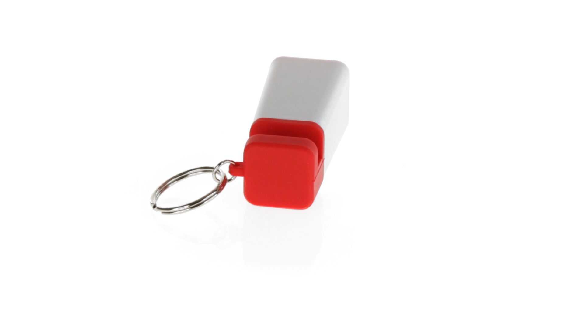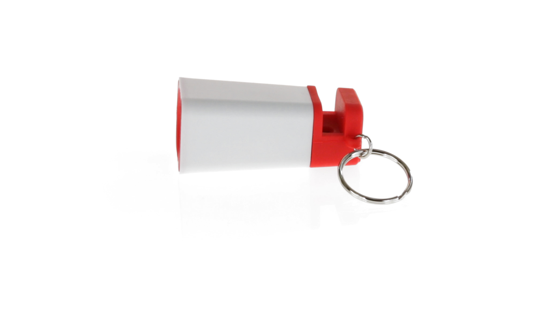 Schlüsselanhänger mit Smartphone-Ständer und manuellem Lautsprecher mit minimalistischem, zweifarbigem Design - speziell entwickelt für den Tampondruck.