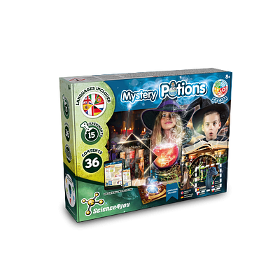 Lernspiel für Kinder, das magische Experimente, Wissenschaft, Bildung und Spass vereint! Dieses Spielzeug enthält 36 Inhalte und 15 magische Experimente. Sie können im Dunkeln leuchtende Tränke, riesige Seifenblasen und eine Halskette mit einem Zaubertrank herstellen. Enthält einen Zauberstab und einen Kessel für Zaubertränke. Empfohlenes Alter: 8+ 380 x 290 x 80 mm