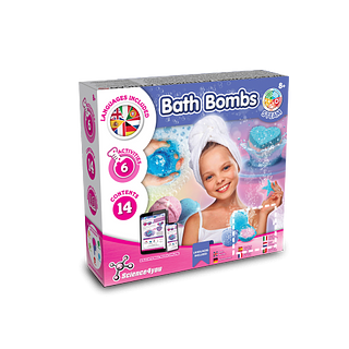 Lernspiel für Kinder zum Vorbereiten und Geniessen im Bad. Ein Kit zur Herstellung von glitternden und entspannenden Badebomben in verschiedenen Farben und Formen. Empfohlenes Alter: 8+ 233 x 218 x 63 mm