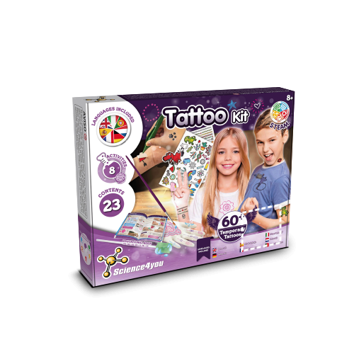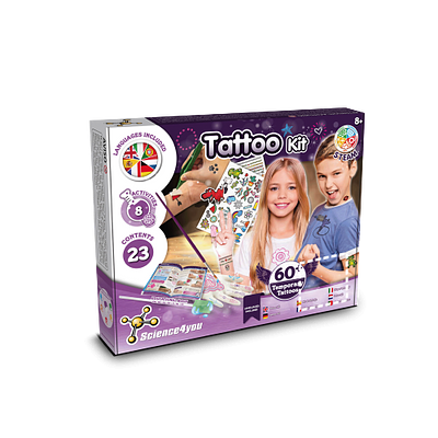Lernspiel für Kinder, ideal für die Vorbereitung ihrer ersten temporären Tattoos. Ein Kit, dass die Entdeckung der Geschichte und verschiedener Tätowiermethoden ermöglicht. Enthält 23 Inhalte. Empfohlenes Alter: 8+ 230 x 220 x 65 mm