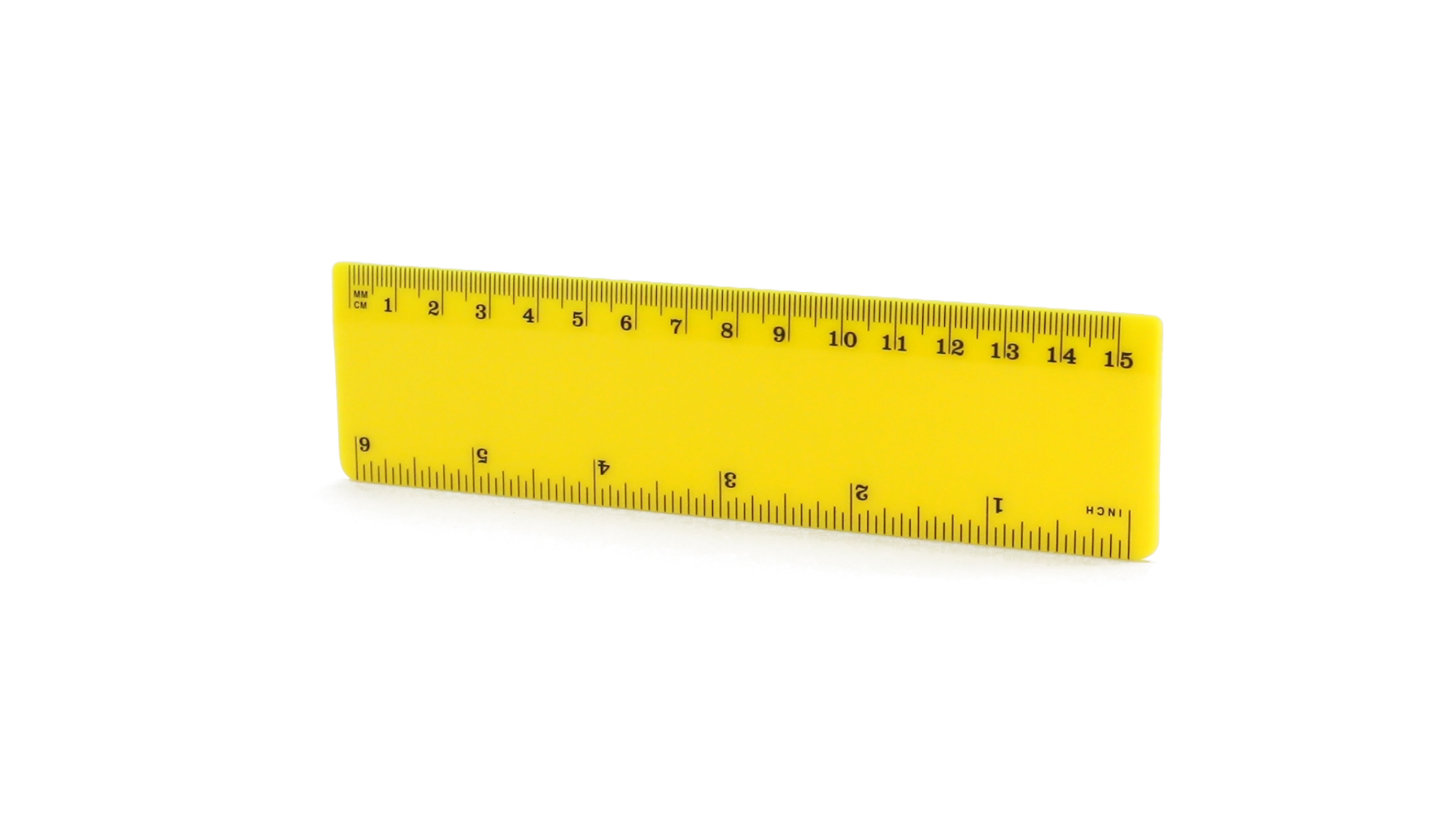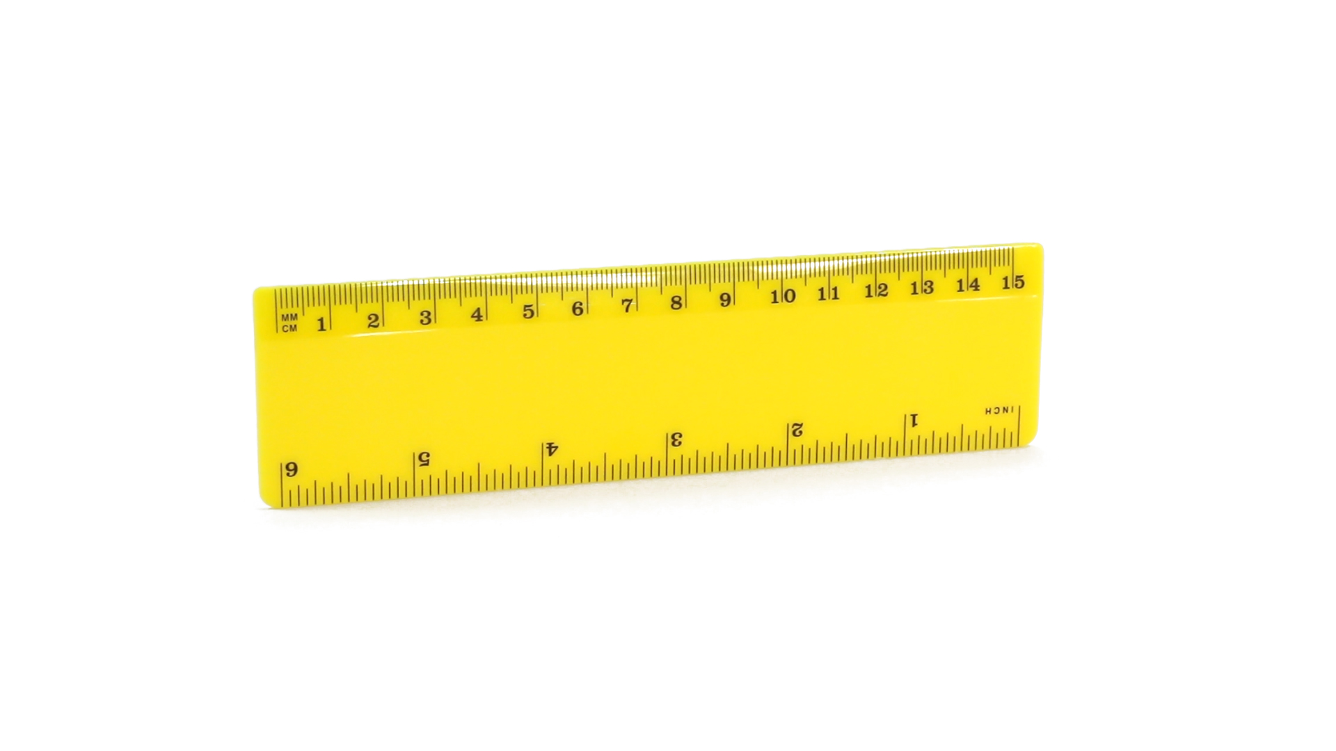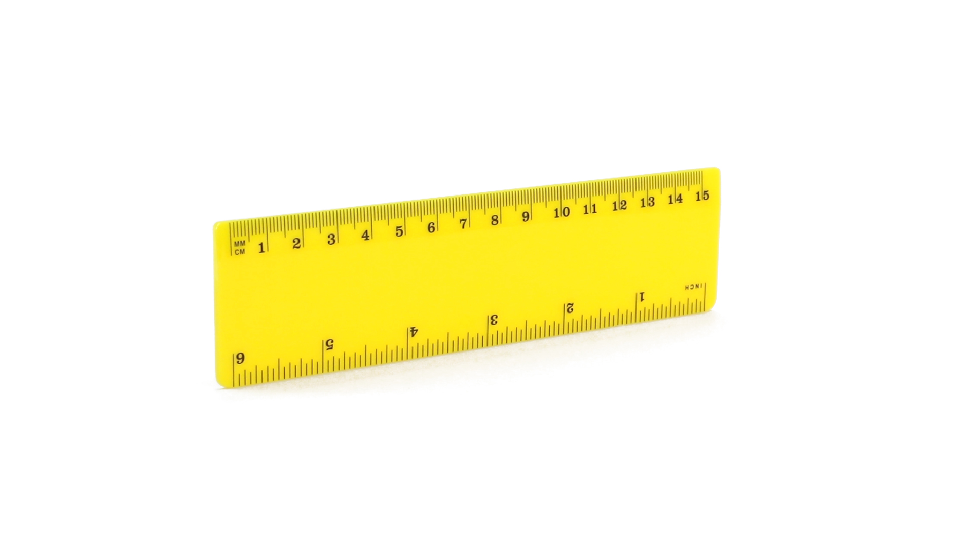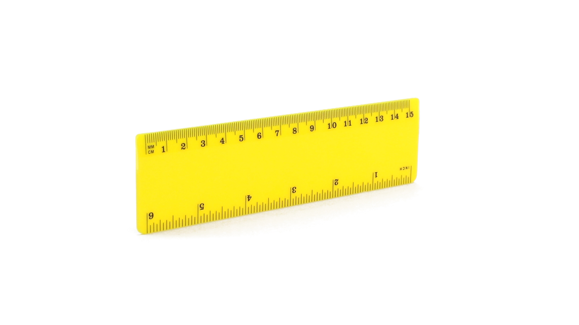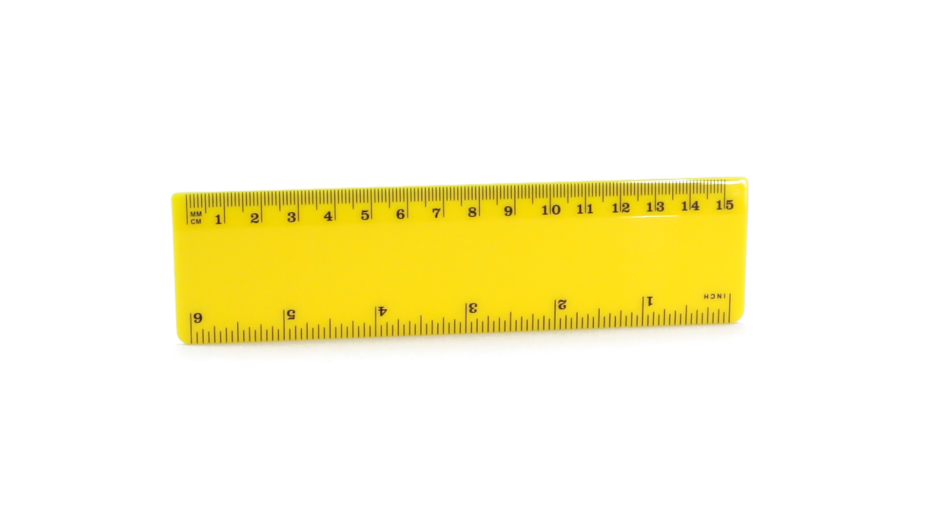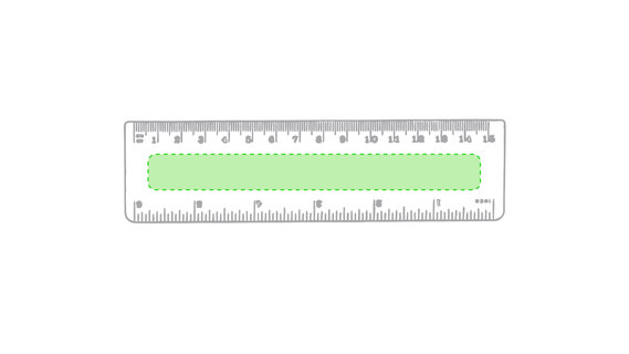 15 cm langes Lineal in glänzender Ausführung und kräftigen Farben. Metrisches System in cm und Zoll.