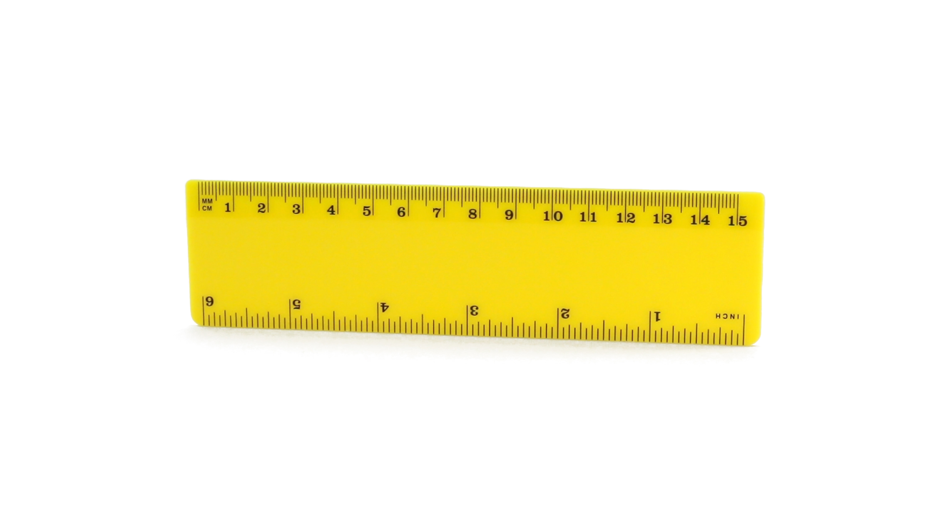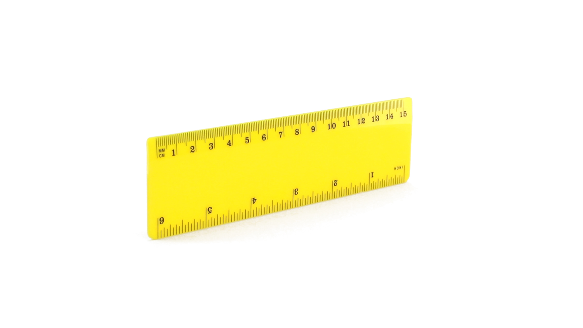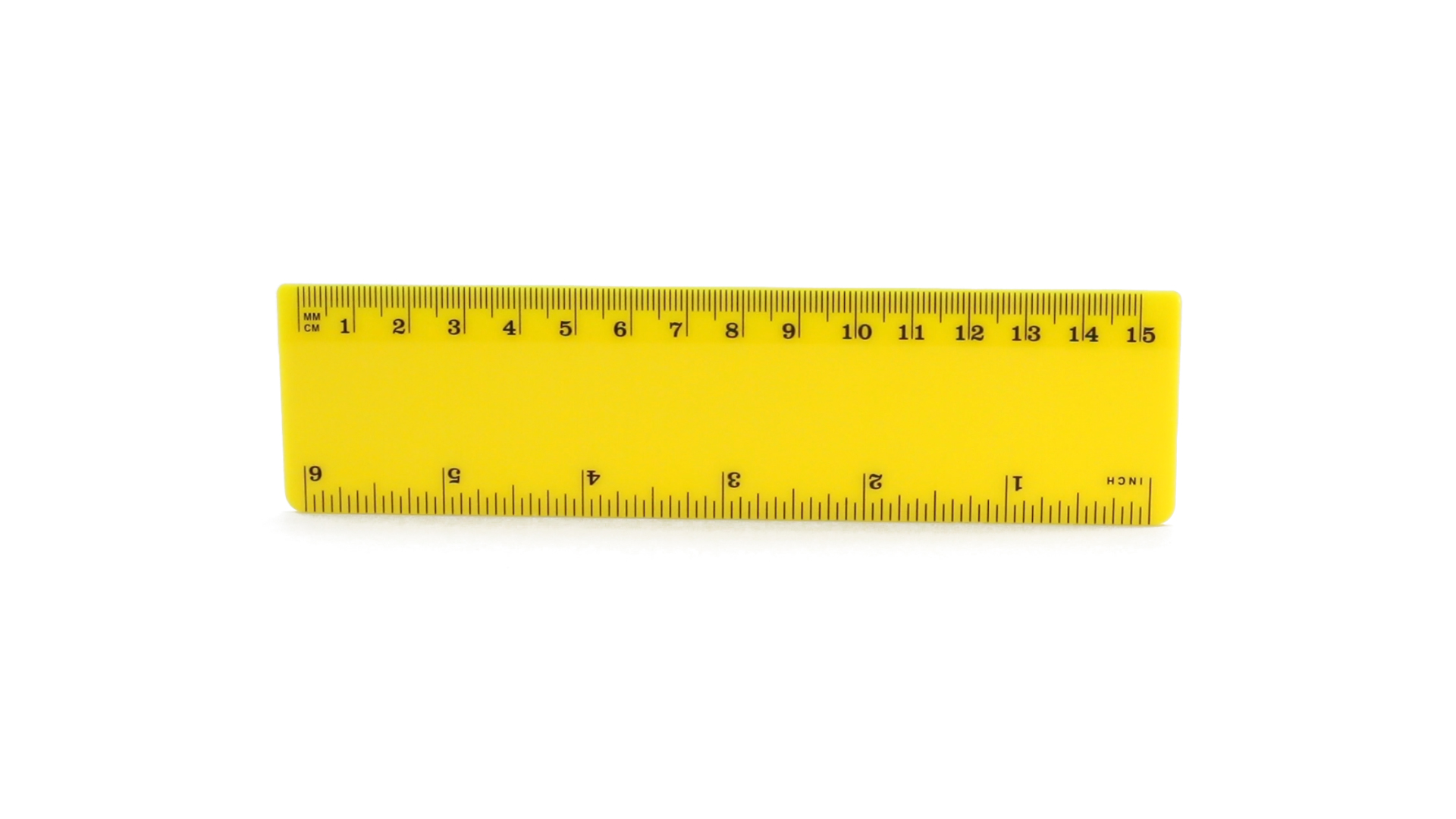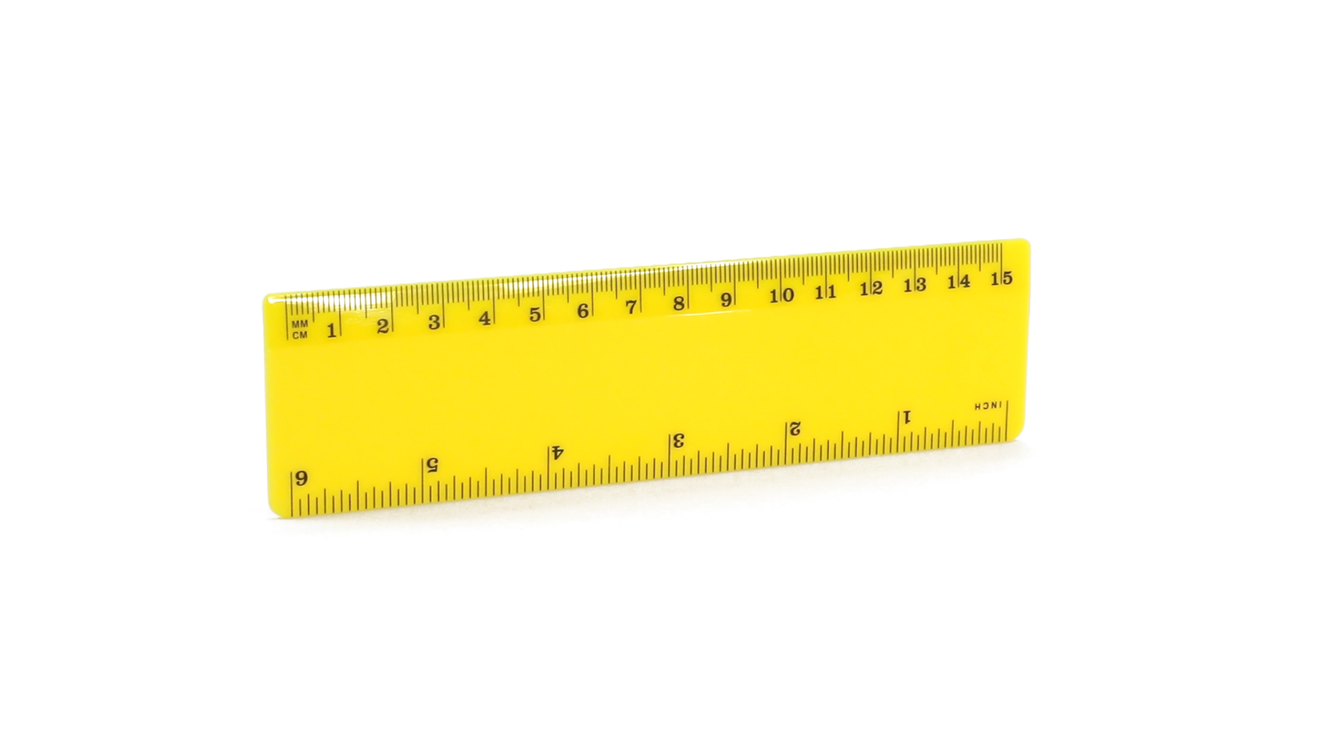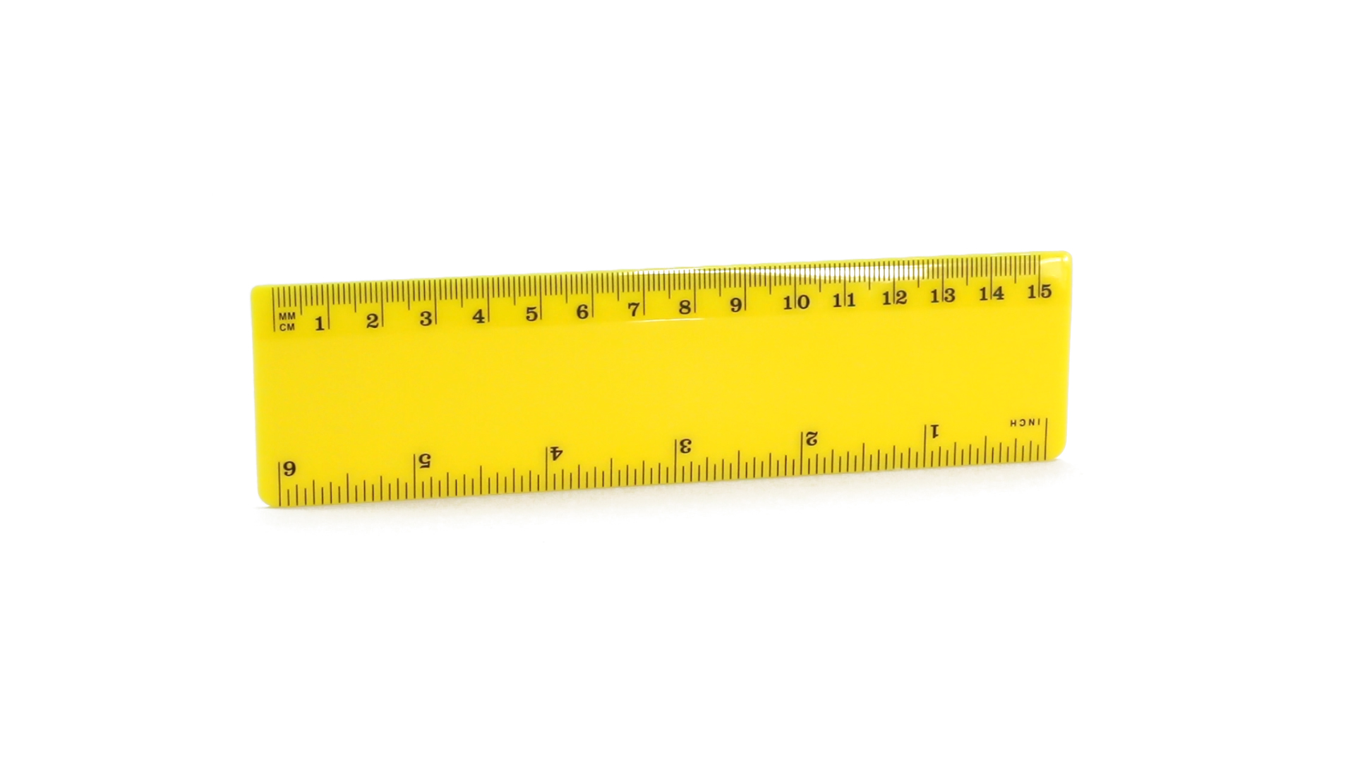 15 cm langes Lineal in glänzender Ausführung und kräftigen Farben. Metrisches System in cm und Zoll.