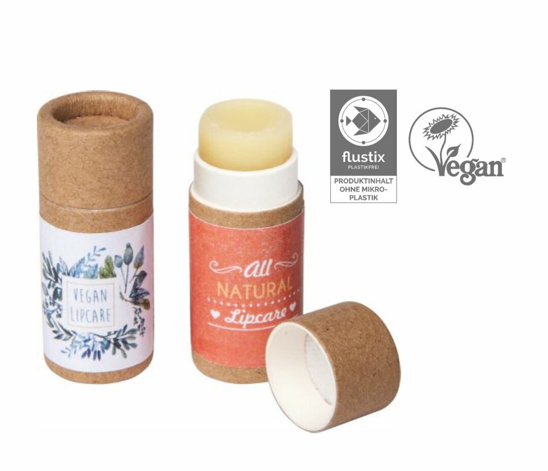 Unsere okologische bedruckbare Lippenpflege - umweltfreundlich, vegane Lippenpflege-Gehäuse wird komplett ohne Kunststoff gefertigt und ist kompostierbar. Es wird mit einem 4c Papier-Etikett veredelt, ab 10.000 Stück auch mit Direktdruck.