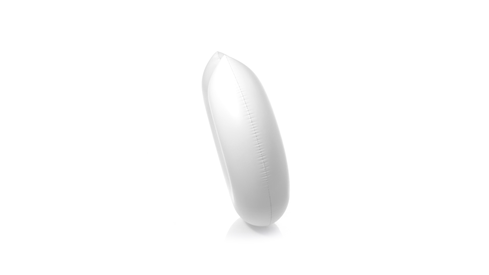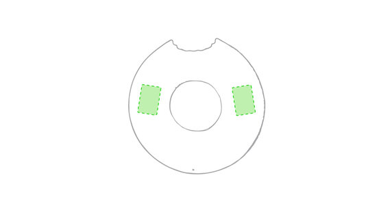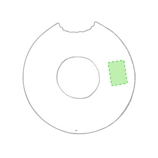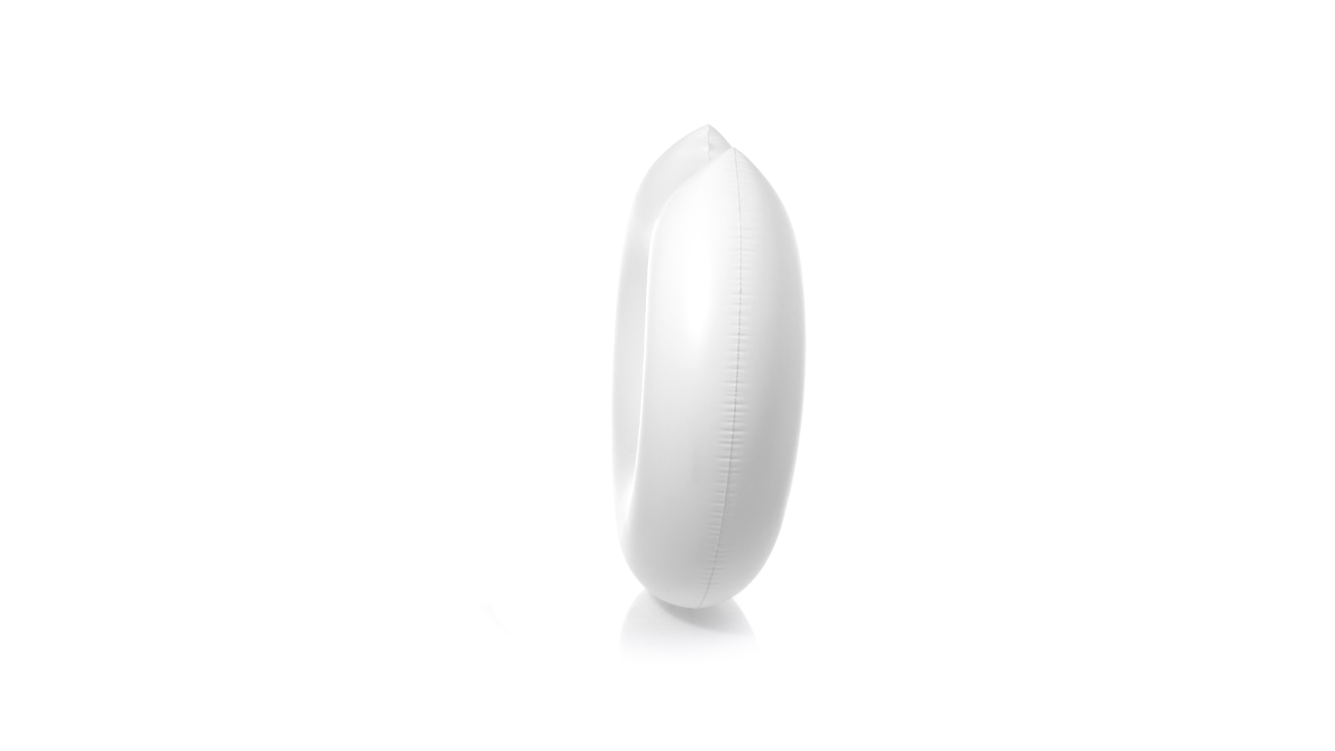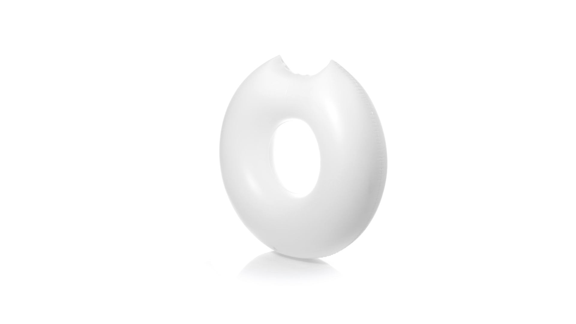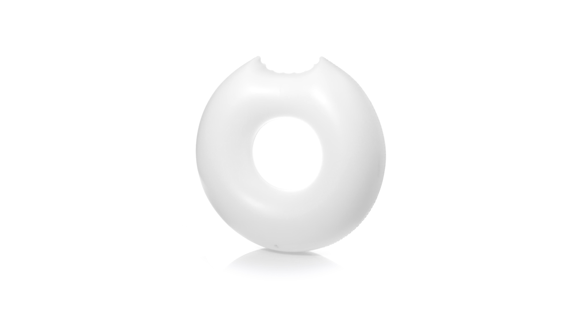 Originelle Luftmatratze aus PVC in Maxi-Grösse und Form eines angebissenen Donuts. Präsentiert mit spezieller Faltung für einfaches Bedrucken.