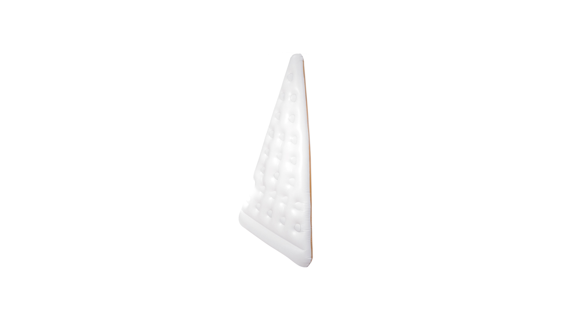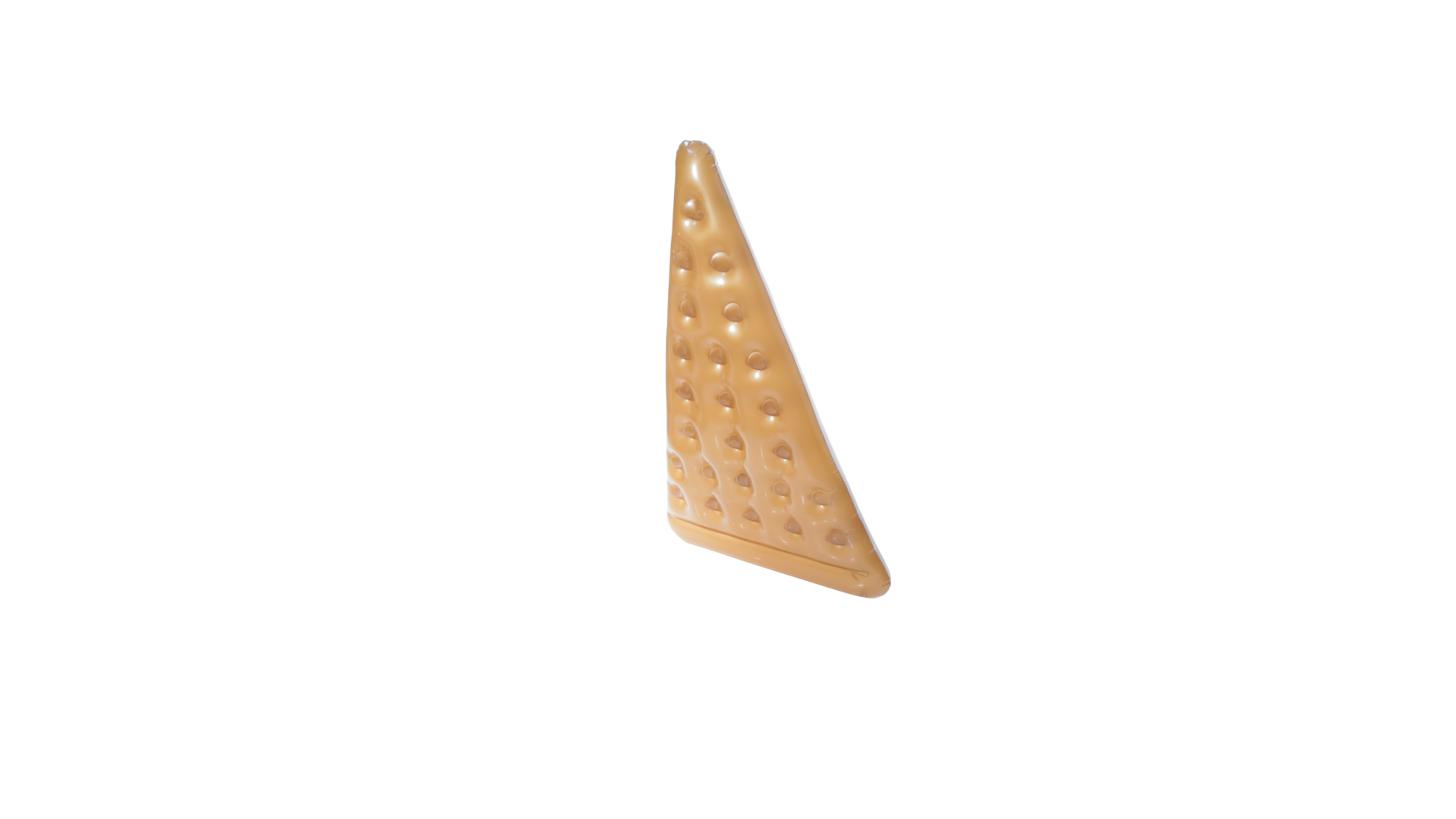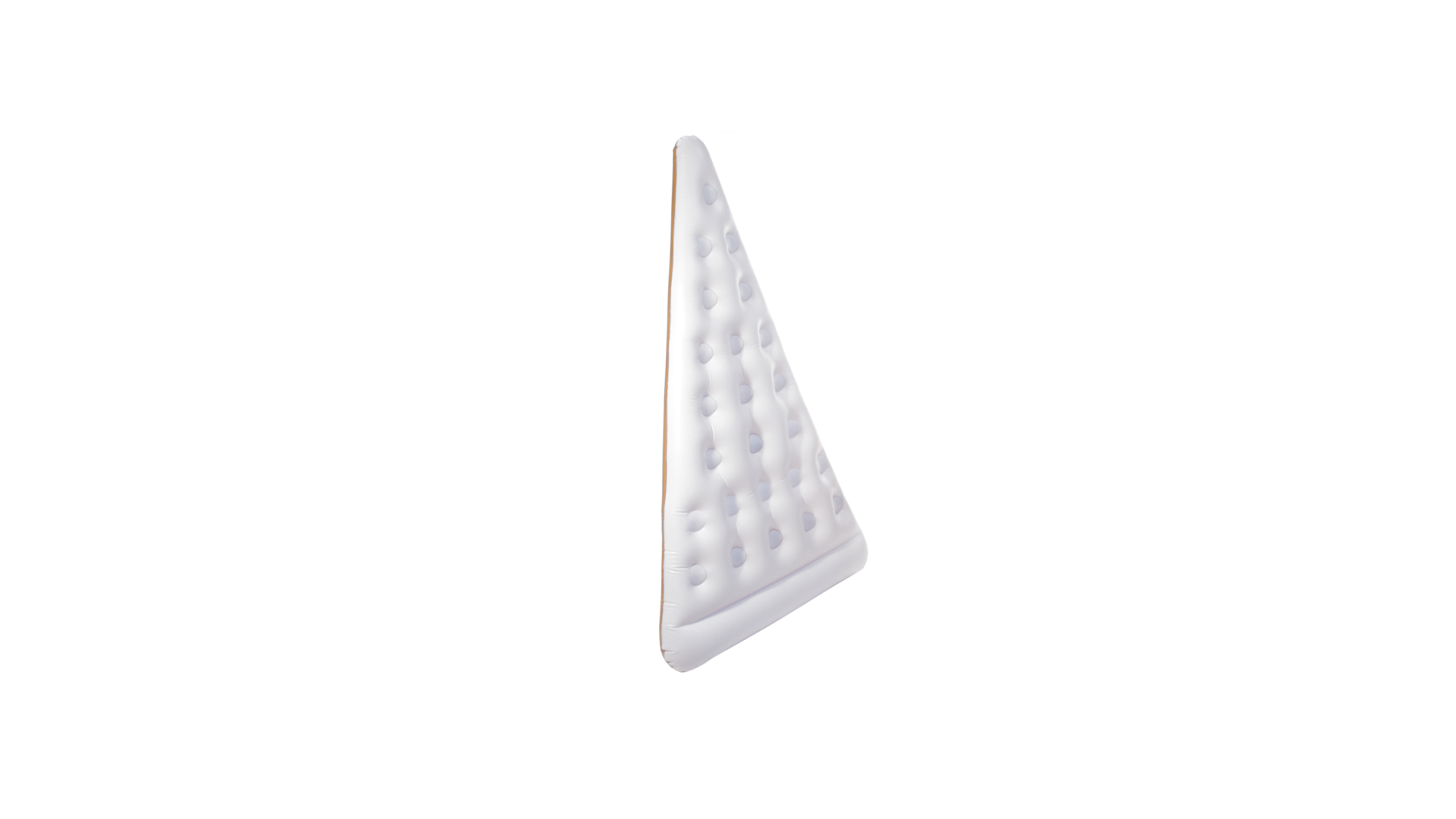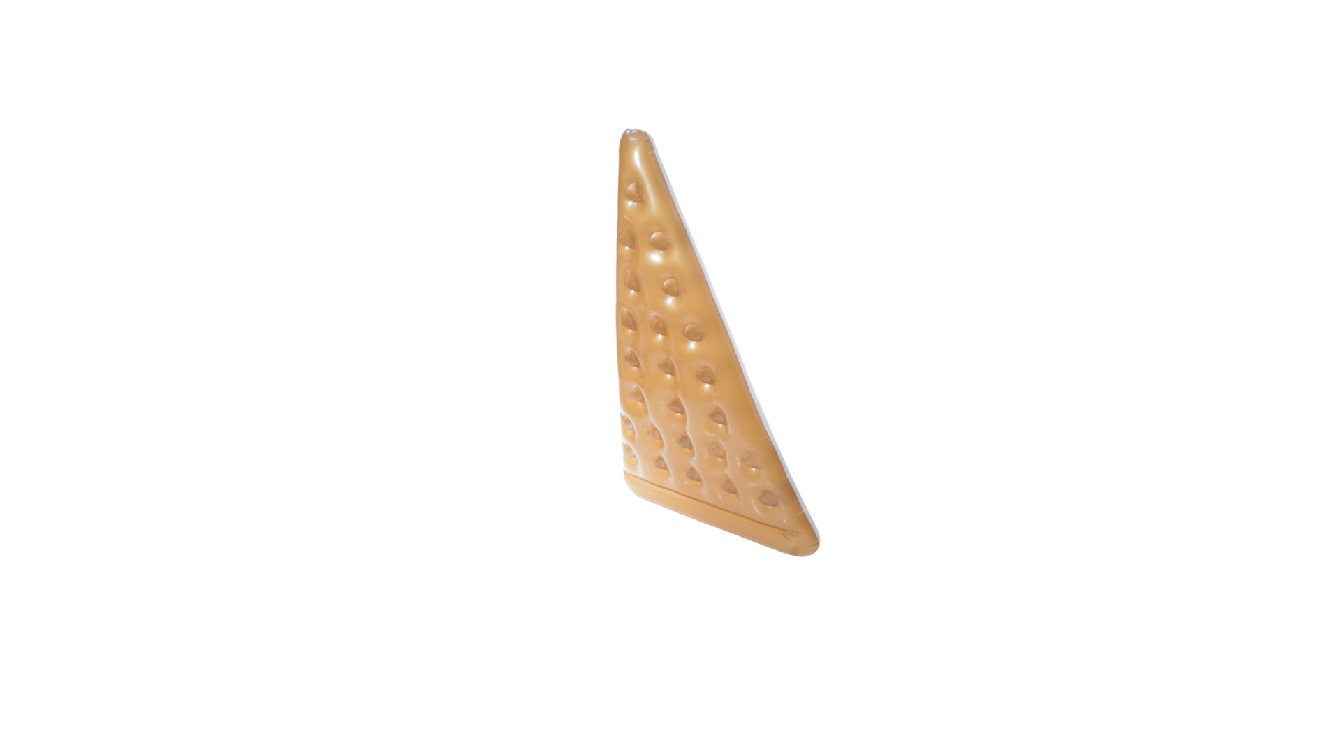 Originelle Luftmatratze aus PVC in Maxi-Grösse und Form eines Pizzastücks. Präsentiert mit spezieller Faltung für einfaches Bedrucken.