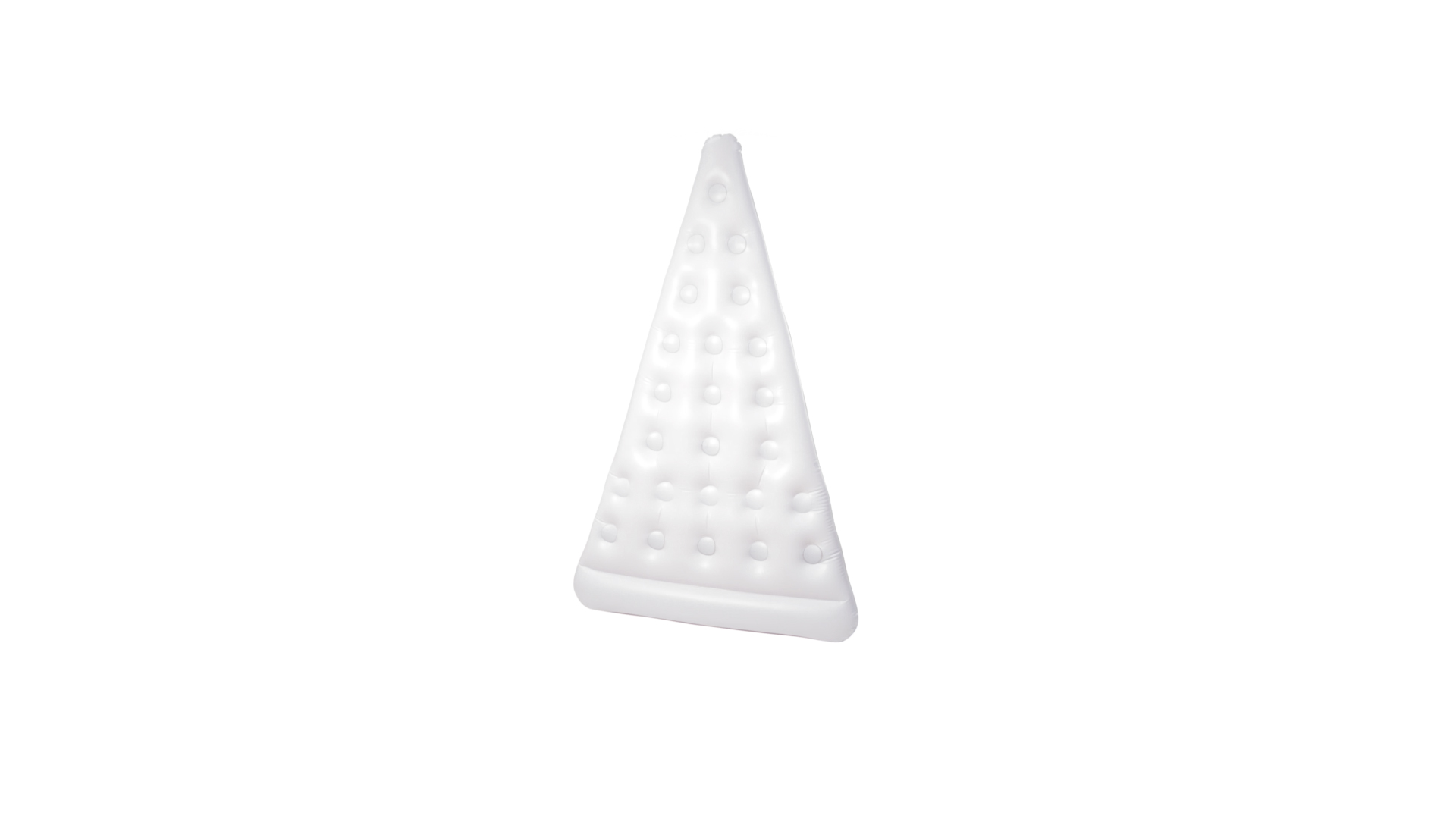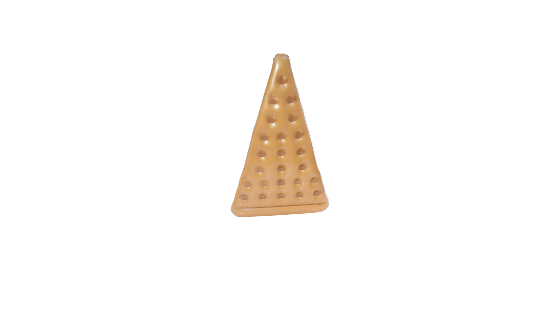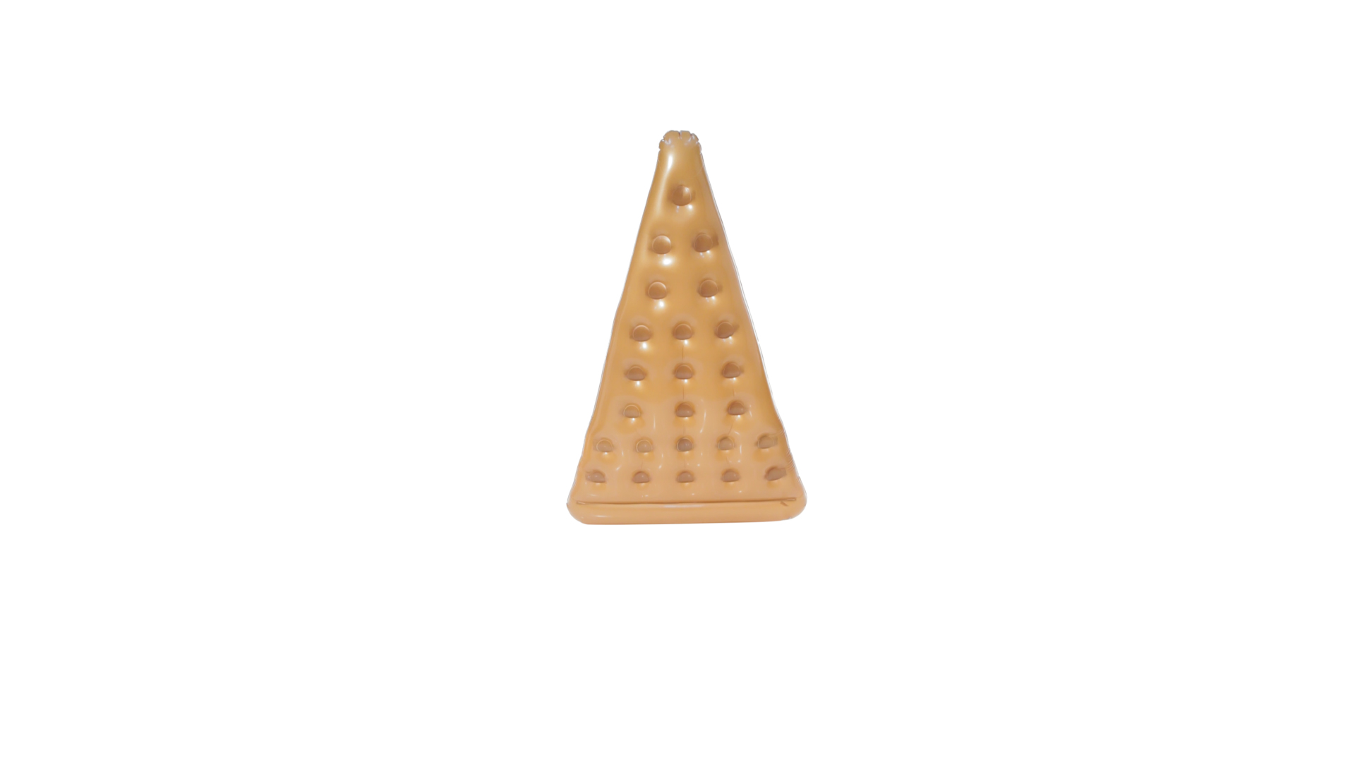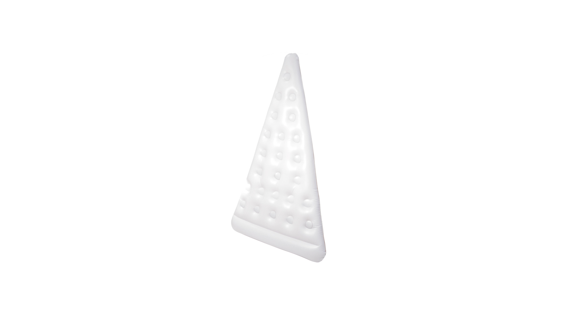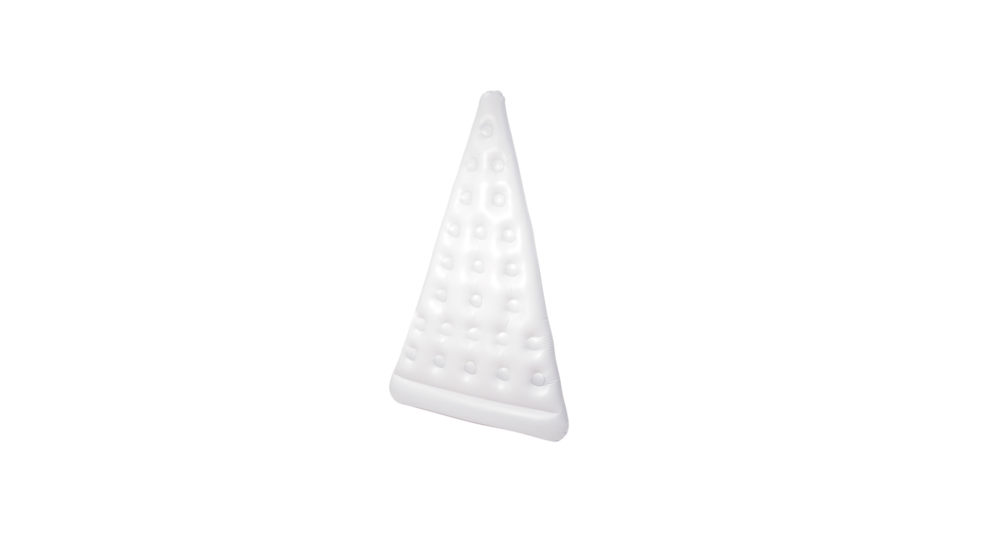 Originelle Luftmatratze aus PVC in Maxi-Grösse und Form eines Pizzastücks. Präsentiert mit spezieller Faltung für einfaches Bedrucken.