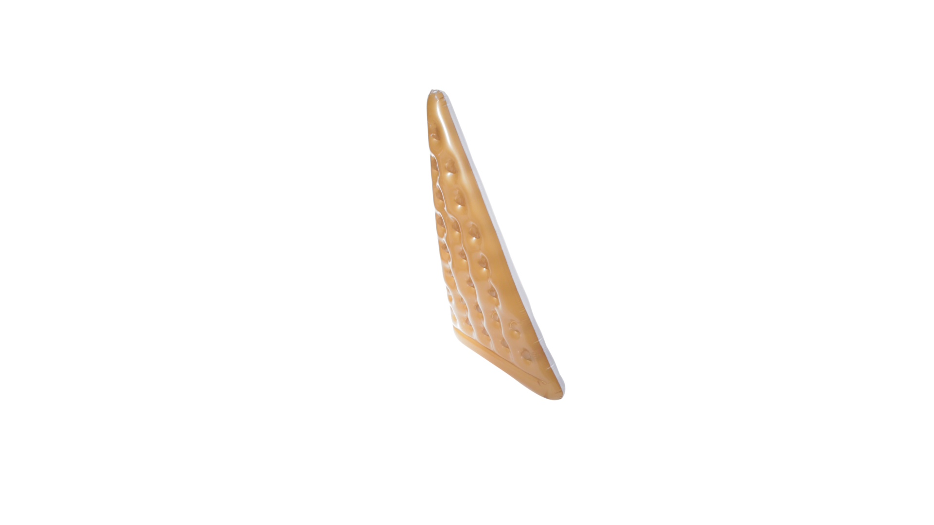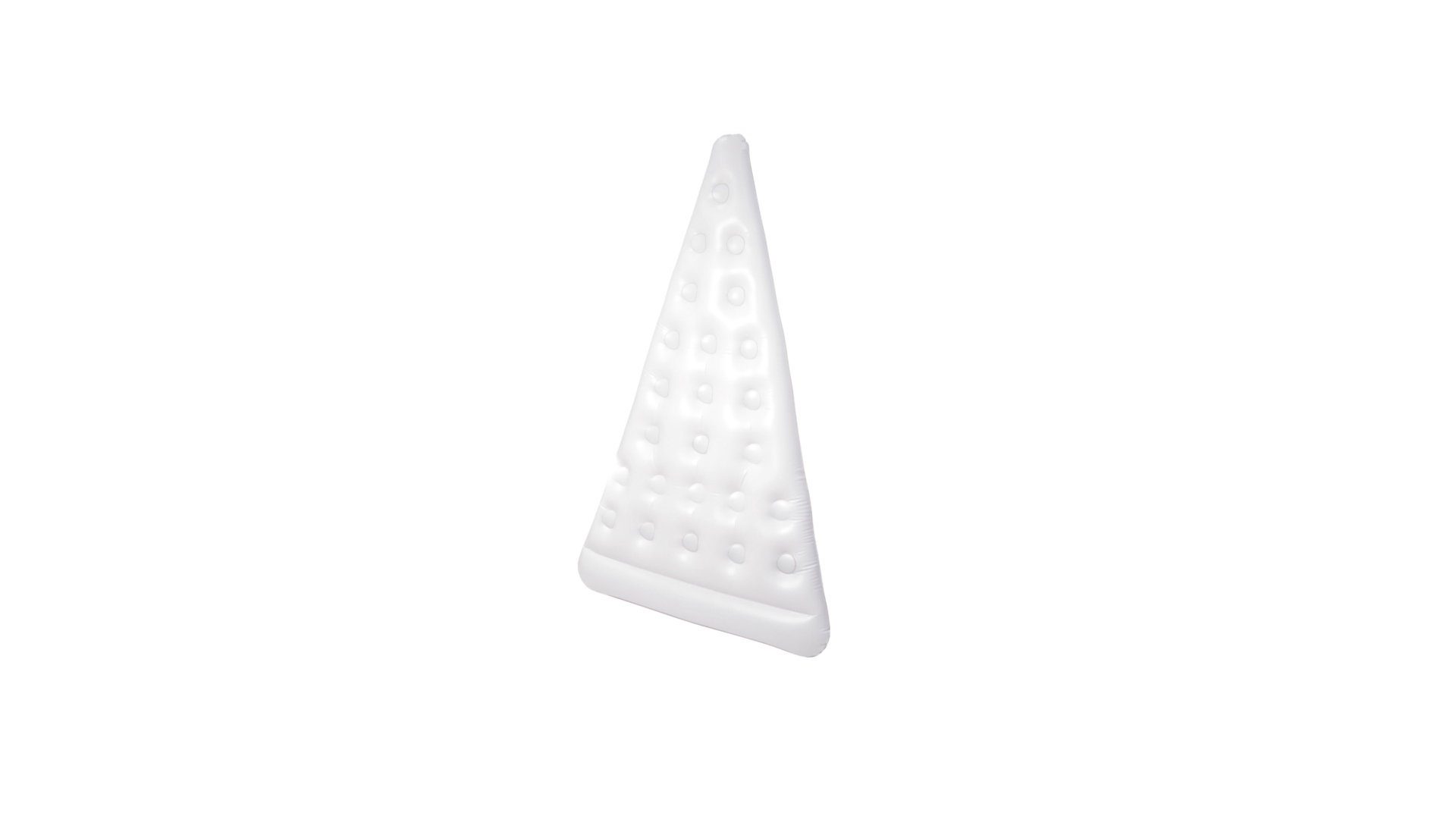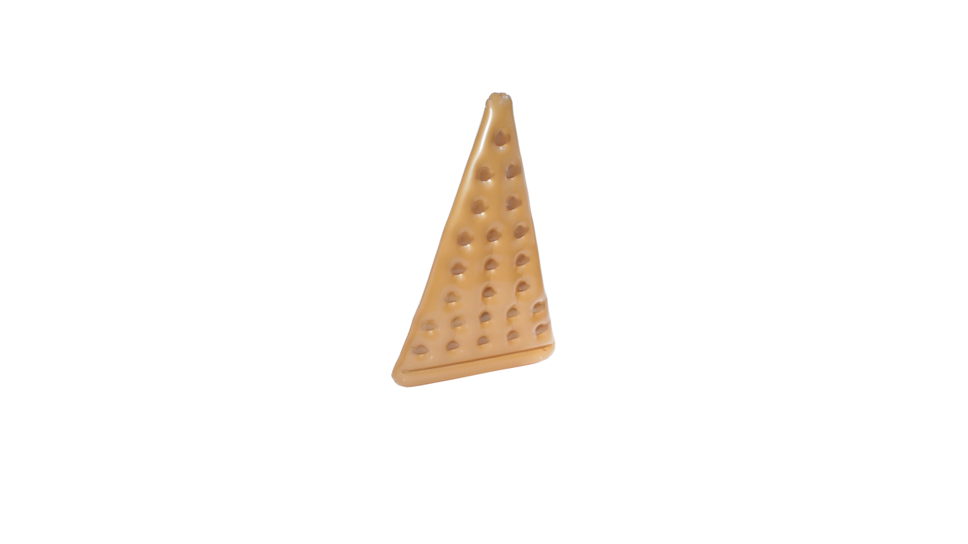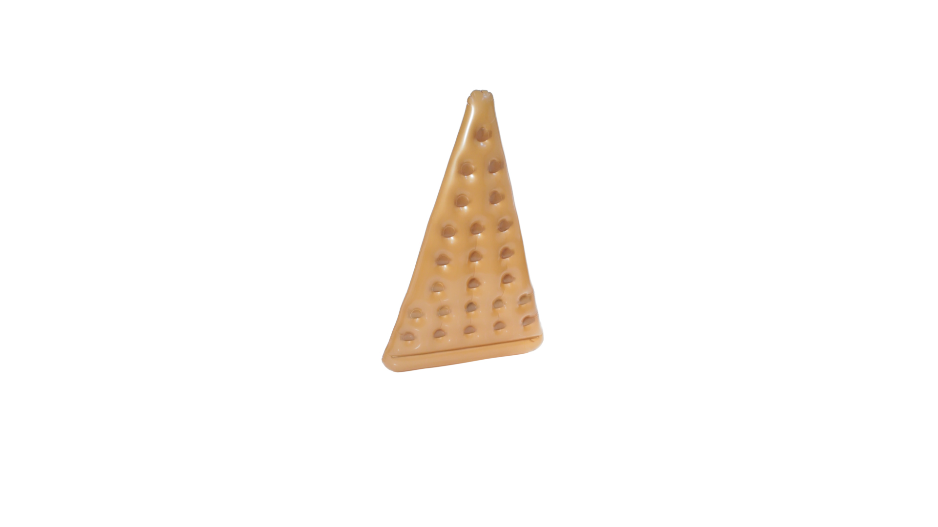 Originelle Luftmatratze aus PVC in Maxi-Grösse und Form eines Pizzastücks. Präsentiert mit spezieller Faltung für einfaches Bedrucken.