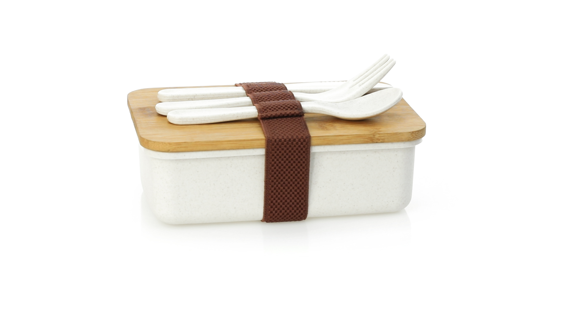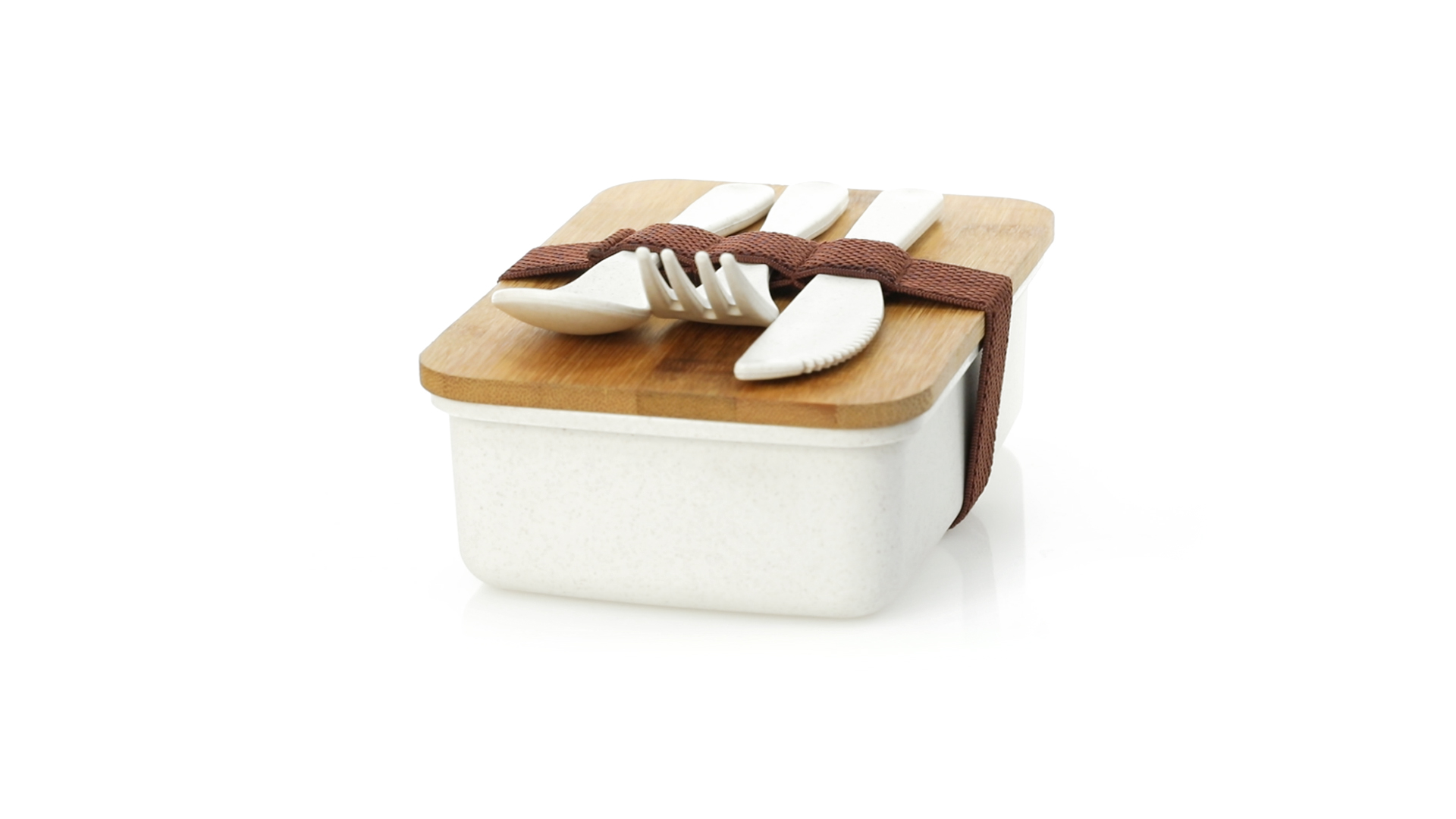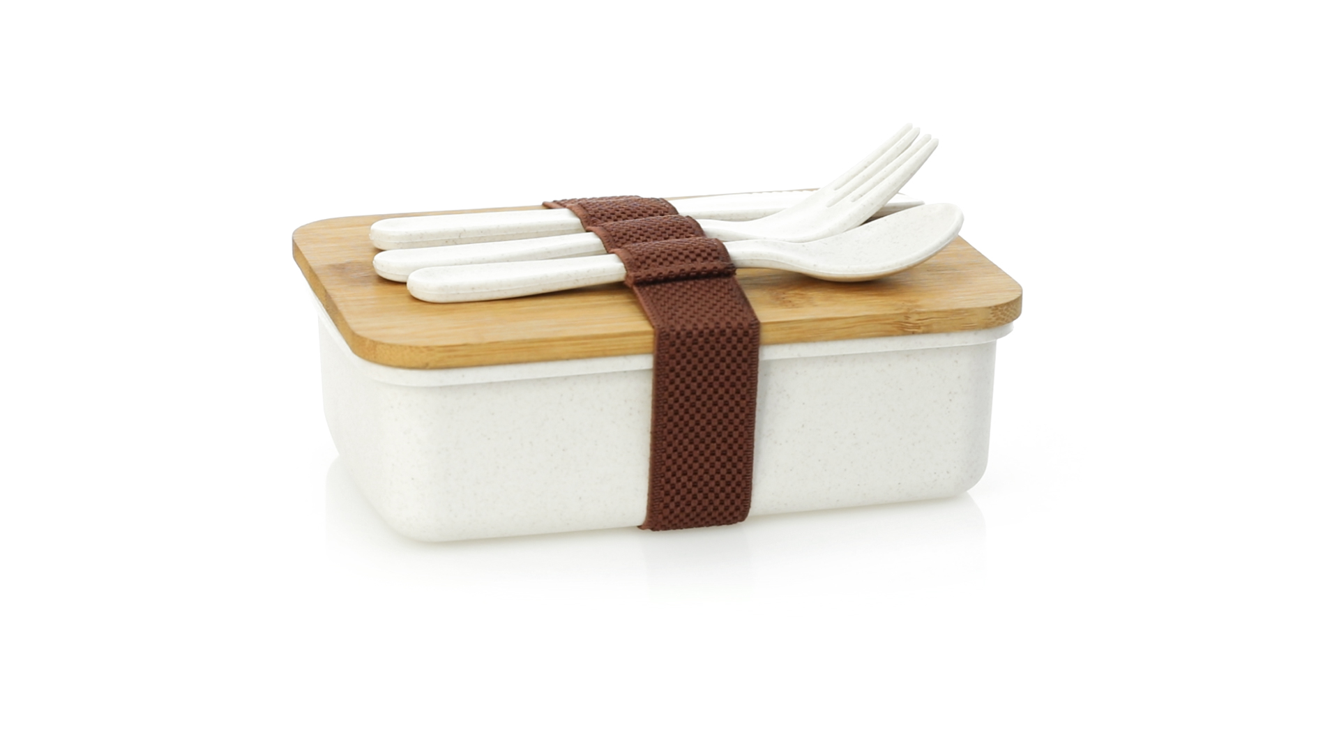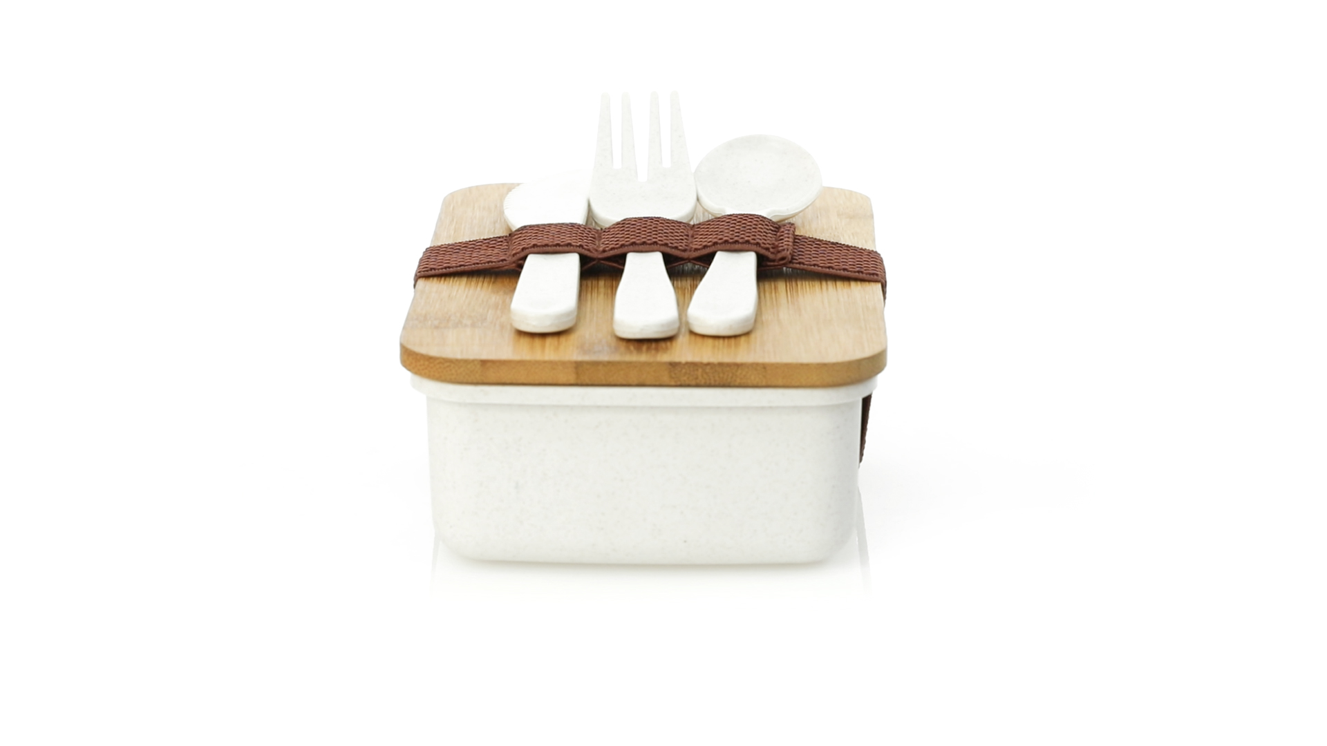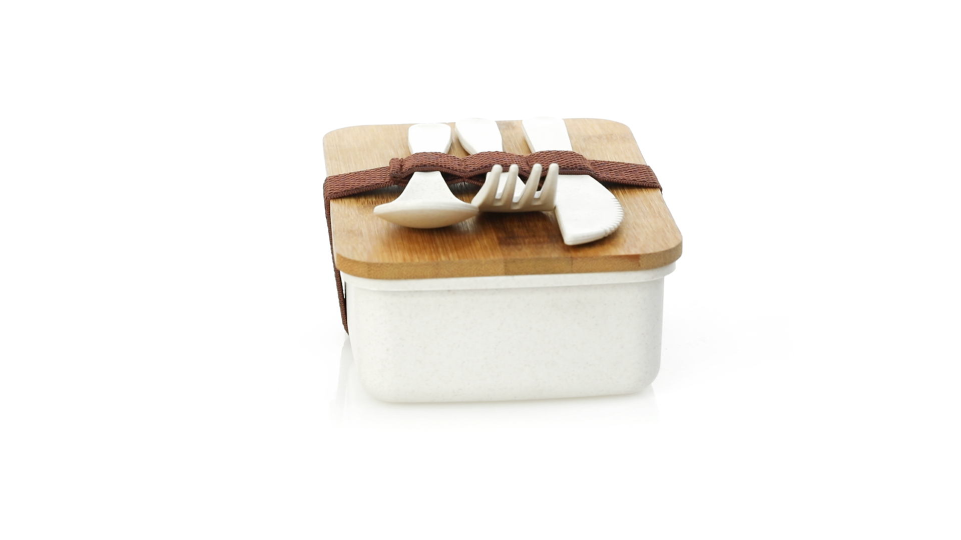 Lunchbox mit 700 ml Fassungsvermögen aus der Naturlinie. Aus Bambusfaser, mit Deckel aus poliertem Bambus. Sicherheitsriemen mit Gabel, Löffel und Messer. BPA-frei und tiefkühltauglich.