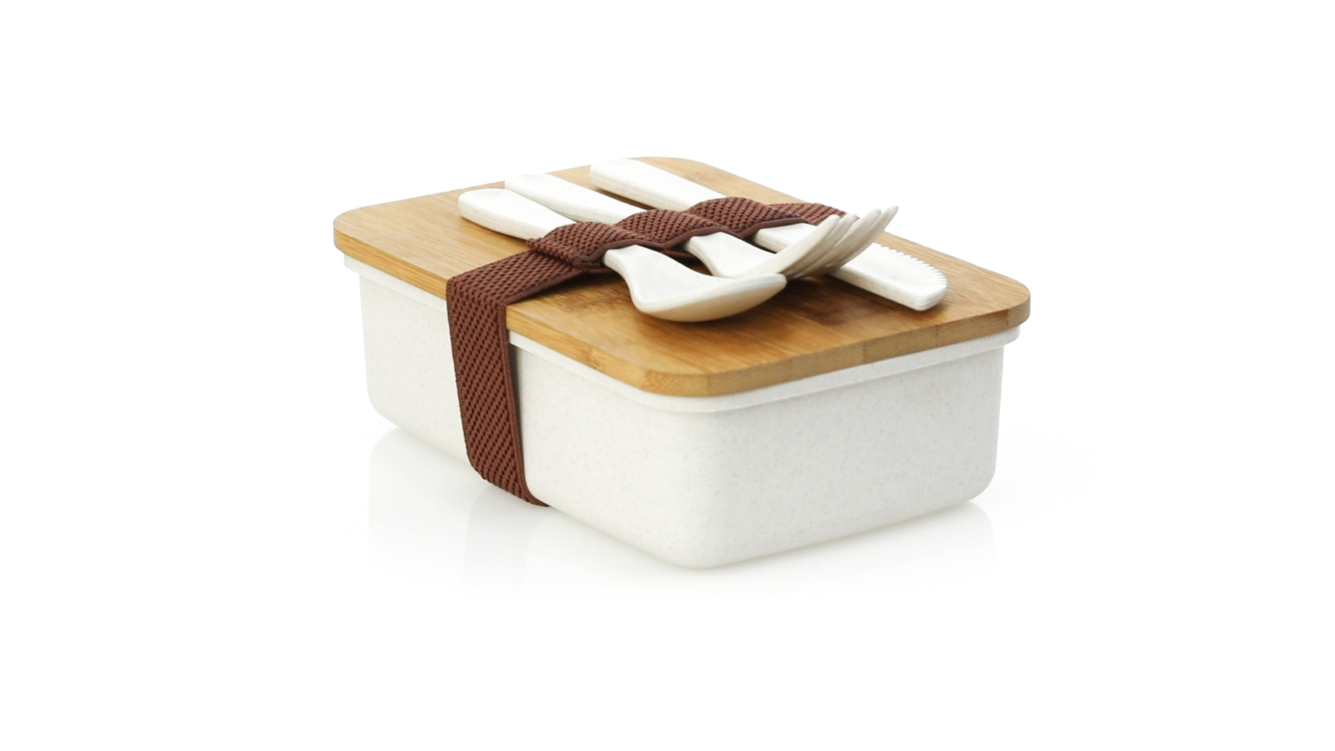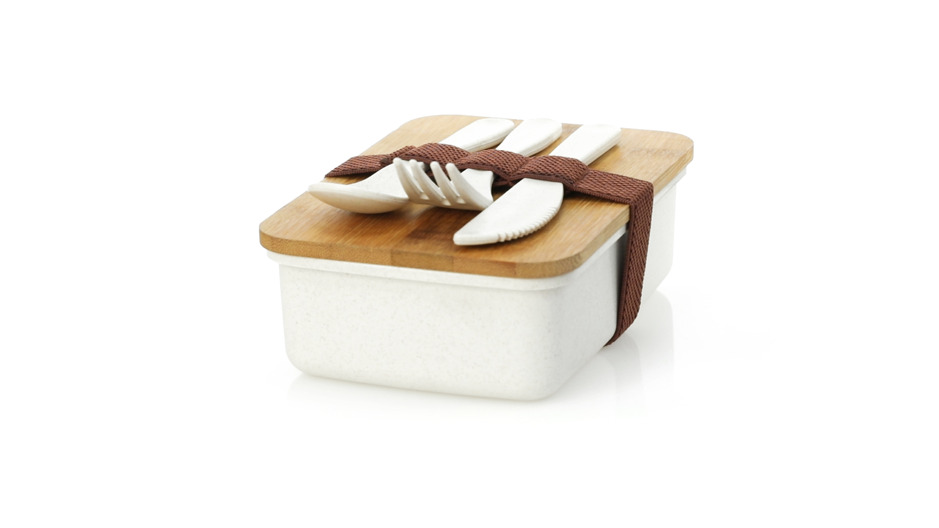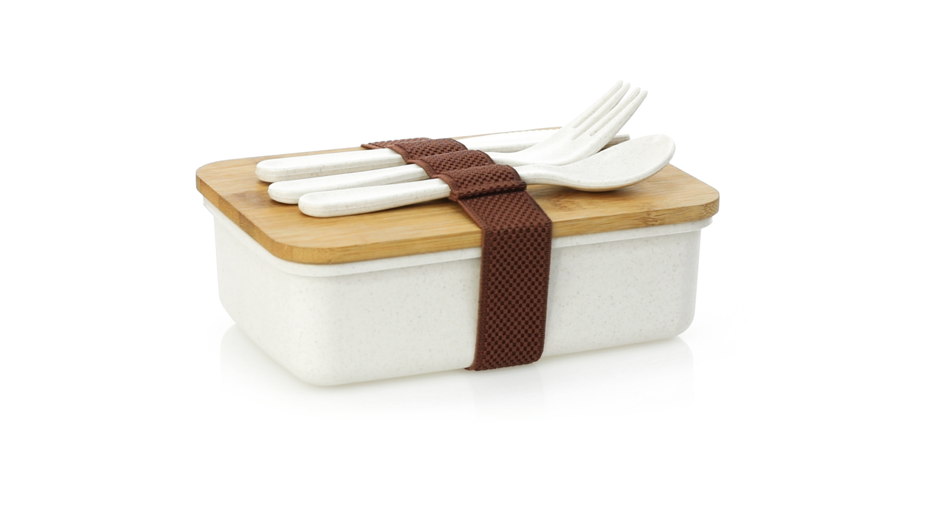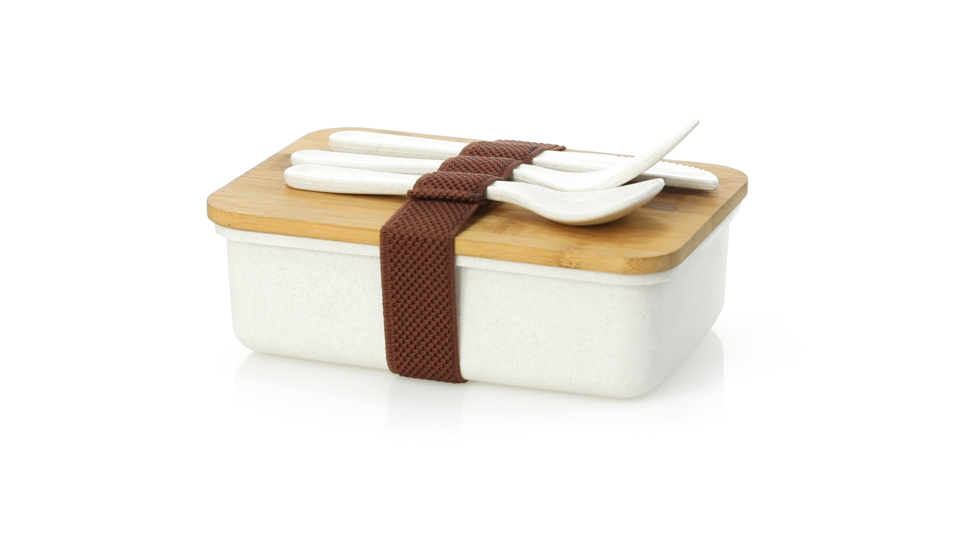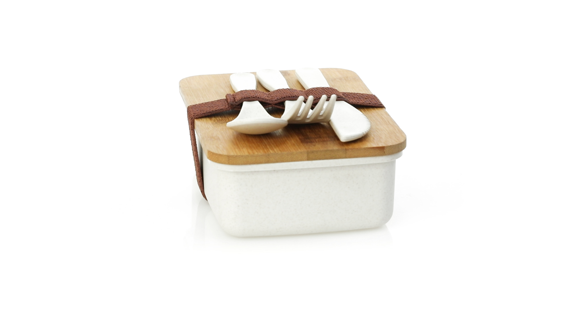 Lunchbox mit 700 ml Fassungsvermögen aus der Naturlinie. Aus Bambusfaser, mit Deckel aus poliertem Bambus. Sicherheitsriemen mit Gabel, Löffel und Messer. BPA-frei und tiefkühltauglich.