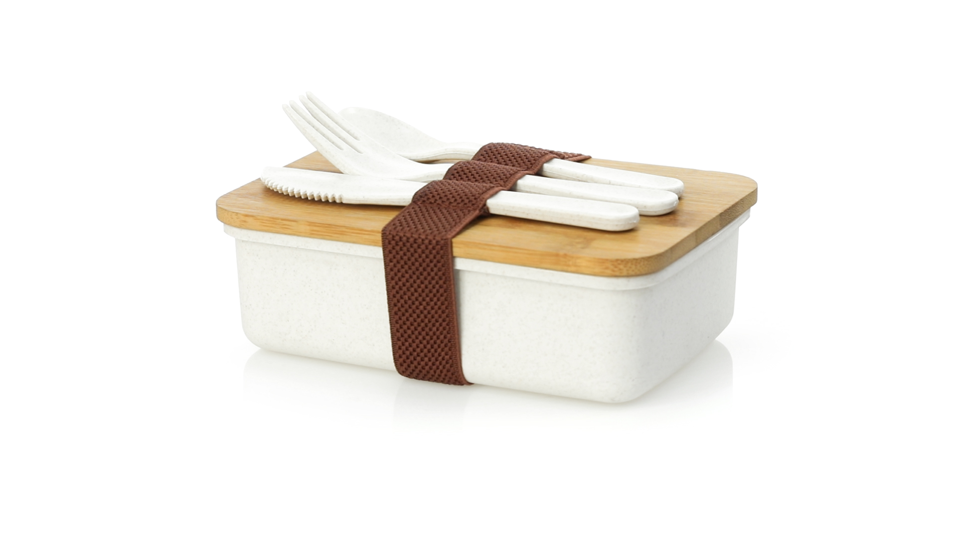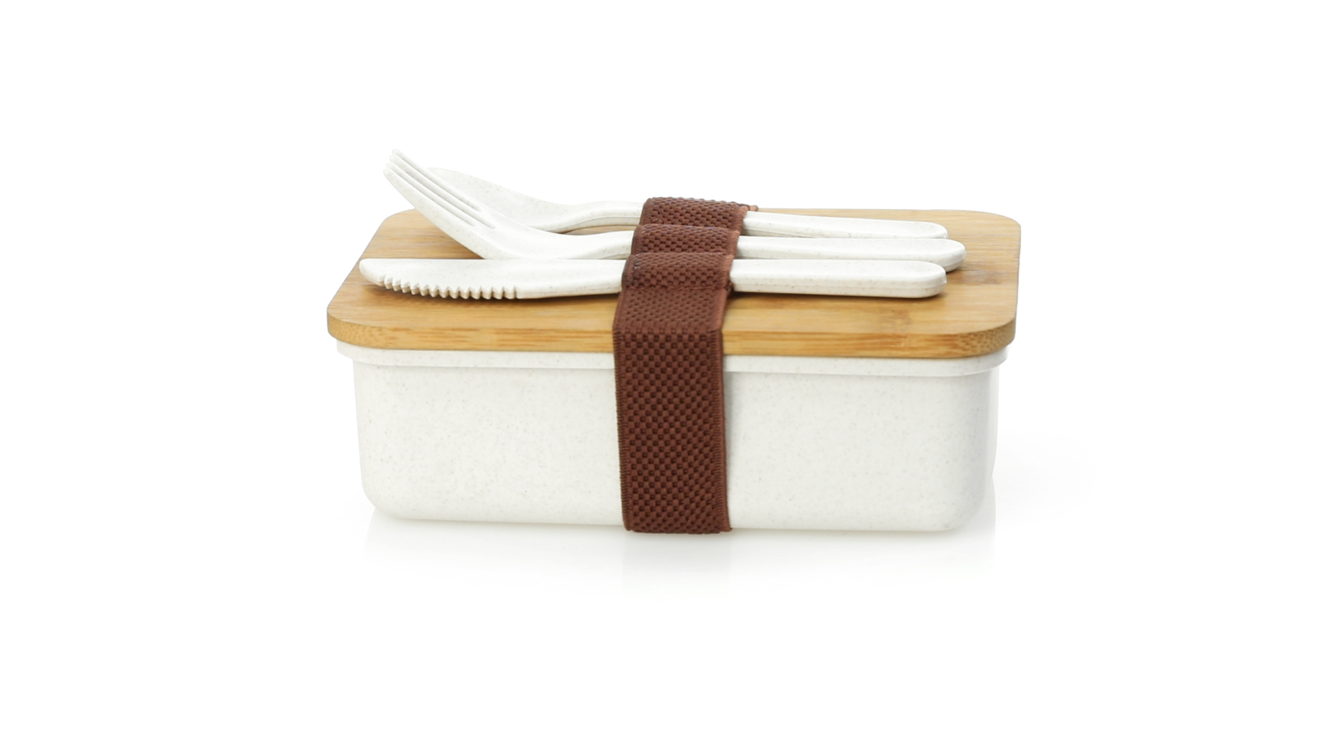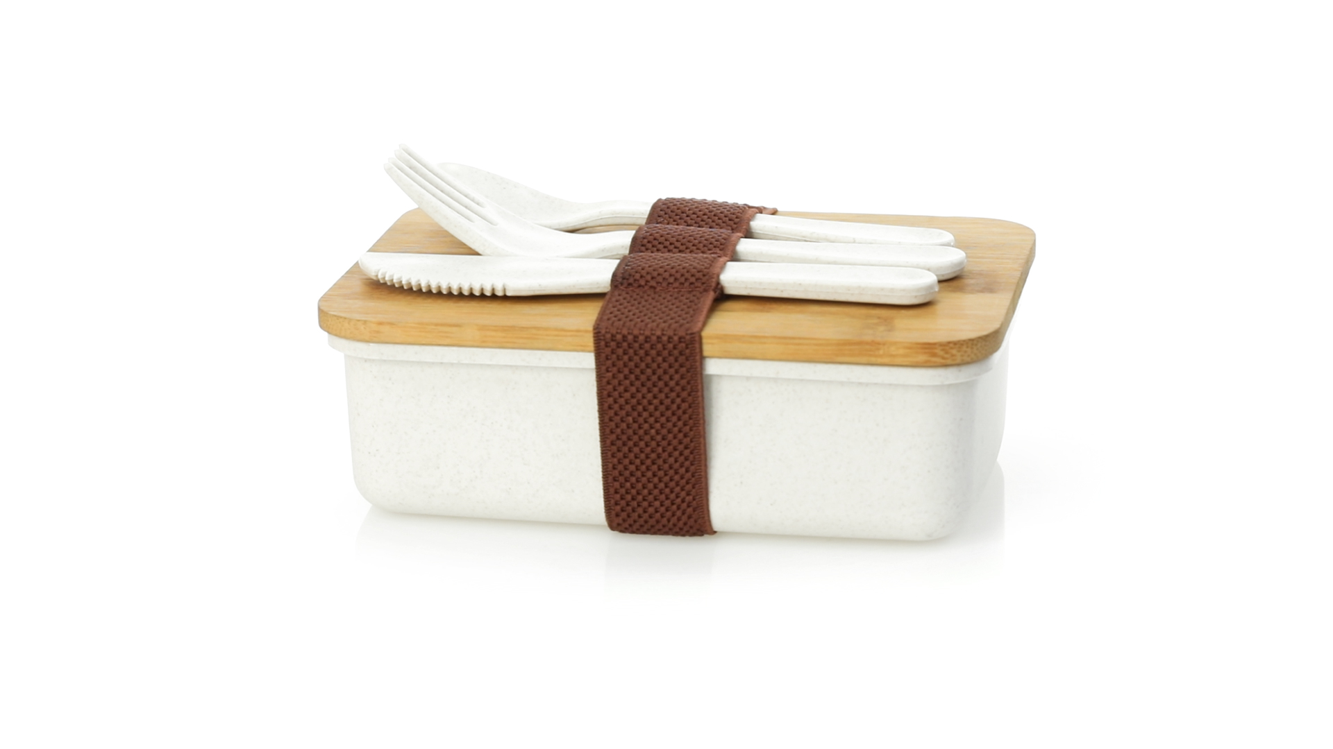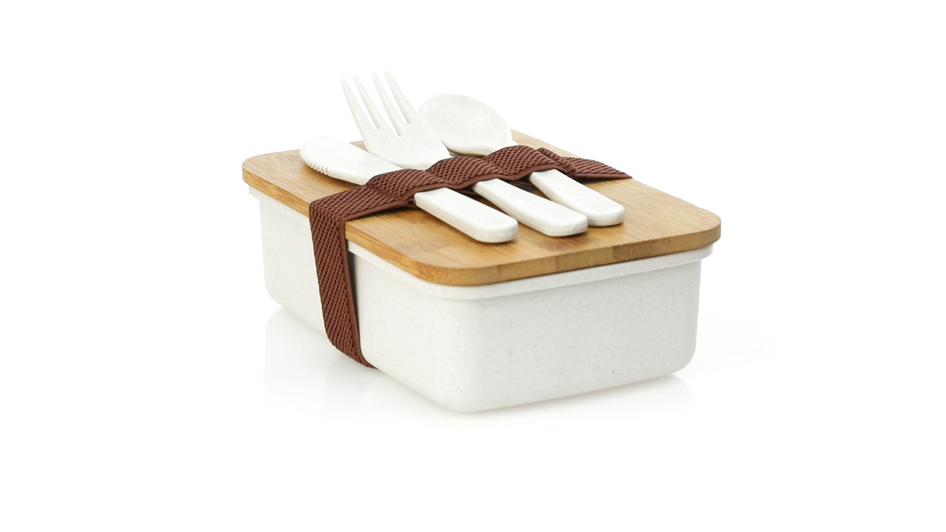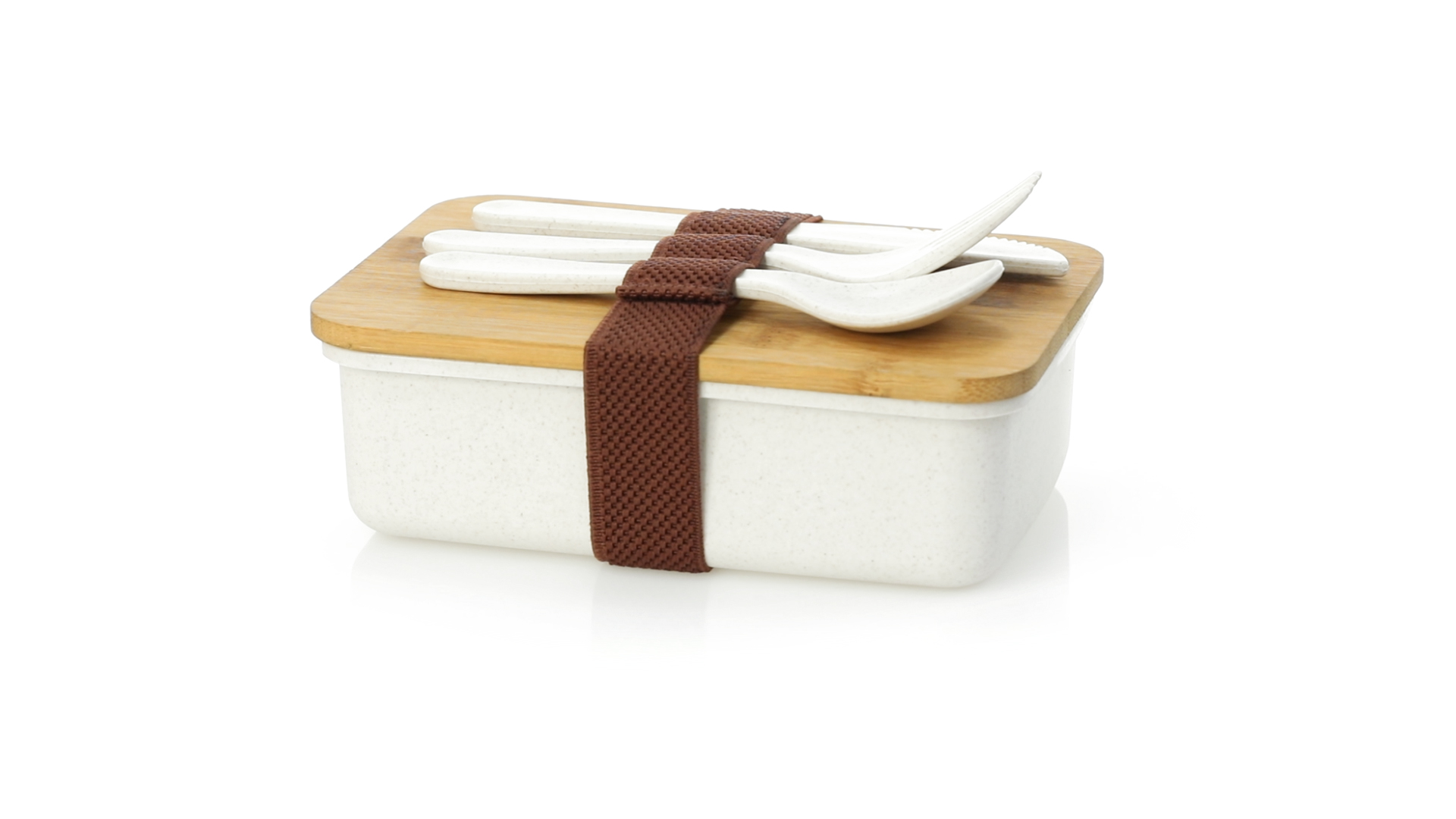 Lunchbox mit 700 ml Fassungsvermögen aus der Naturlinie. Aus Bambusfaser, mit Deckel aus poliertem Bambus. Sicherheitsriemen mit Gabel, Löffel und Messer. BPA-frei und tiefkühltauglich.