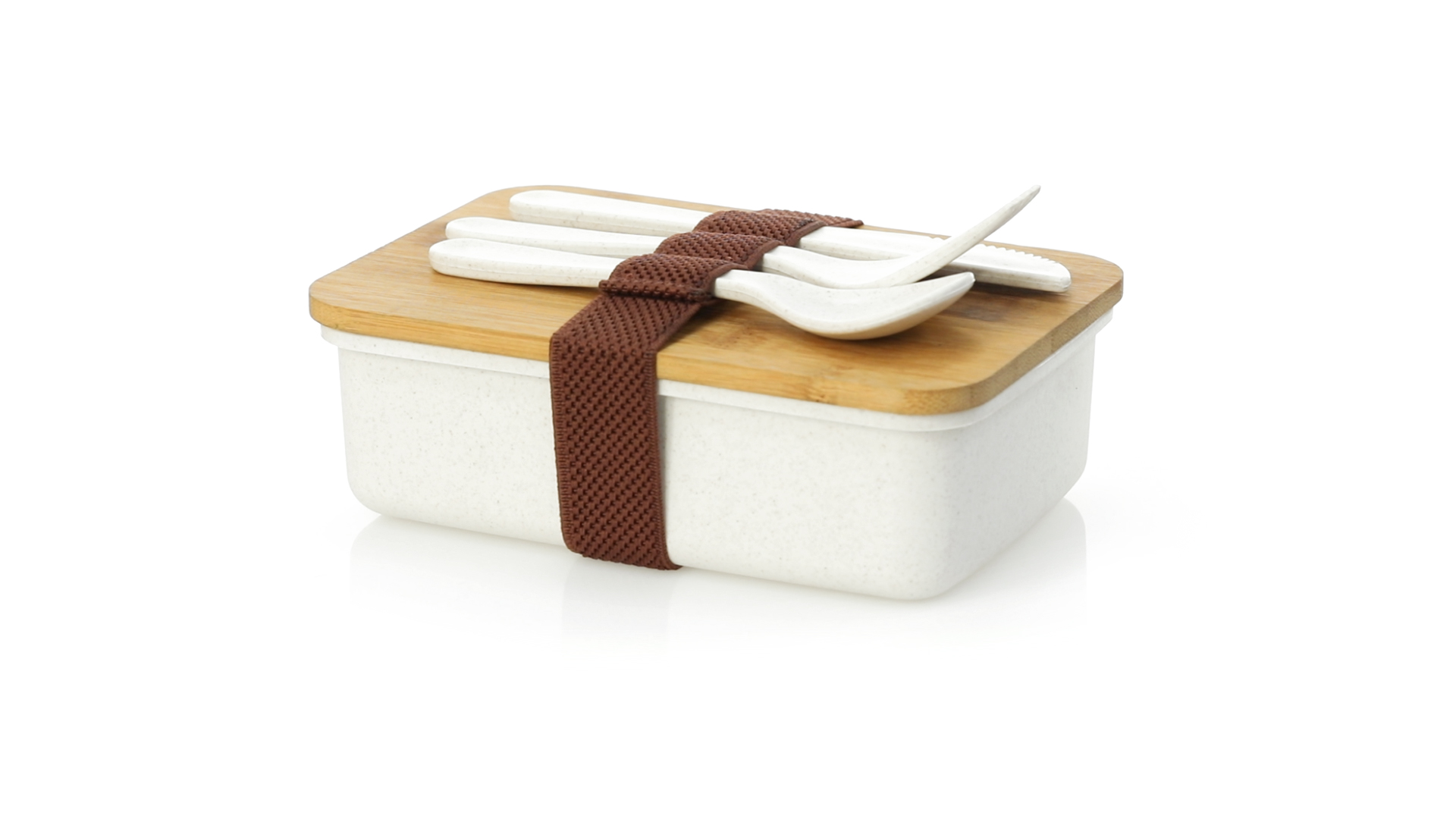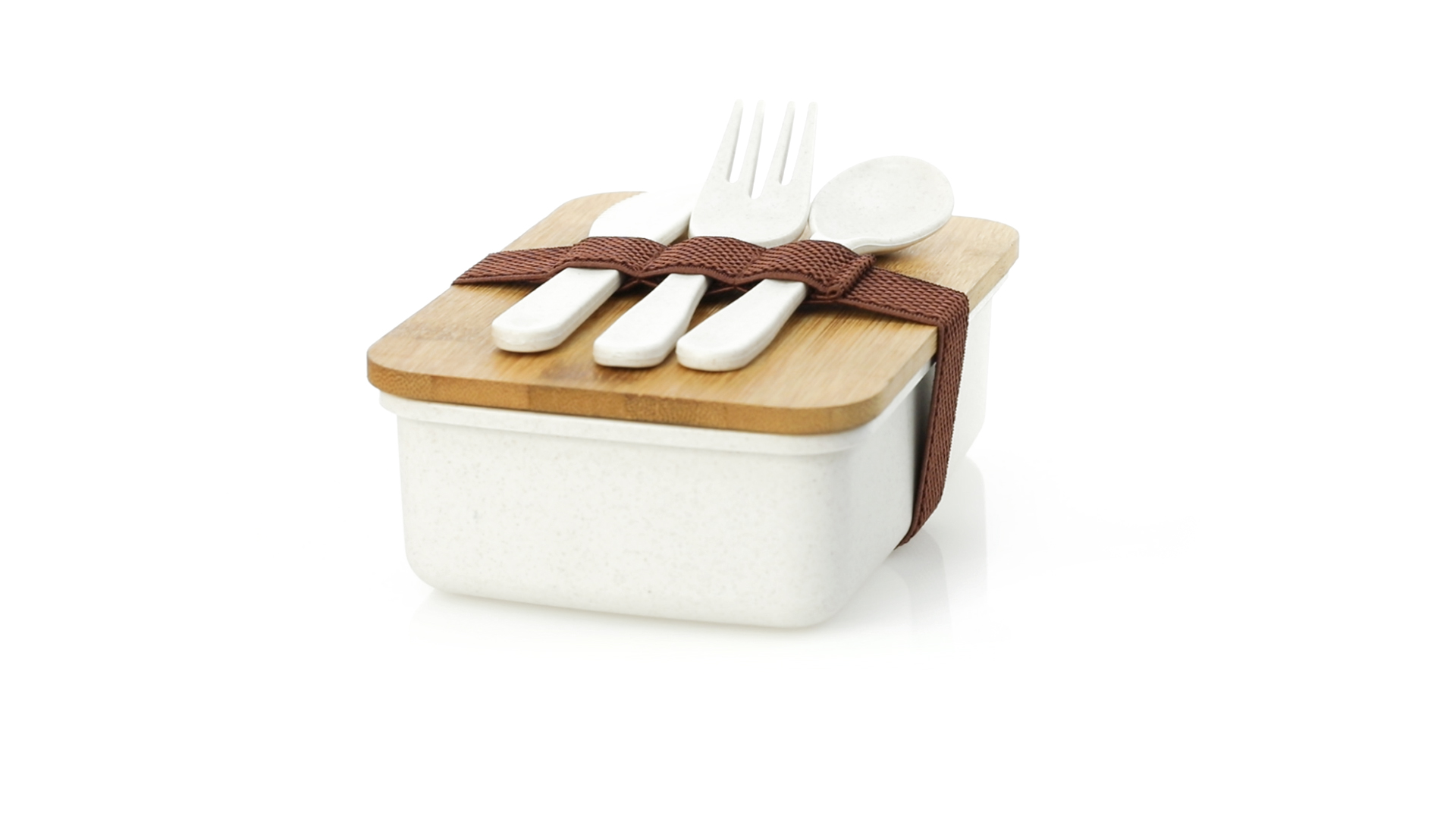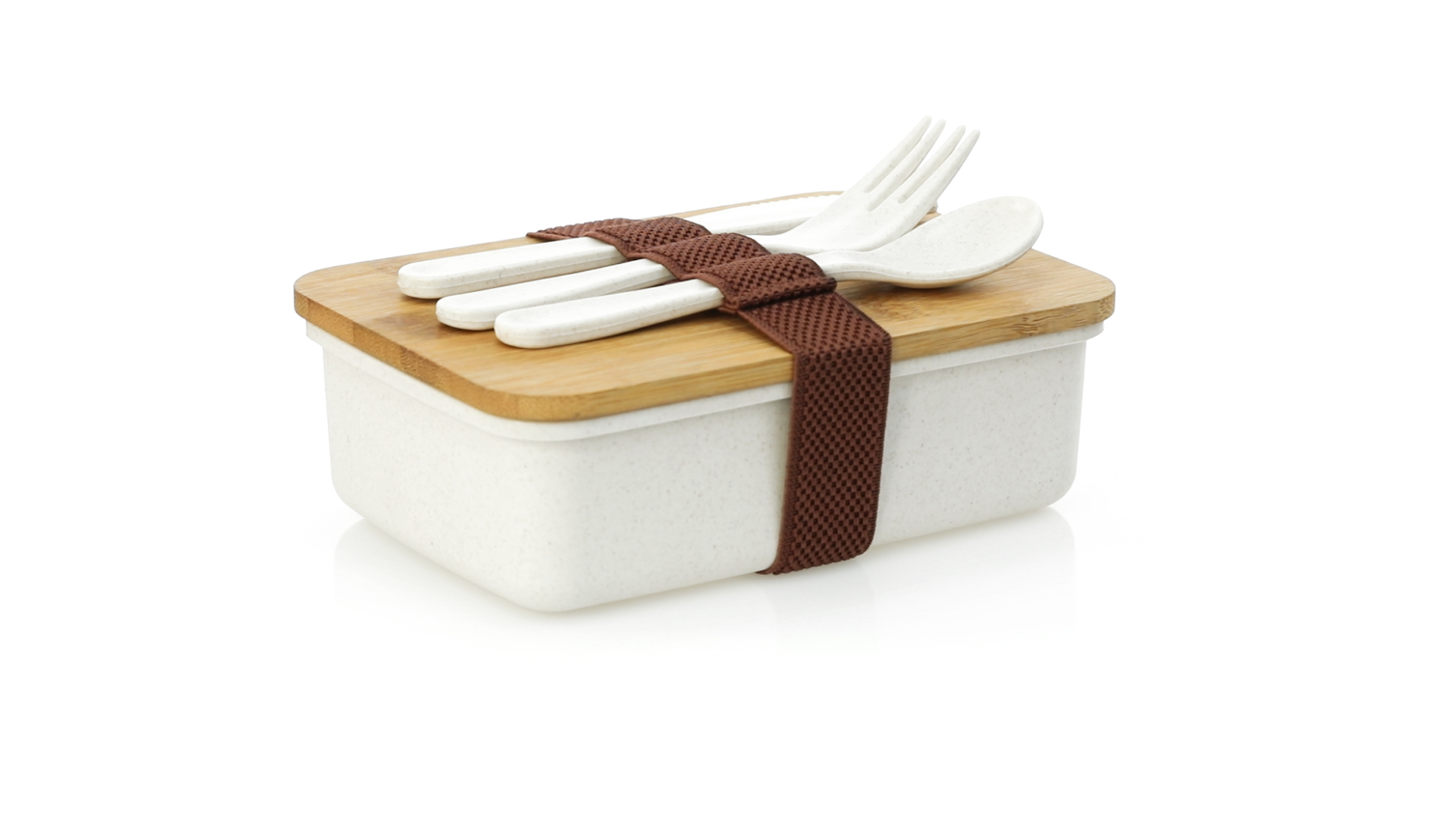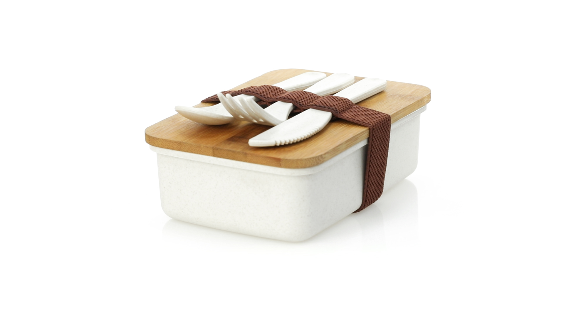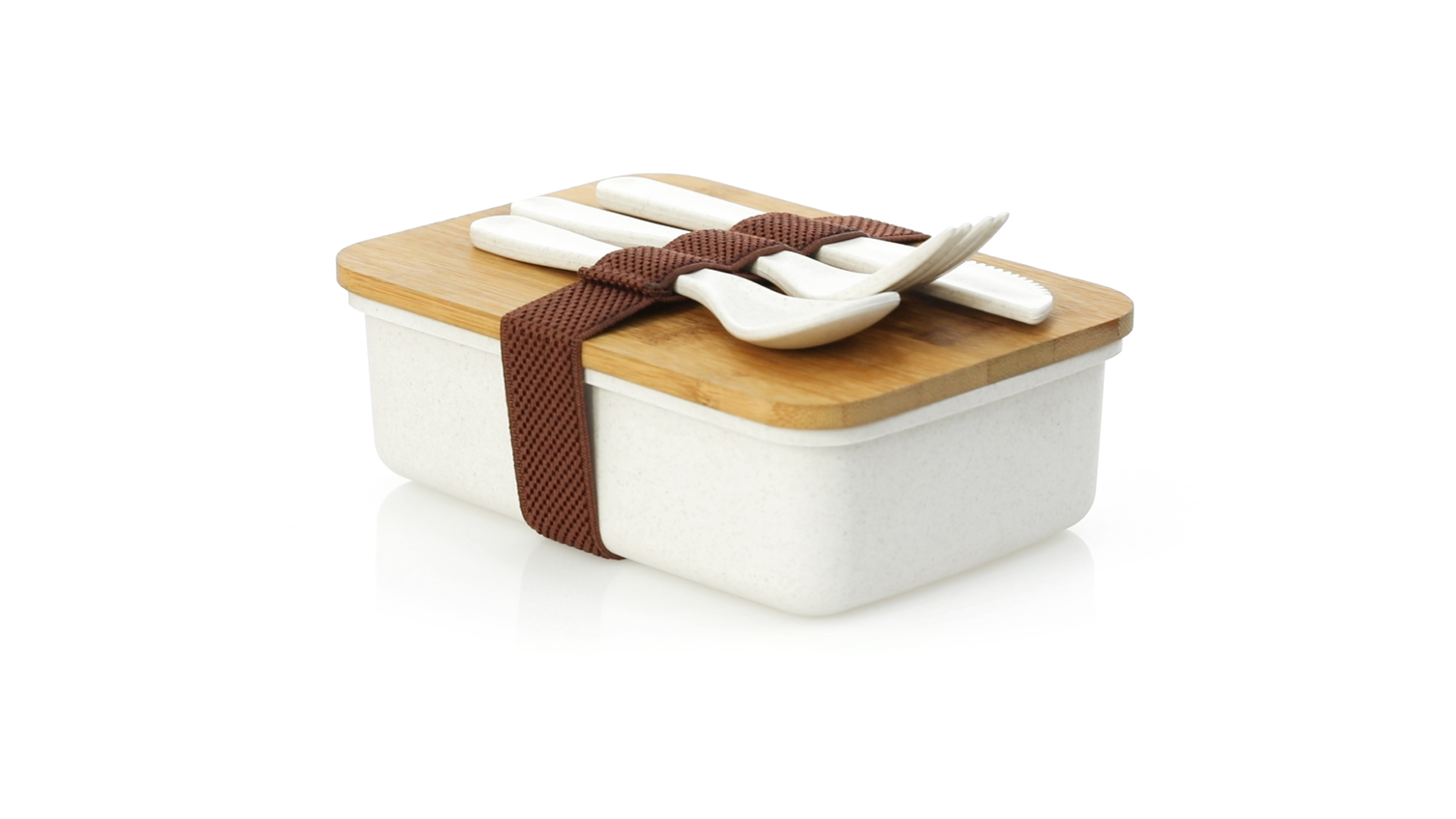 Lunchbox mit 700 ml Fassungsvermögen aus der Naturlinie. Aus Bambusfaser, mit Deckel aus poliertem Bambus. Sicherheitsriemen mit Gabel, Löffel und Messer. BPA-frei und tiefkühltauglich.