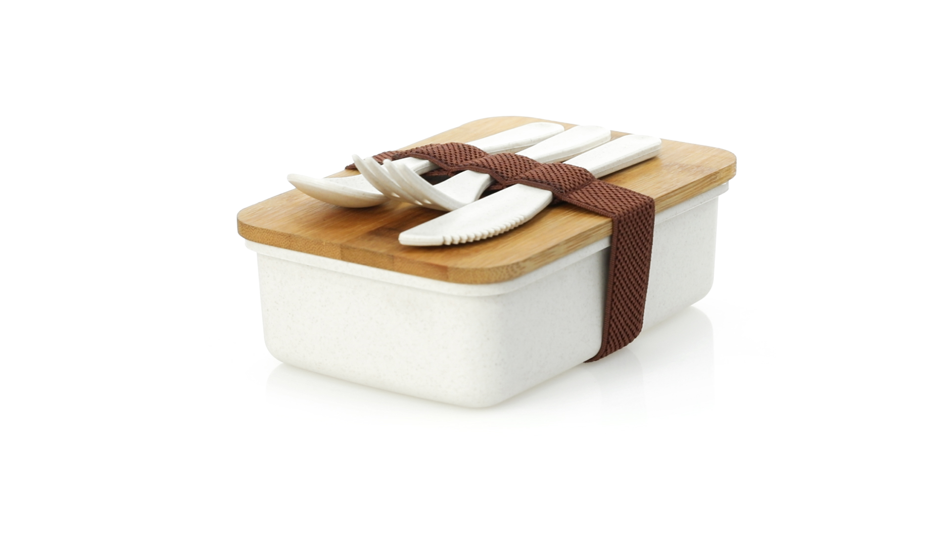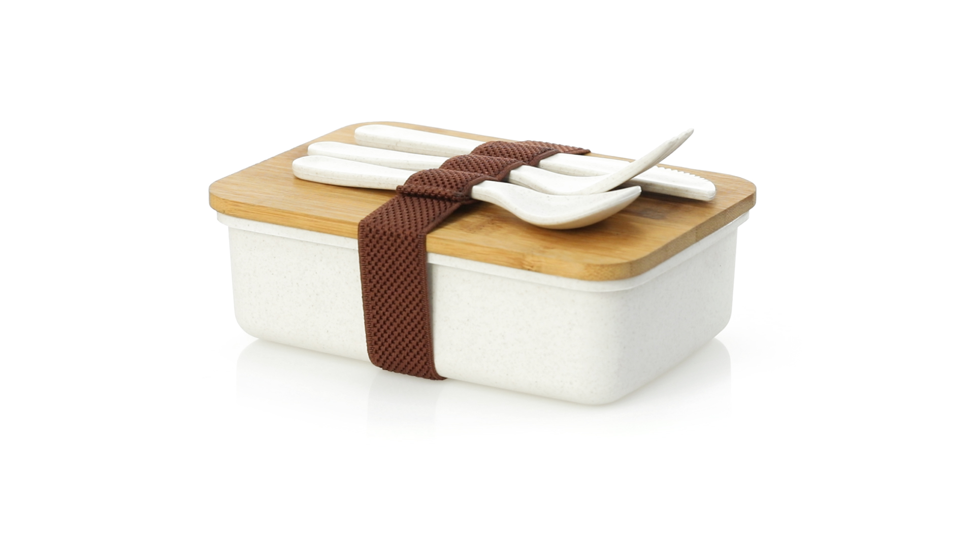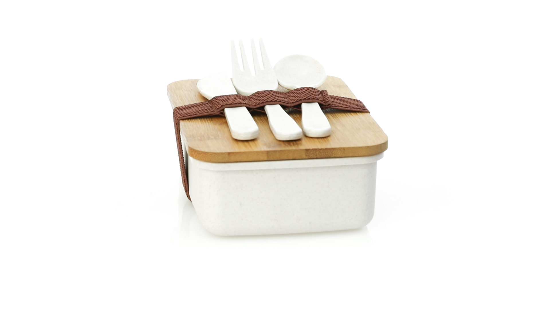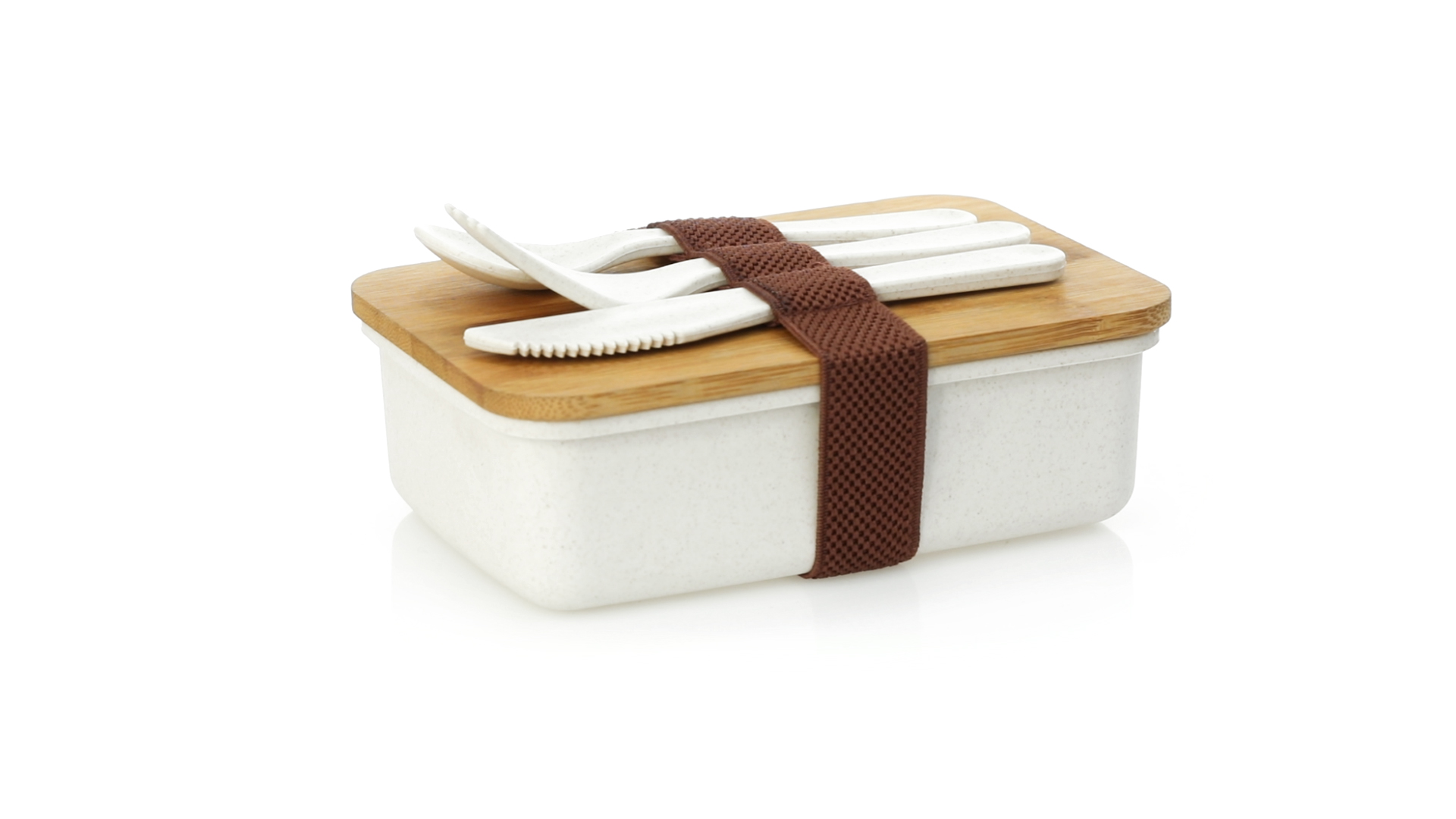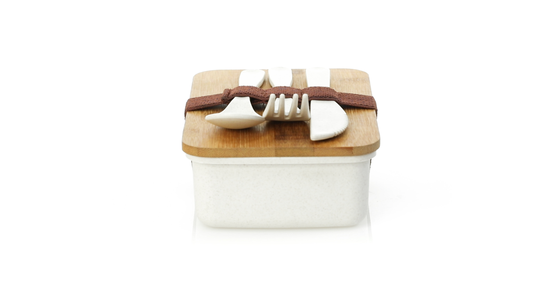 Lunchbox mit 700 ml Fassungsvermögen aus der Naturlinie. Aus Bambusfaser, mit Deckel aus poliertem Bambus. Sicherheitsriemen mit Gabel, Löffel und Messer. BPA-frei und tiefkühltauglich.