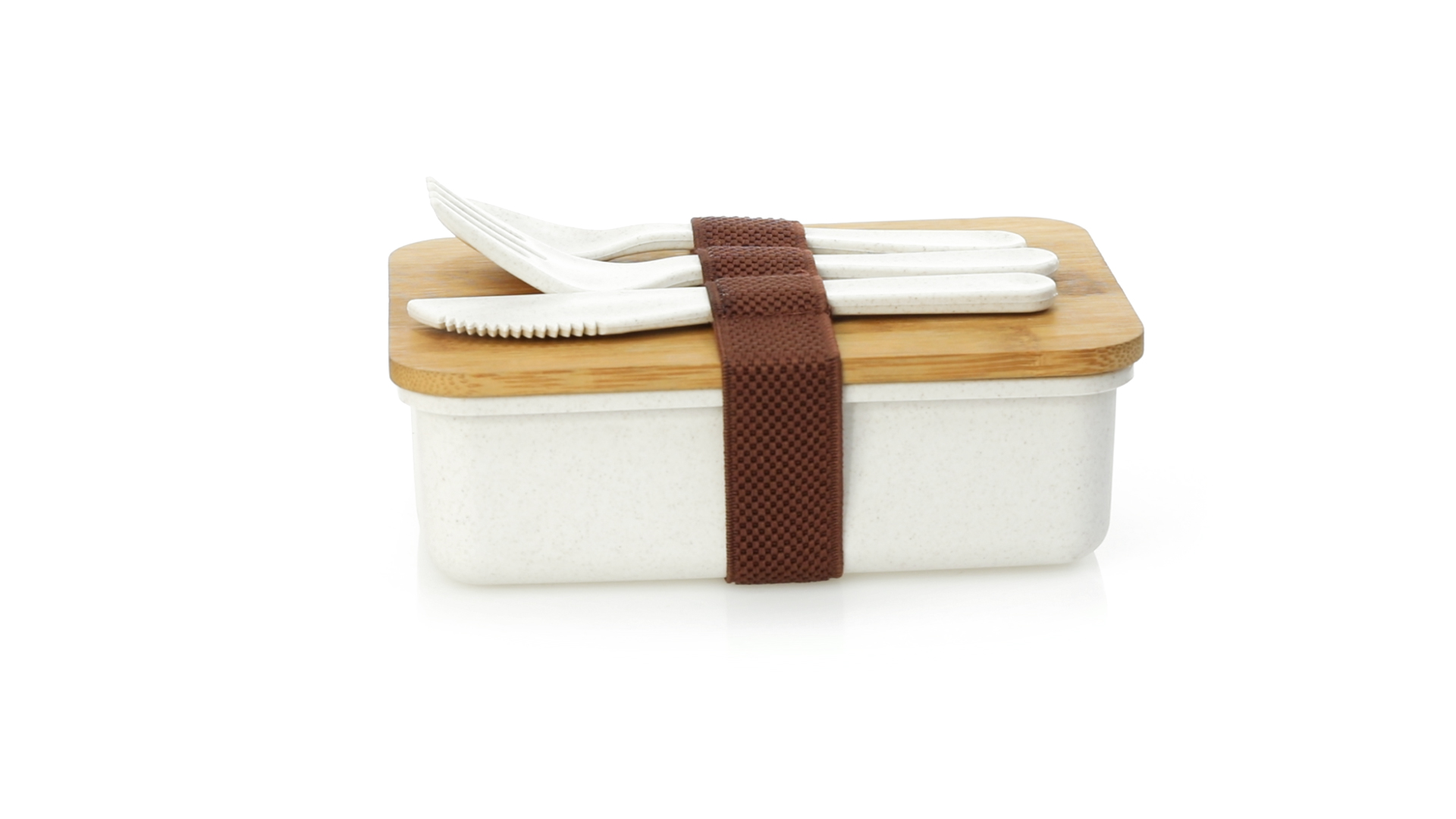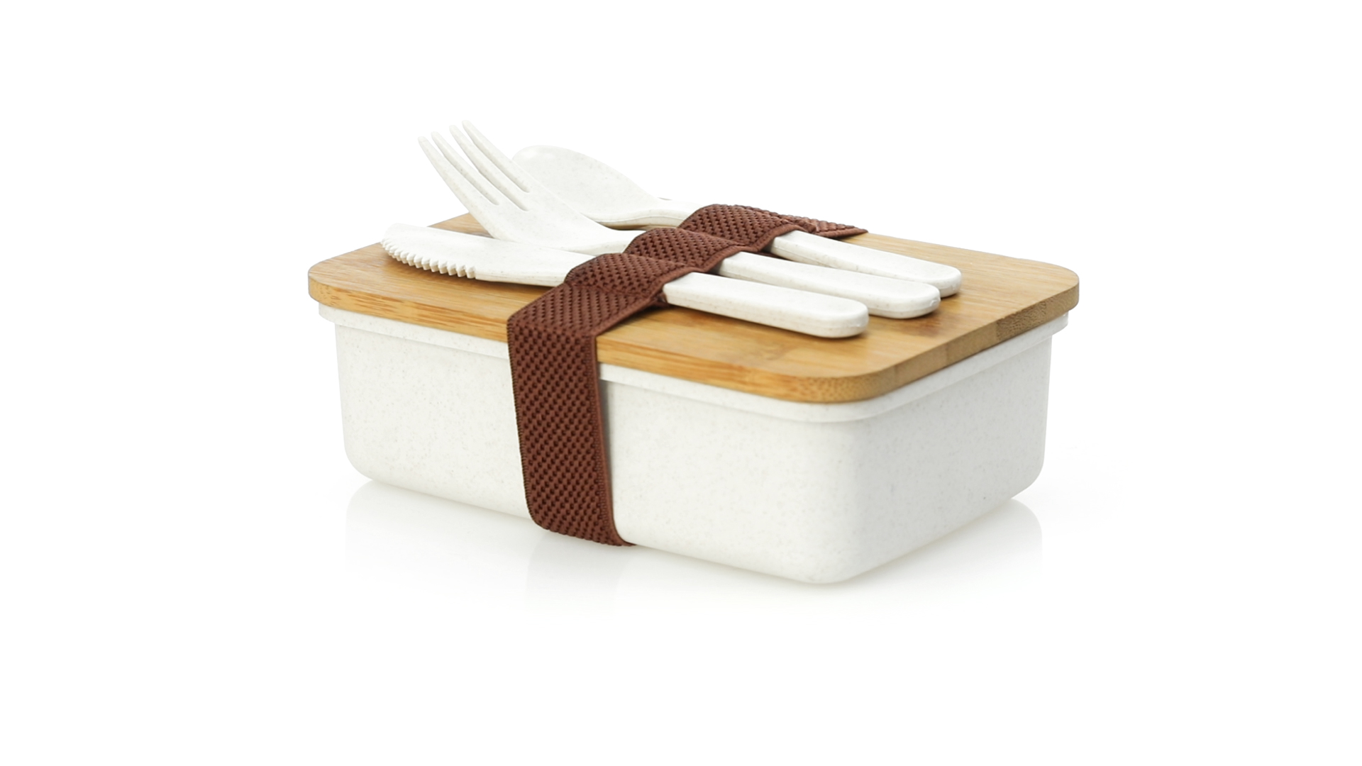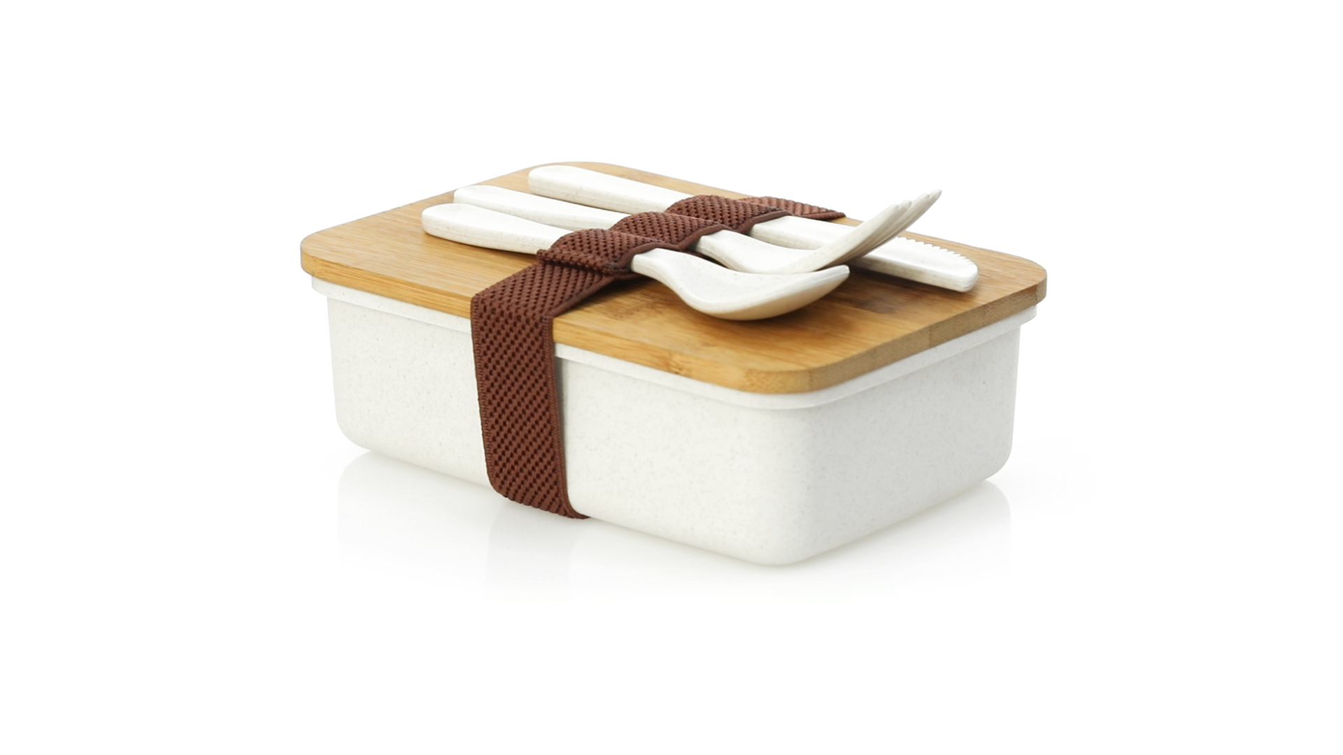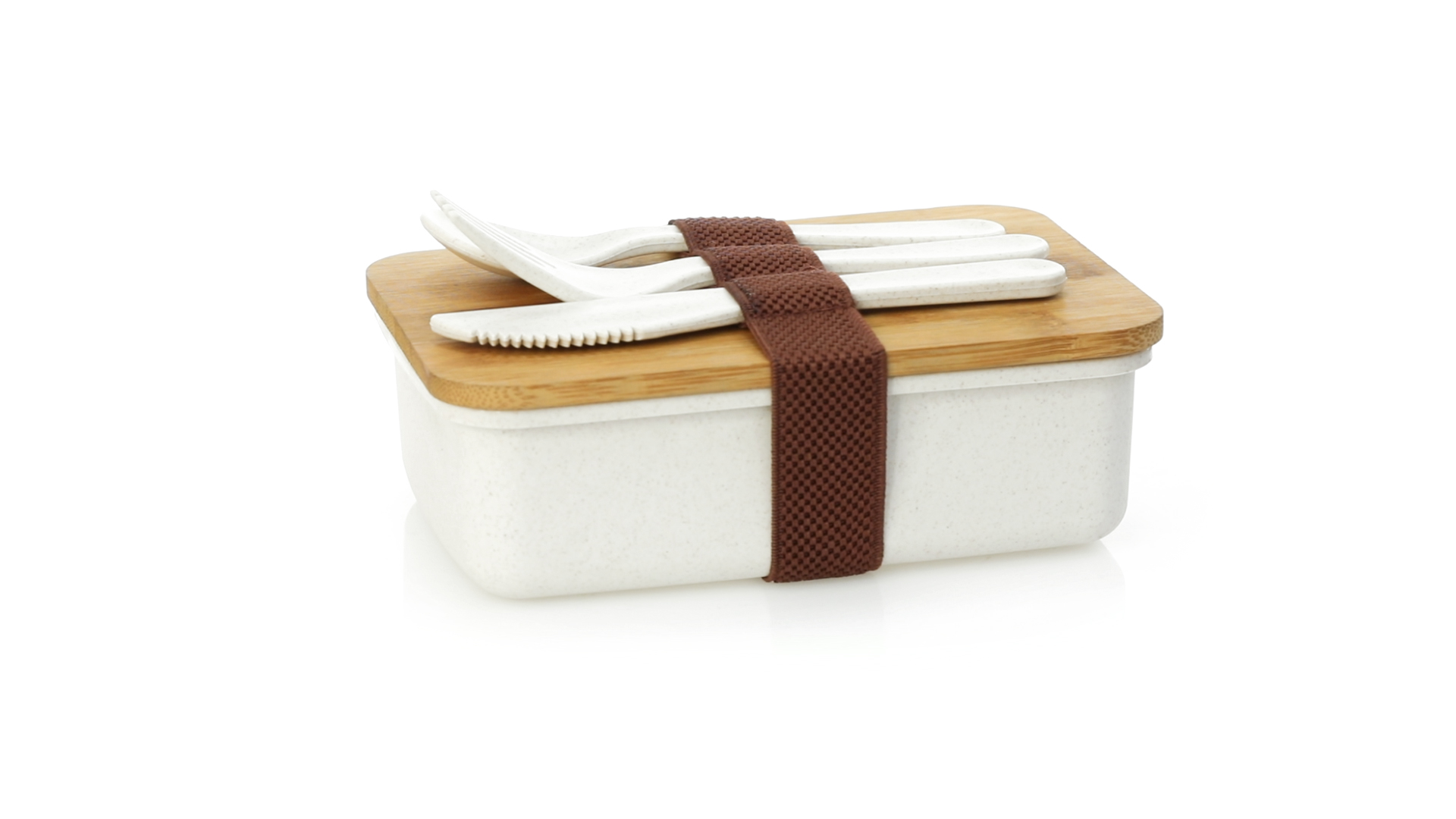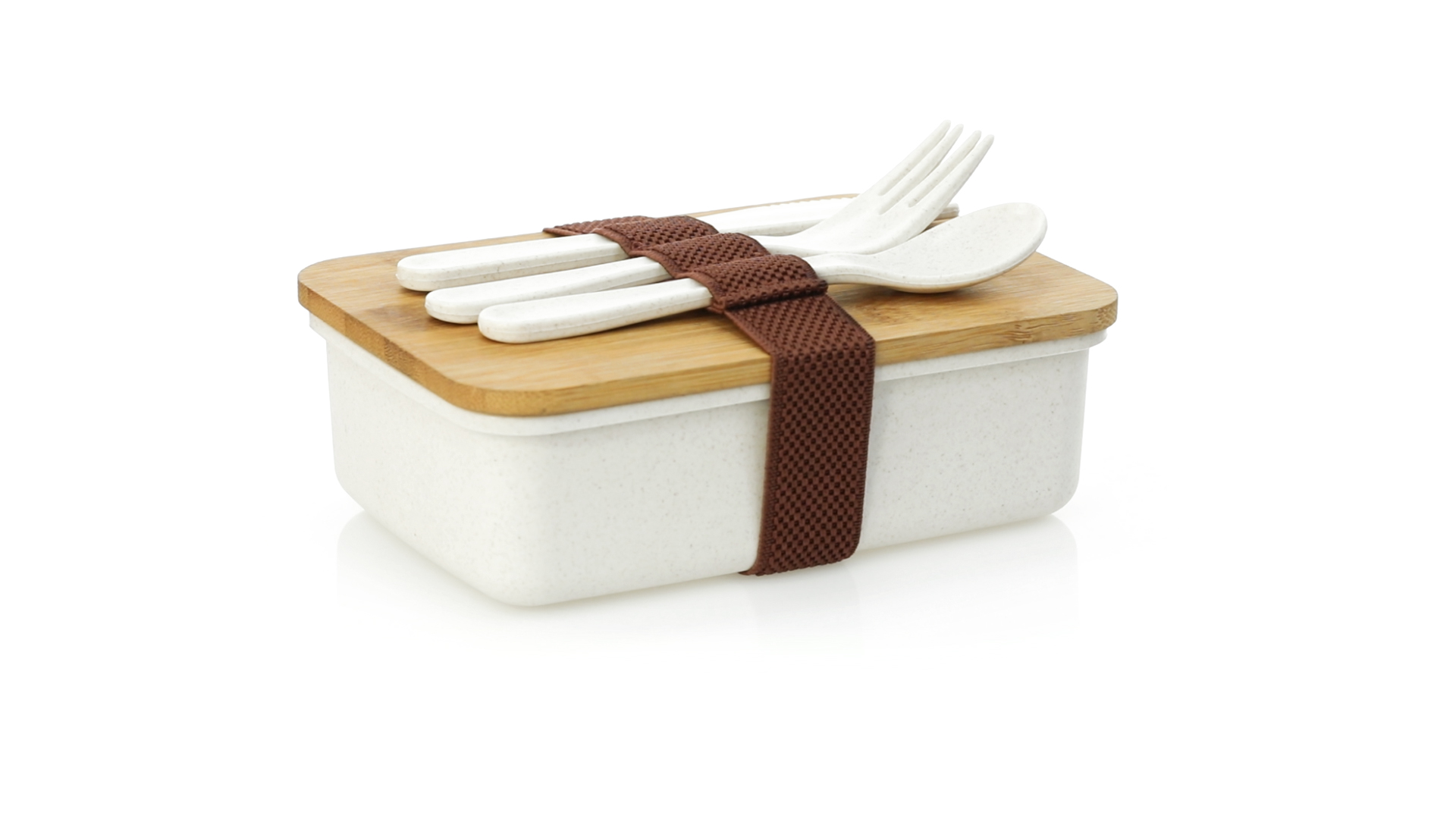 Lunchbox mit 700 ml Fassungsvermögen aus der Naturlinie. Aus Bambusfaser, mit Deckel aus poliertem Bambus. Sicherheitsriemen mit Gabel, Löffel und Messer. BPA-frei und tiefkühltauglich.