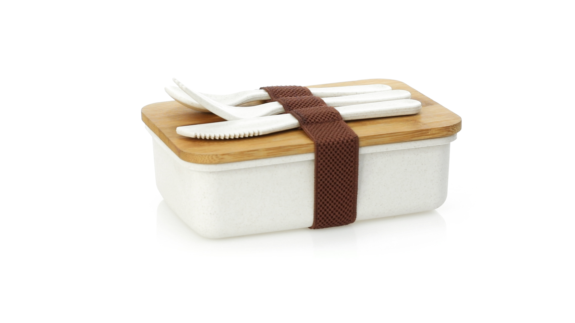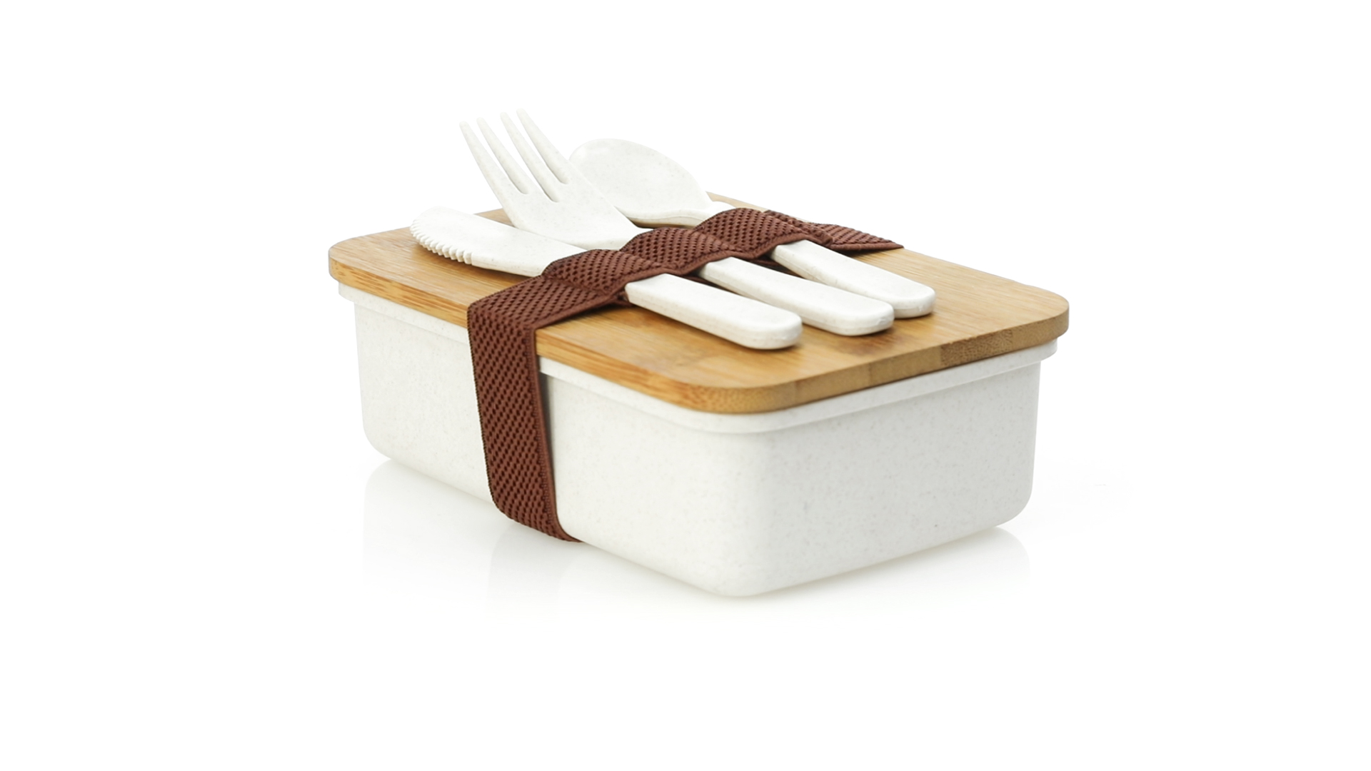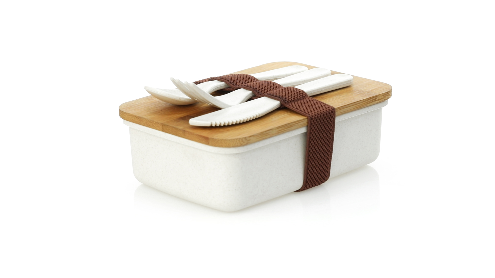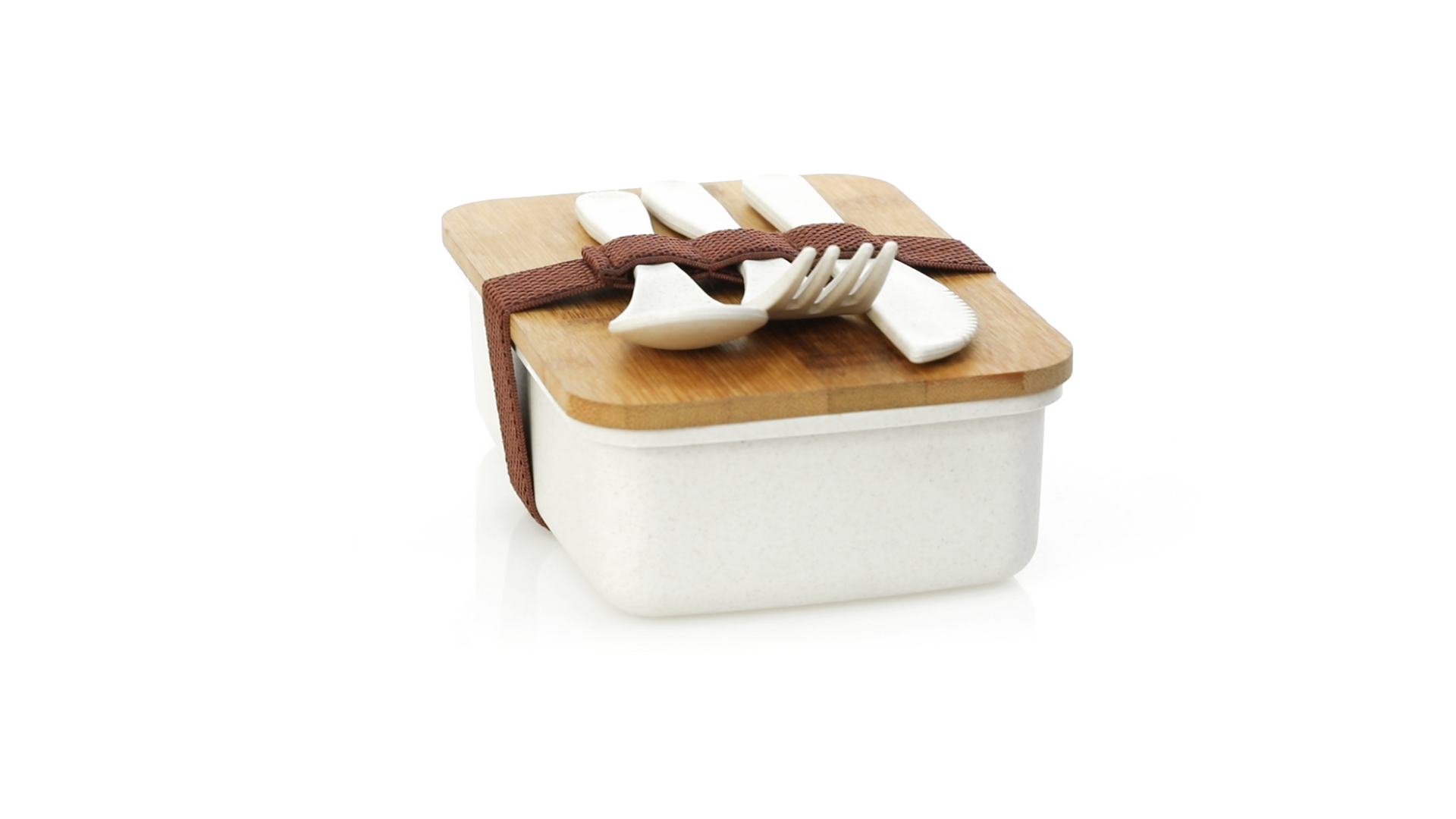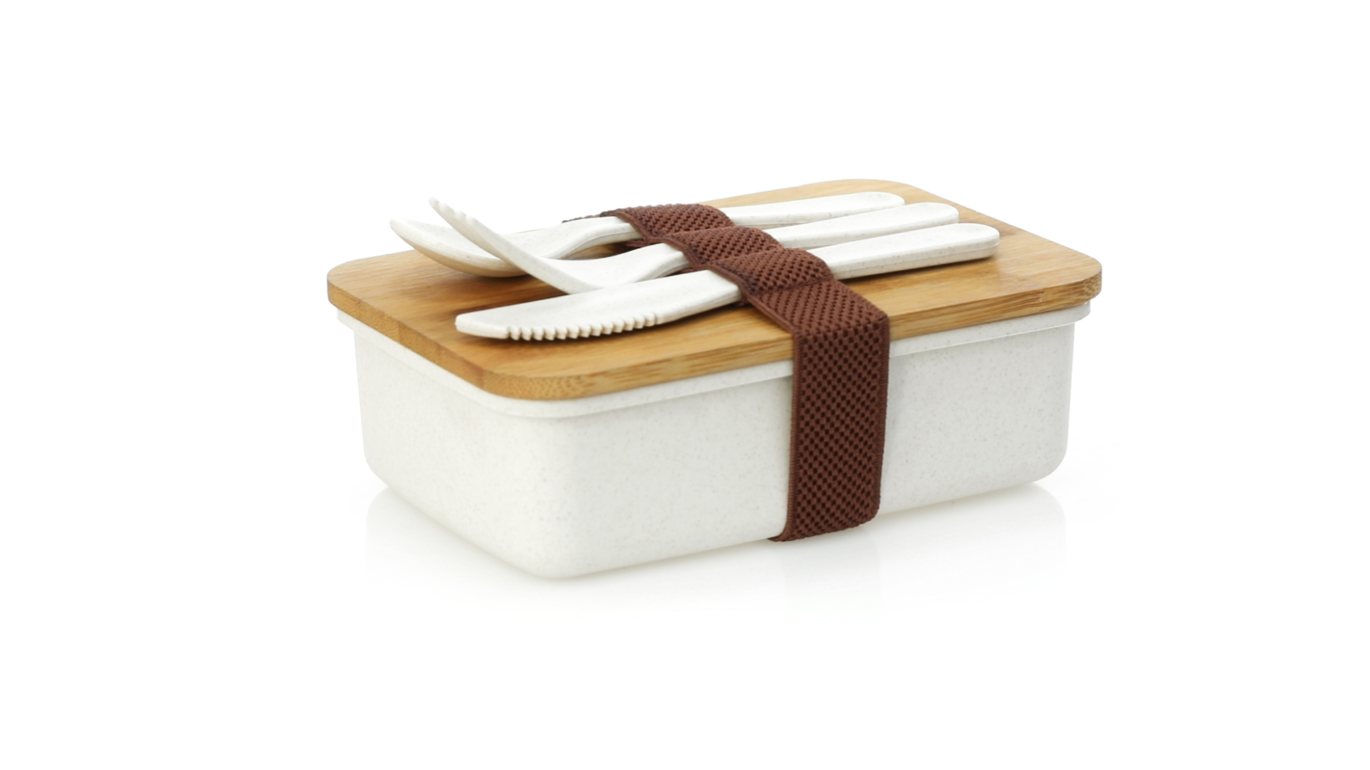 Lunchbox mit 700 ml Fassungsvermögen aus der Naturlinie. Aus Bambusfaser, mit Deckel aus poliertem Bambus. Sicherheitsriemen mit Gabel, Löffel und Messer. BPA-frei und tiefkühltauglich.