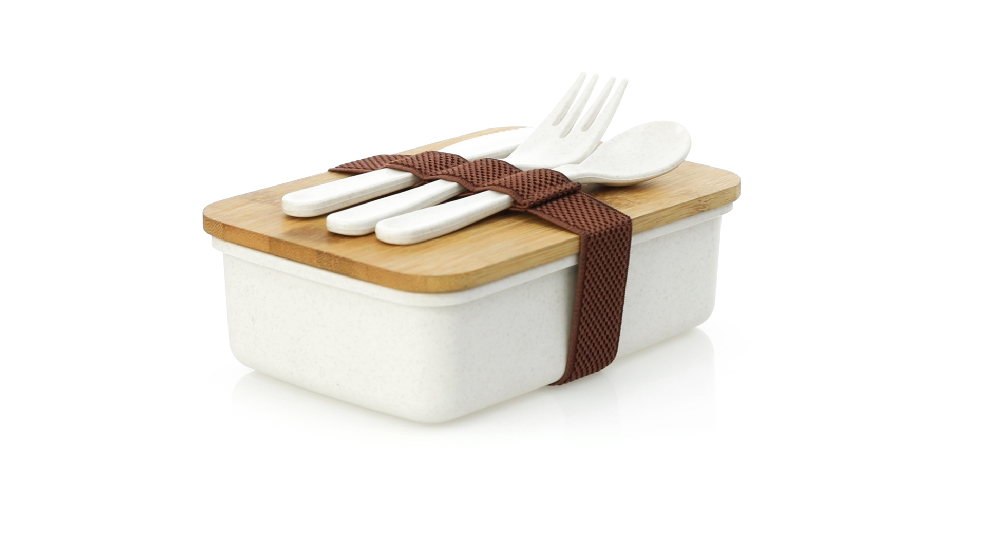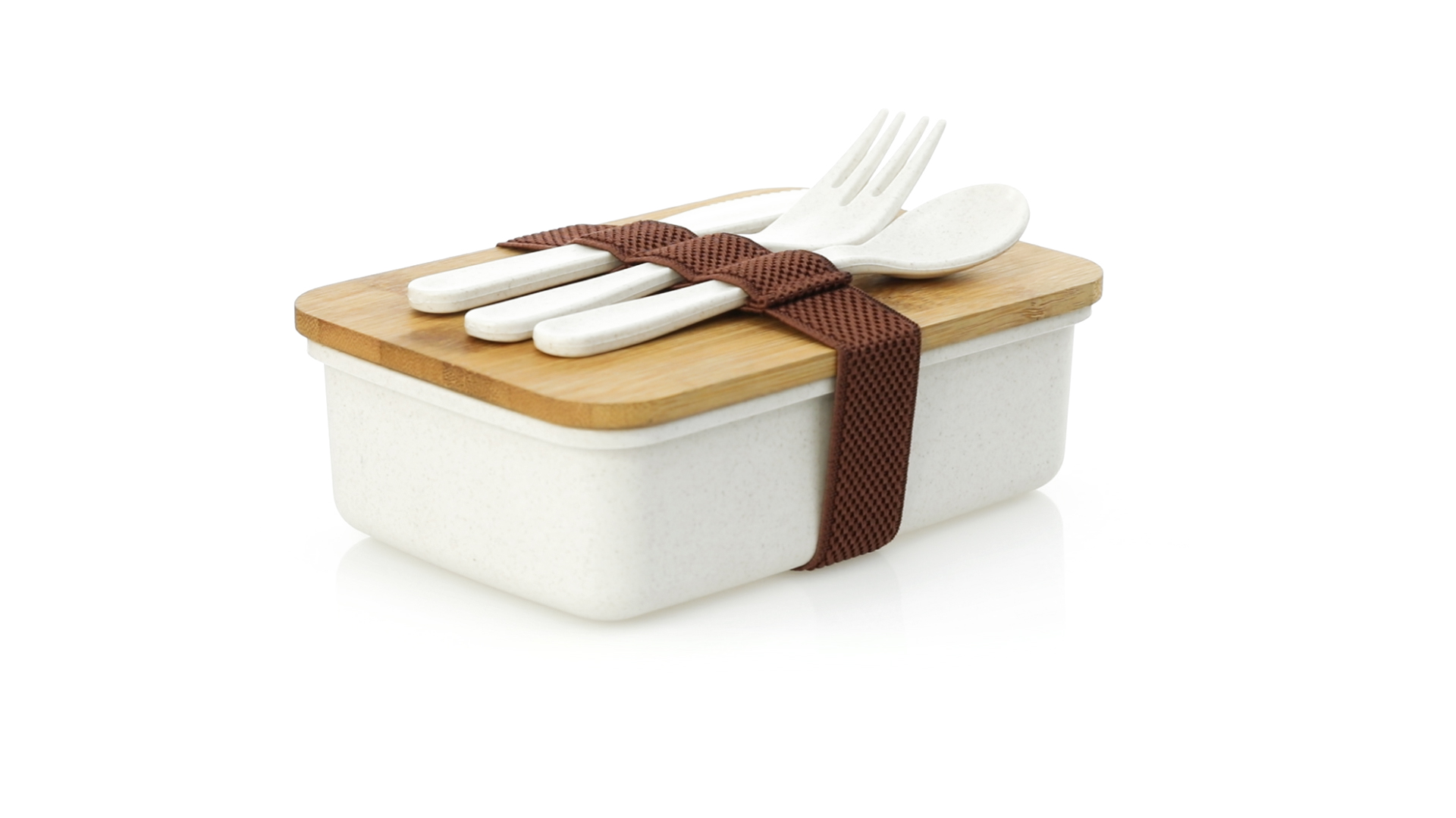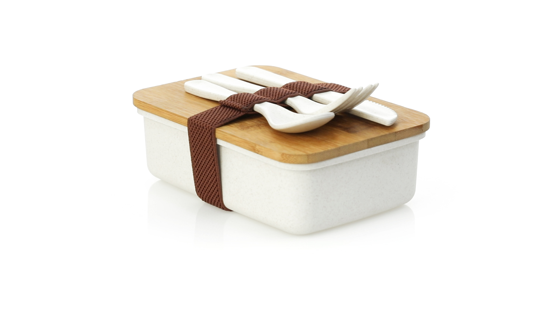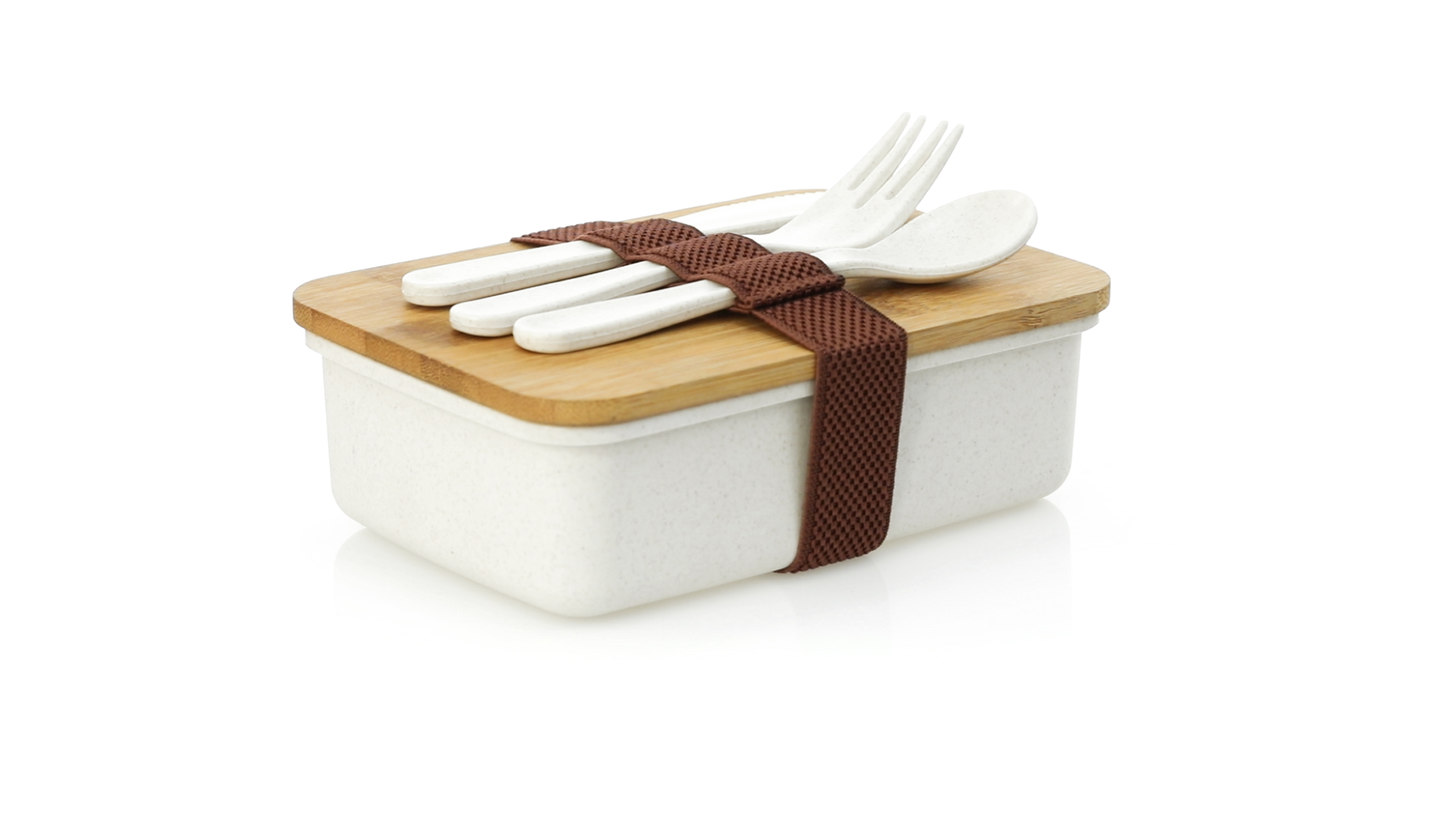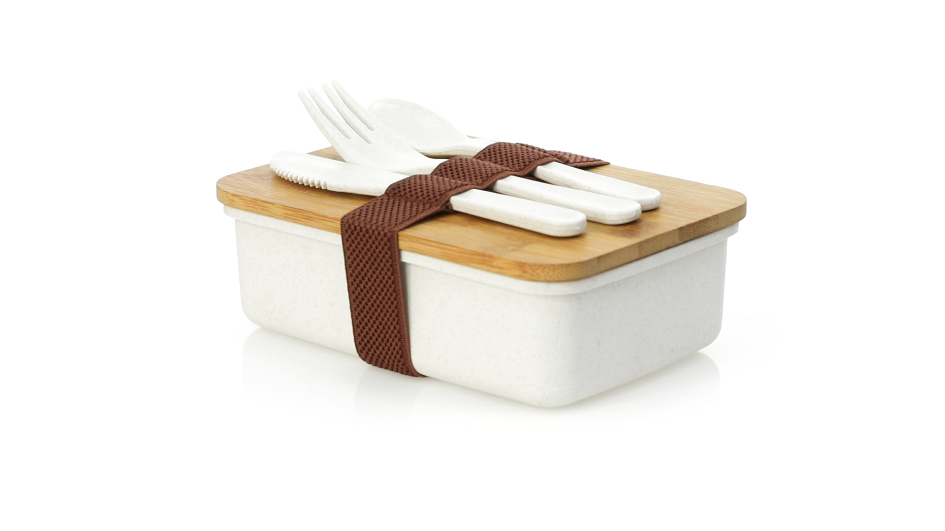 Lunchbox mit 700 ml Fassungsvermögen aus der Naturlinie. Aus Bambusfaser, mit Deckel aus poliertem Bambus. Sicherheitsriemen mit Gabel, Löffel und Messer. BPA-frei und tiefkühltauglich.