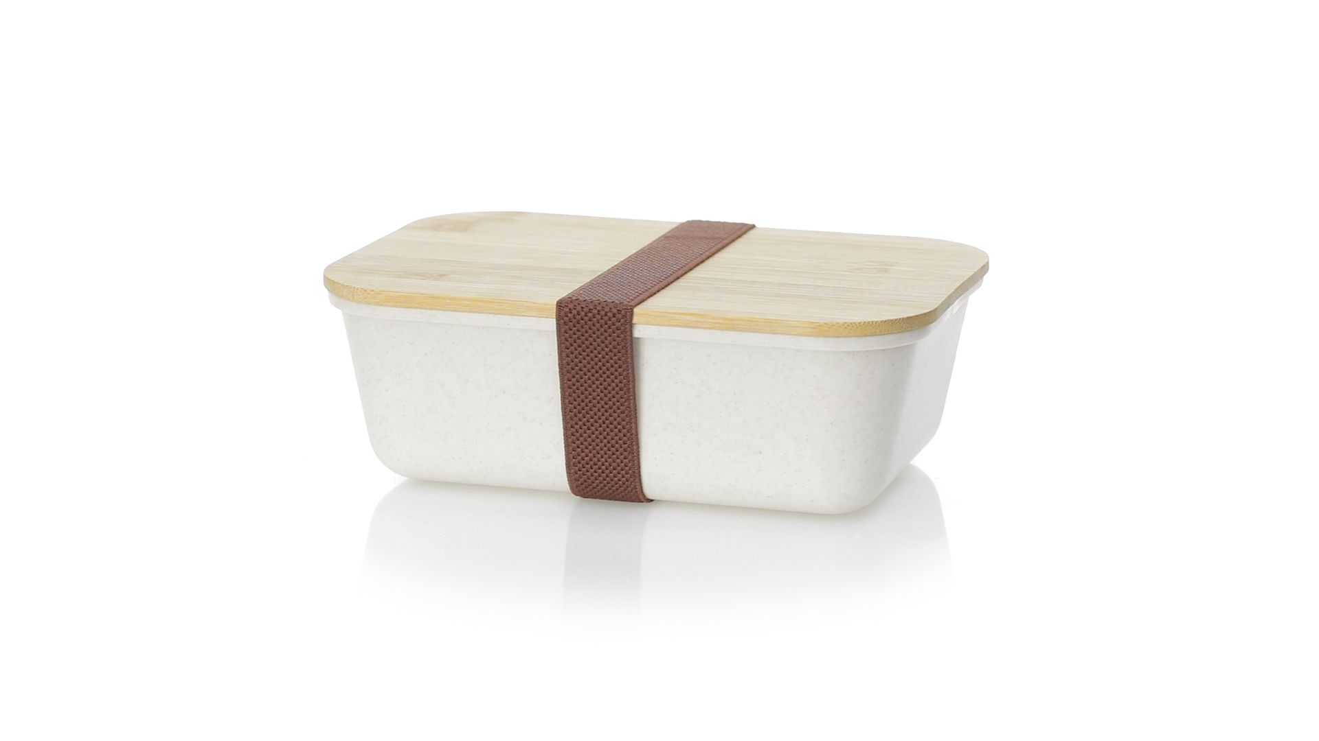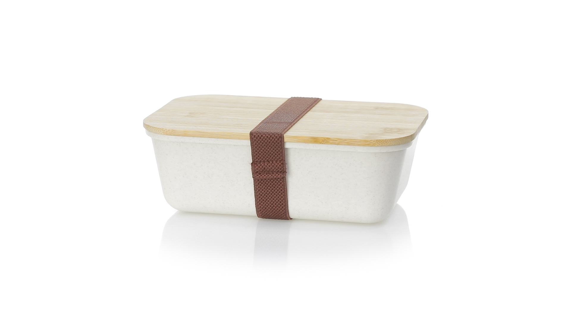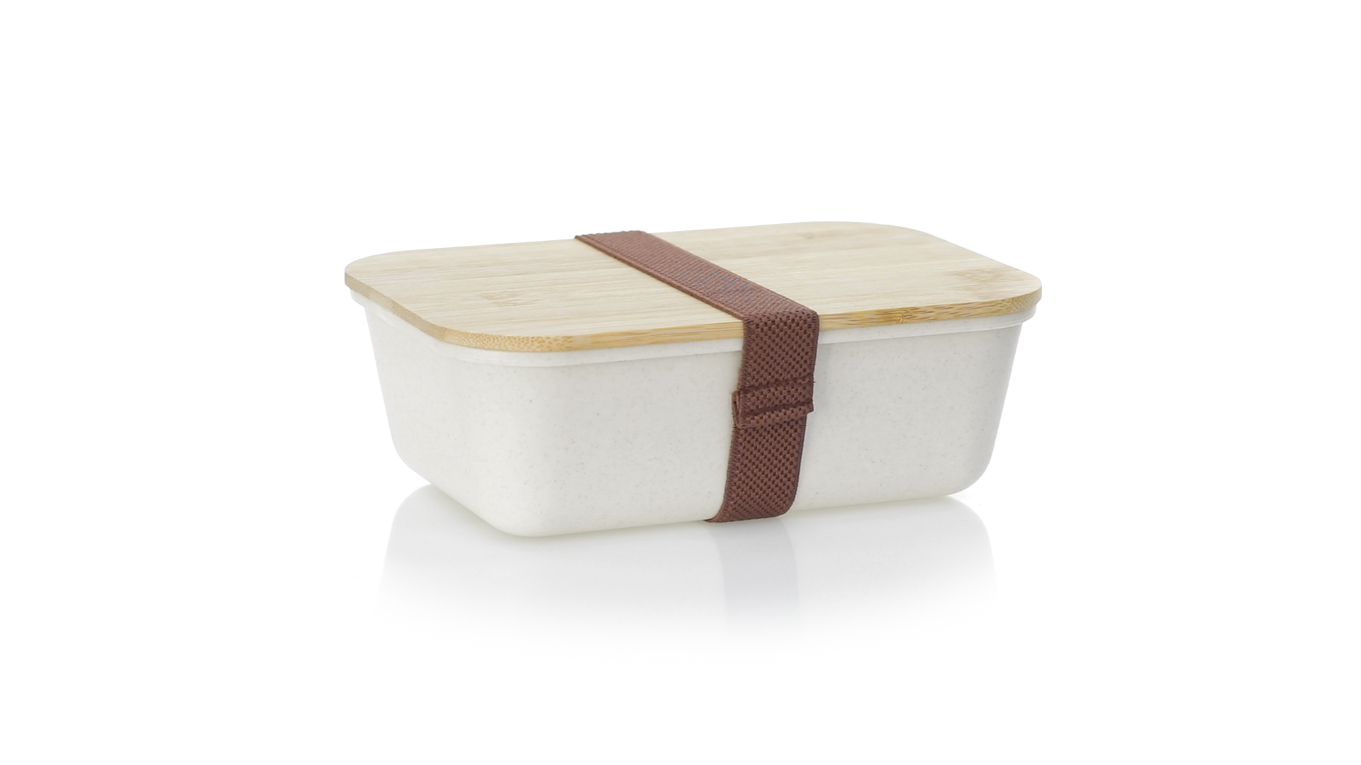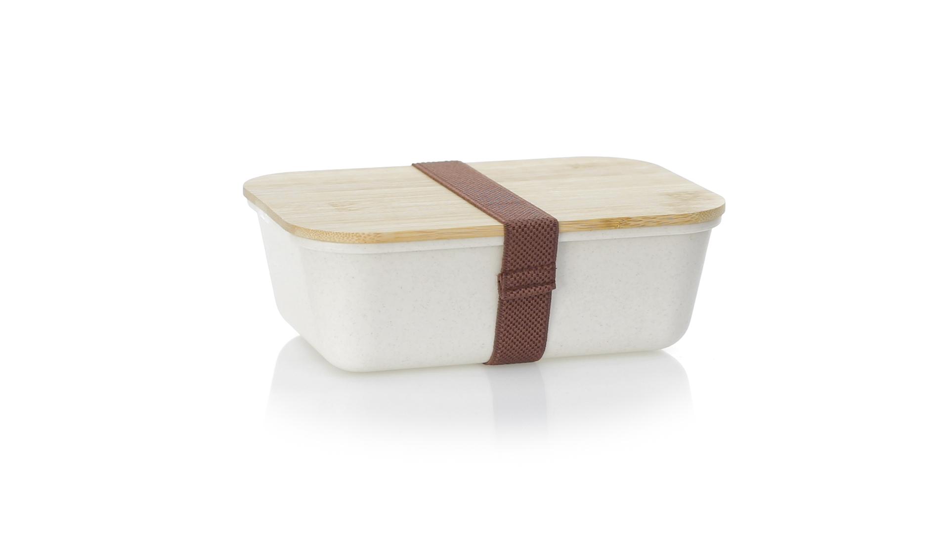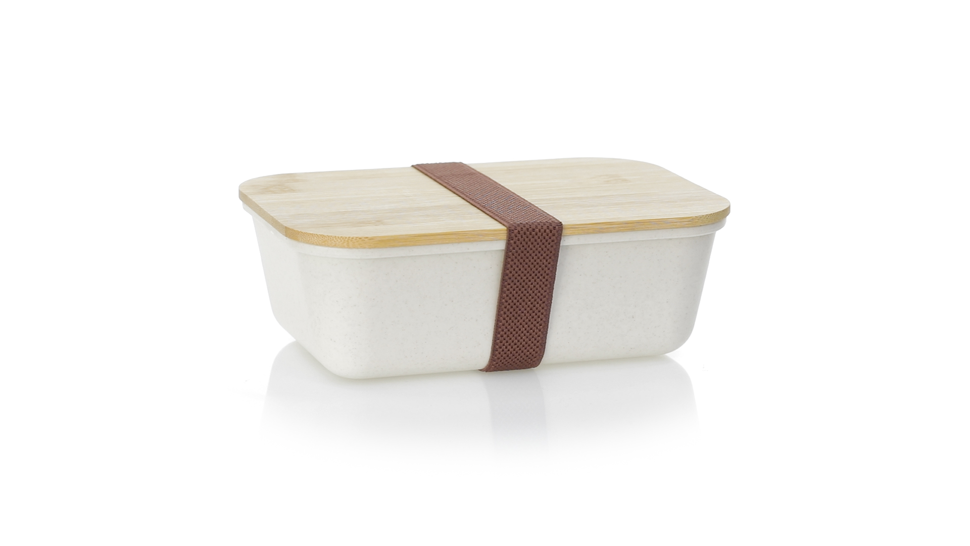 1l Brotdose aus widerstandsfähigem BPA-freiem PP-Kornmaterial, mit Bambusdeckel. Elastisches Sicherheitsband auf dem Deckel und Food Grade-Zertifizierung, die die Sicherheit beim Kontakt von Lebensmitteln mit dem zur Herstellung des Produkts verwendeten Material garantieren.