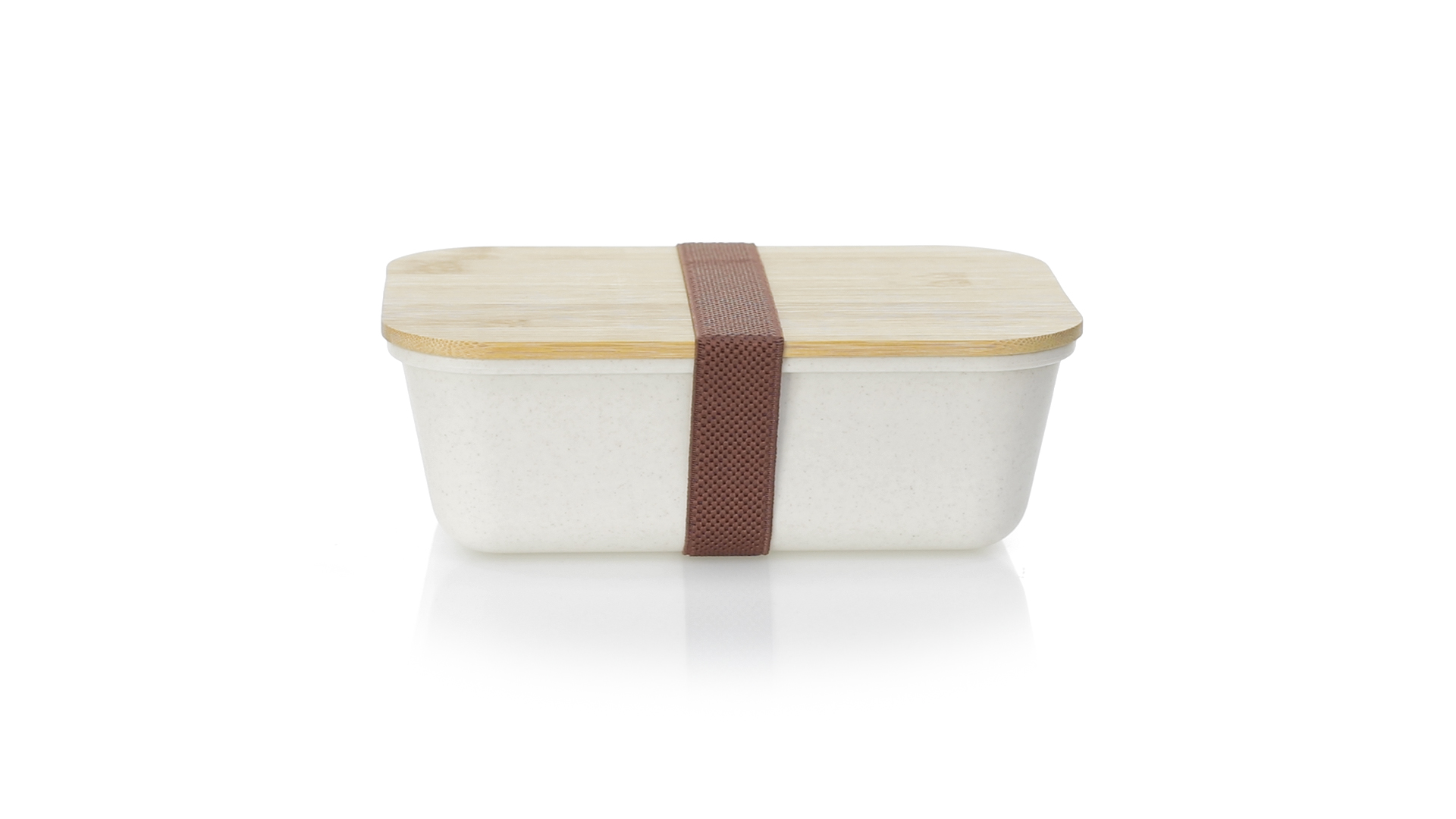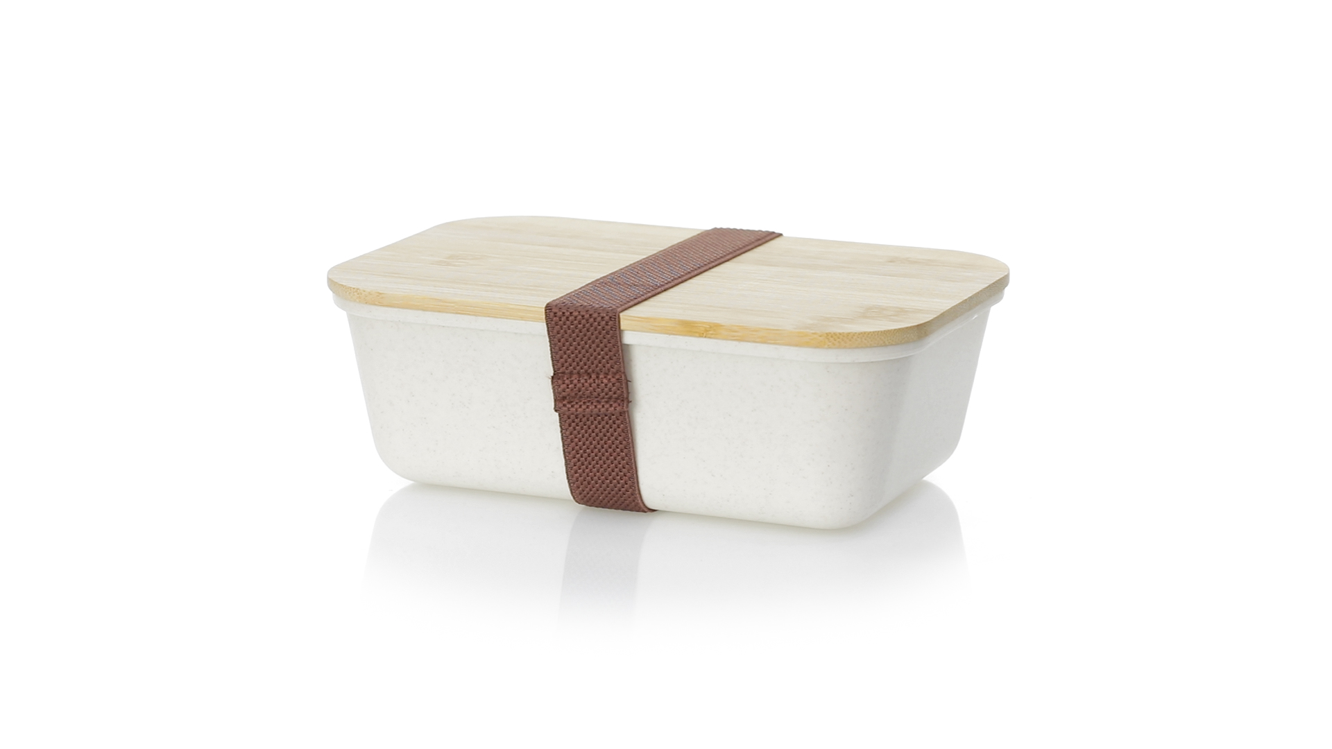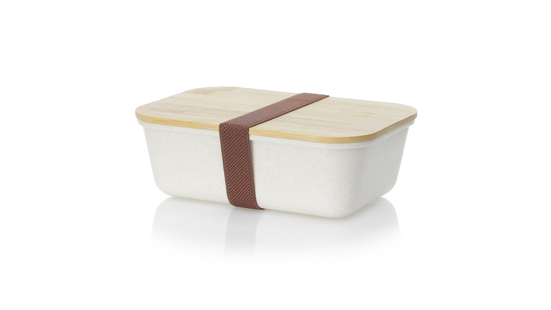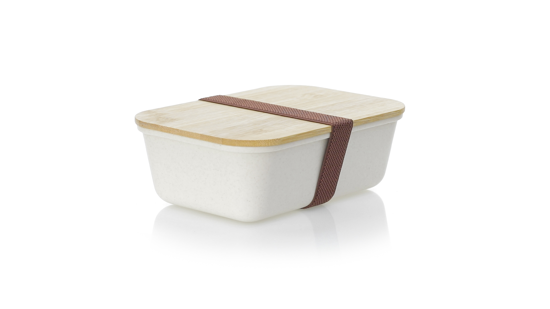 1l Brotdose aus widerstandsfähigem BPA-freiem PP-Kornmaterial, mit Bambusdeckel. Elastisches Sicherheitsband auf dem Deckel und Food Grade-Zertifizierung, die die Sicherheit beim Kontakt von Lebensmitteln mit dem zur Herstellung des Produkts verwendeten Material garantieren.