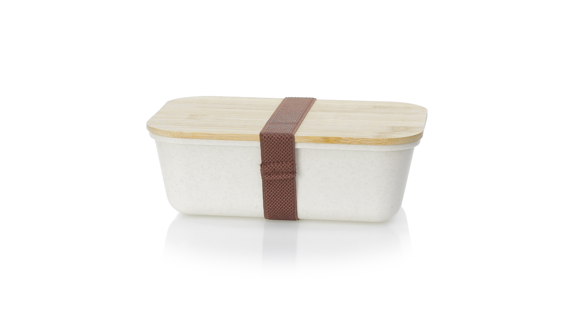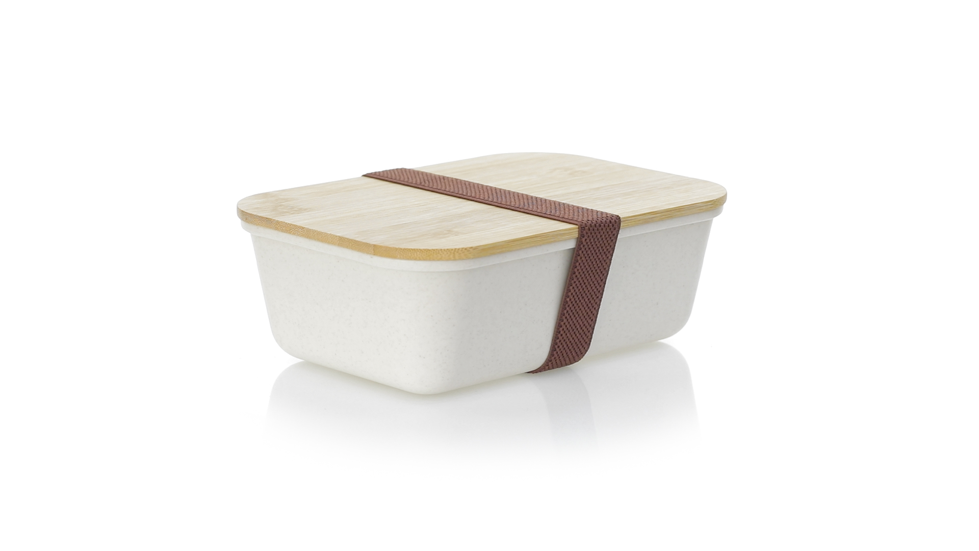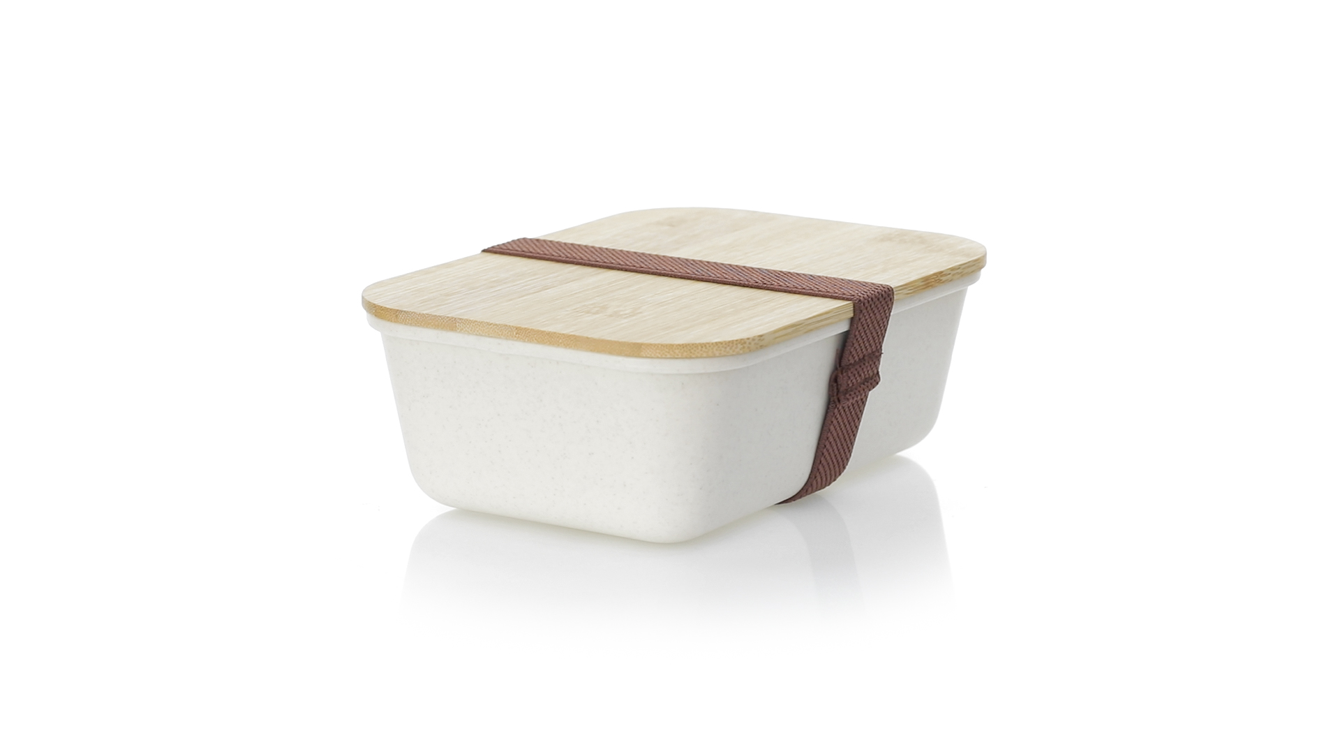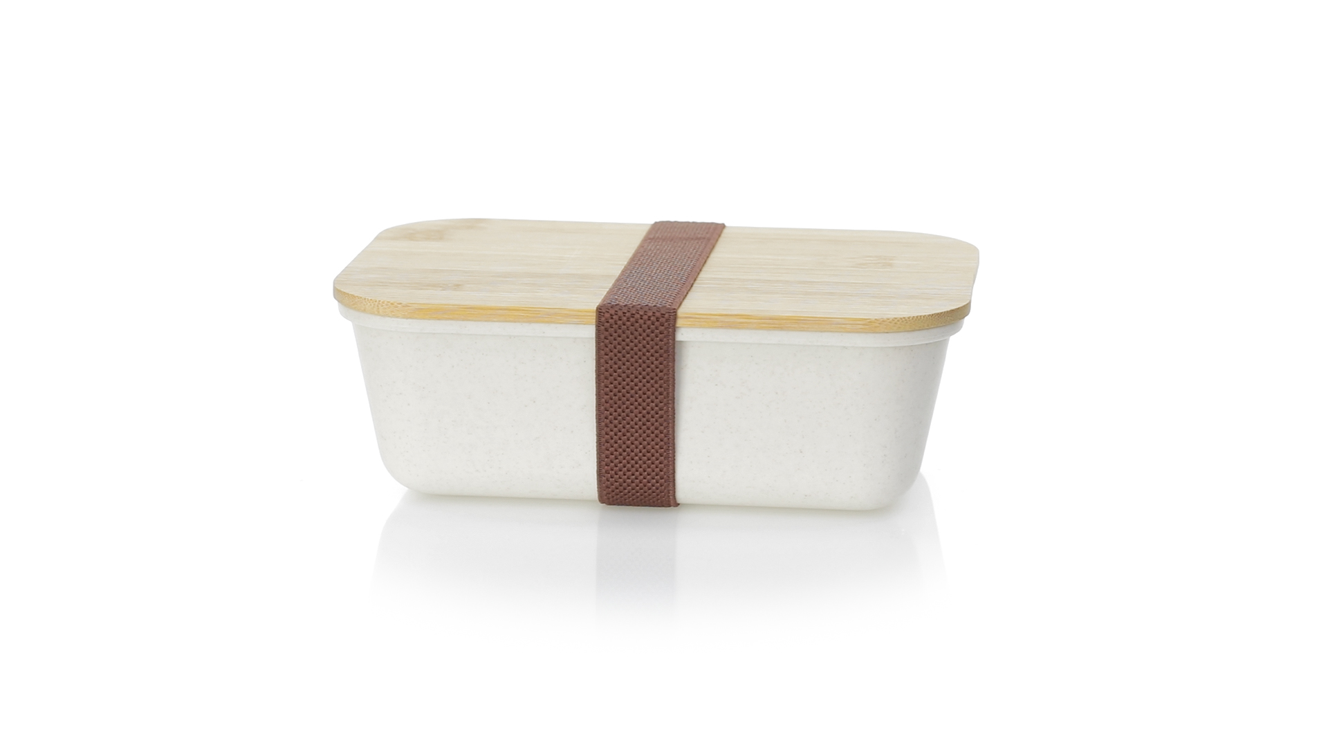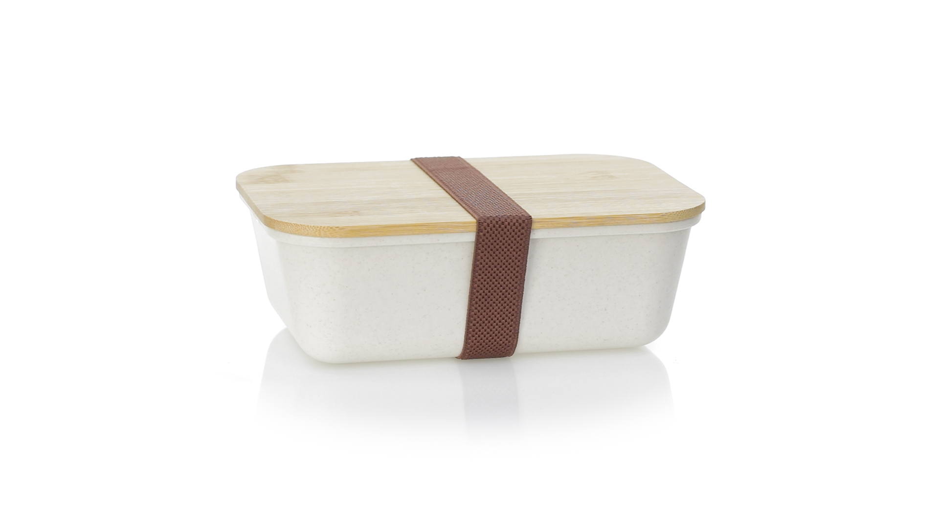 1l Brotdose aus widerstandsfähigem BPA-freiem PP-Kornmaterial, mit Bambusdeckel. Elastisches Sicherheitsband auf dem Deckel und Food Grade-Zertifizierung, die die Sicherheit beim Kontakt von Lebensmitteln mit dem zur Herstellung des Produkts verwendeten Material garantieren.