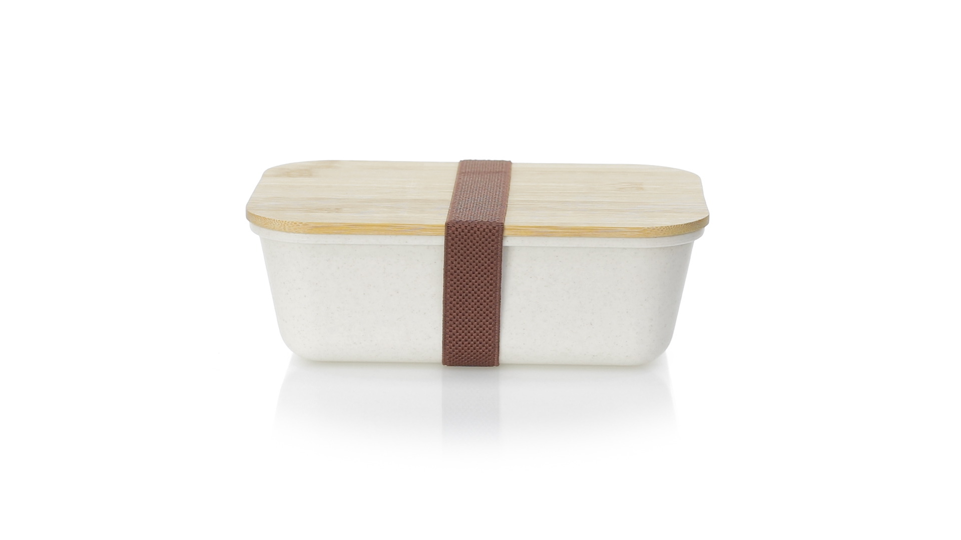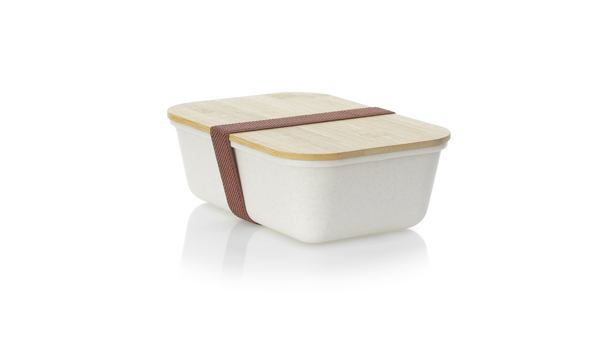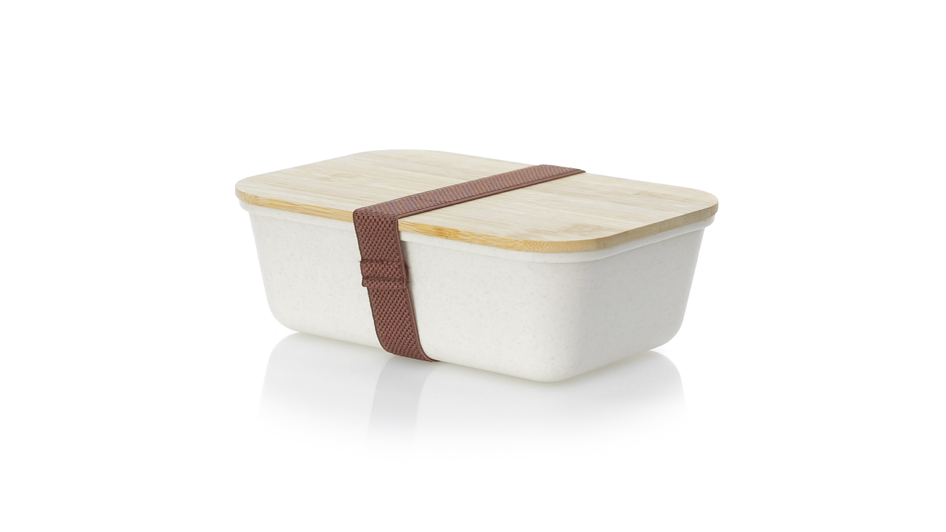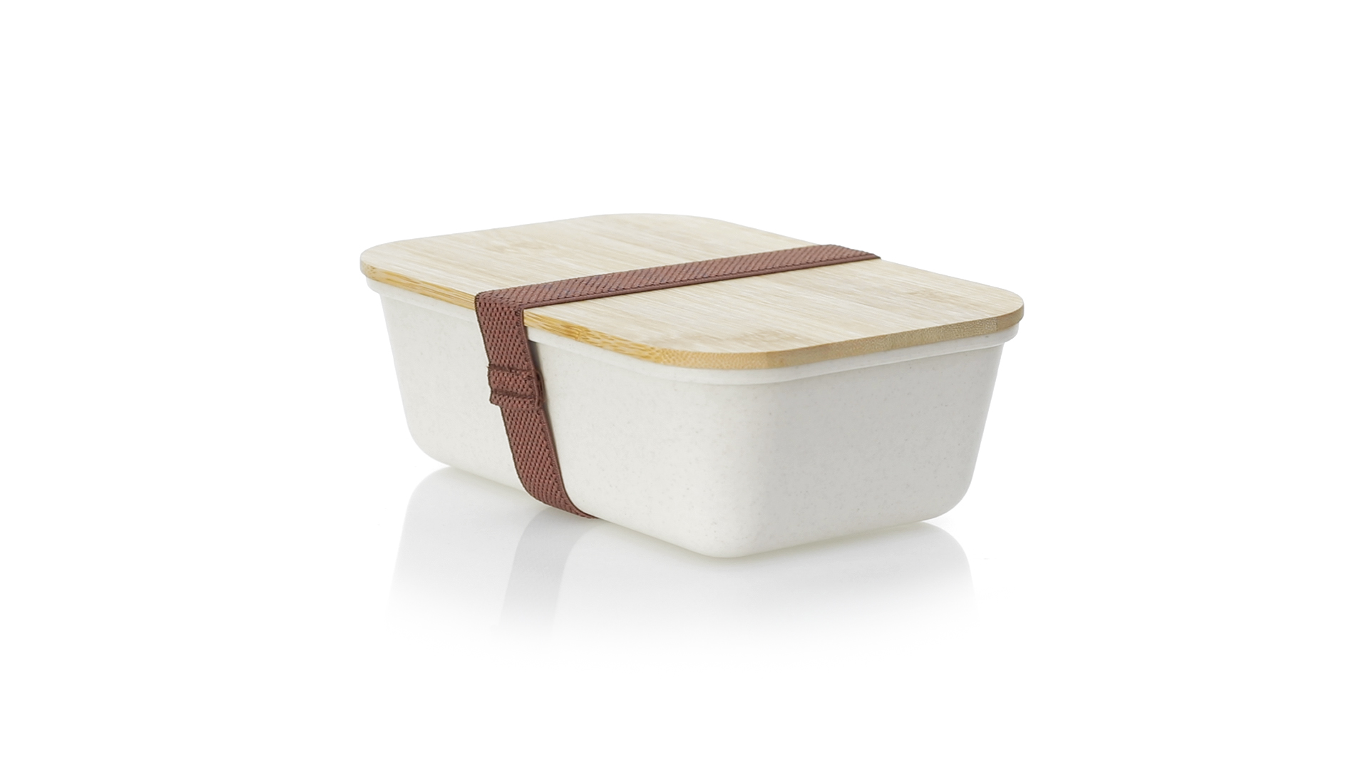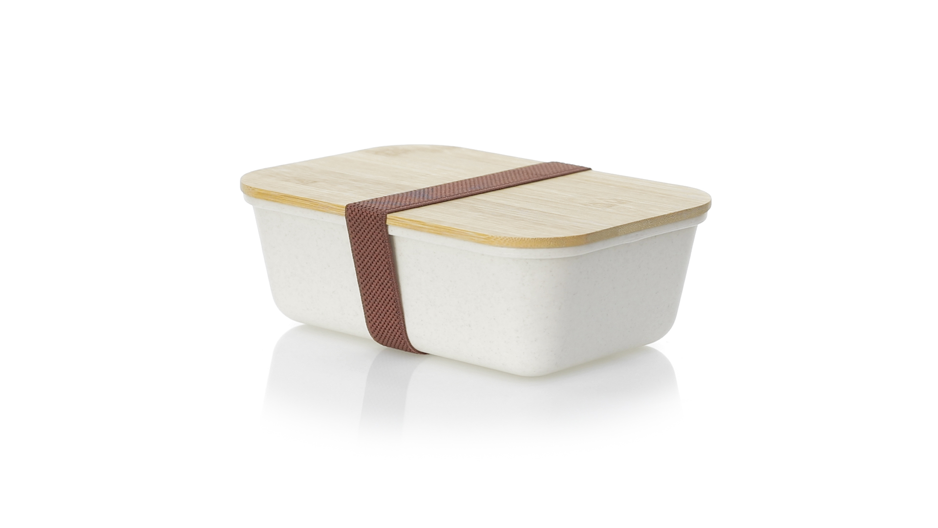 1l Brotdose aus widerstandsfähigem BPA-freiem PP-Kornmaterial, mit Bambusdeckel. Elastisches Sicherheitsband auf dem Deckel und Food Grade-Zertifizierung, die die Sicherheit beim Kontakt von Lebensmitteln mit dem zur Herstellung des Produkts verwendeten Material garantieren.
