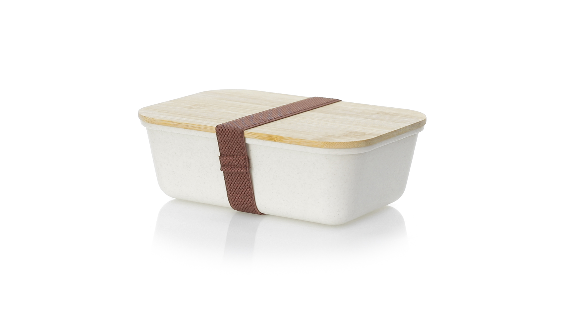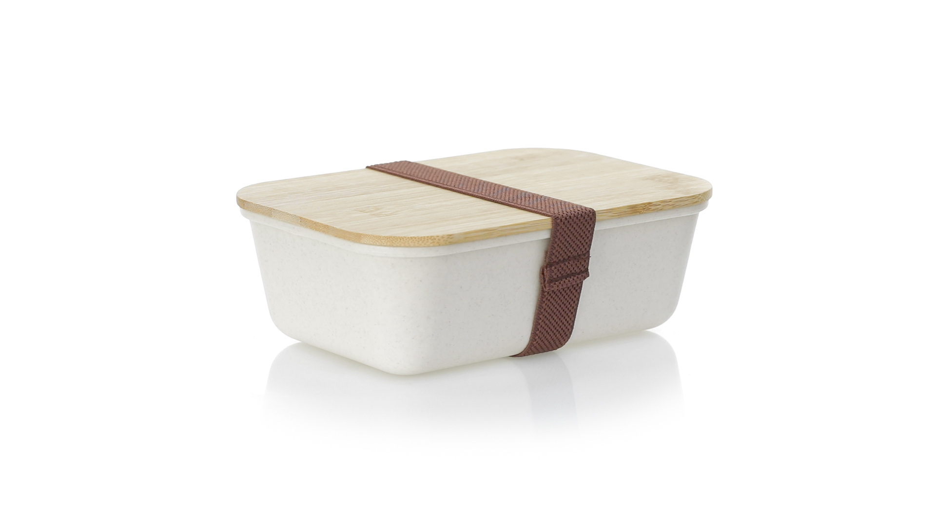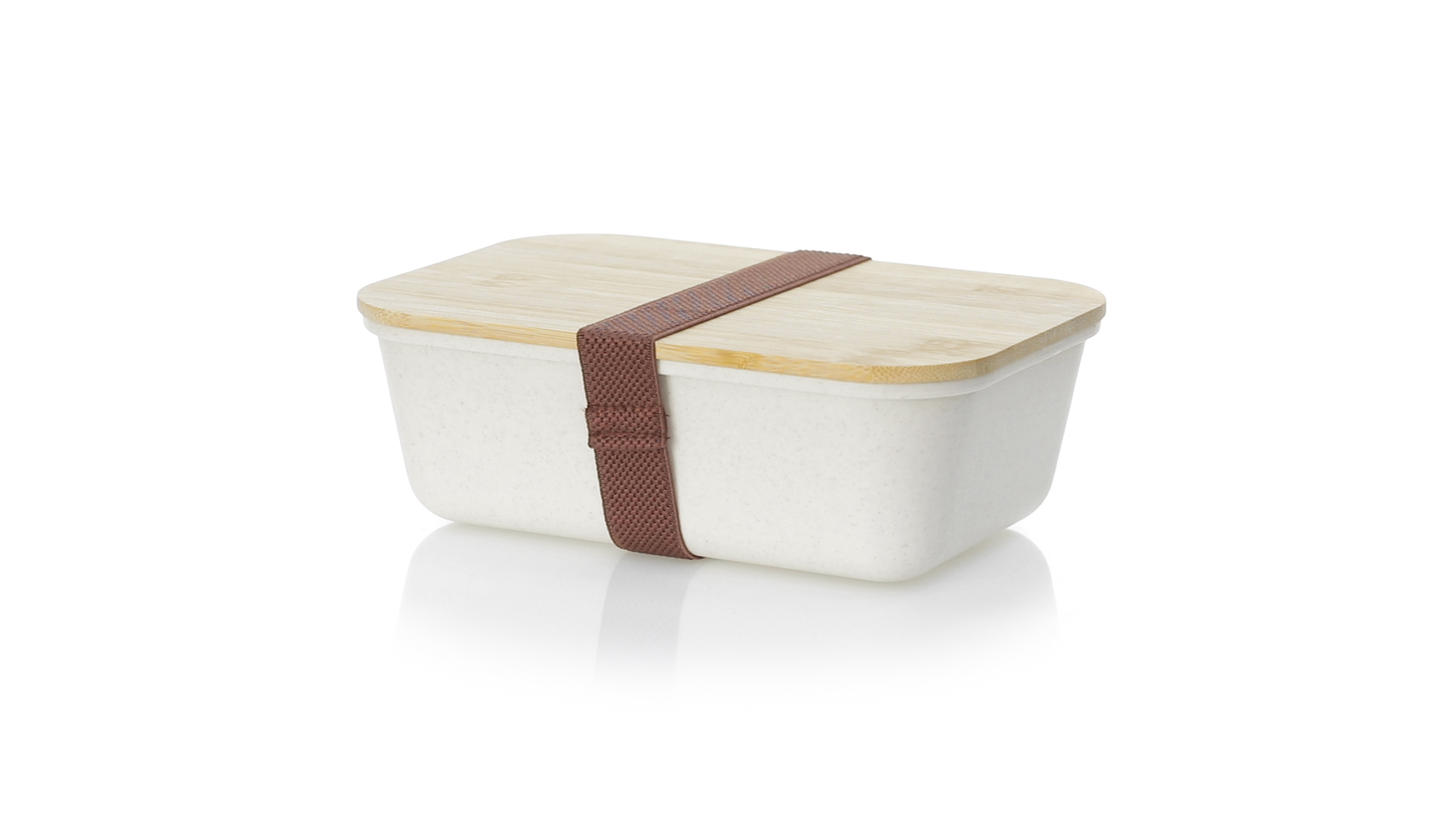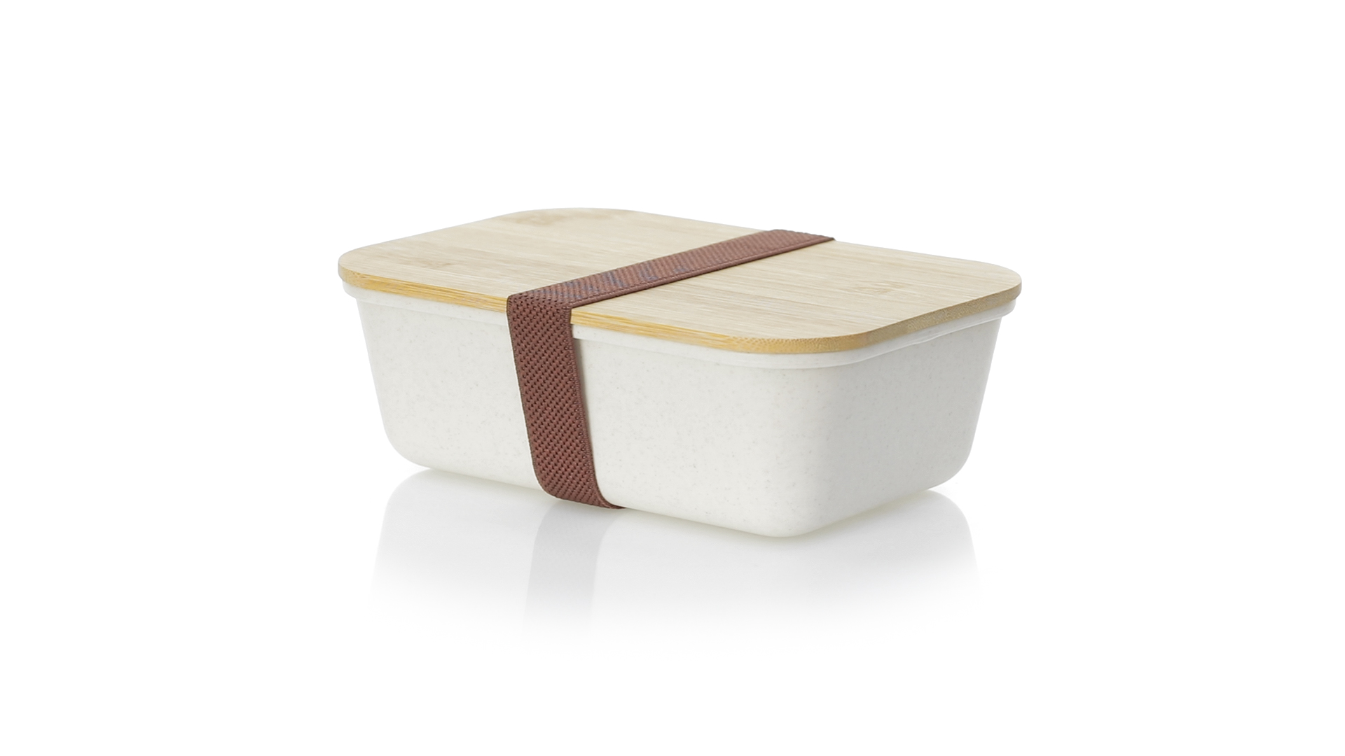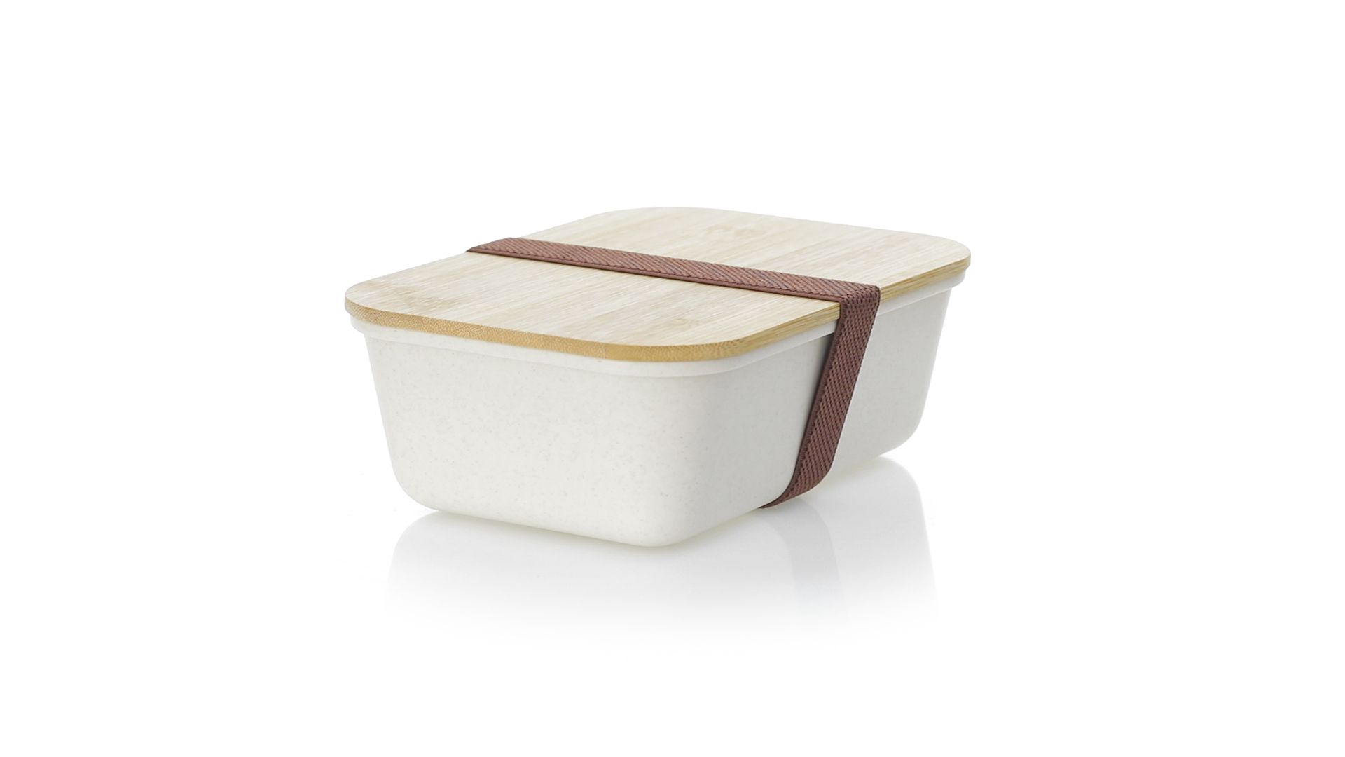 1l Brotdose aus widerstandsfähigem BPA-freiem PP-Kornmaterial, mit Bambusdeckel. Elastisches Sicherheitsband auf dem Deckel und Food Grade-Zertifizierung, die die Sicherheit beim Kontakt von Lebensmitteln mit dem zur Herstellung des Produkts verwendeten Material garantieren.