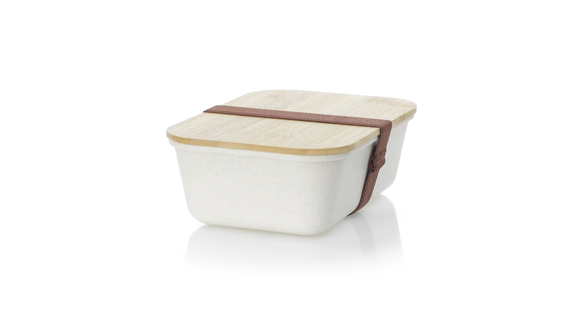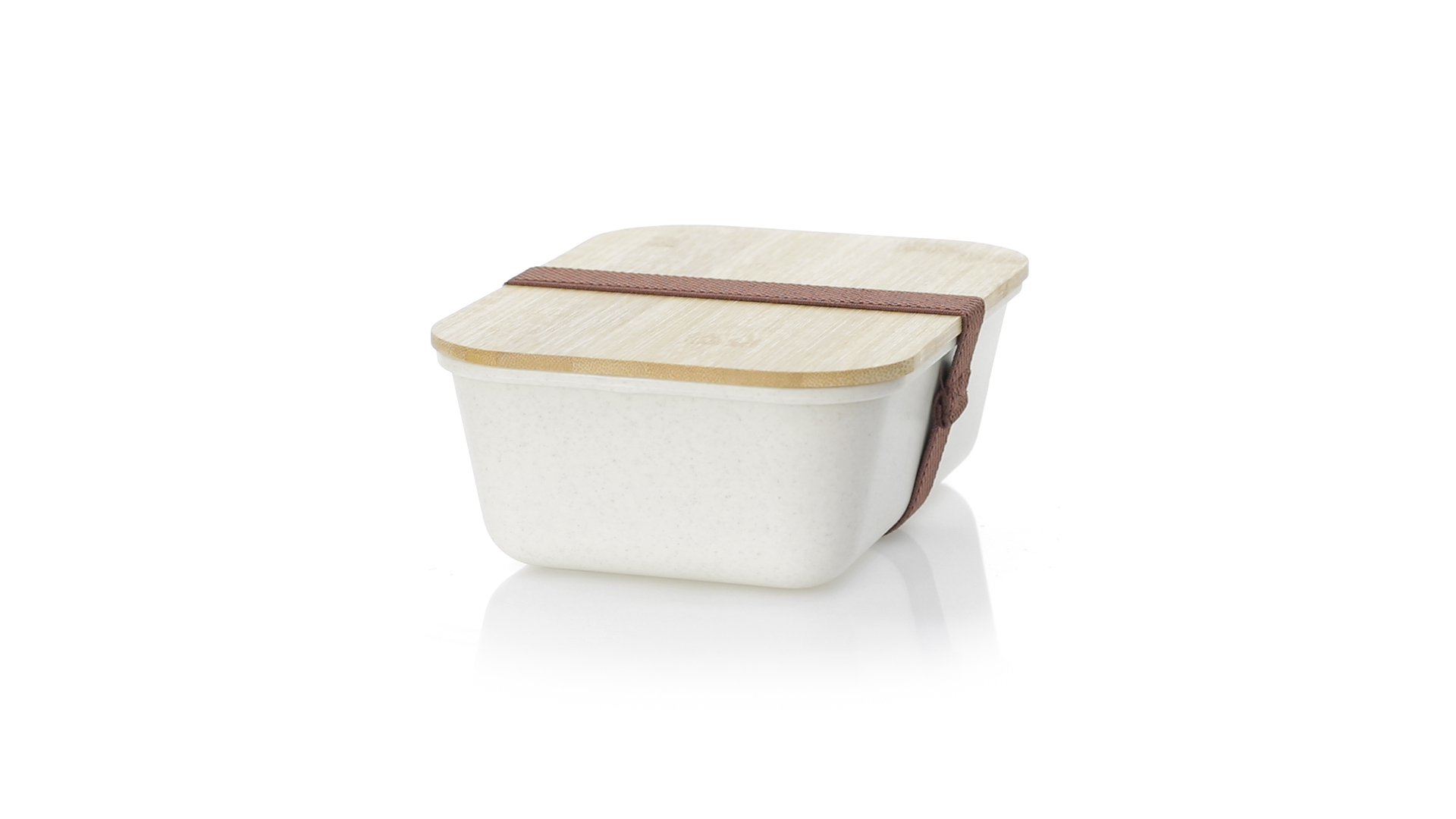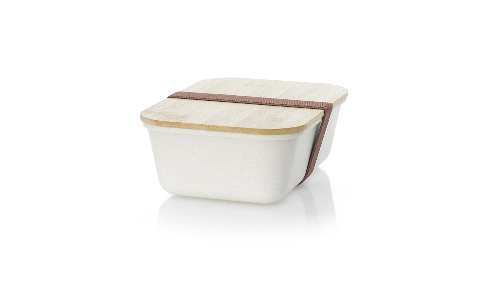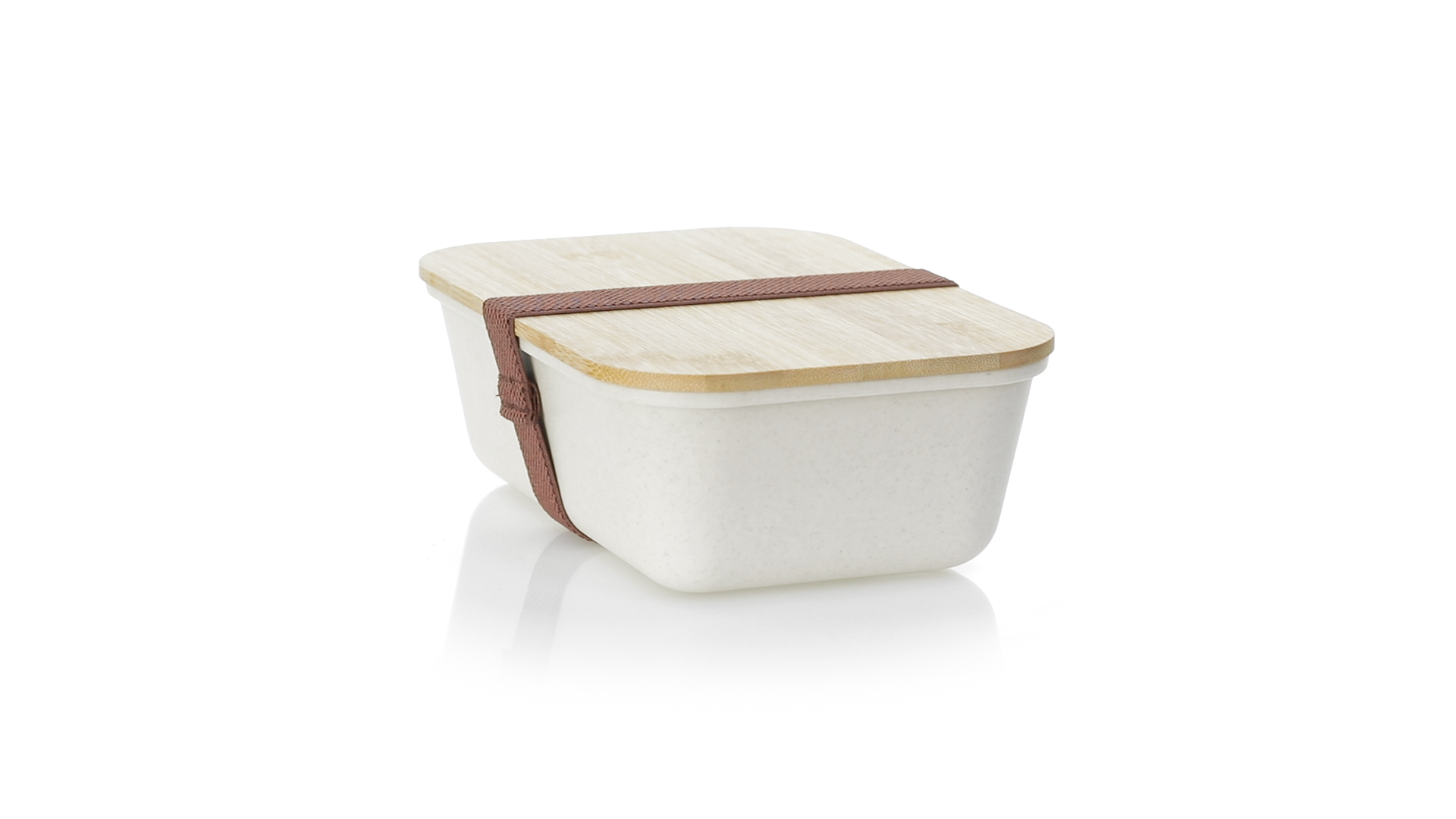 1l Brotdose aus widerstandsfähigem BPA-freiem PP-Kornmaterial, mit Bambusdeckel. Elastisches Sicherheitsband auf dem Deckel und Food Grade-Zertifizierung, die die Sicherheit beim Kontakt von Lebensmitteln mit dem zur Herstellung des Produkts verwendeten Material garantieren.
