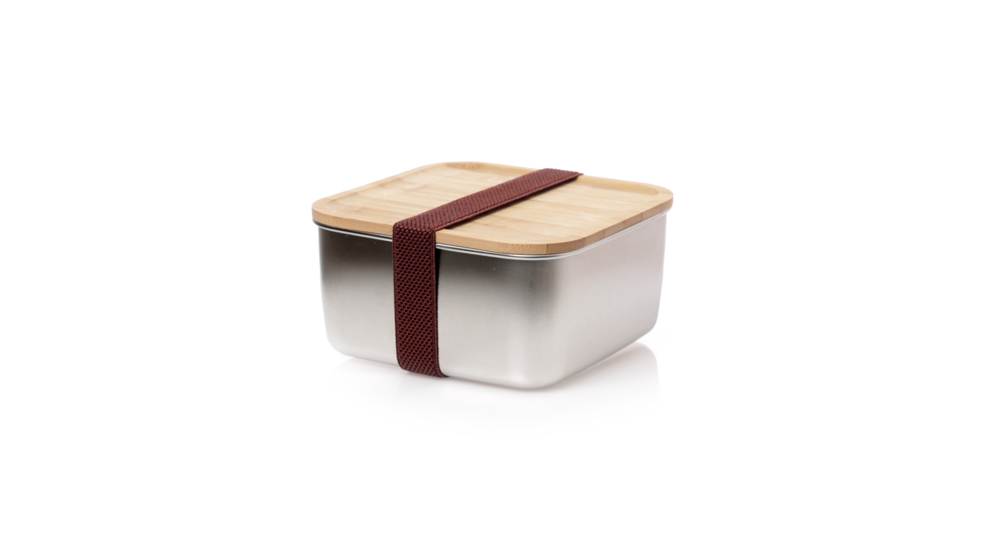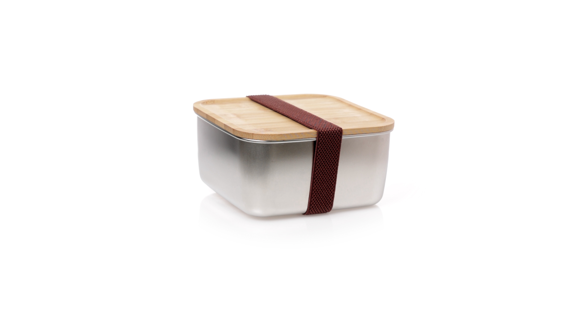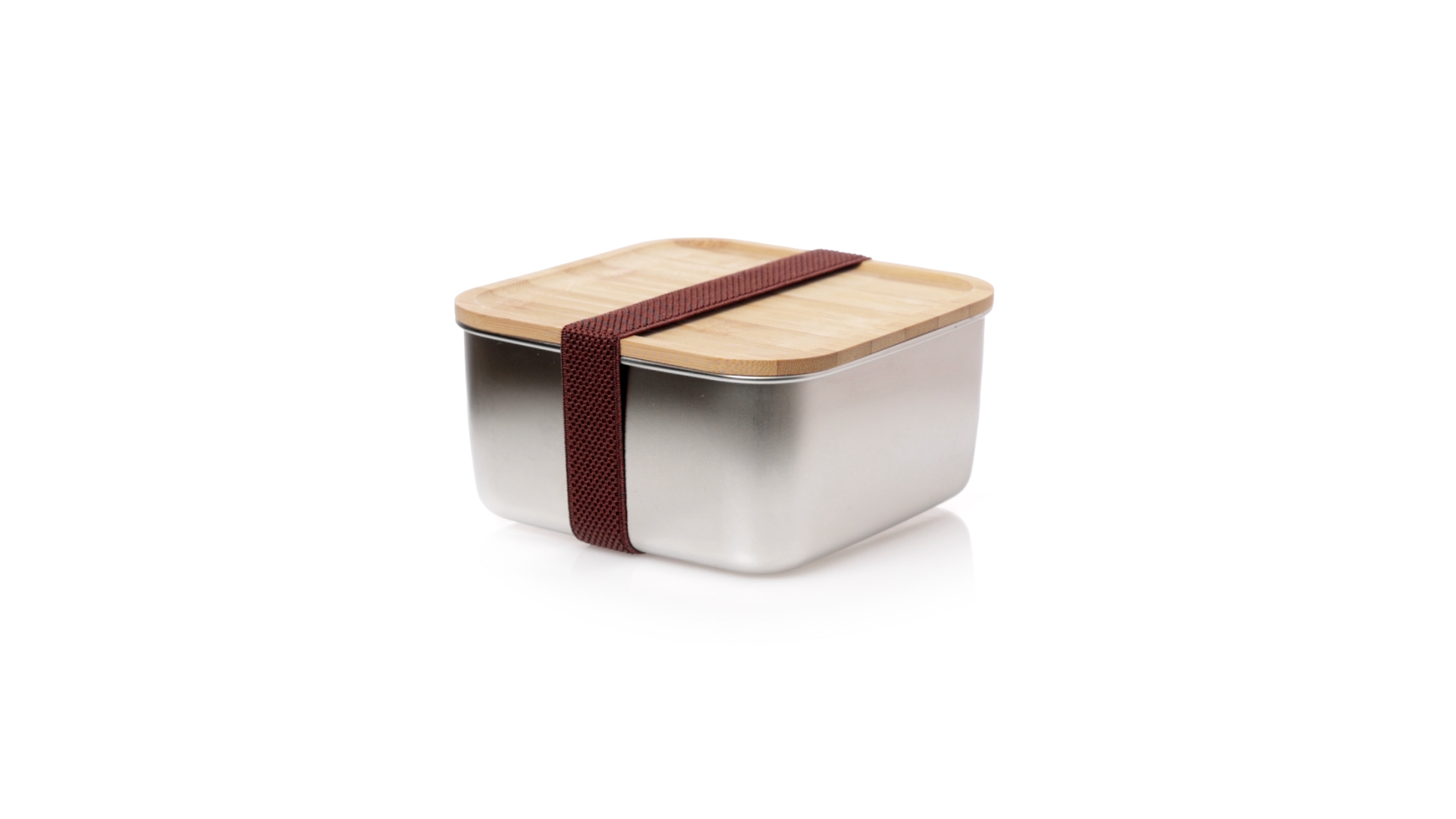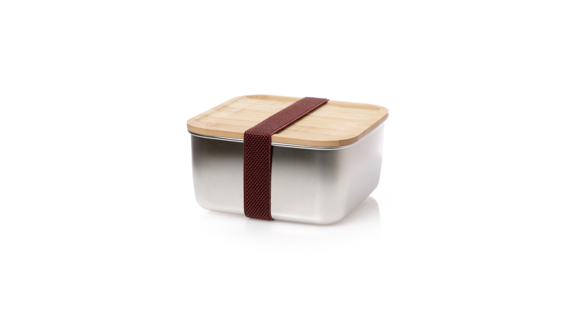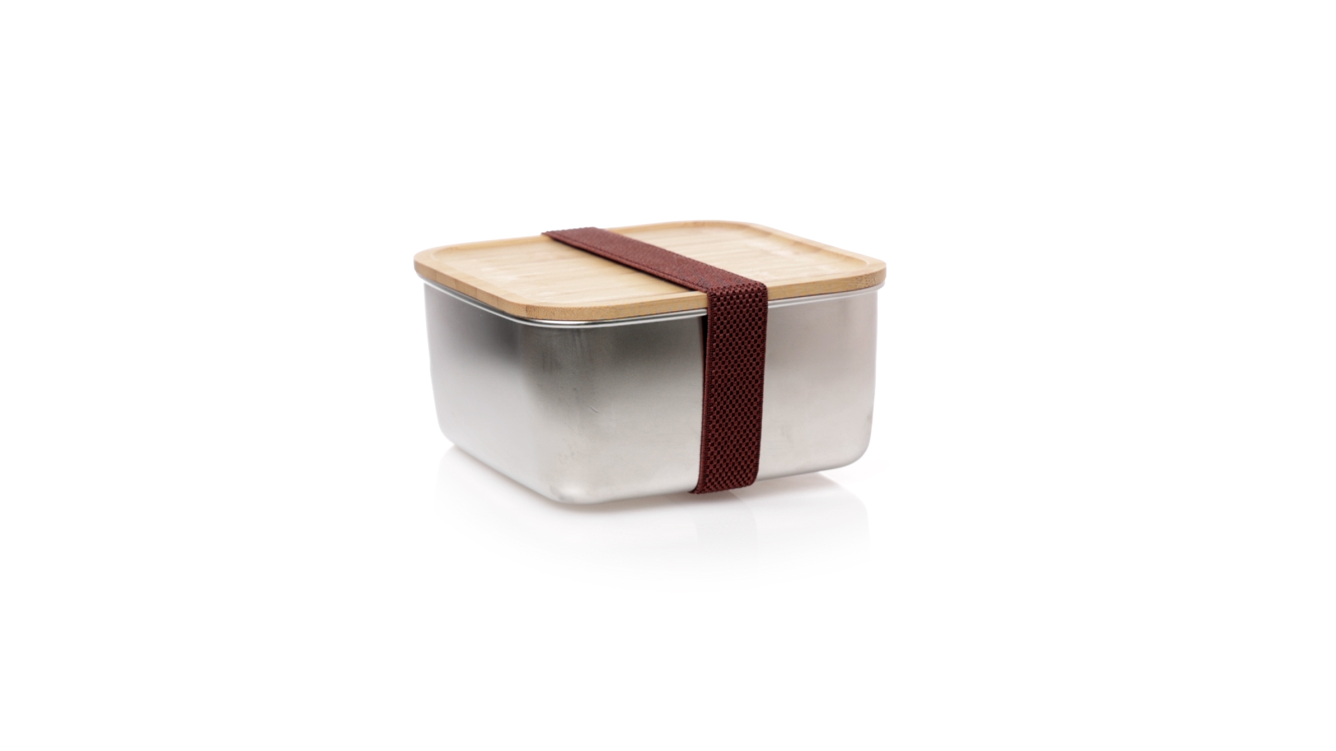 Lunchbox mit 1,4 ml Fassungsvermögen und quadratischem Design, aus Edelstahl. Mit luftdichtem Bambusdeckel und Gummibandverschluss. Präsentiert in einer individuellen Designbox.