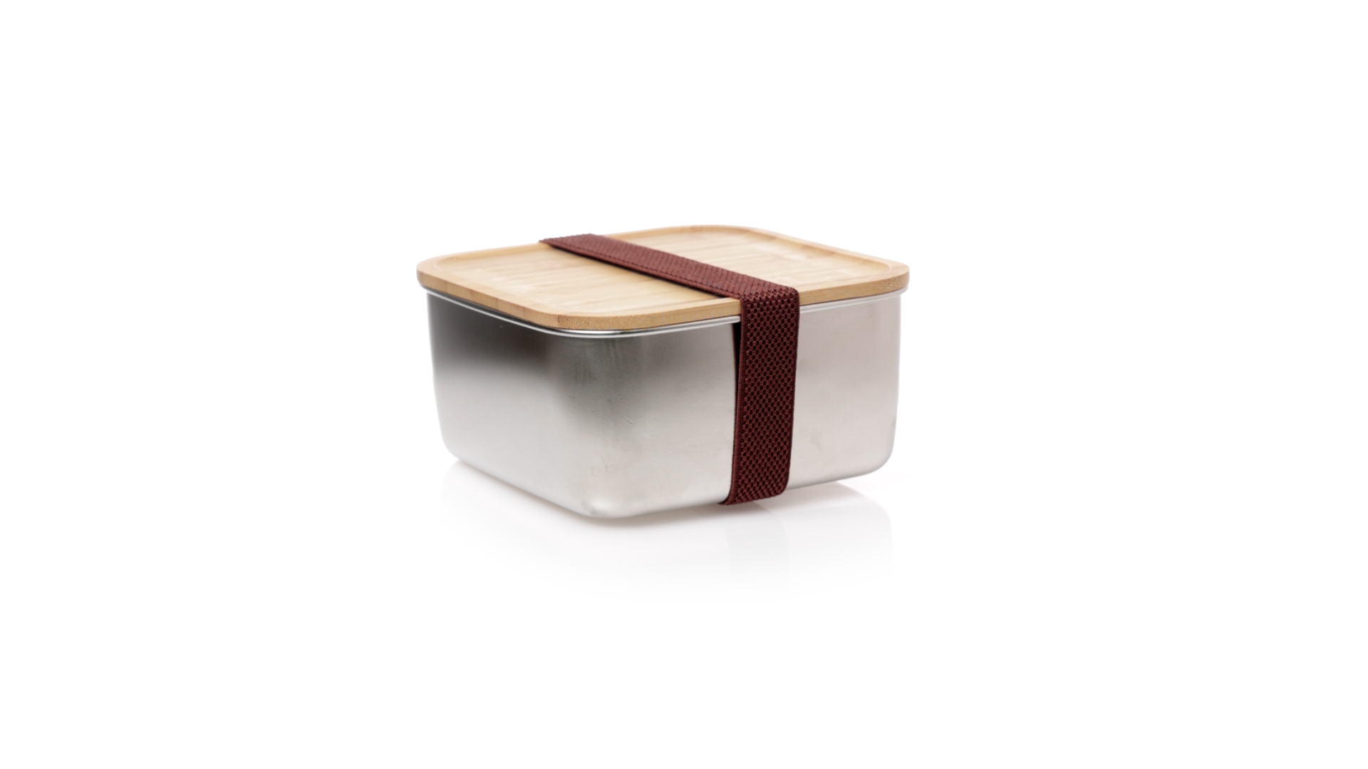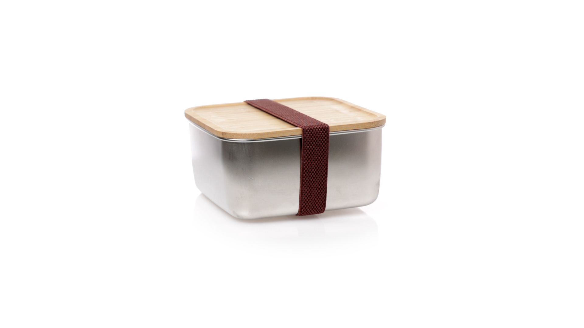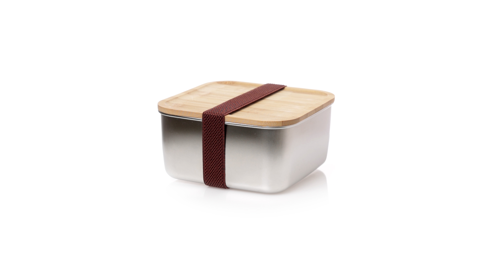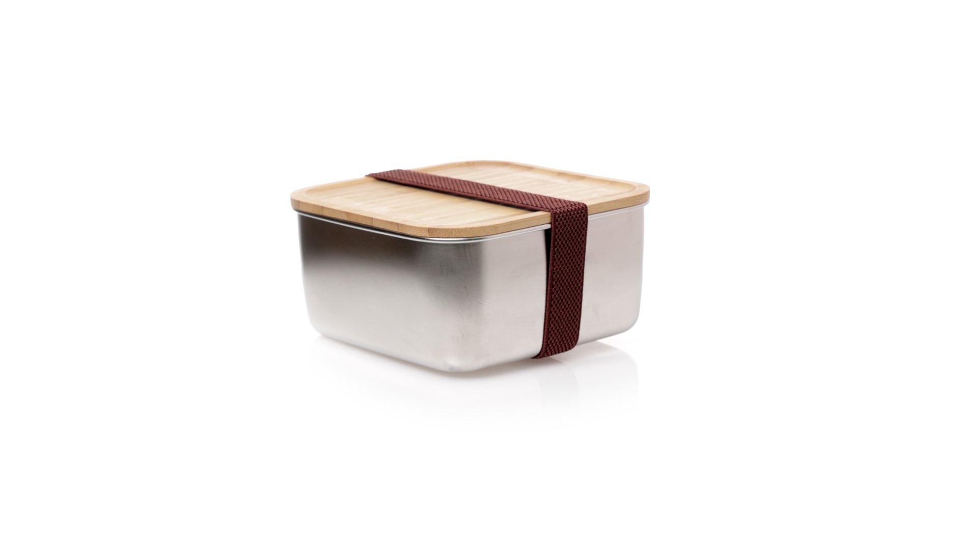 Lunchbox mit 1,4 ml Fassungsvermögen und quadratischem Design, aus Edelstahl. Mit luftdichtem Bambusdeckel und Gummibandverschluss. Präsentiert in einer individuellen Designbox.