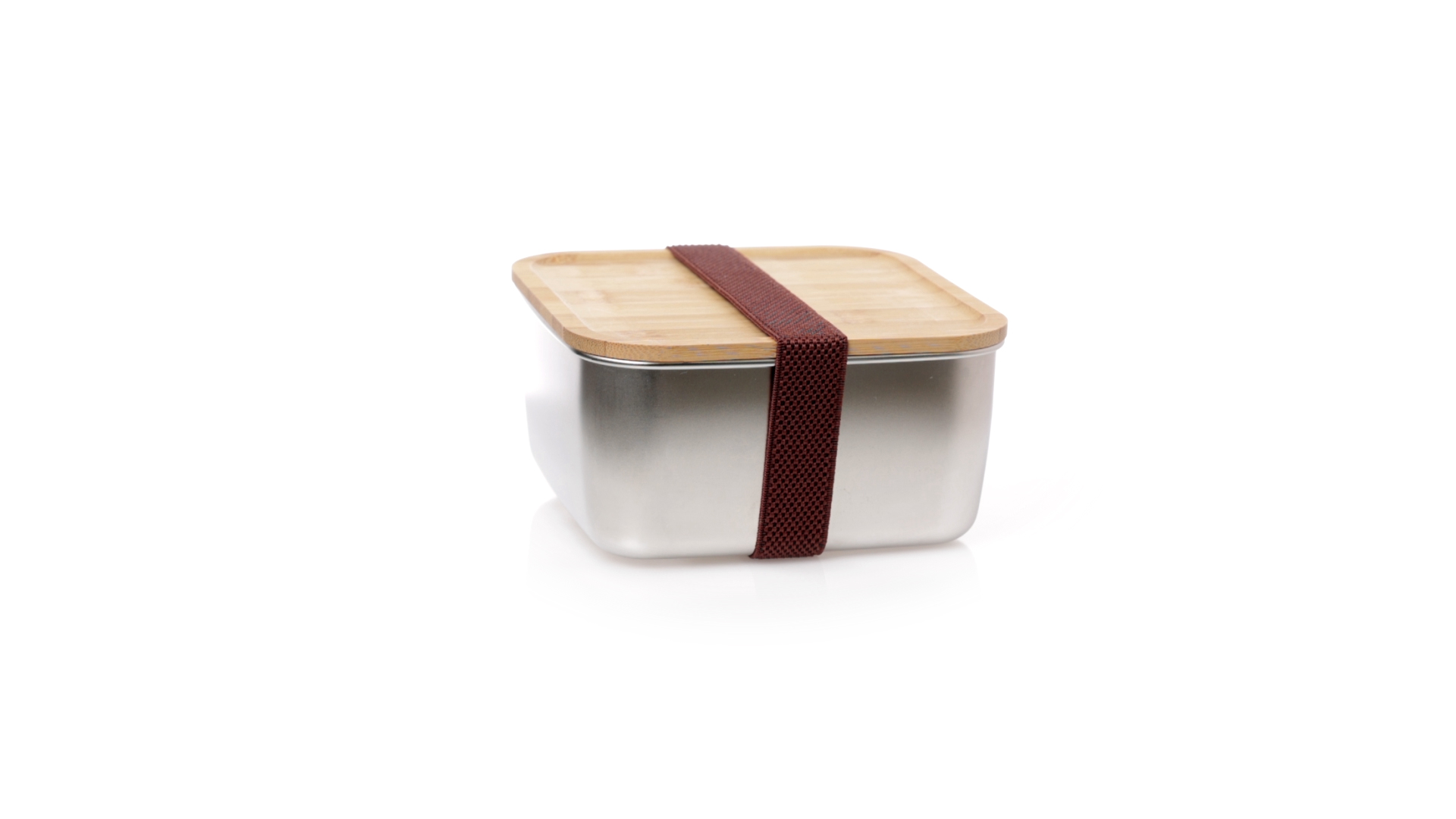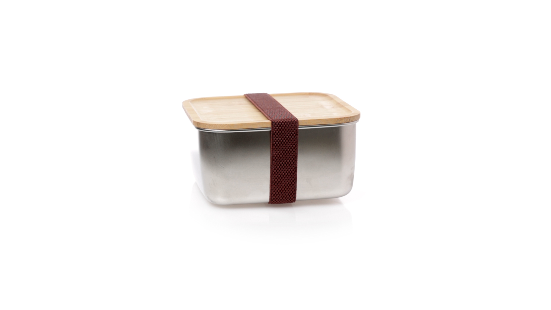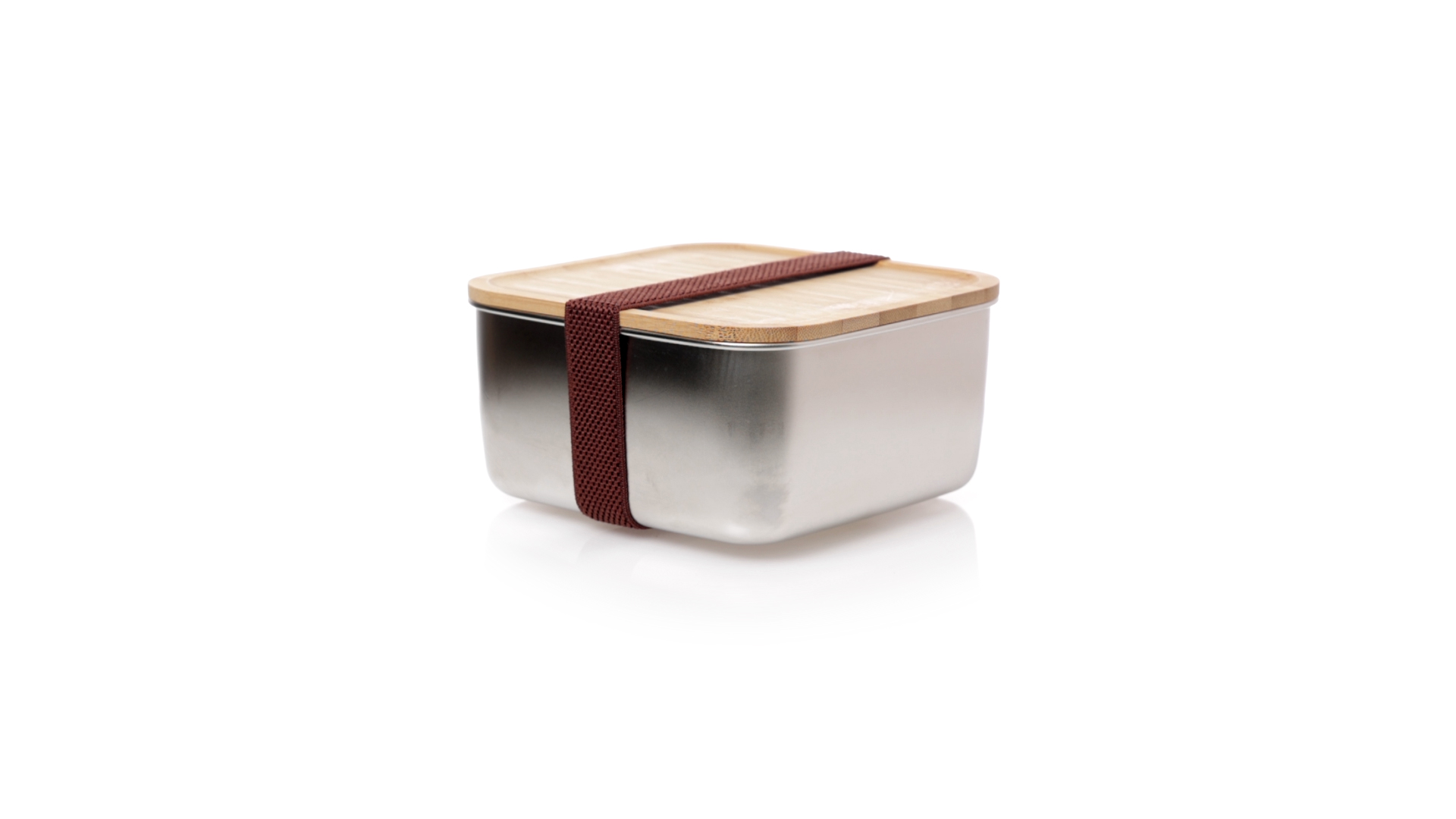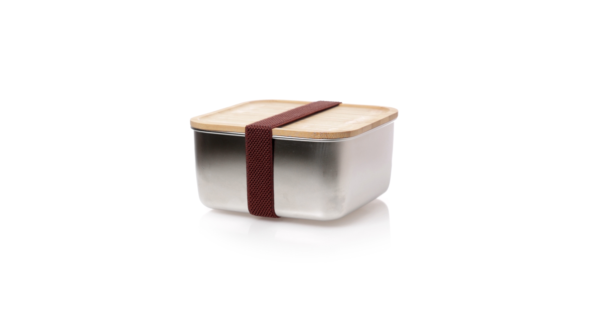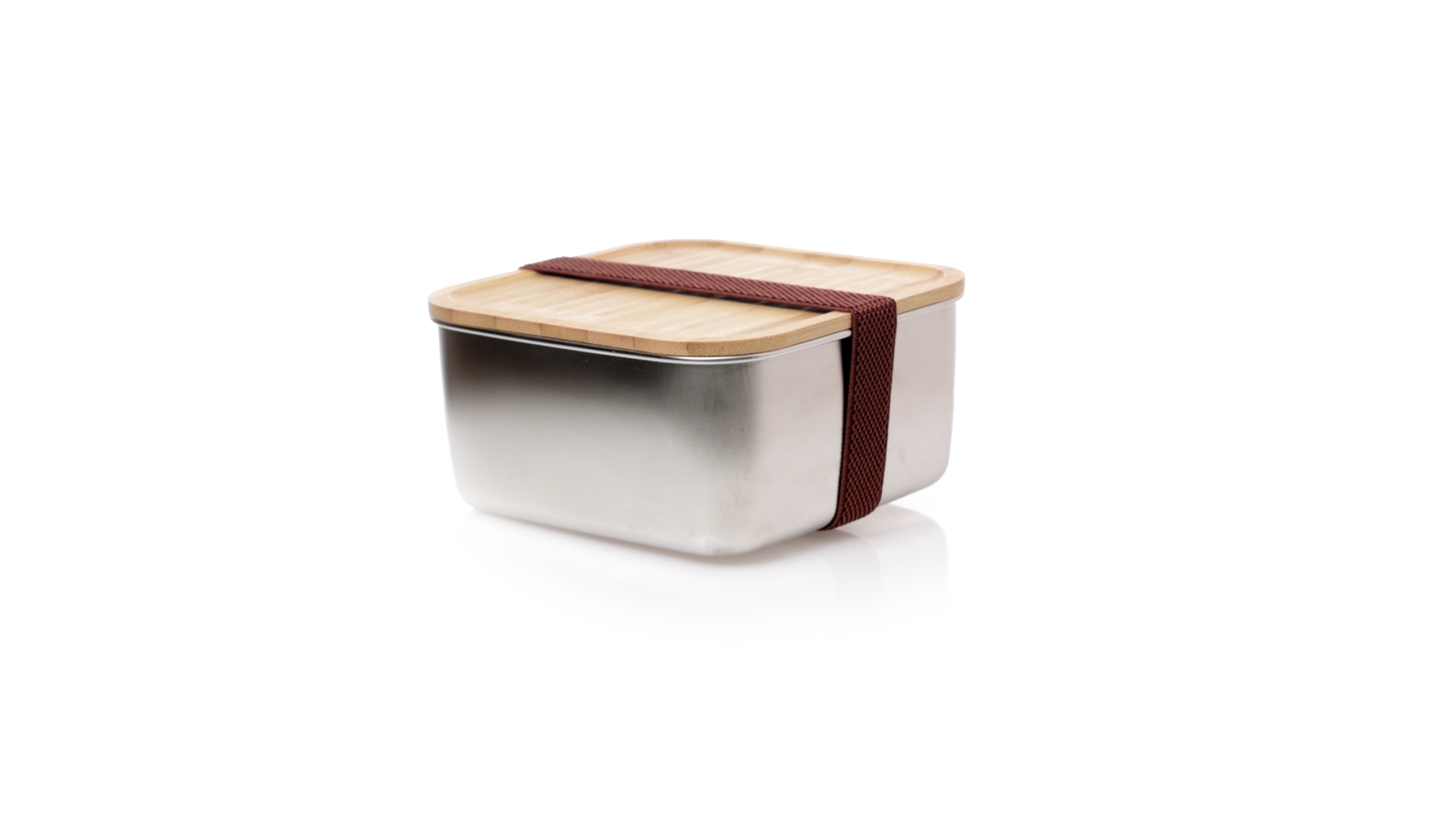 Lunchbox mit 1,4 ml Fassungsvermögen und quadratischem Design, aus Edelstahl. Mit luftdichtem Bambusdeckel und Gummibandverschluss. Präsentiert in einer individuellen Designbox.