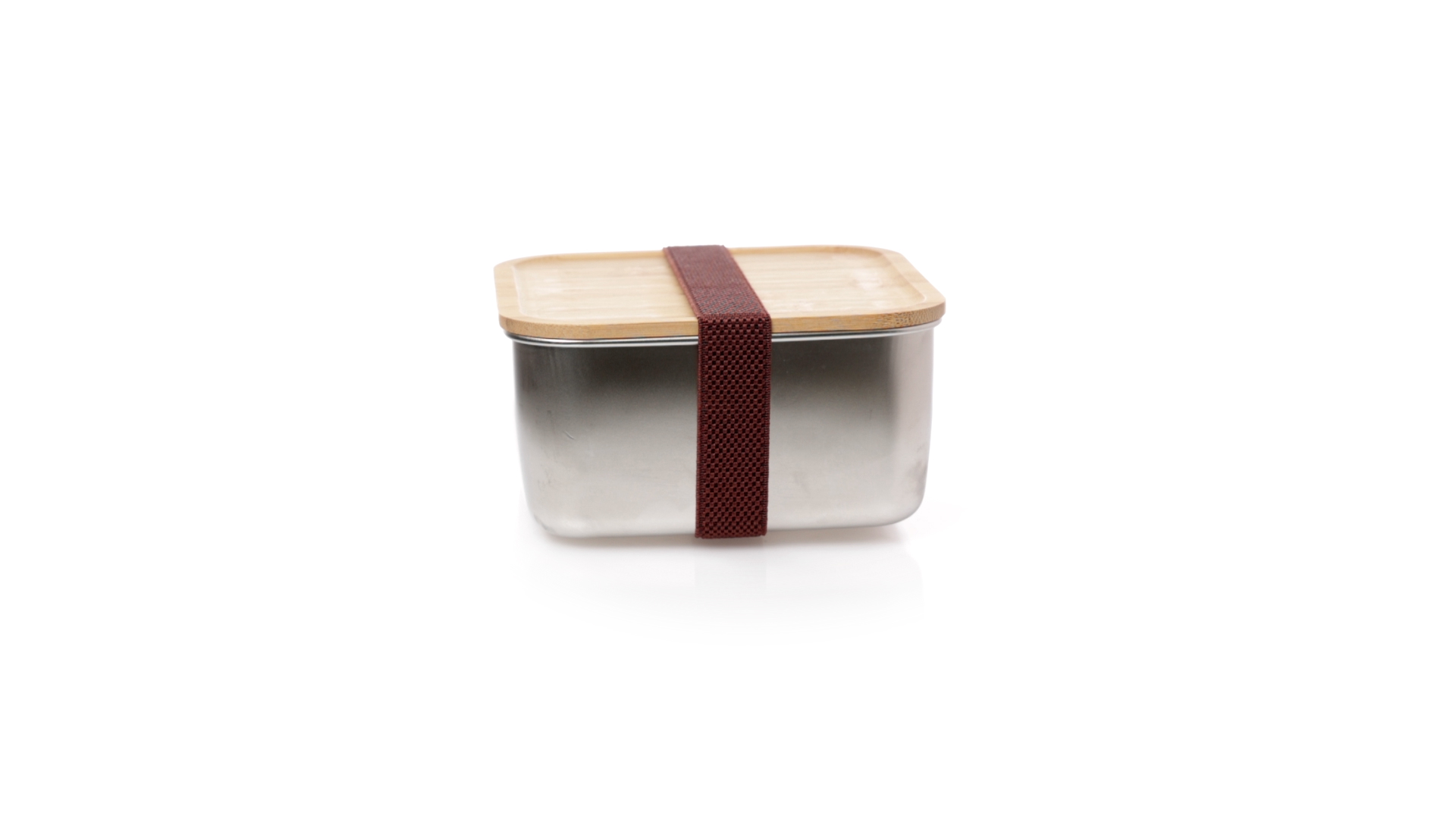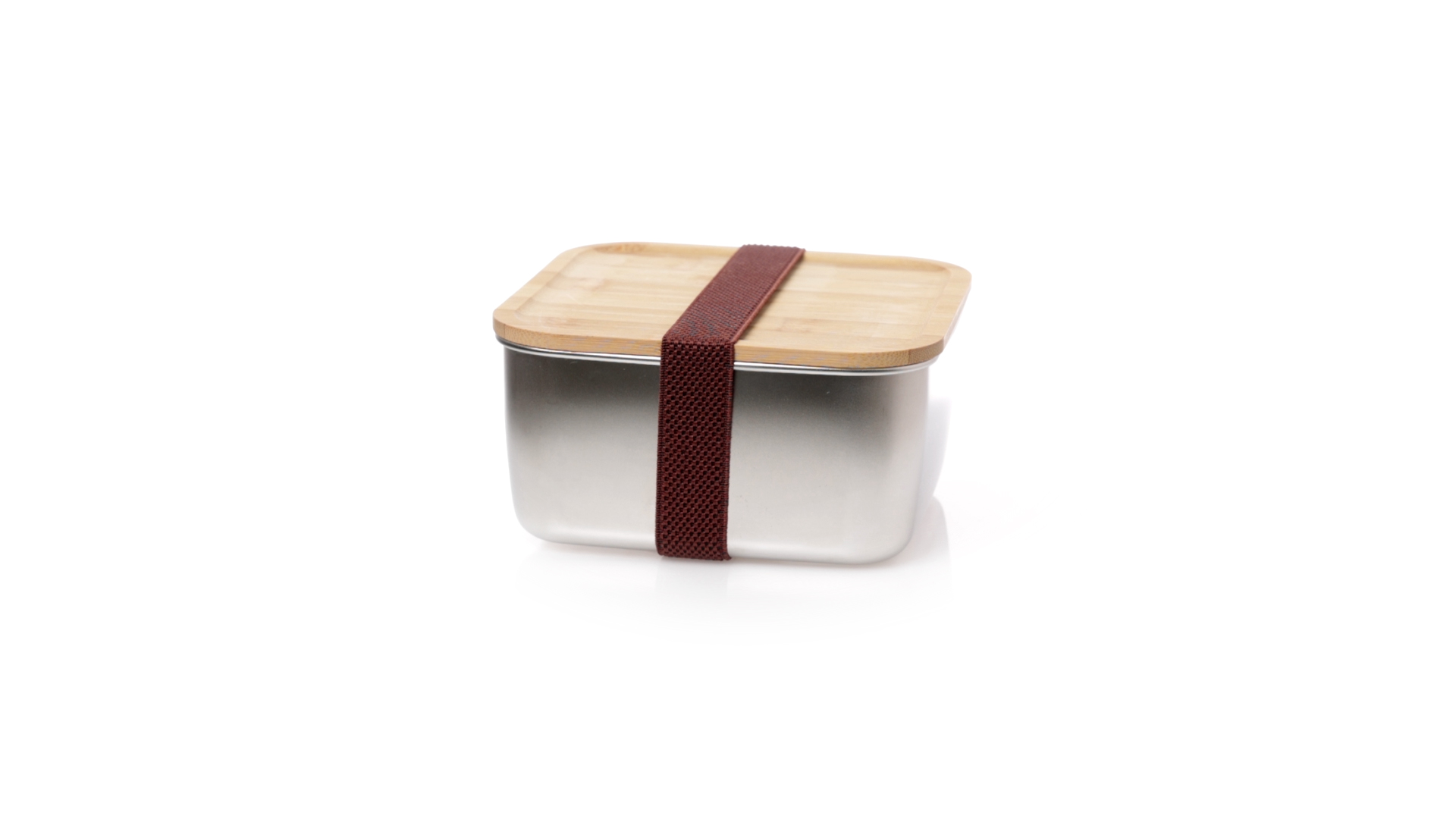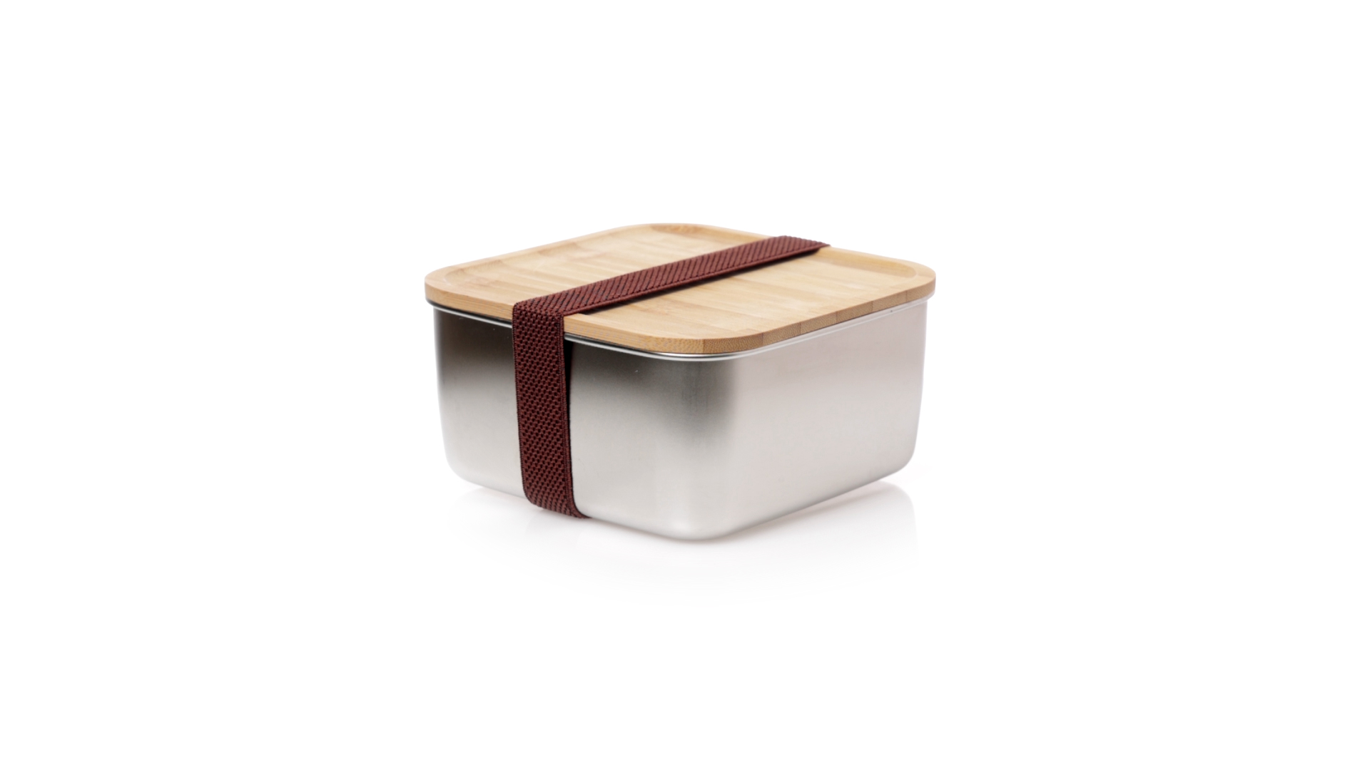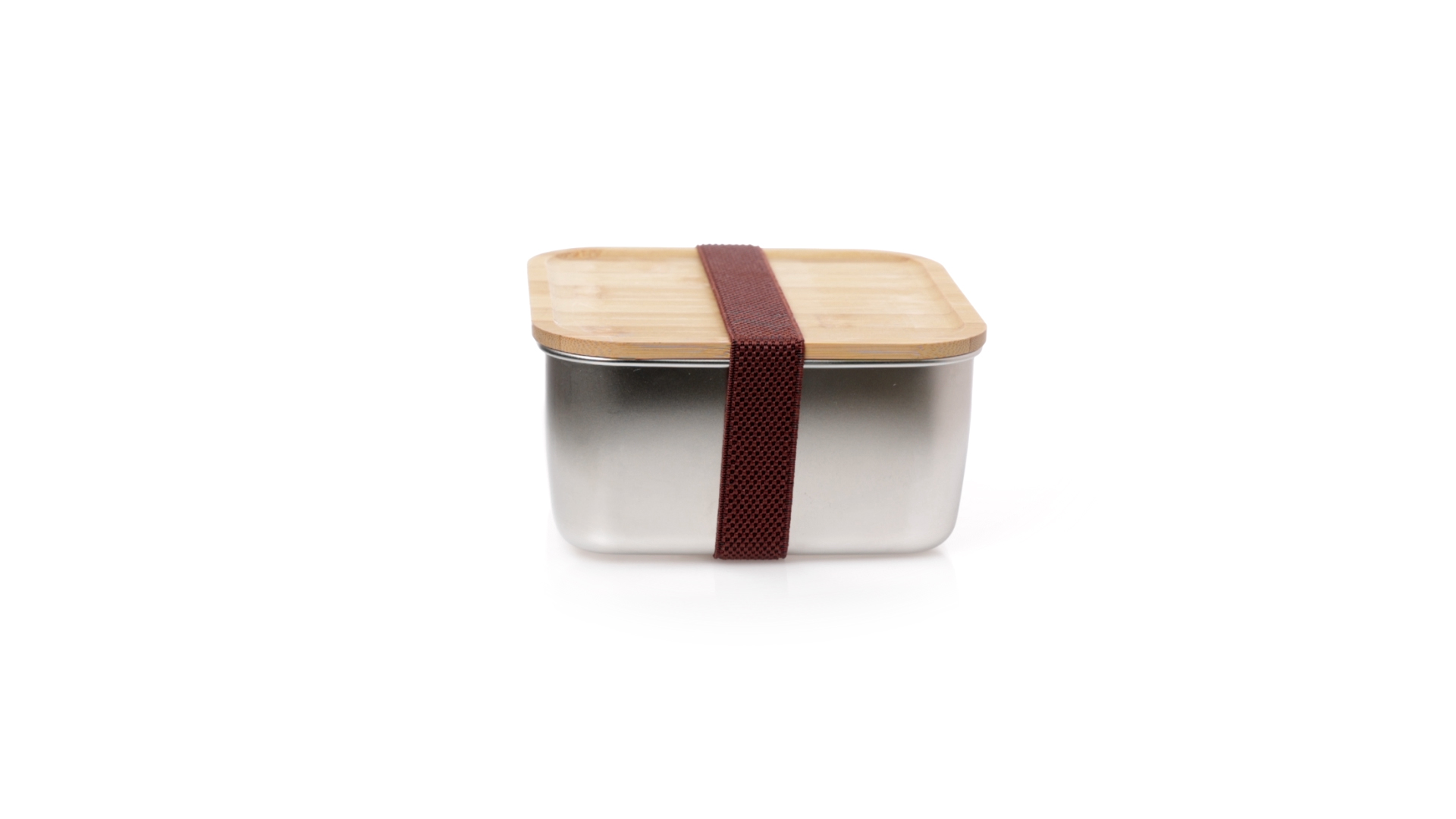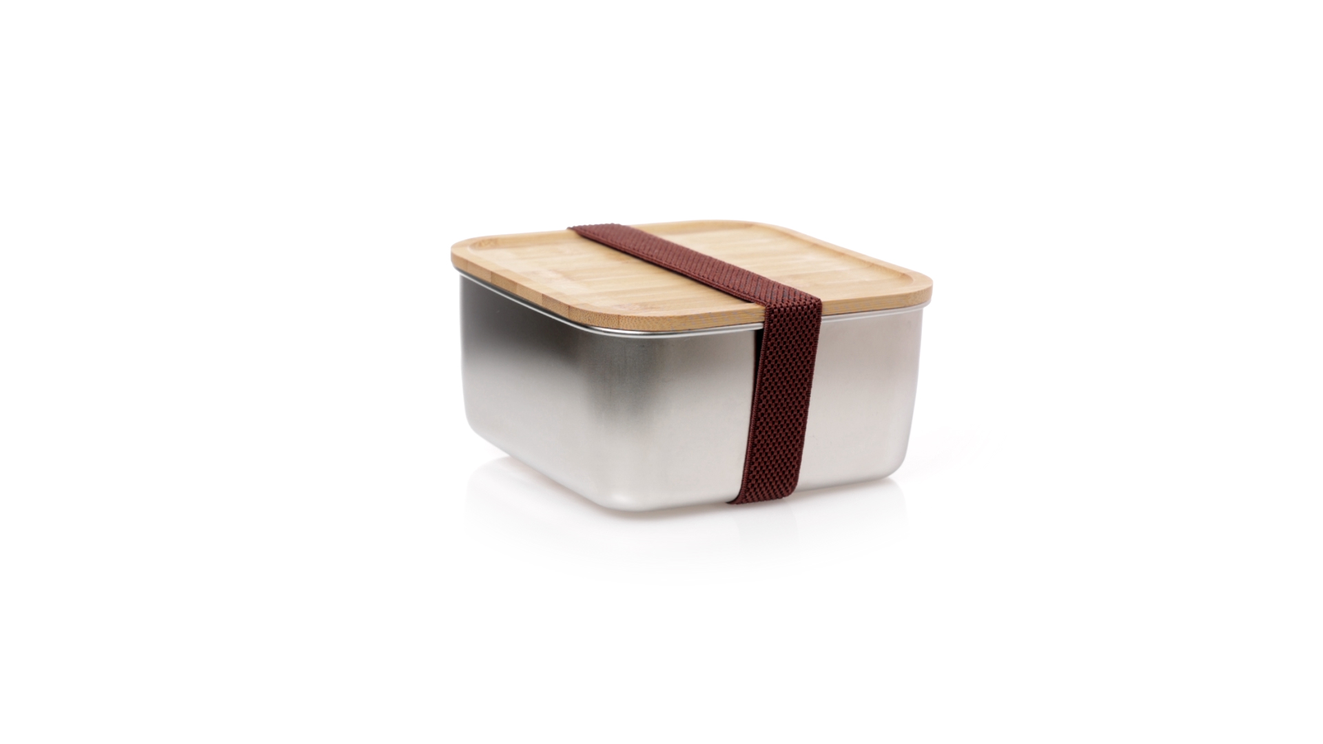Lunchbox mit 1,4 ml Fassungsvermögen und quadratischem Design, aus Edelstahl. Mit luftdichtem Bambusdeckel und Gummibandverschluss. Präsentiert in einer individuellen Designbox.