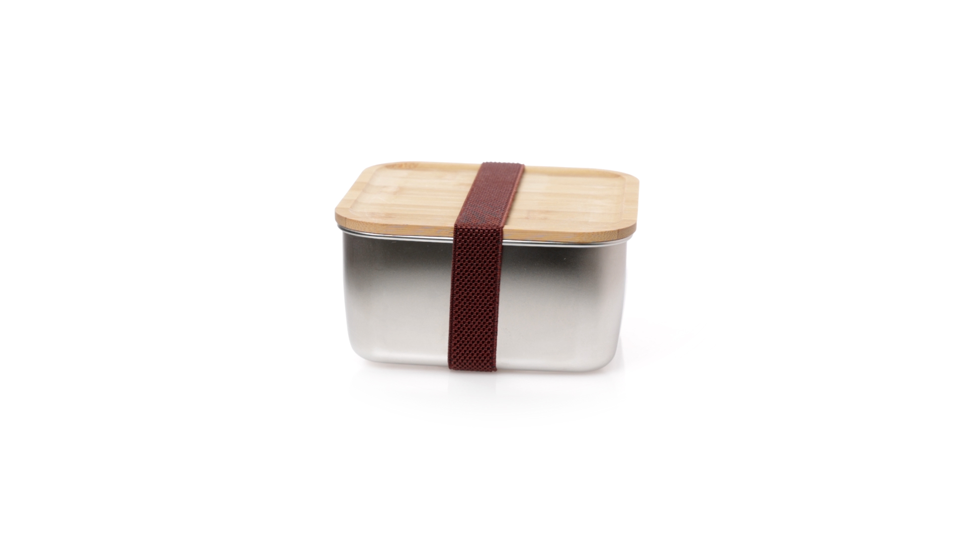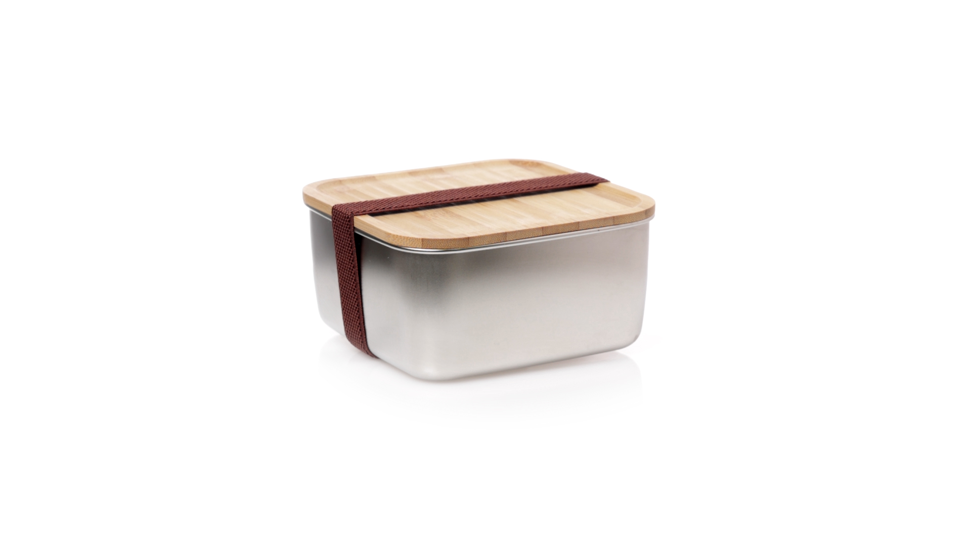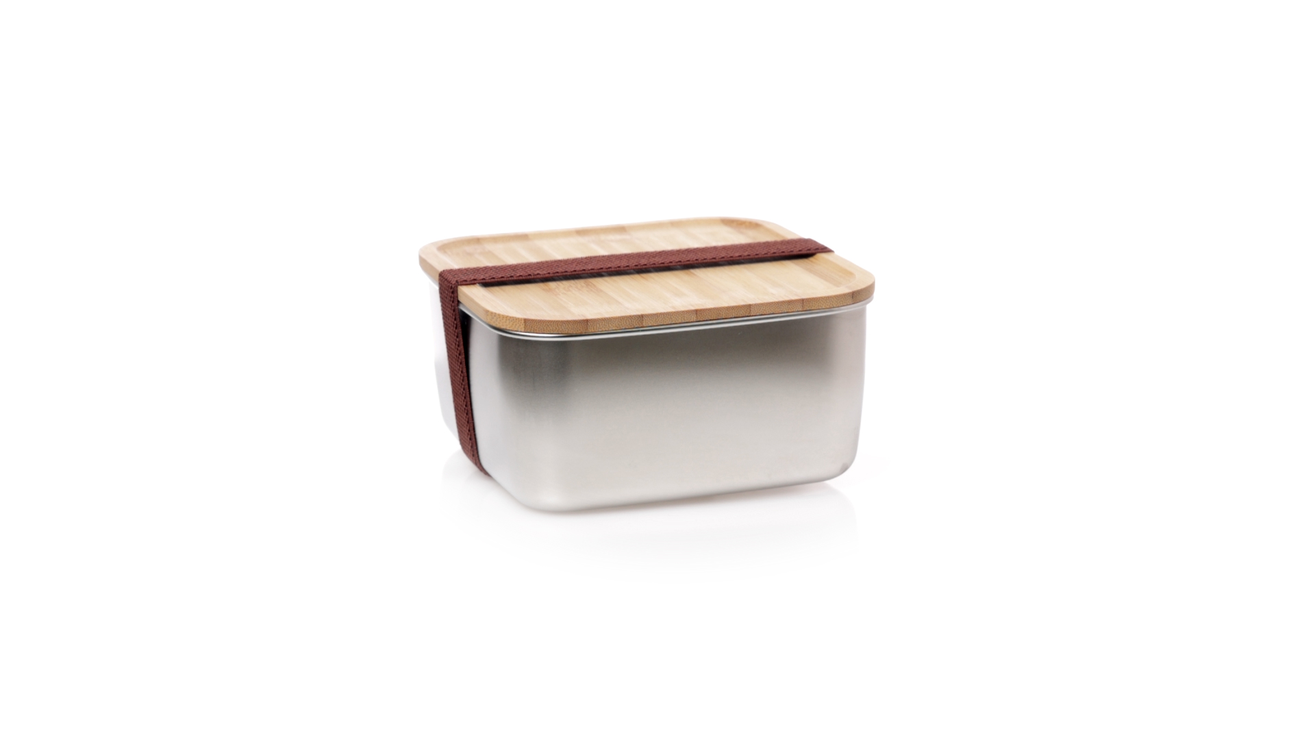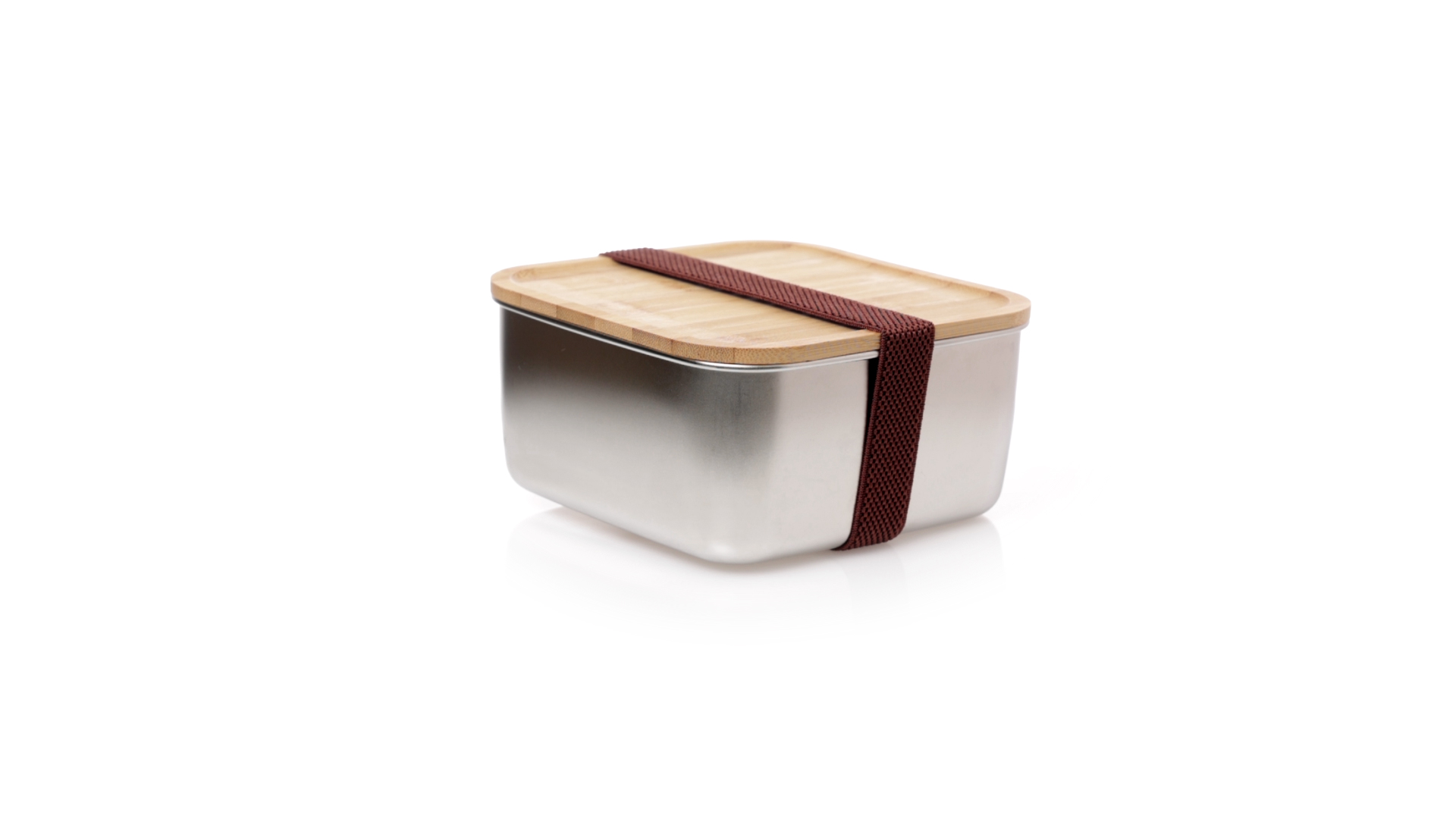 Lunchbox mit 1,4 ml Fassungsvermögen und quadratischem Design, aus Edelstahl. Mit luftdichtem Bambusdeckel und Gummibandverschluss. Präsentiert in einer individuellen Designbox.