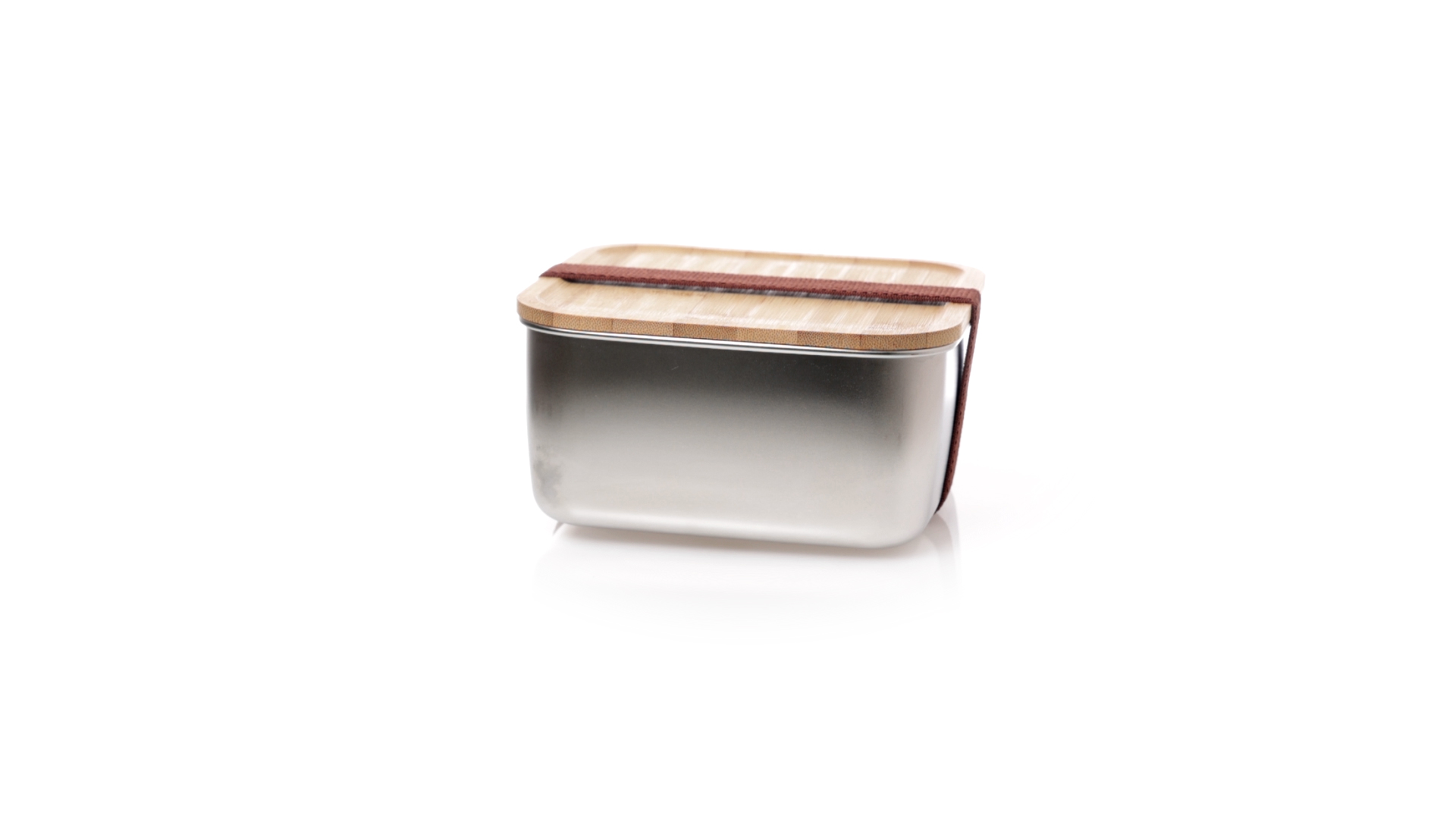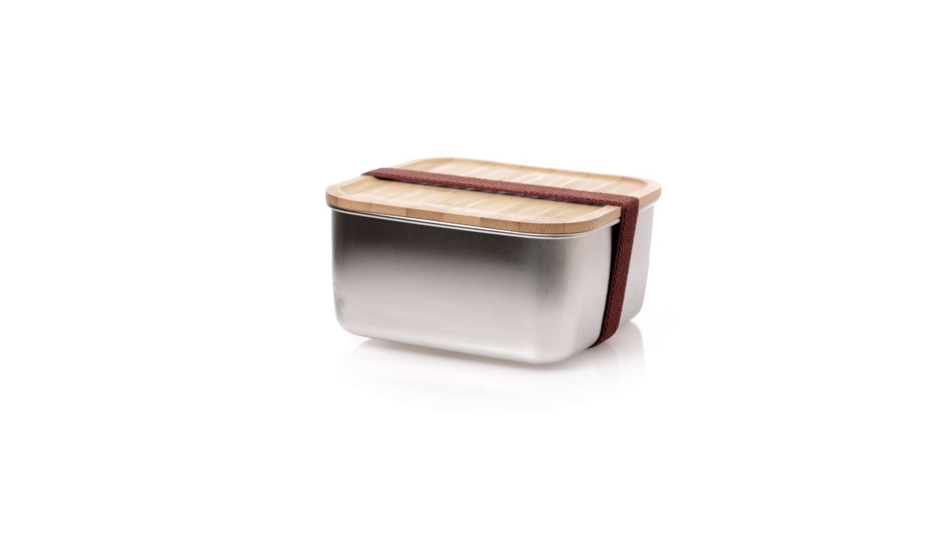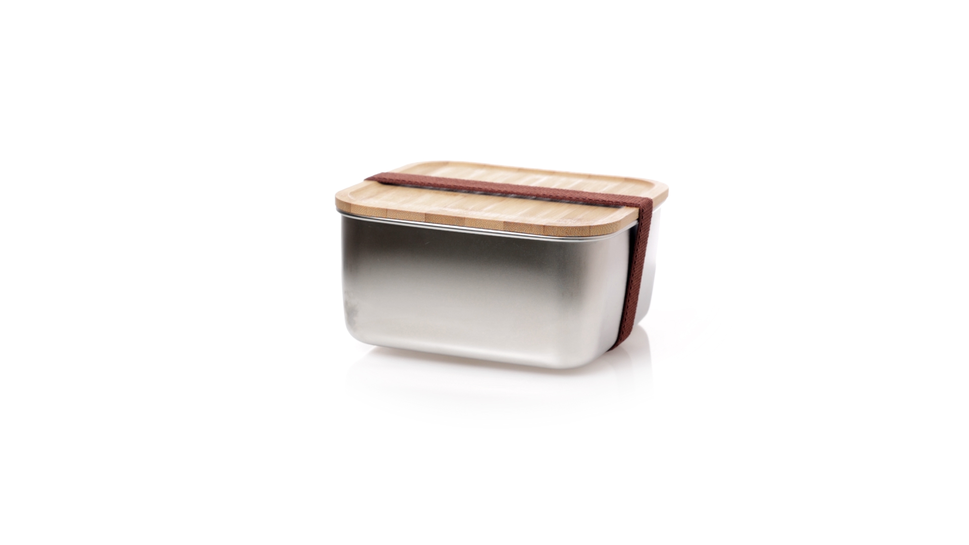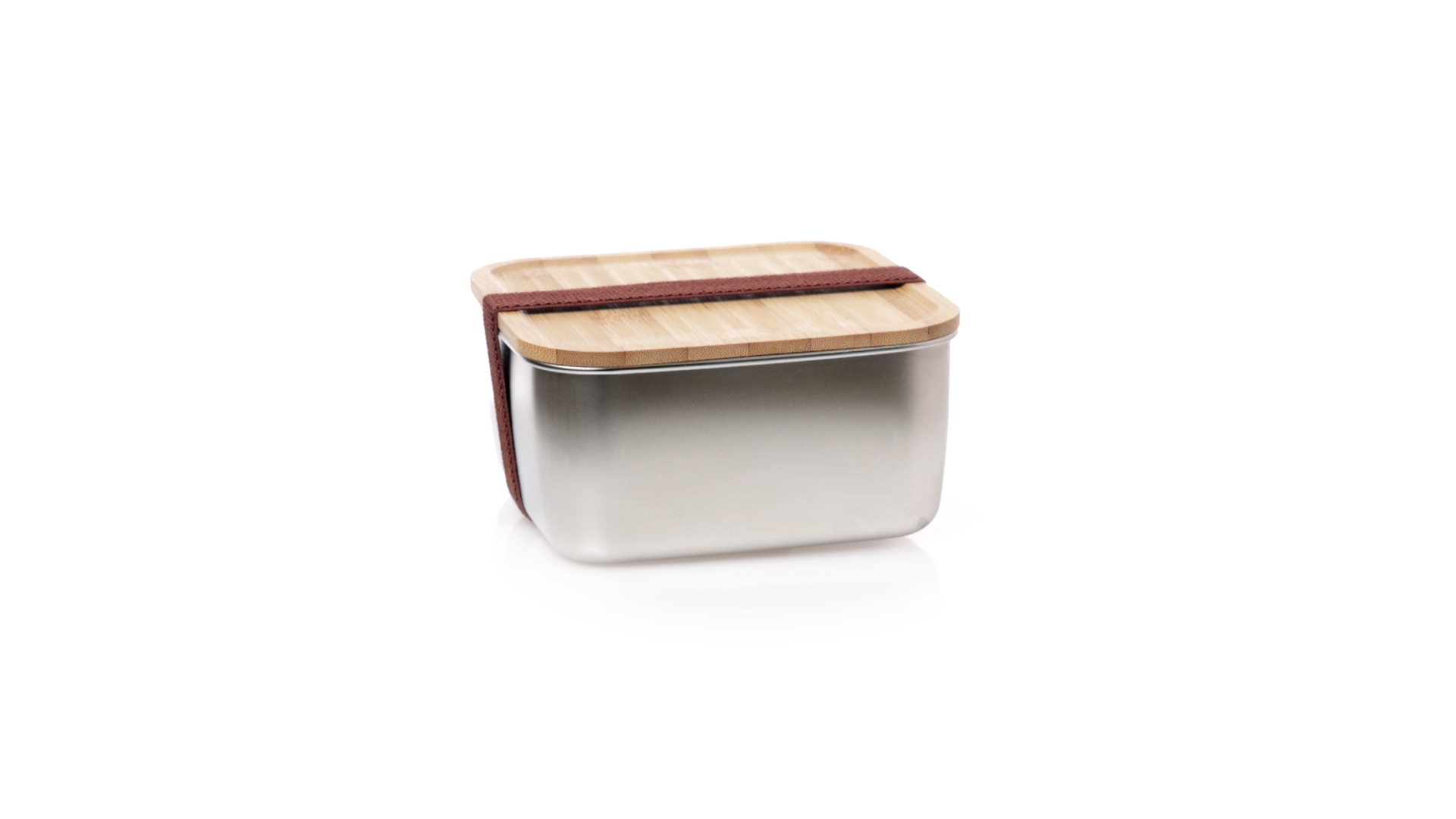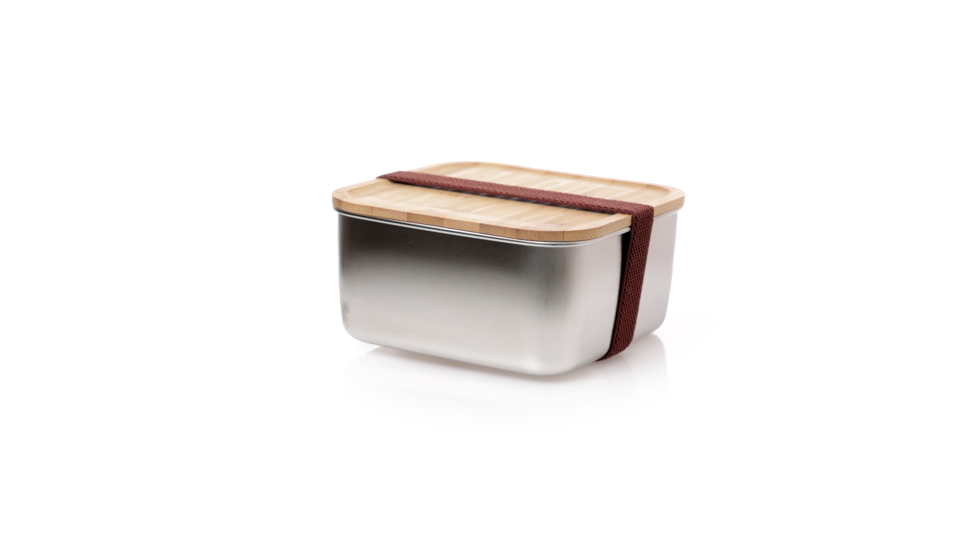 Lunchbox mit 1,4 ml Fassungsvermögen und quadratischem Design, aus Edelstahl. Mit luftdichtem Bambusdeckel und Gummibandverschluss. Präsentiert in einer individuellen Designbox.
