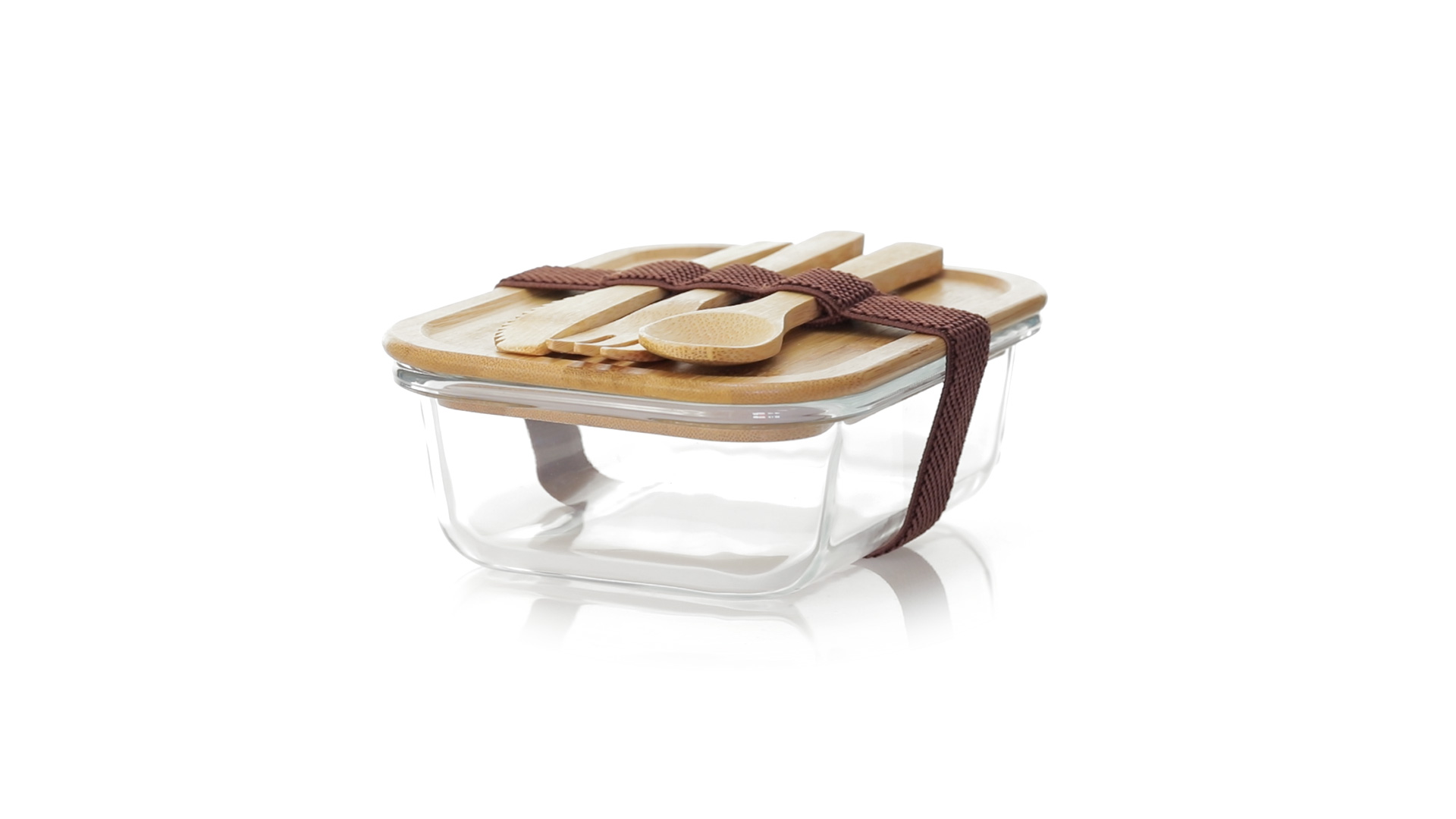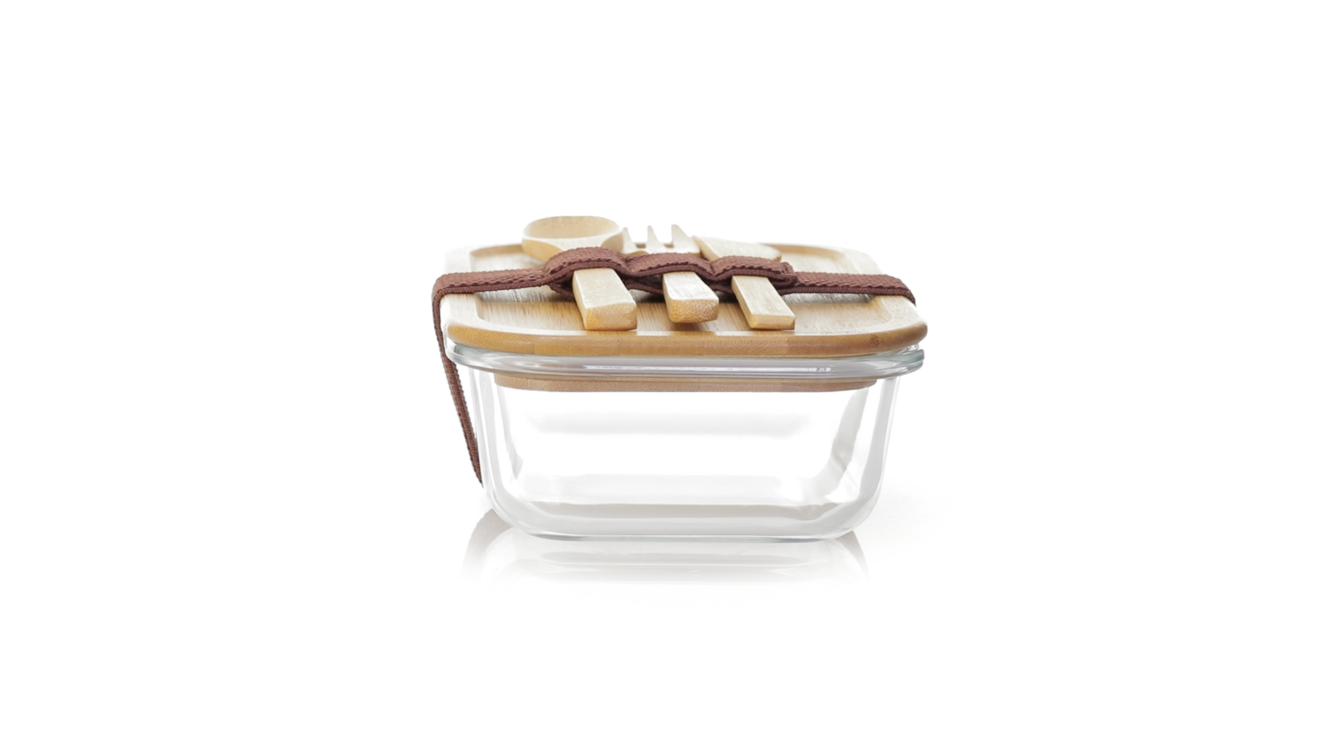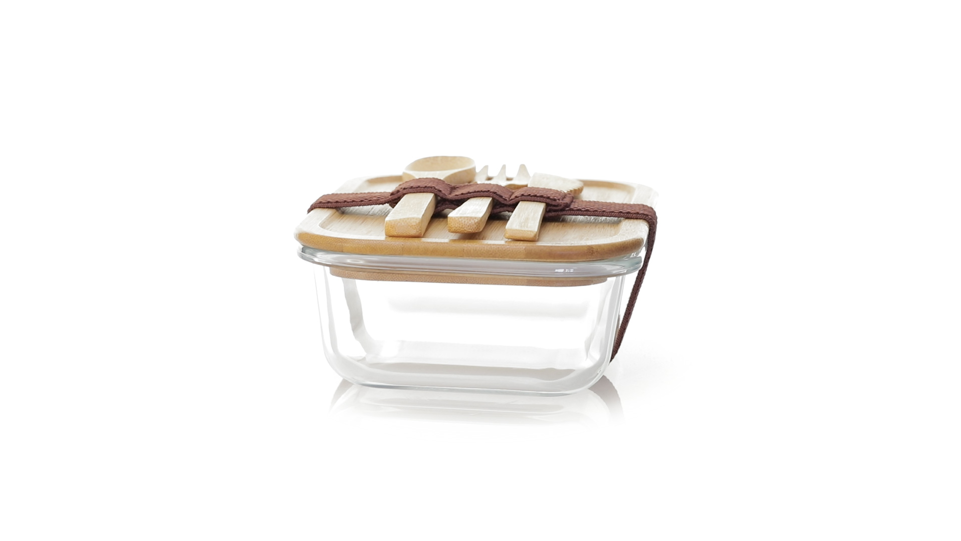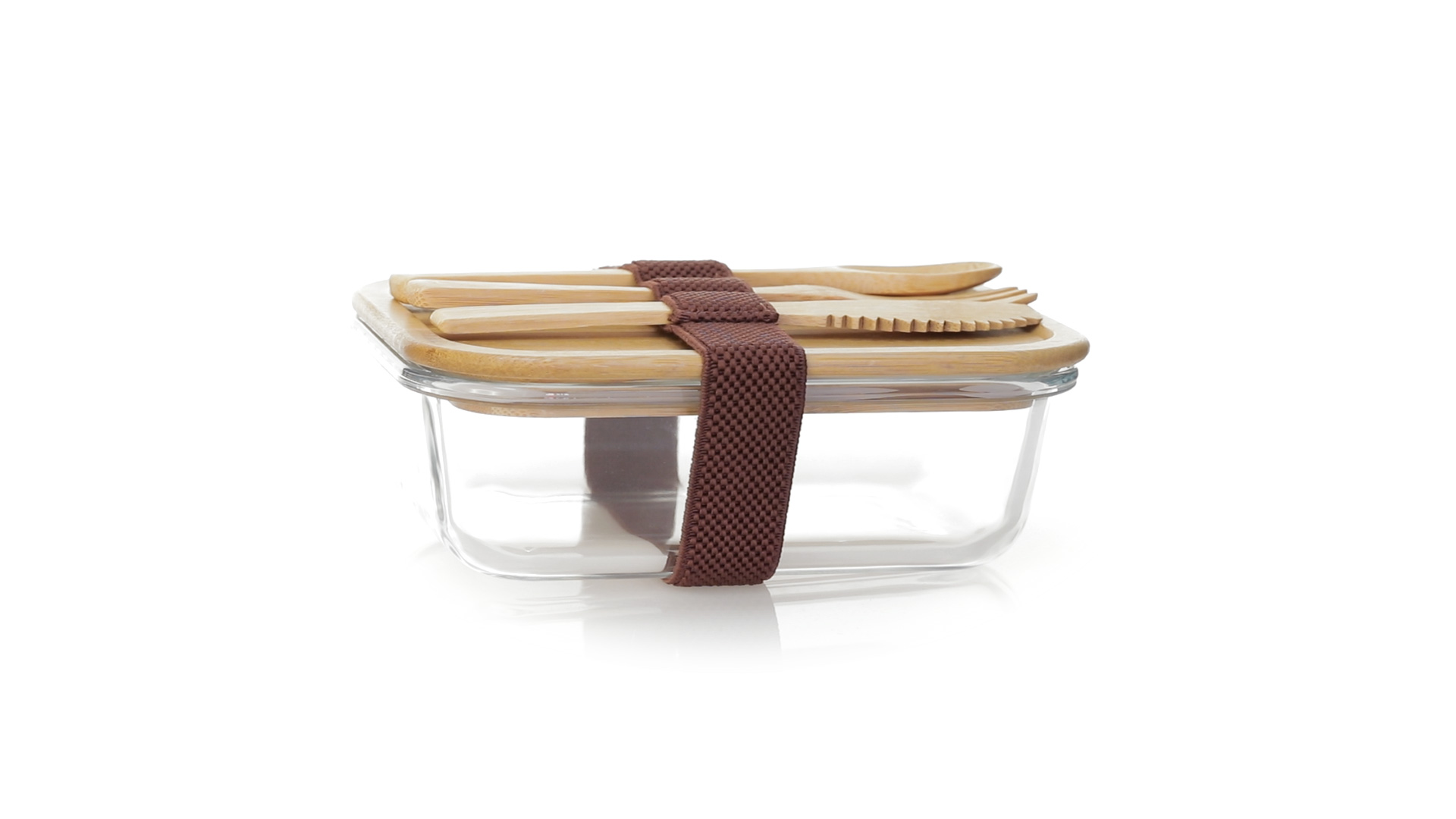 Nature Line Lunchbox mit einem Fassungsvermögen von 700 ml. Aus Glas, mit hermetischem Deckel aus poliertem Bambus, mit Gummiband zur Vermeidung von Auslaufen und Aussparung zur Verwendung als Tablett. Inklusive Sicherheitsgurt mit Gabel, Löffel und Messer. Präsentiert in einer attraktiven Einzelverpackung im Öko-Design.