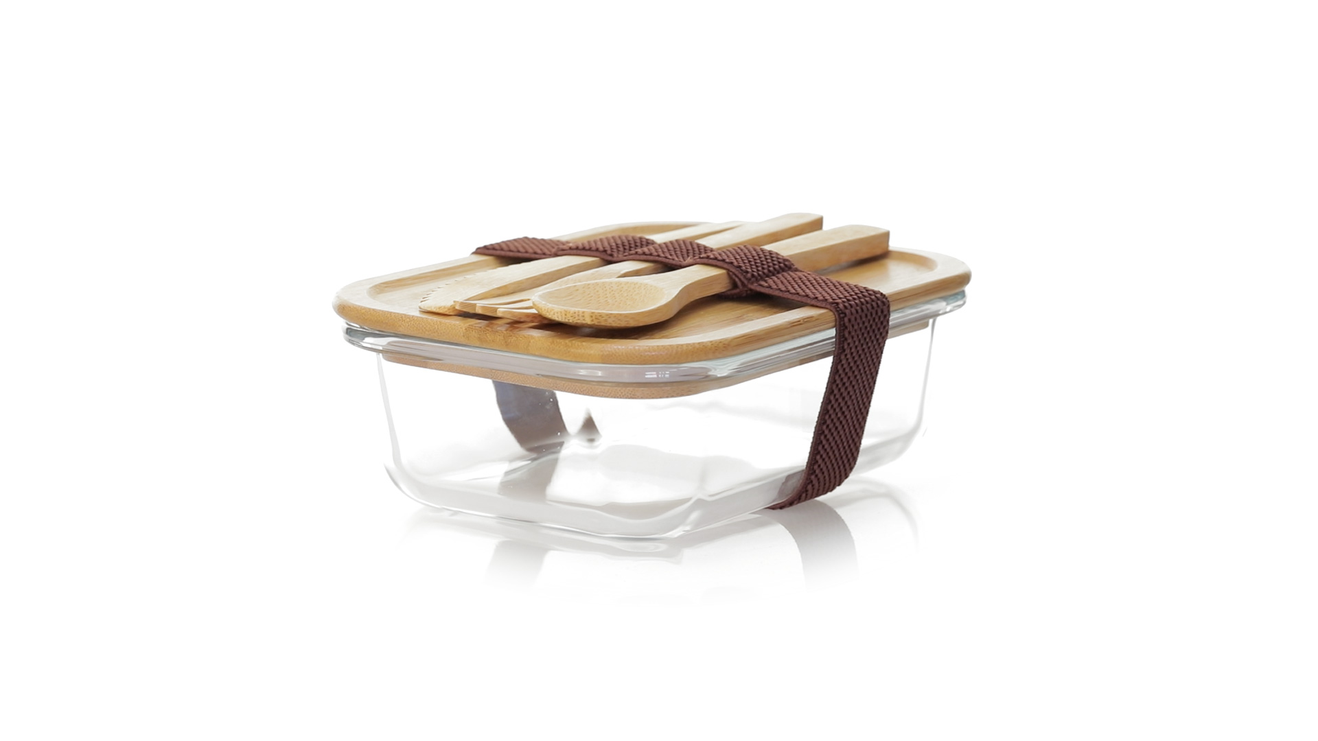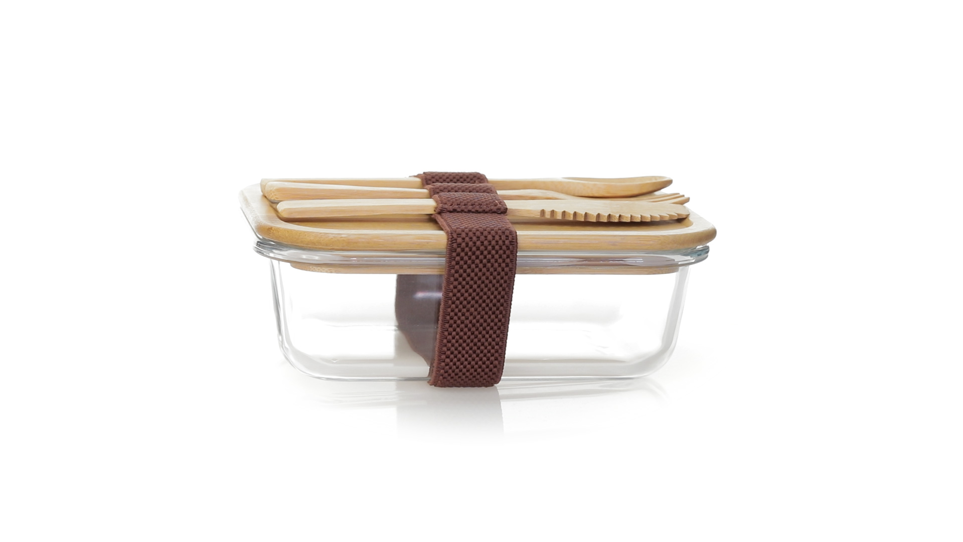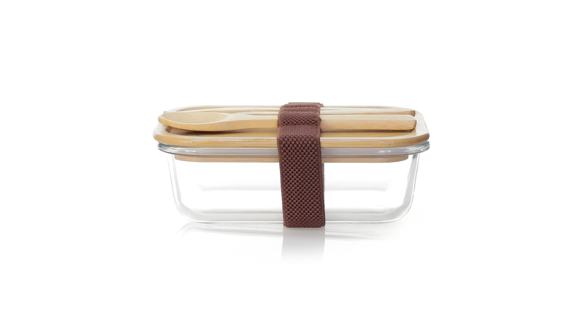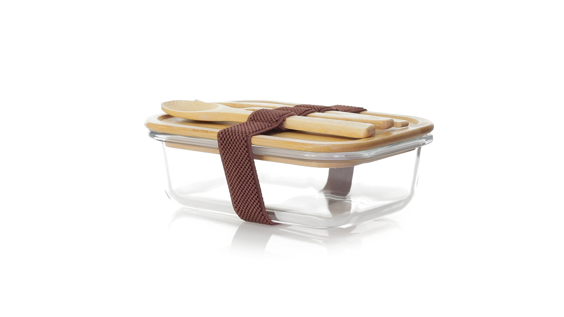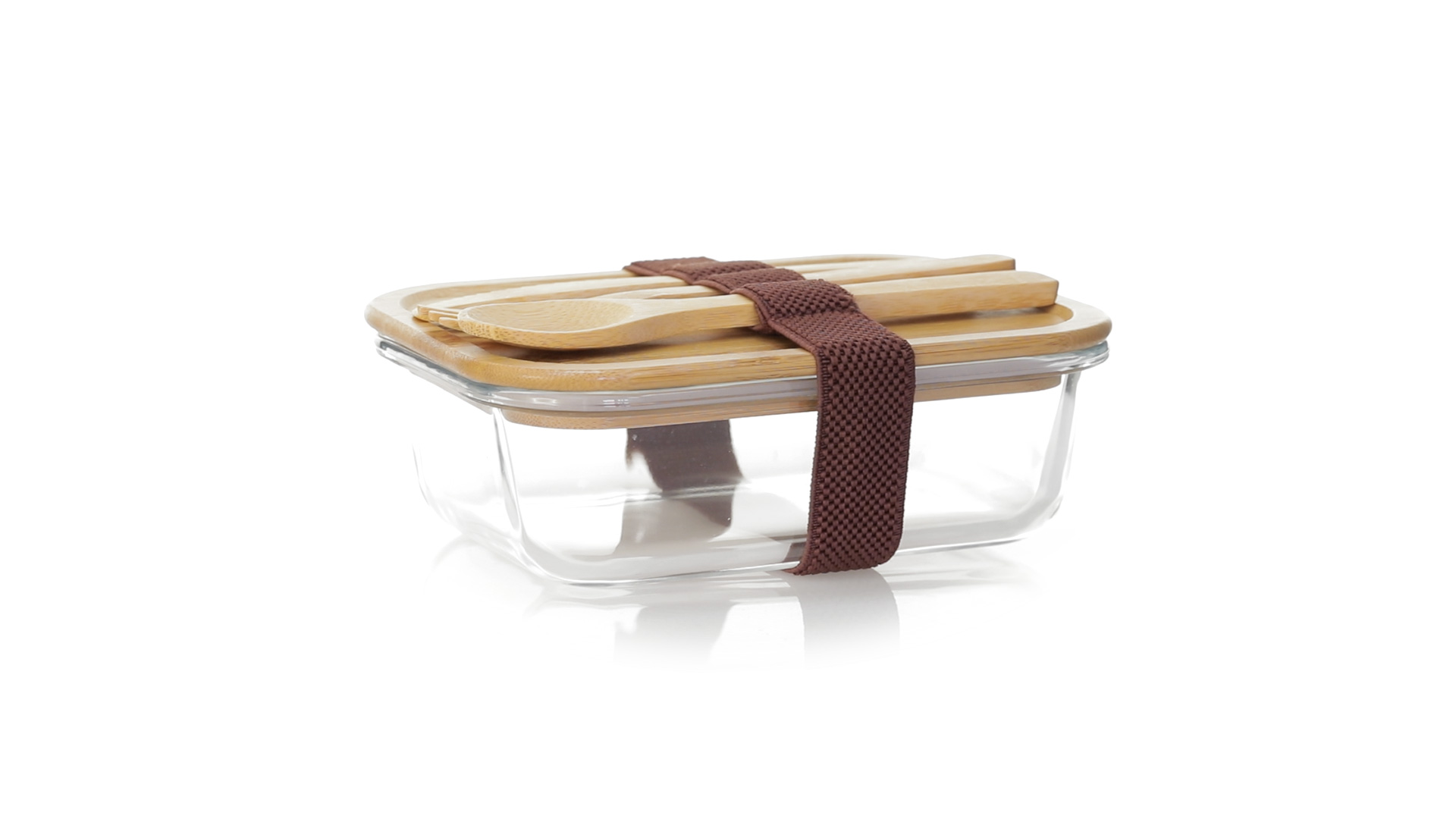 Nature Line Lunchbox mit einem Fassungsvermögen von 700 ml. Aus Glas, mit hermetischem Deckel aus poliertem Bambus, mit Gummiband zur Vermeidung von Auslaufen und Aussparung zur Verwendung als Tablett. Inklusive Sicherheitsgurt mit Gabel, Löffel und Messer. Präsentiert in einer attraktiven Einzelverpackung im Öko-Design.