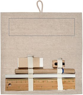 Mäppchen aus Jute und Baumwolle. Holzknopfverschluss. Inklusive 15 cm Bambuslineal, Bleistift, Kugelschreiber mit blauer Tinte, Holzspitzer und Radiergummi. Bambus ist ein natürliches Produkt, es kann daher zu leichten Abweichungen in Farbe, Dekor und Massen kommen.