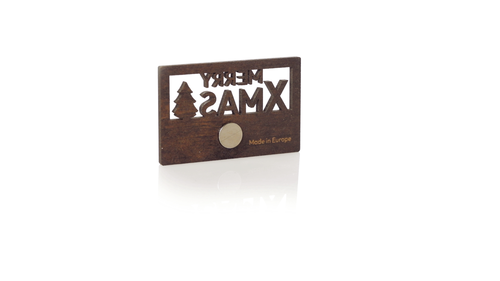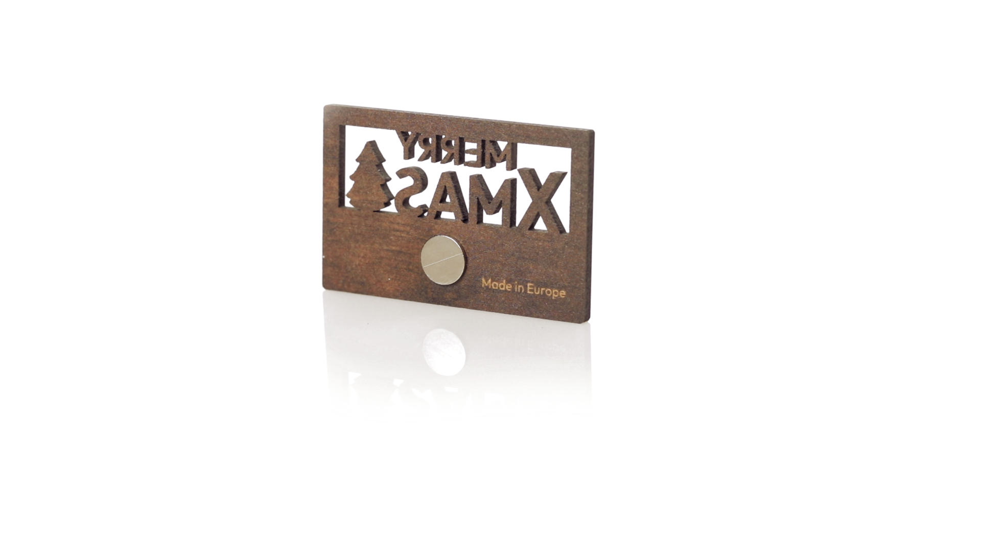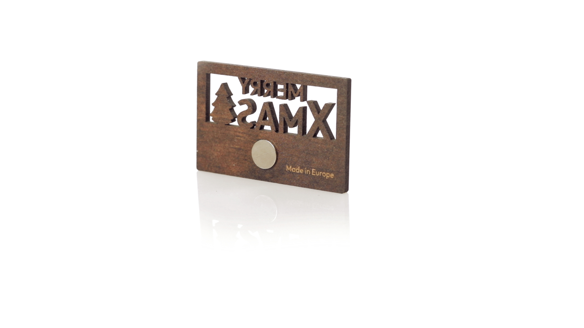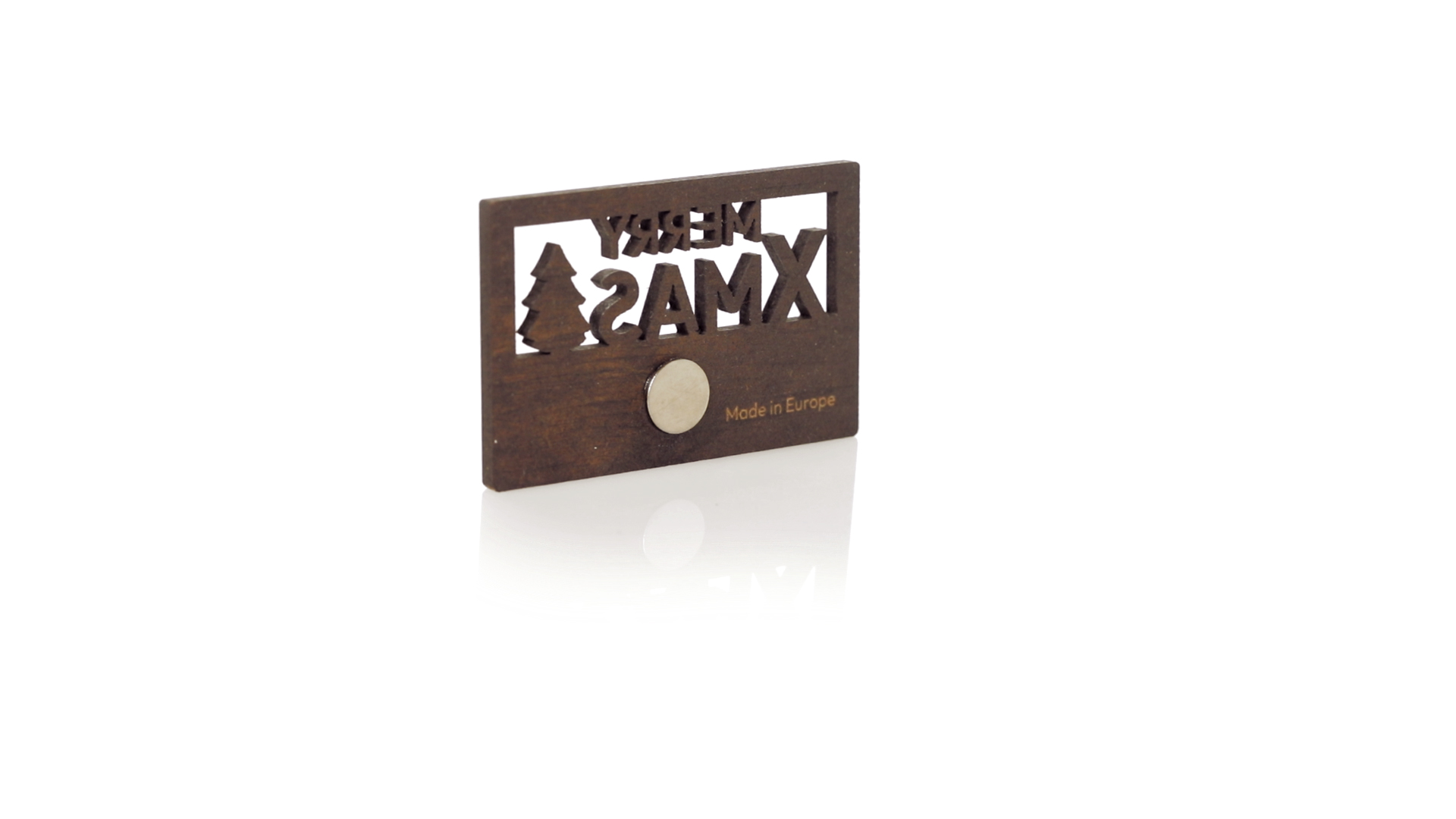 Echter Frohe-Weihnachten-Magnet aus Naturholz, mit gestanztem Text und Original-Bicolor-Finish. Grosse Brandingfläche und Made in Europe-Logo.