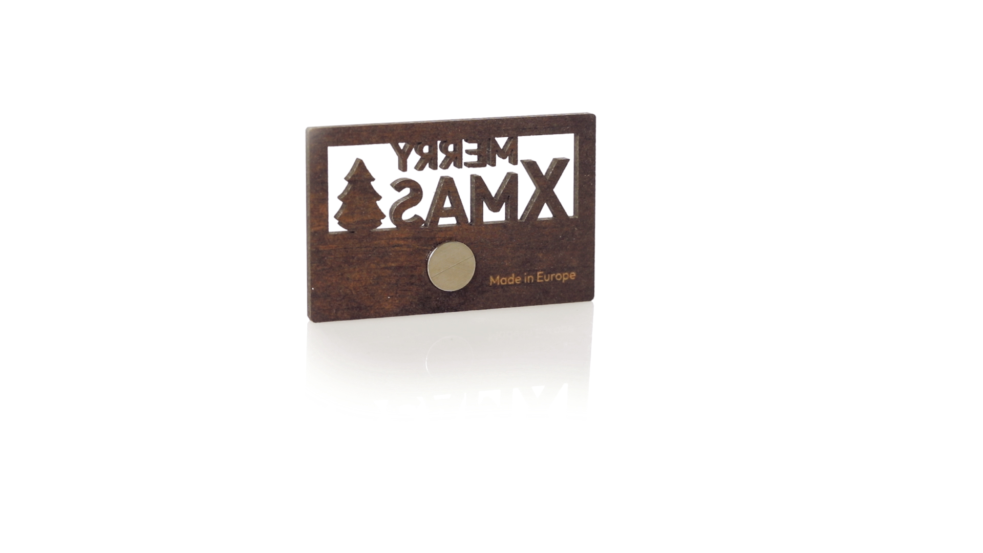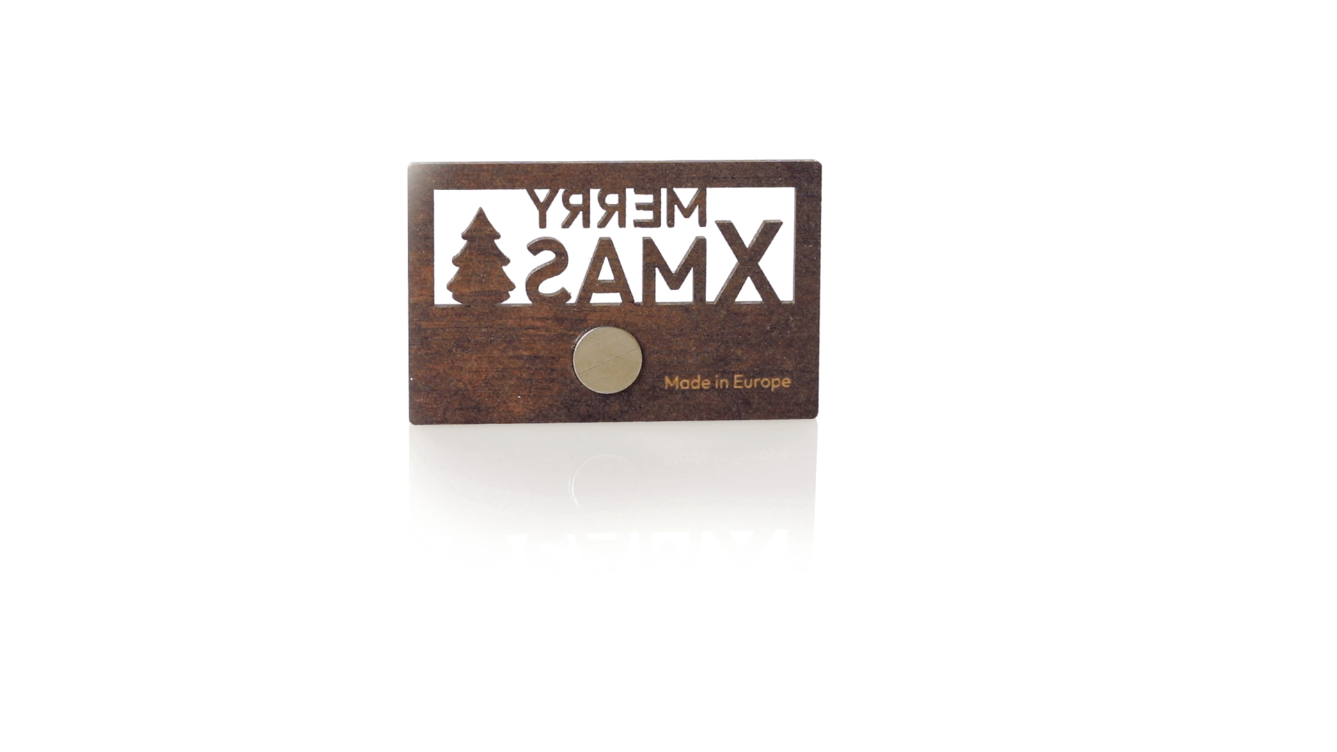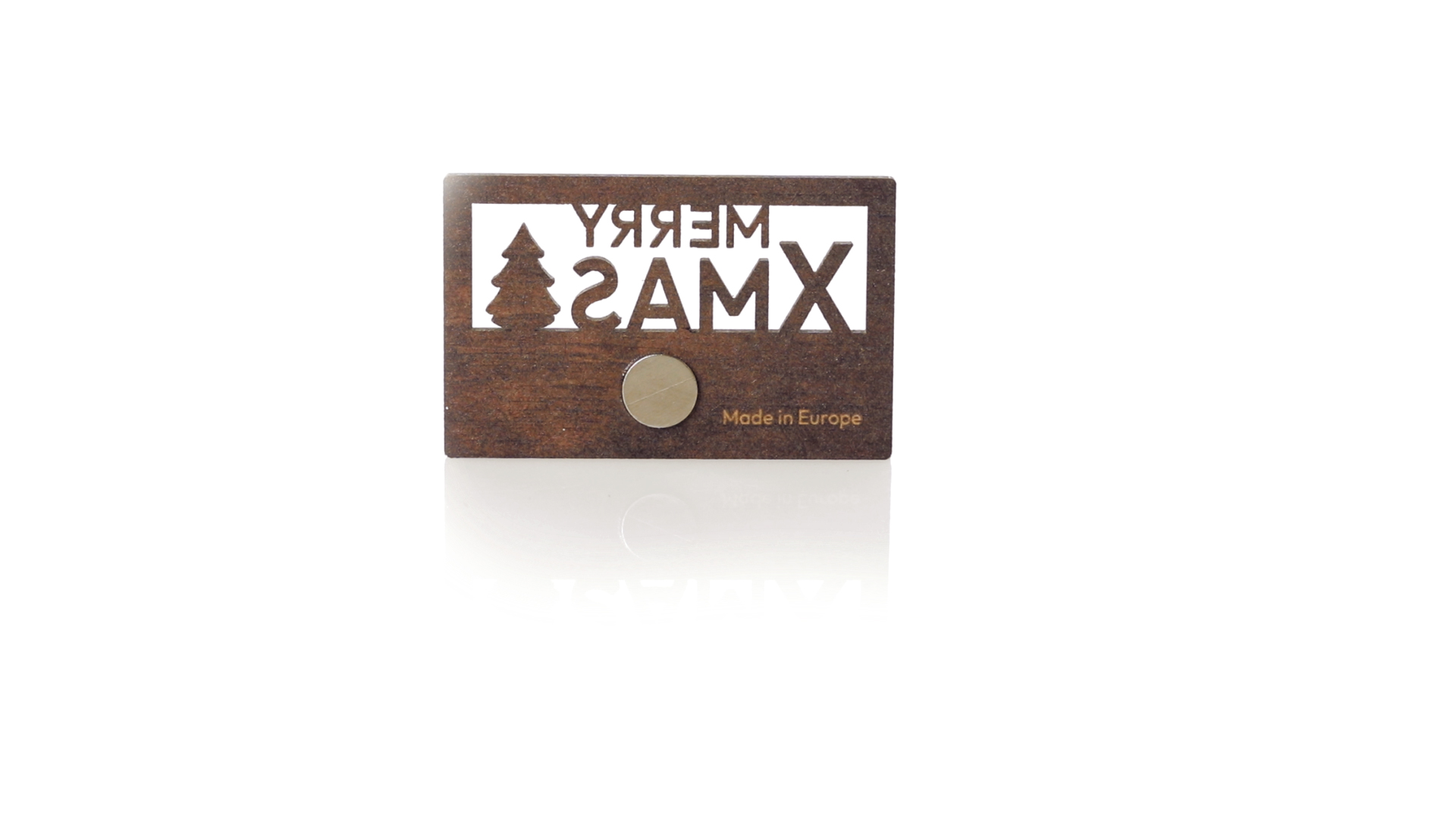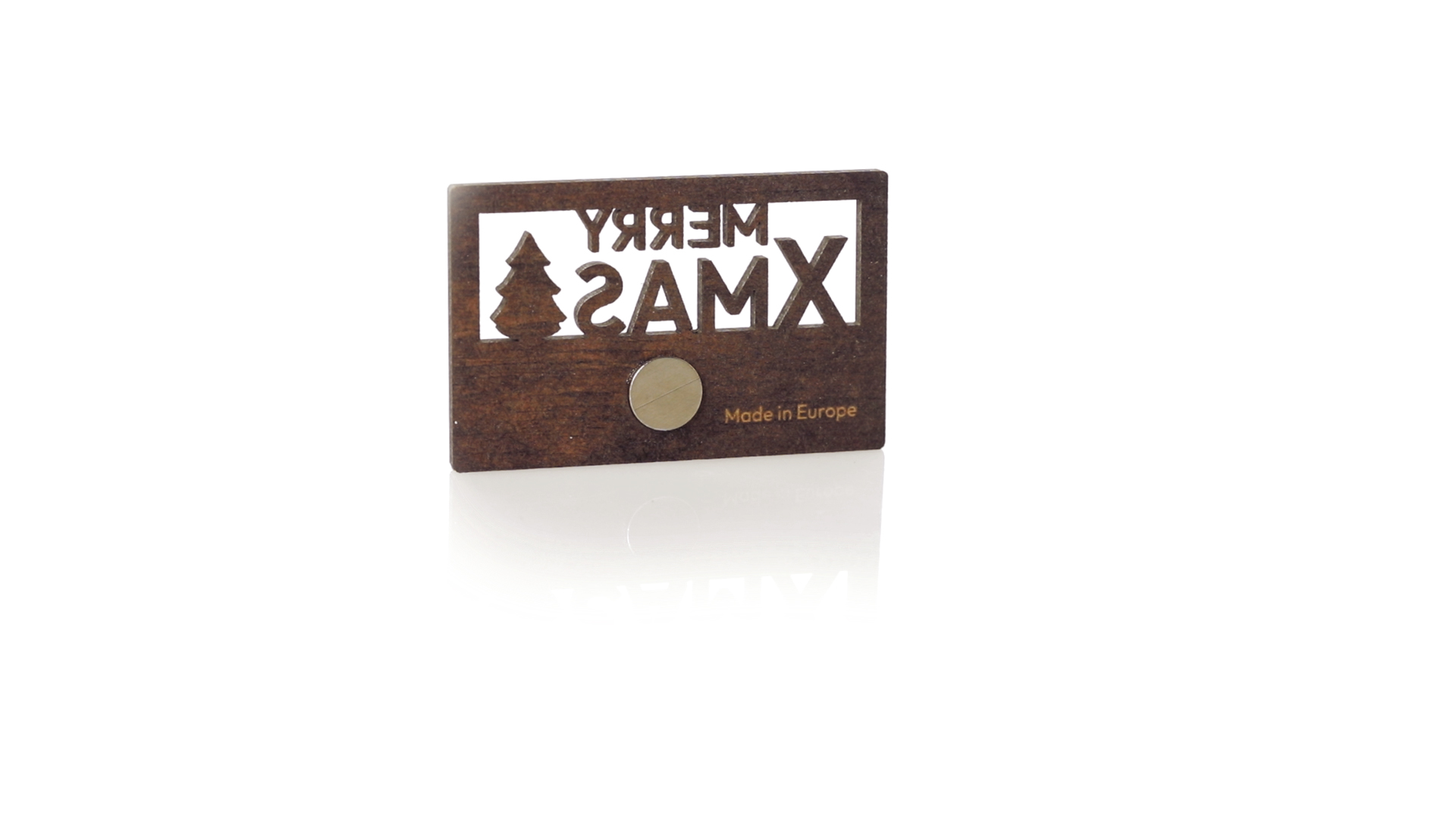 Echter Frohe-Weihnachten-Magnet aus Naturholz, mit gestanztem Text und Original-Bicolor-Finish. Grosse Brandingfläche und Made in Europe-Logo.