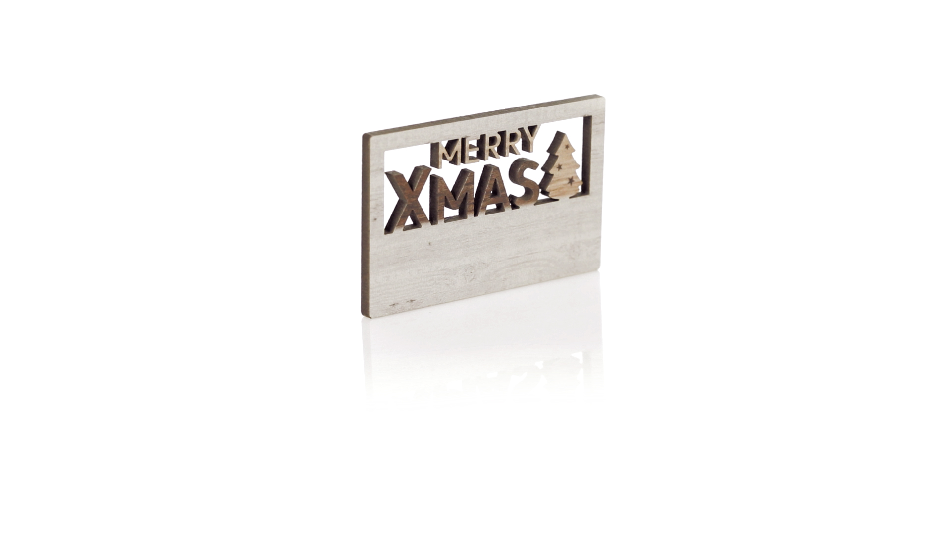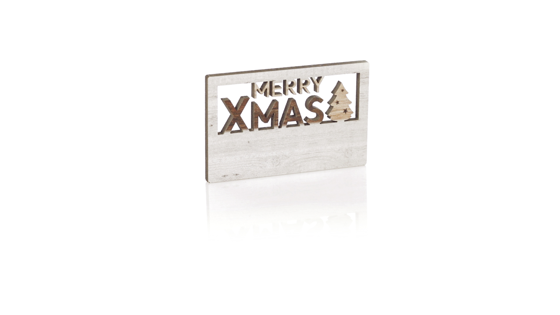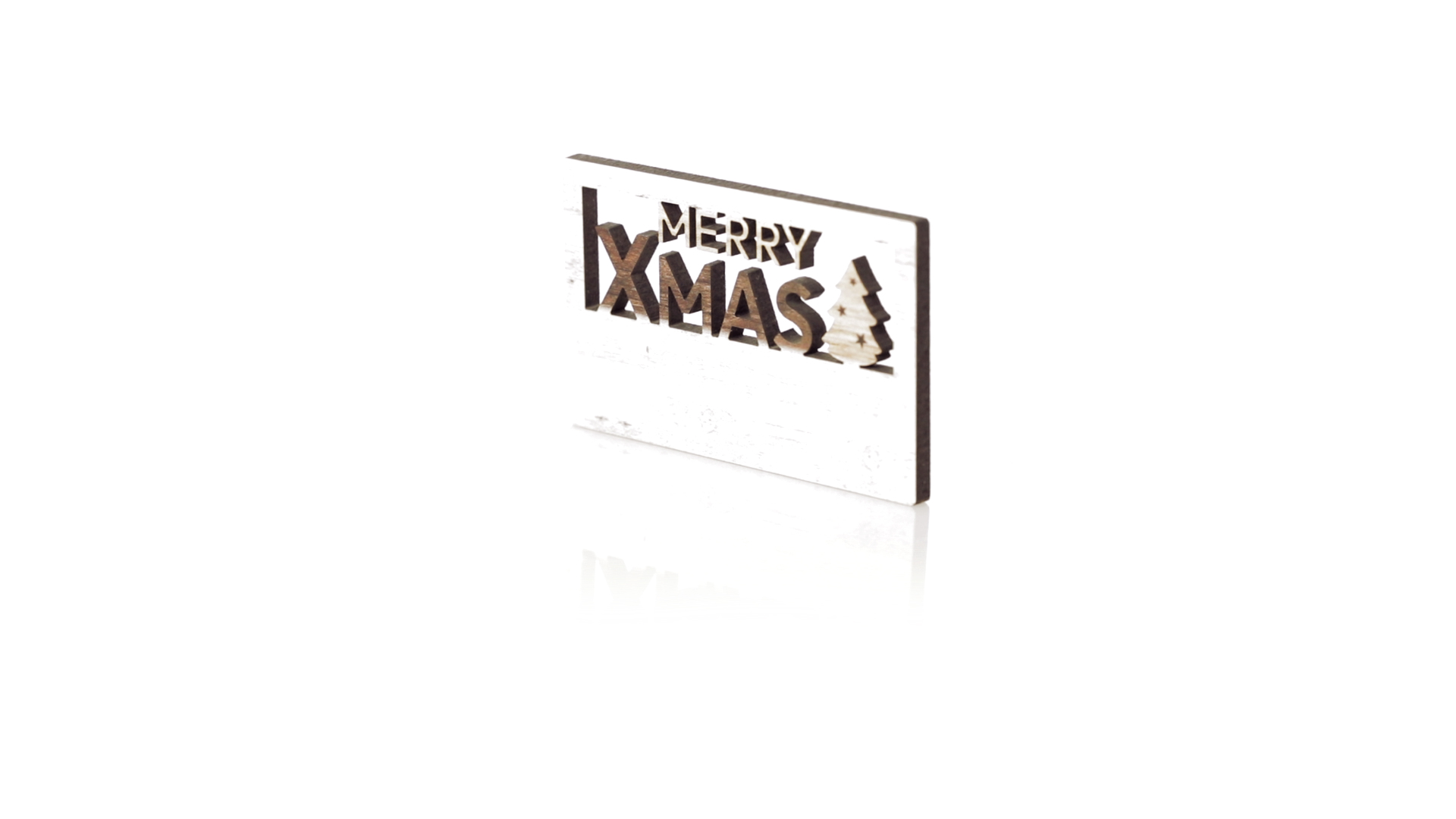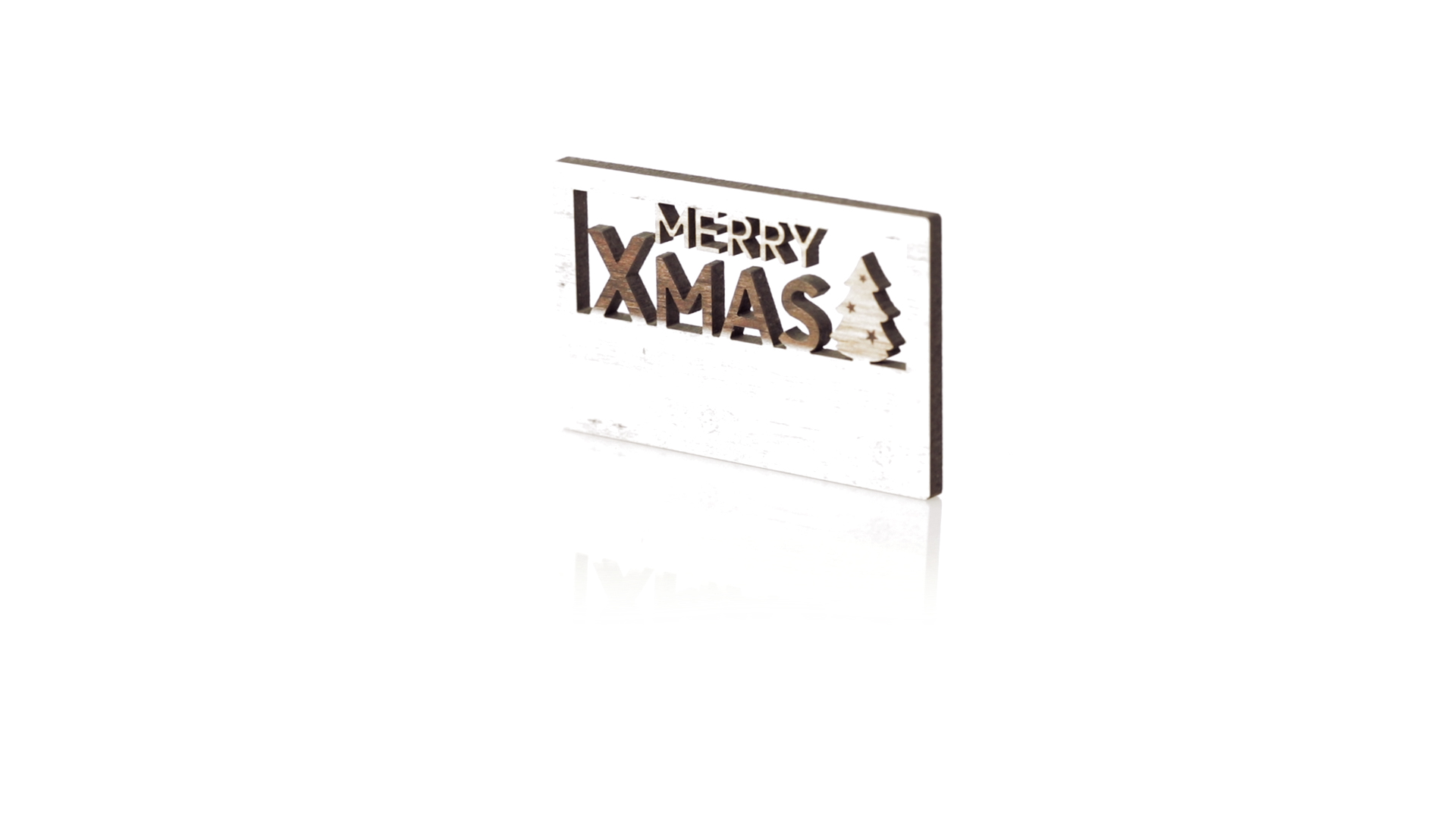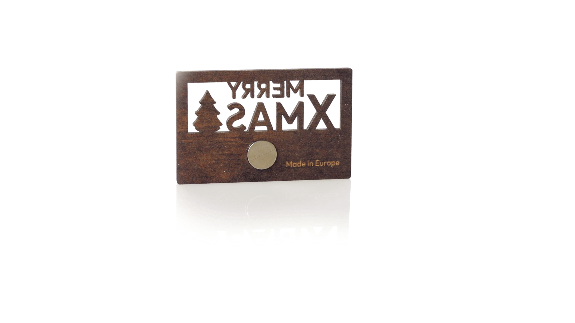 Echter Frohe-Weihnachten-Magnet aus Naturholz, mit gestanztem Text und Original-Bicolor-Finish. Grosse Brandingfläche und Made in Europe-Logo.