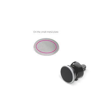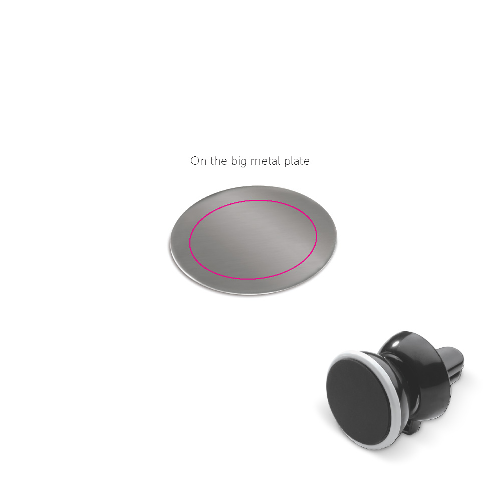 Magnetischer Handyhalter aus zwei Teilen: eine Metallplatte mit Aufkleber zum Anbringen auf der Rückseite des Handys und einem magnetischen Halter für das Lüftungsgitter im Auto. Nutzen Sie die Lüftung als Handyhalter.