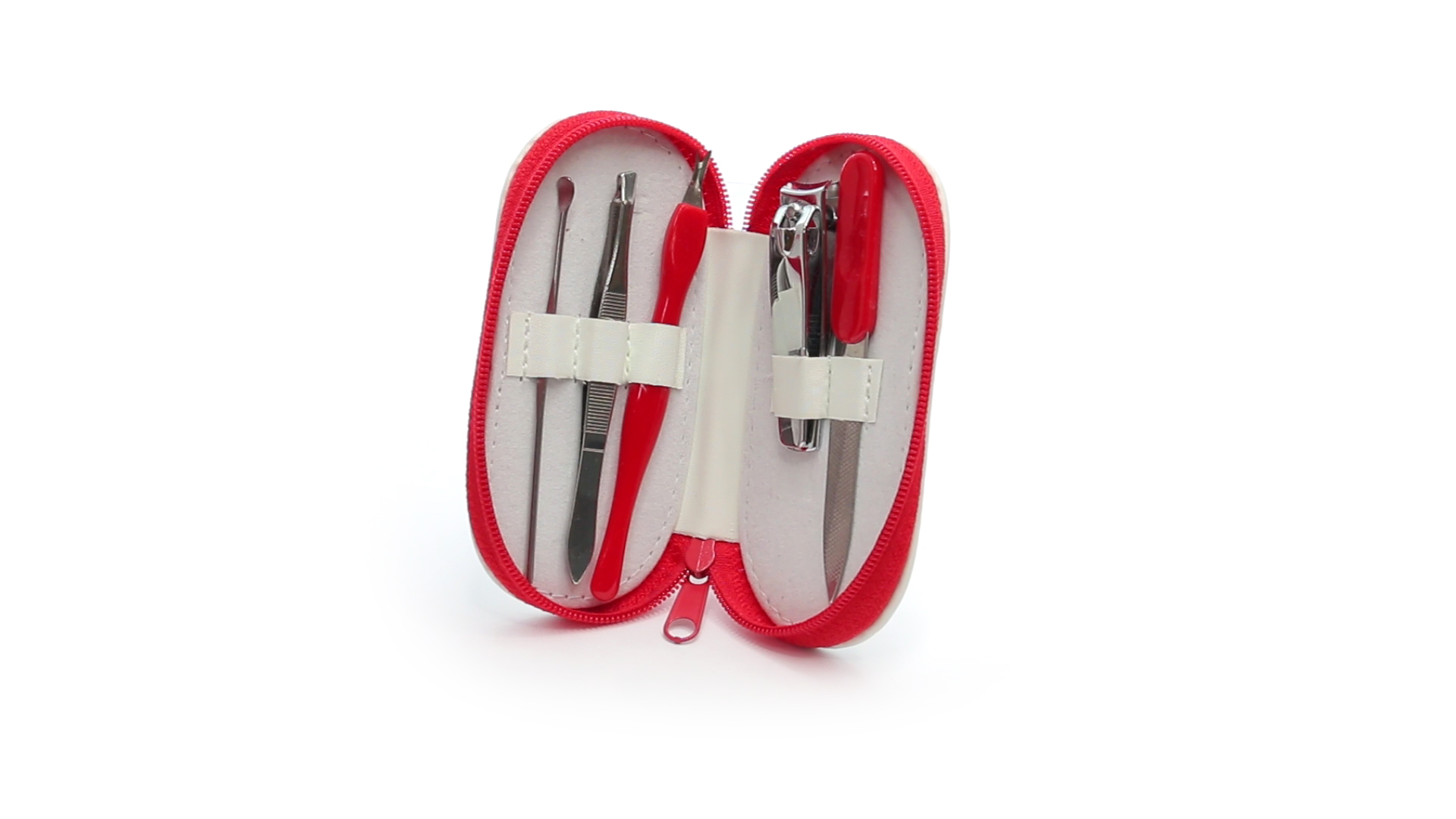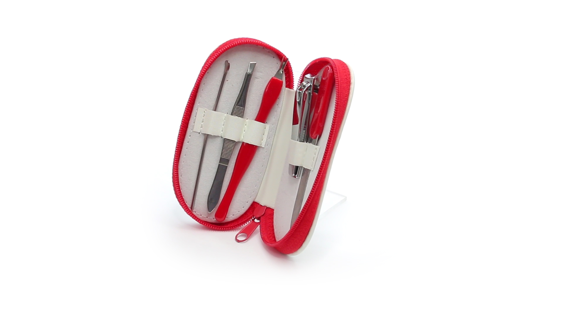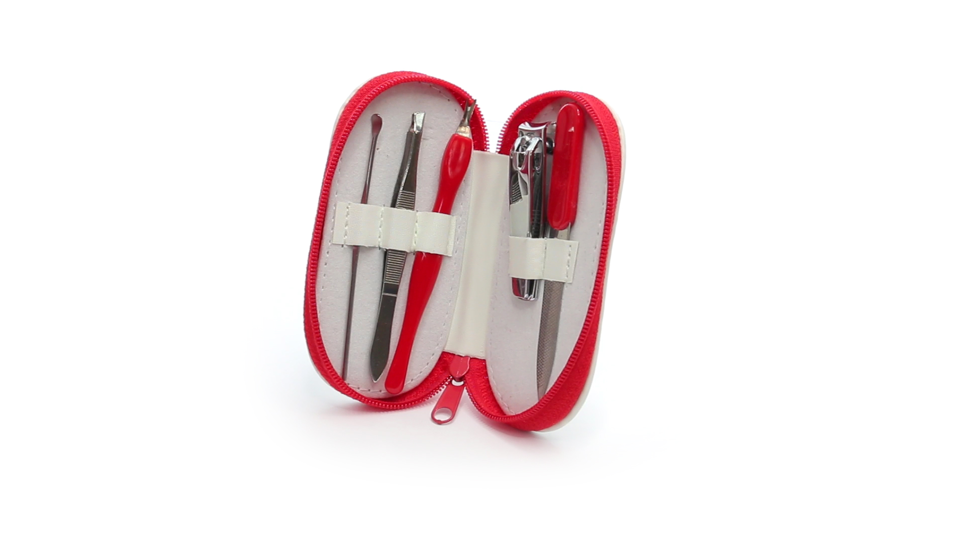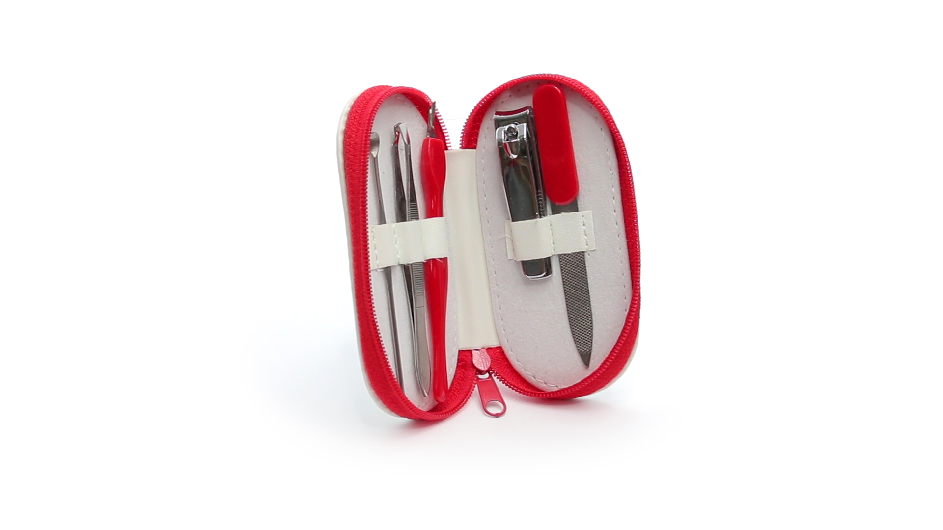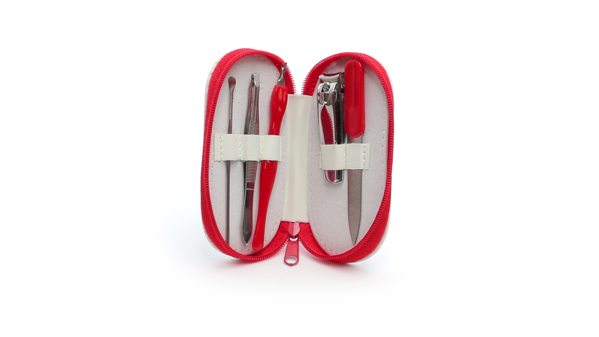 5-teiliges Maniküre-Set aus Edelstahl in einem Kunstleder-Etui mit Reissverschluss in lebendigen Farben. Enthält Nagelhautschneider, Feile, Nagelknipser, Pinzette und Nagelzubehör.